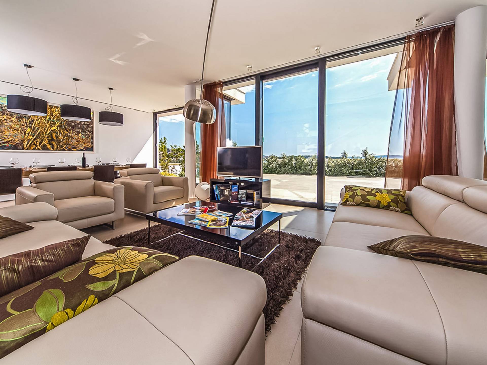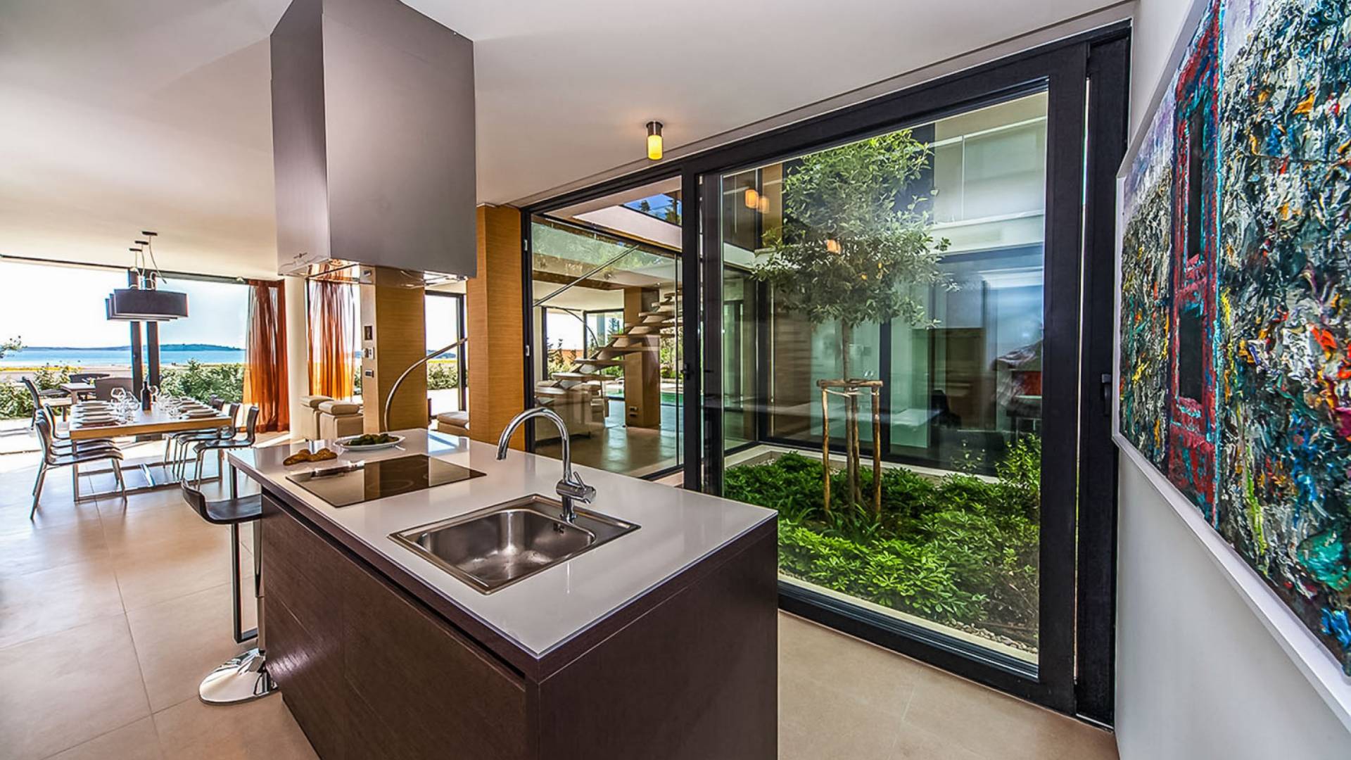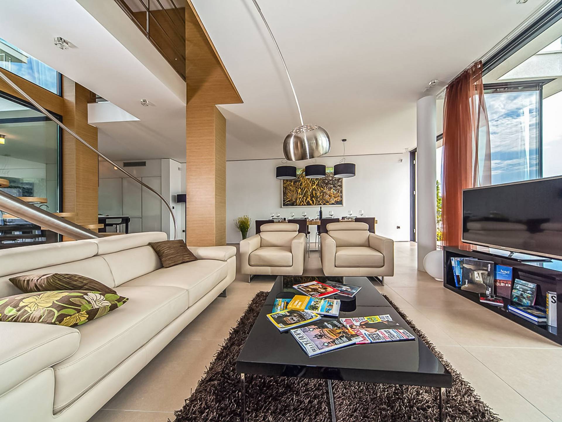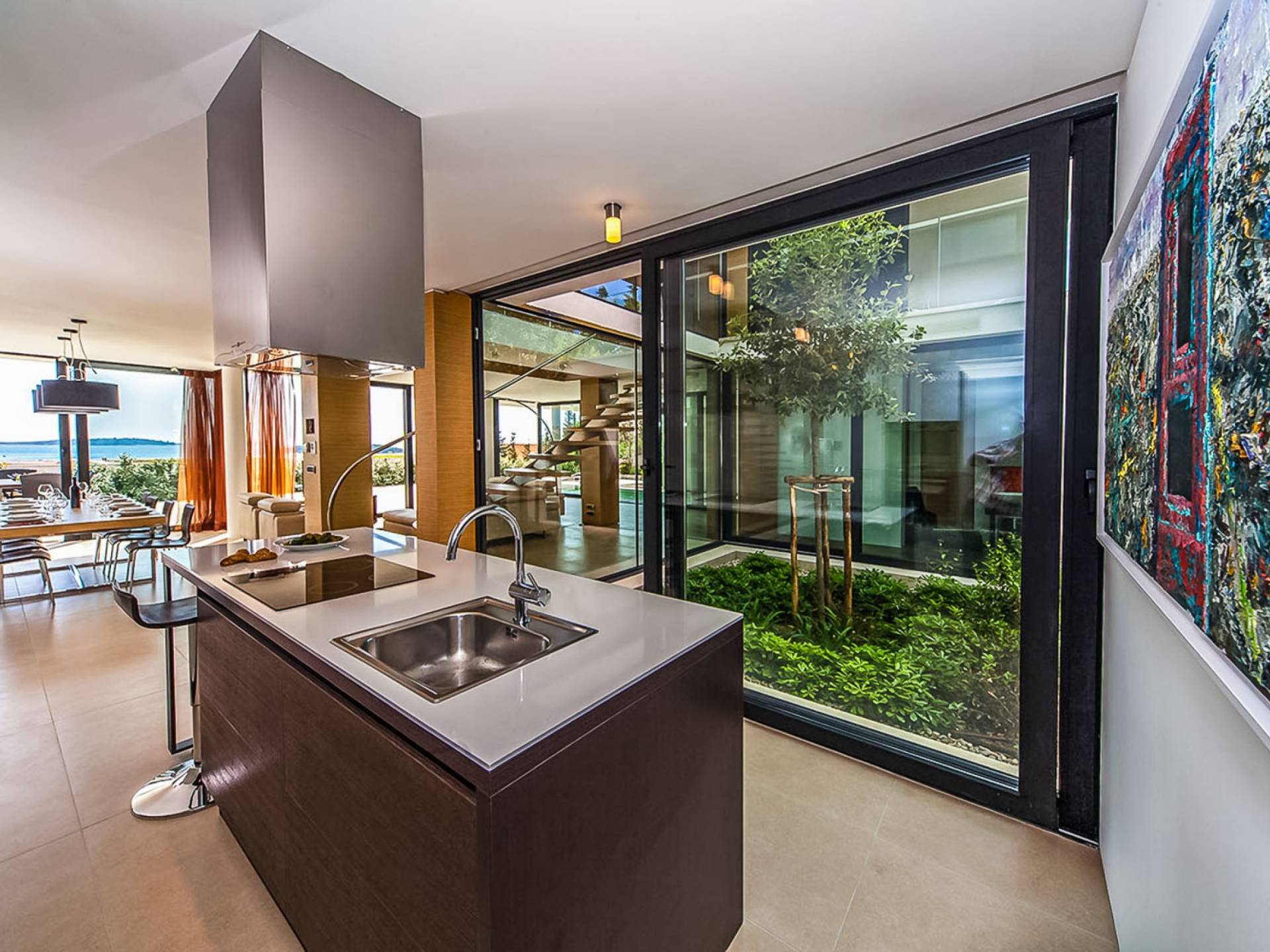Con una pared de vidrio del piso al techo, la sala de estar comparte magníficas vistas y se puede acceder directamente desde la terraza. Es un espacio sumamente elegante y con estilo, de planta abierta y bellamente diseñado. Hay cómodos sofás y televisión de plasma, un comedor y una cocina con vista al jardín del atrio.
