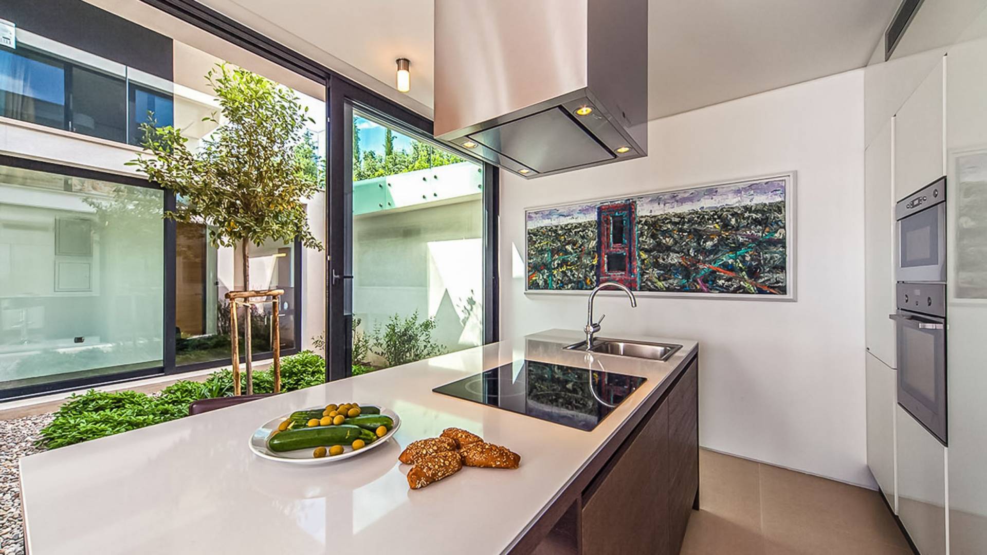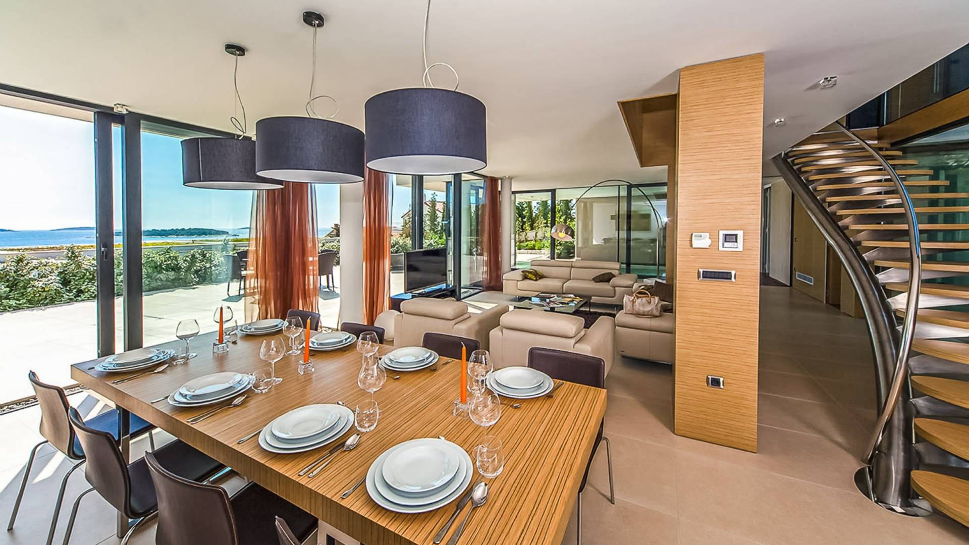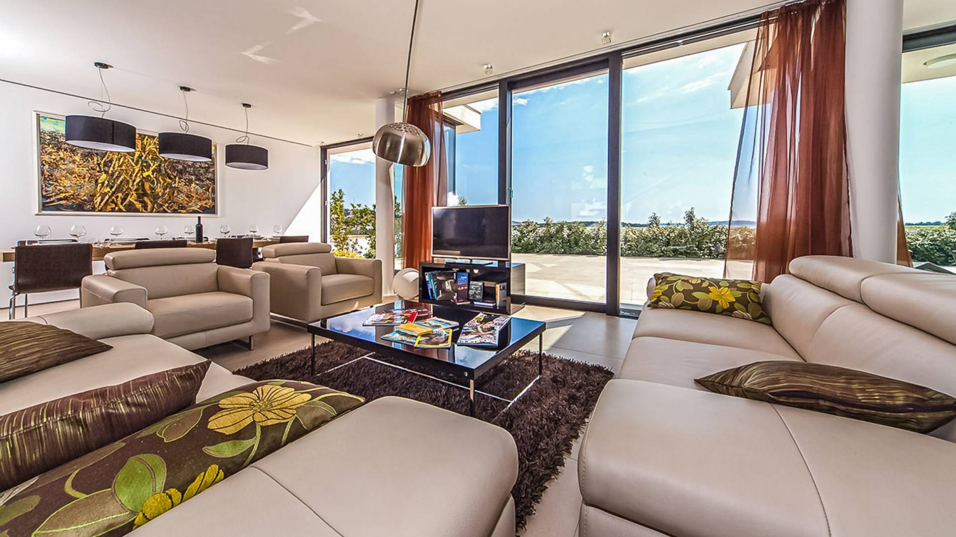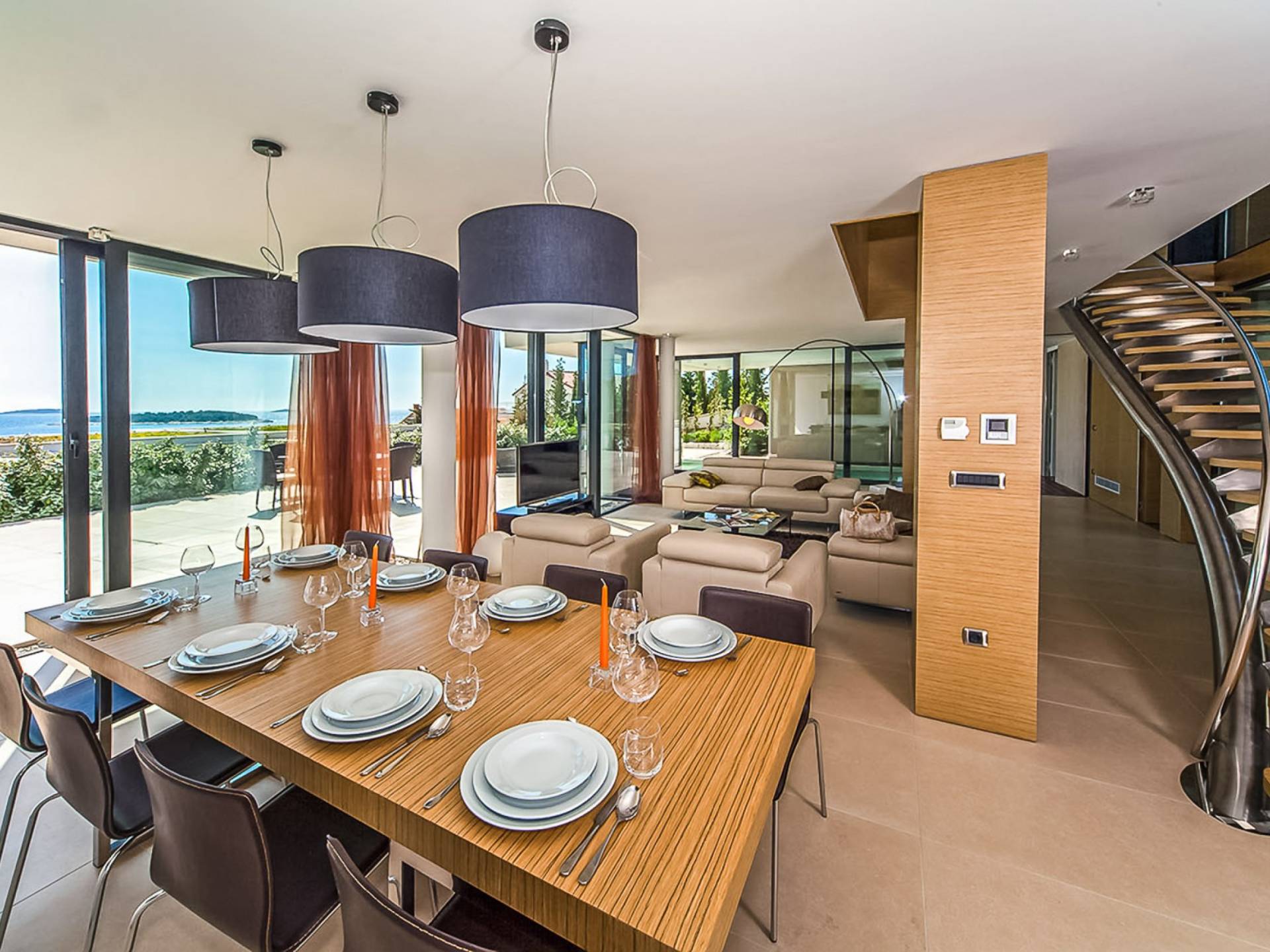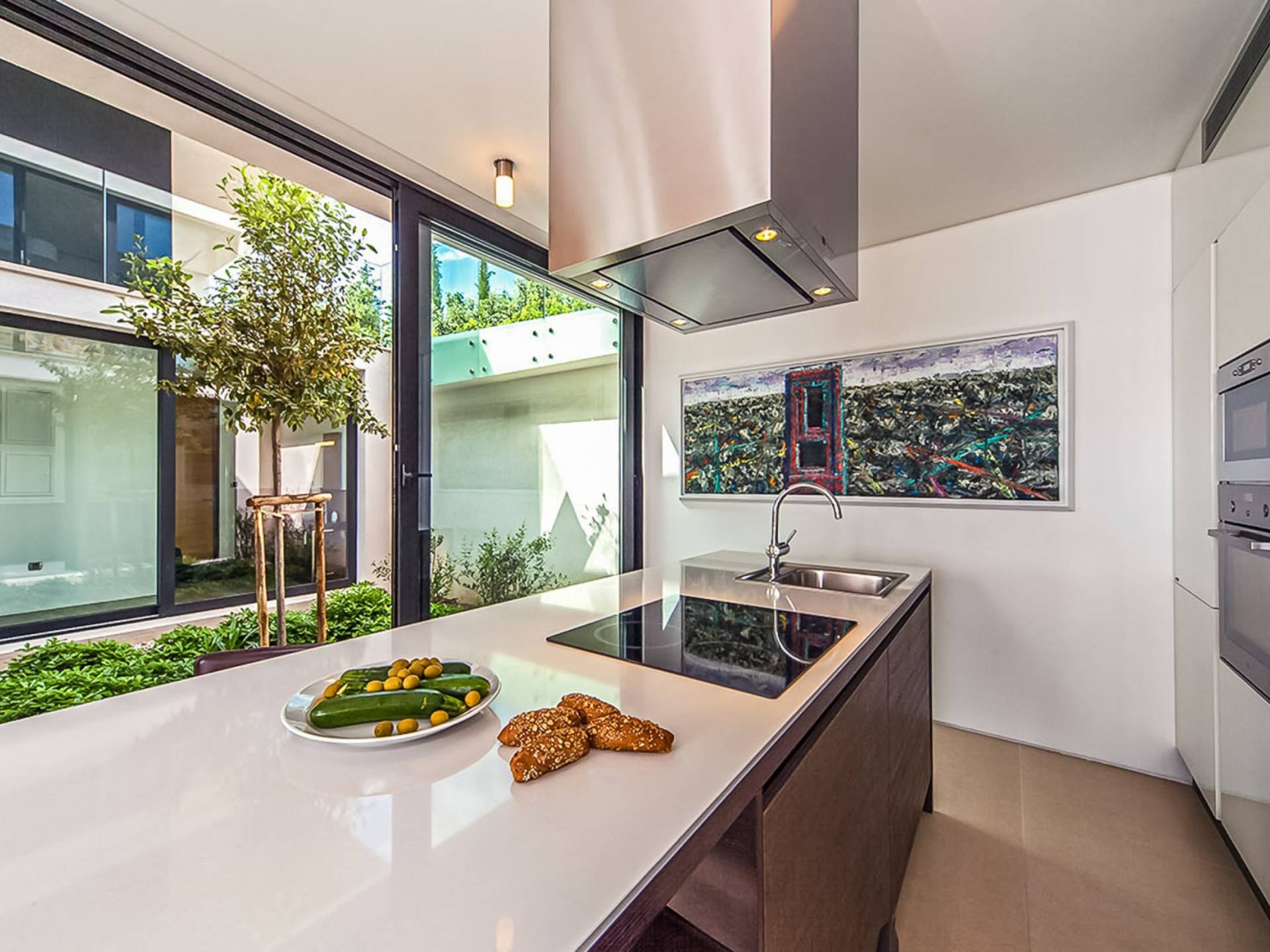 Con una pared de vidrio del piso al techo, la sala de estar comparte magníficas vistas y se puede acceder directamente desde la terraza. Es un espacio sumamente elegante y con estilo, de planta abierta y bellamente diseñado. Hay cómodos sofás y televisión de plasma, un comedor y una cocina con vista al jardín del atrio.