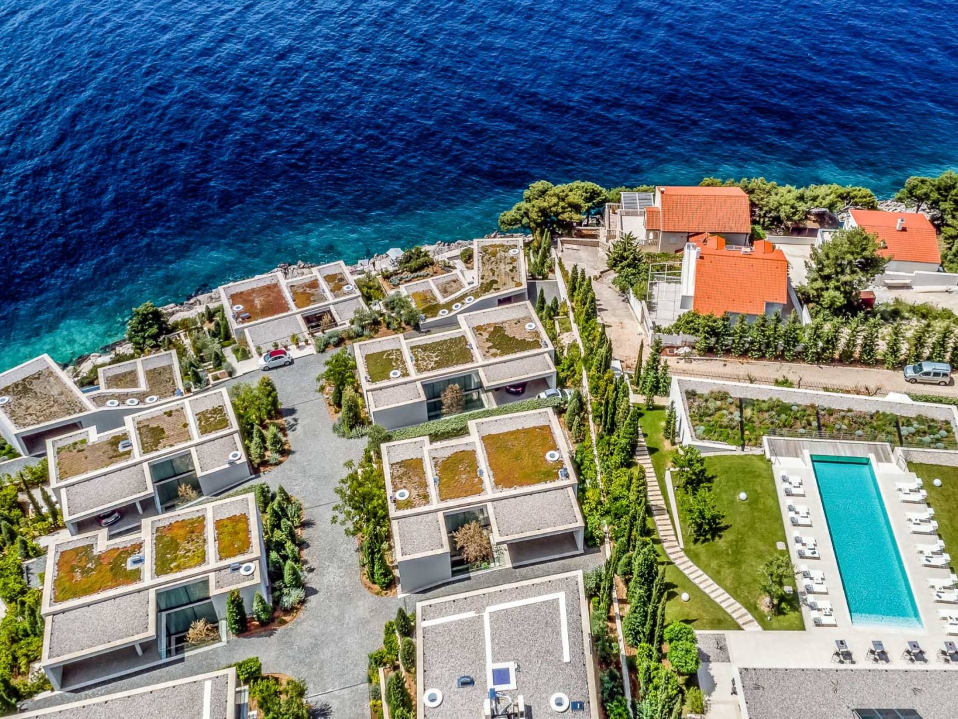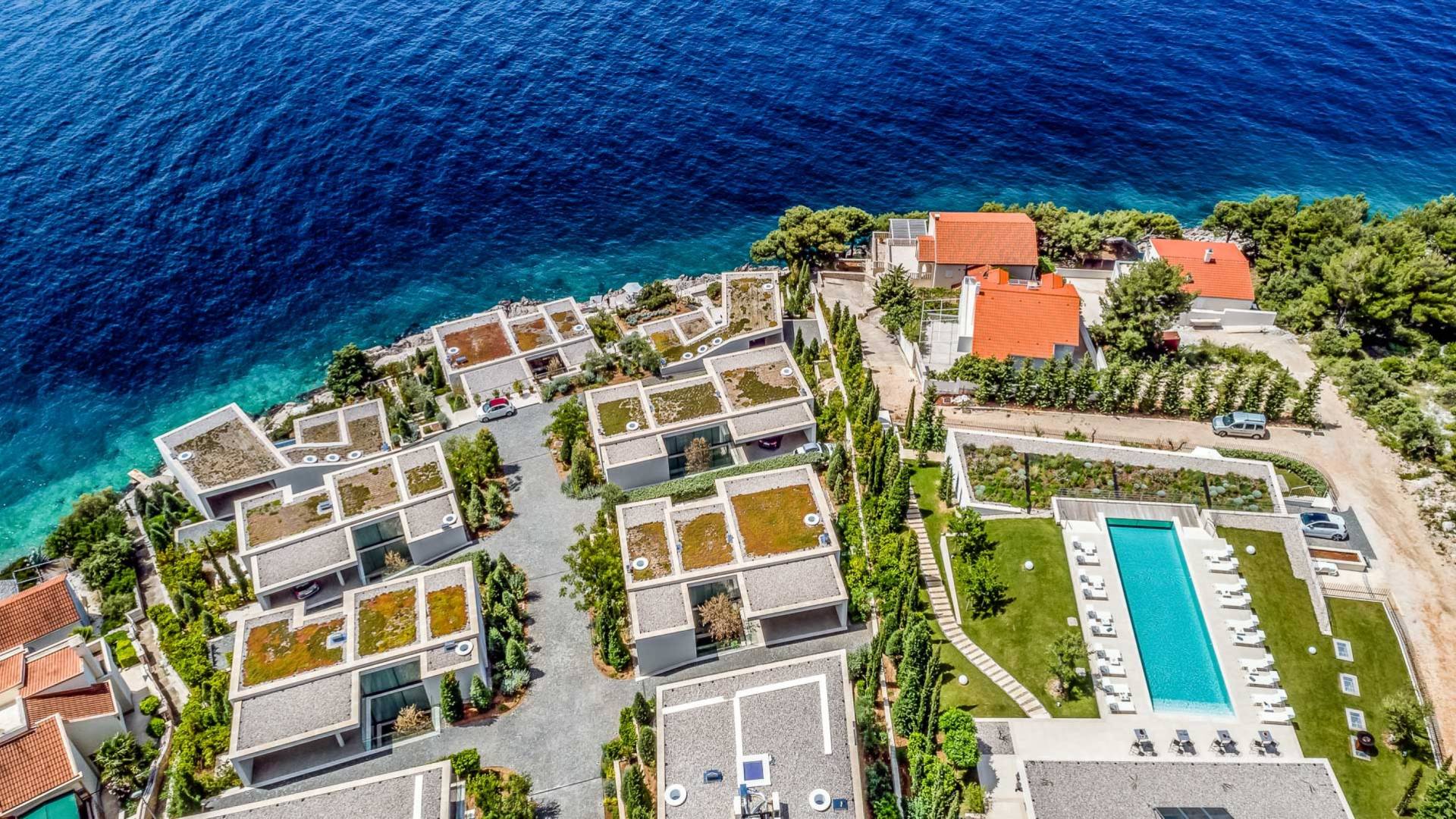 Los arquitectos han prestado especial atención a la posición del conjunto, que al mismo tiempo otorga exclusividad a cada unidad individual del mismo, sin embargo no las separa entre sí, brindando así una vista única y despejada de cada uno de ellos. Los techos verdes en cada una de las villas crean la impresión de un jardín para la villa que está detrás.