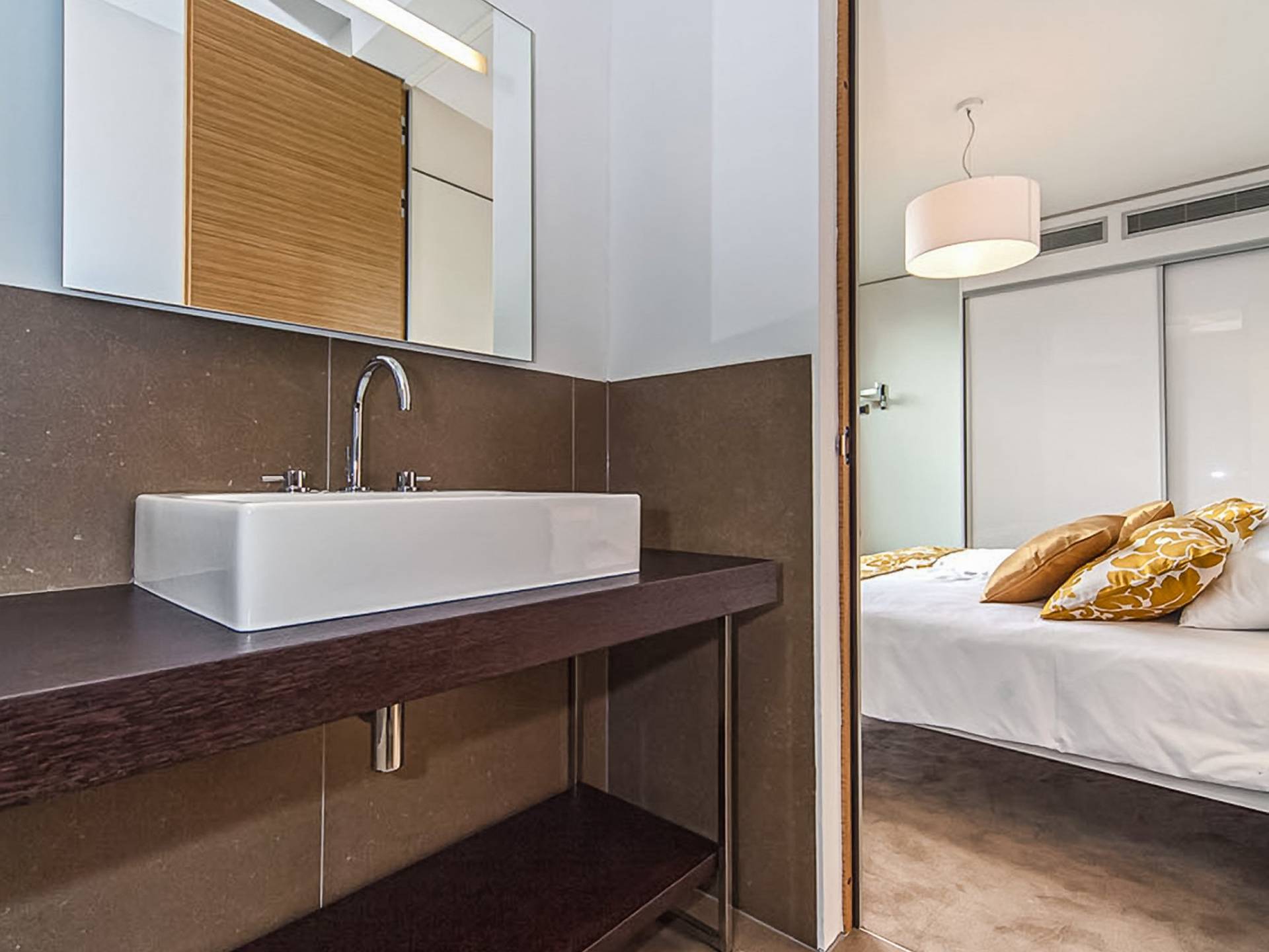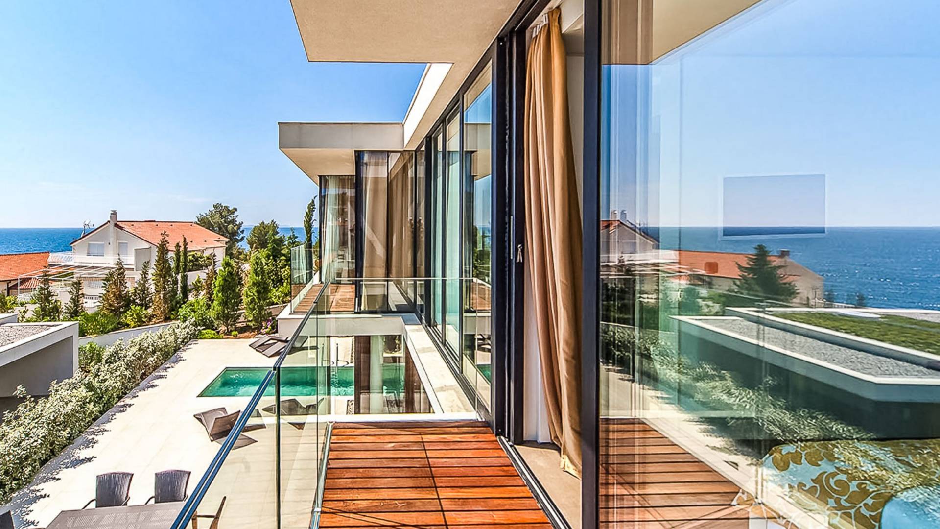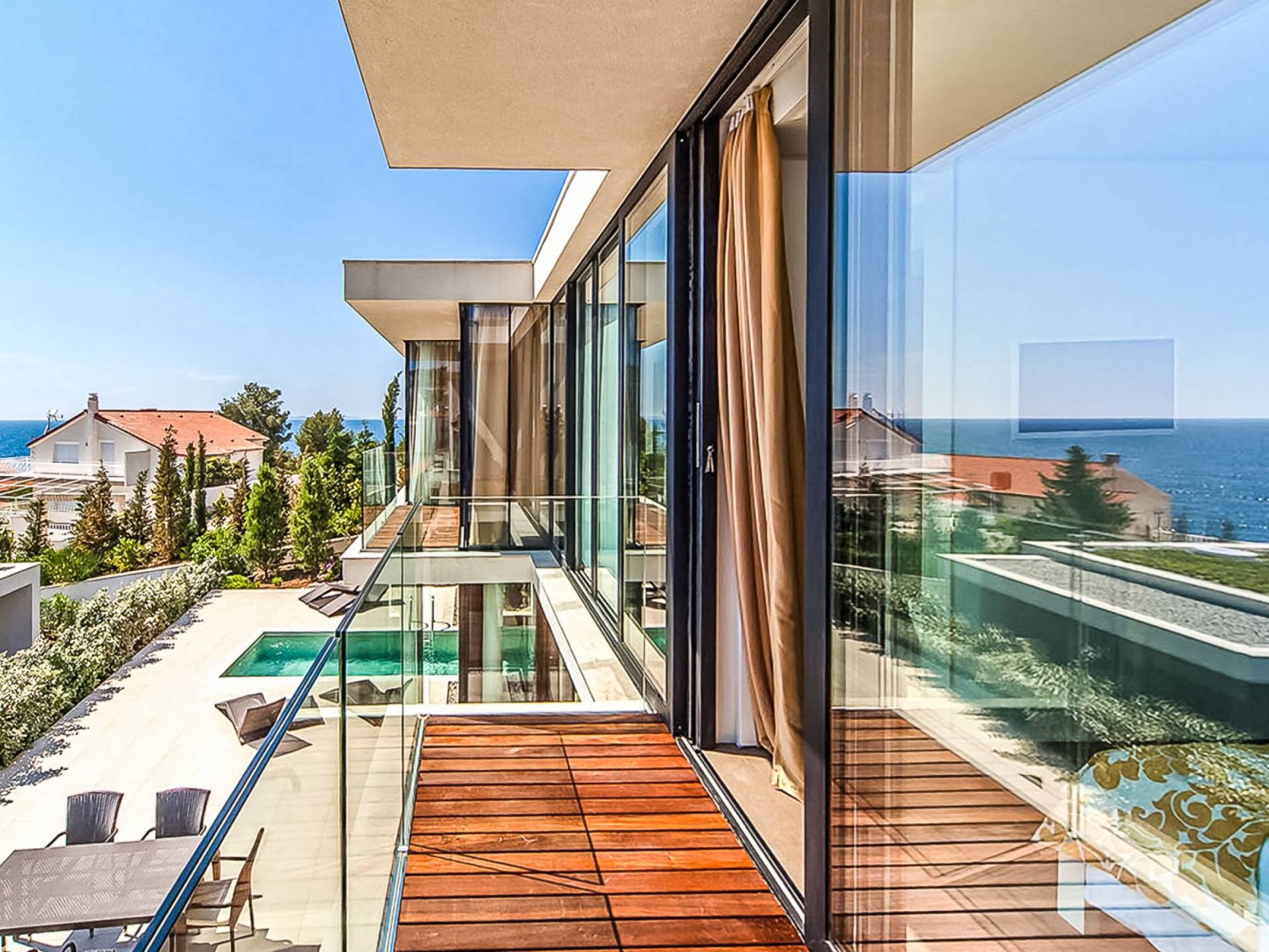 Las cuatro habitaciones con aire acondicionado están todas en el nivel superior, a las que se accede a través de la impresionante escalera abierta. Cada dormitorio tiene su propio baño privado y dos tienen balcones con vistas al mar.