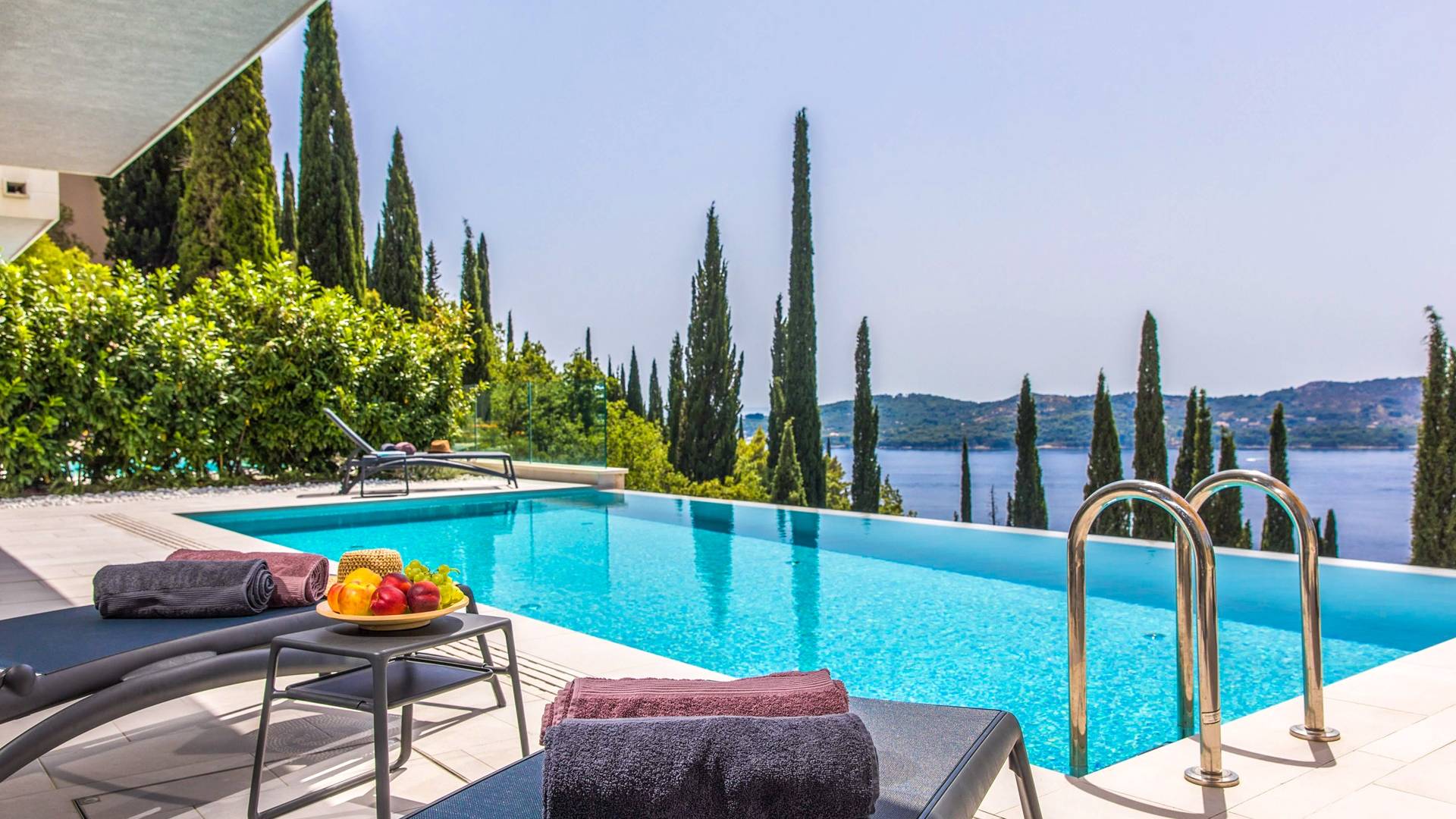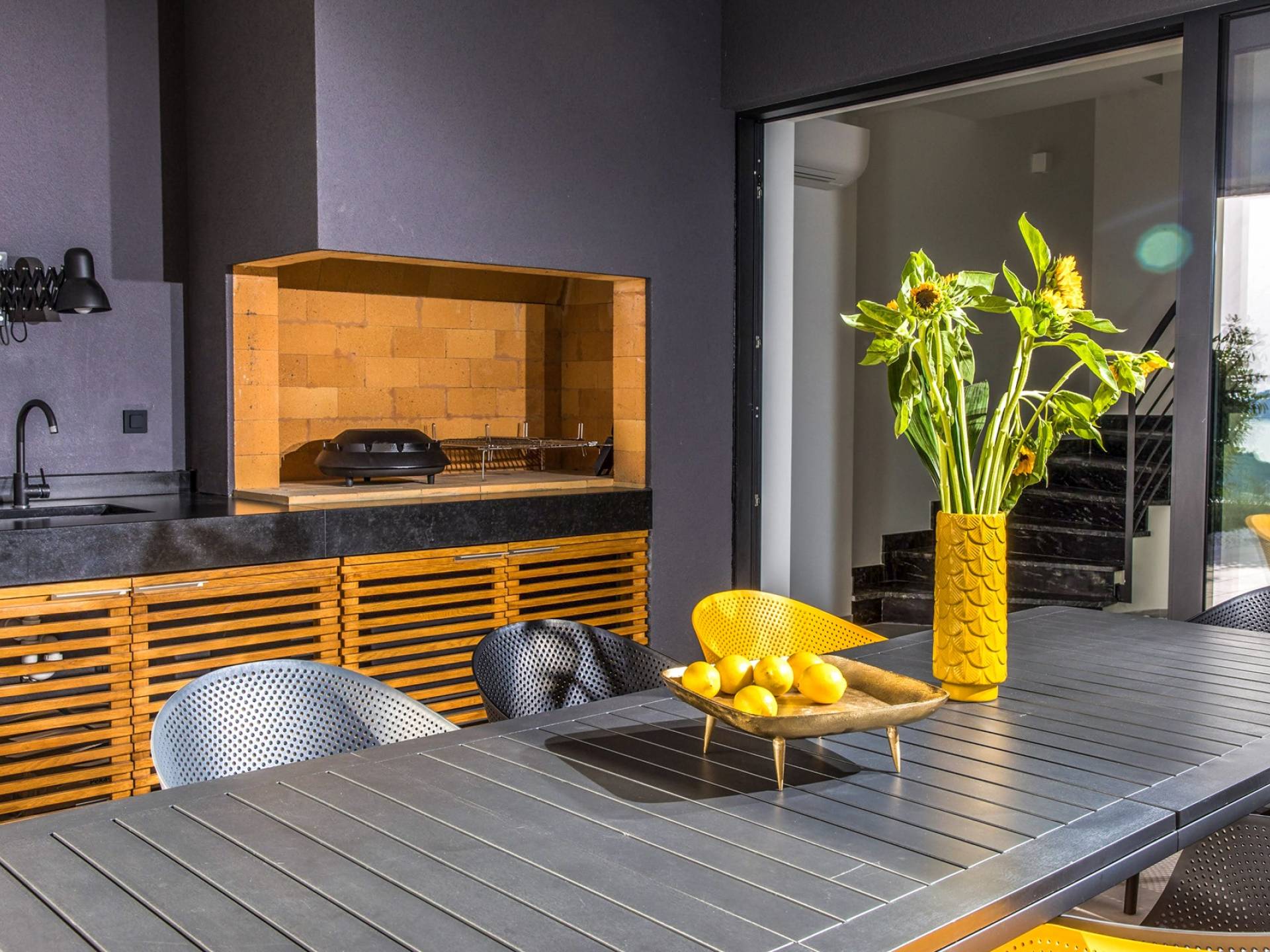 Aquí está también la parte más interesante de la impresionante piscina infinita de esta hermosa villa. Sentirás que todas tus preocupaciones desaparecen mientras flotas en el agua, contemplando una vista panorámica de los alrededores. Alrededor de la piscina, hay una terraza solárium con hamacas, zona chill-out con sofás al aire libre que son el lugar perfecto para tomar un café temprano en la mañana o tomar unas copas bajo el último sol de la tarde.