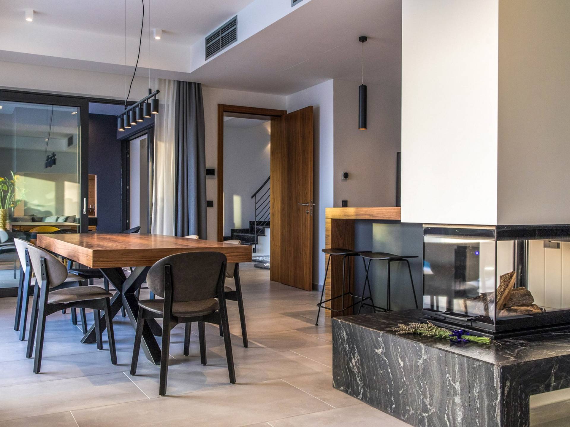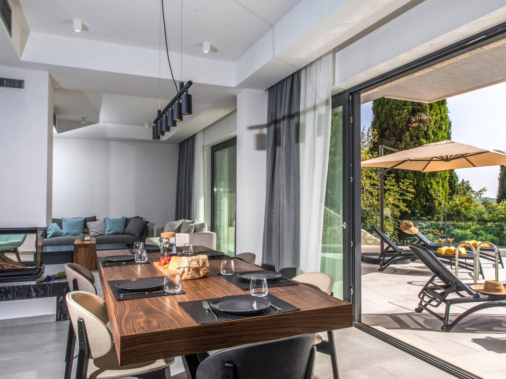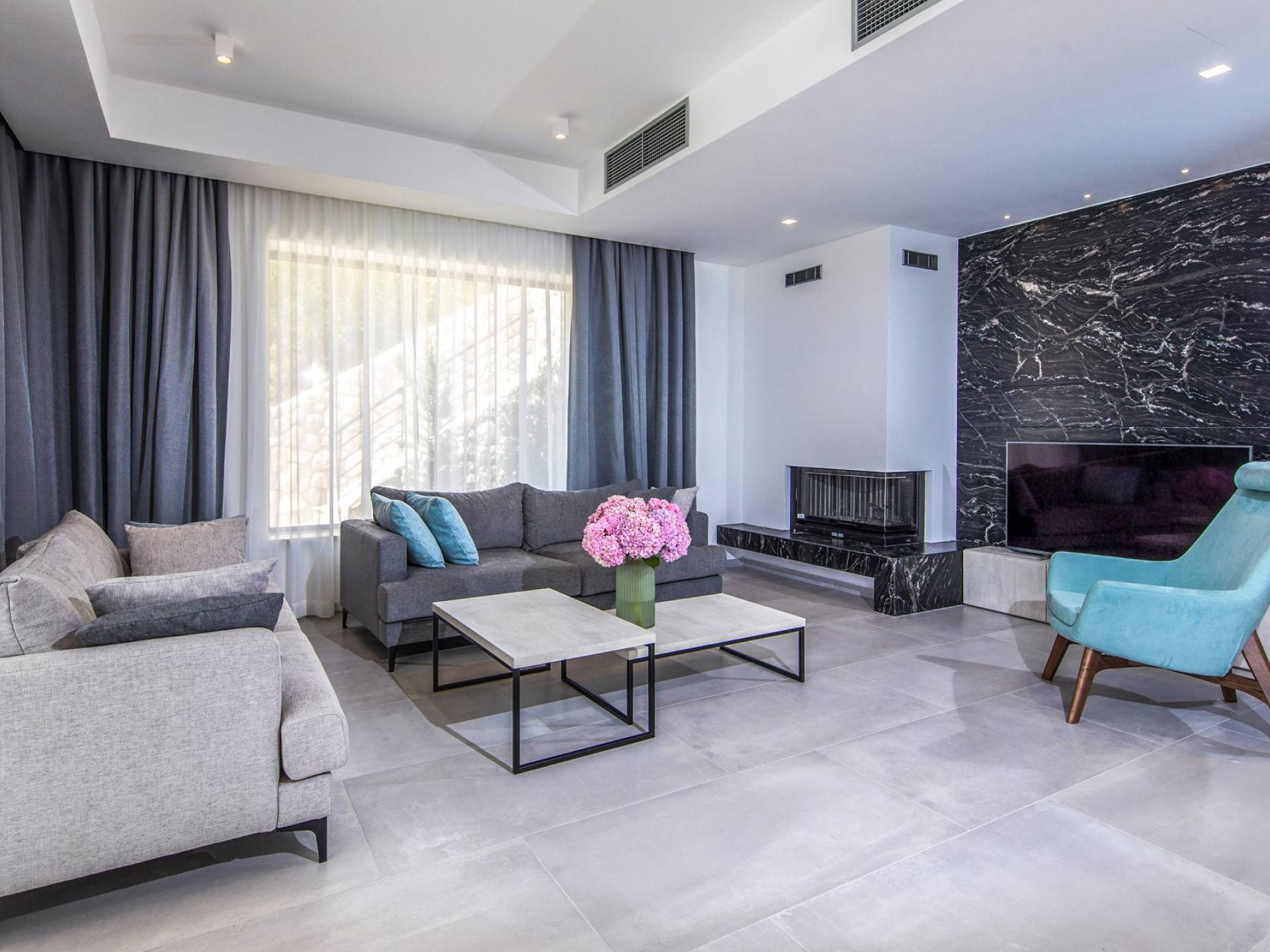 Las escaleras interiores conducen al nivel inferior, donde encontrará tres dormitorios más con baño, todos con vista al mar y uno es un dormitorio con dos camas individuales. En la planta baja, hay una sala de estar central con un cómodo sofá grande, comedor, una cocina moderna y totalmente equipada, con todos los electrodomésticos. En este nivel, también hay un baño para invitados. El salón conduce a la amplia terraza con salón y comedor, lo que hace que comer al aire libre sea inevitable.
