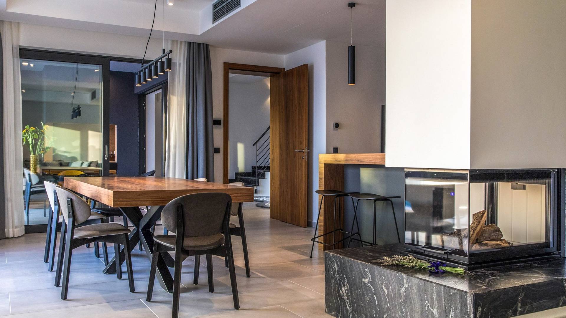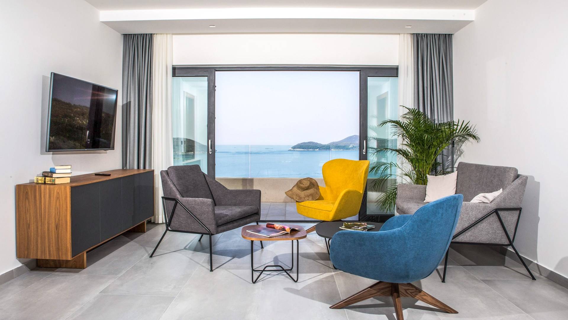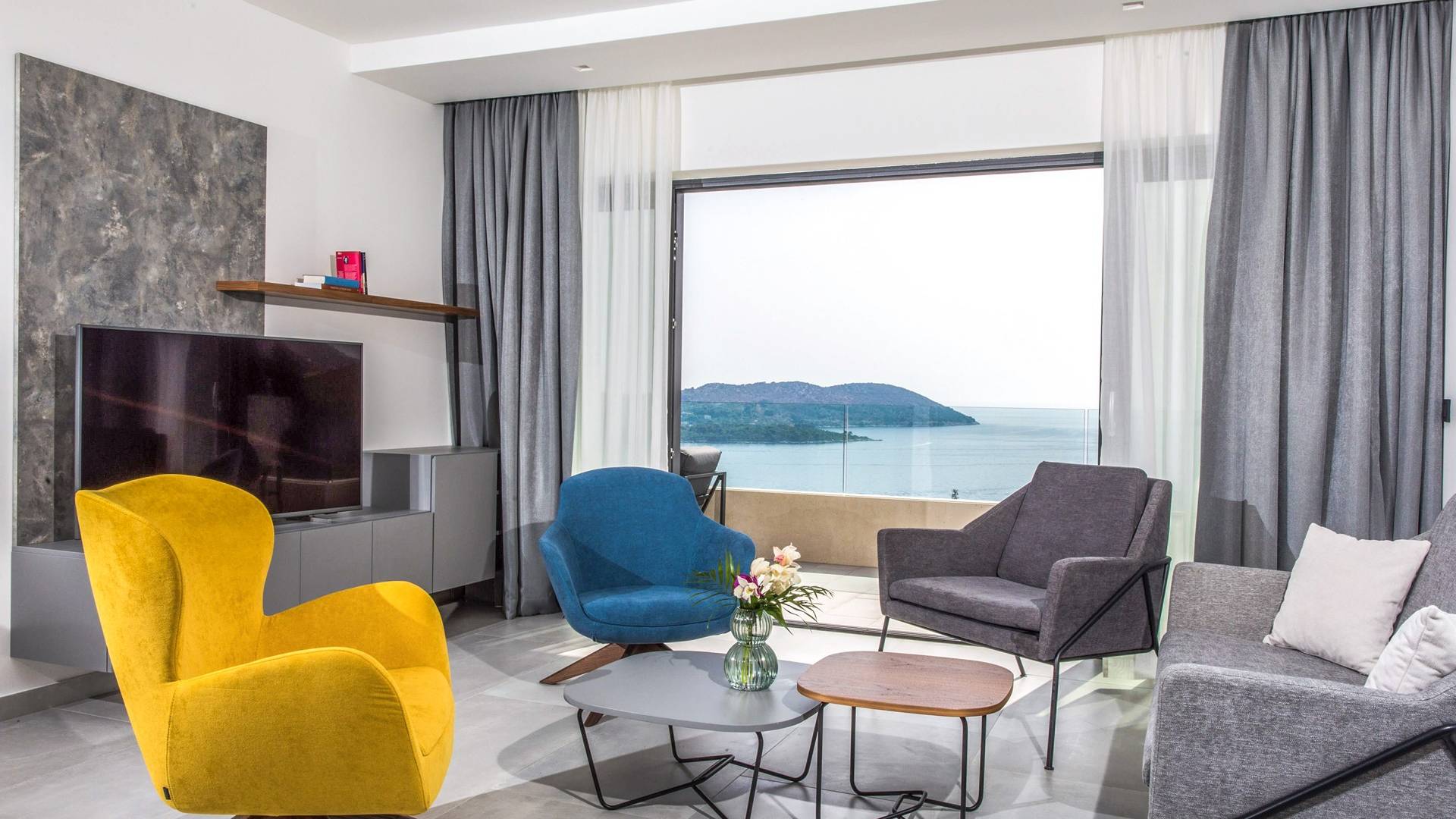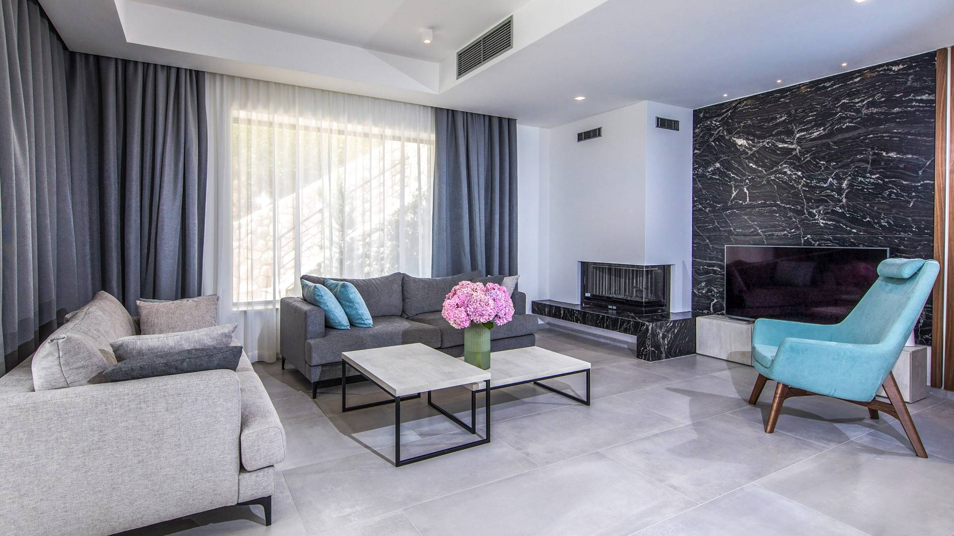 Las escaleras interiores conducen al nivel inferior, donde encontrará tres dormitorios más con baño, todos con vista al mar y uno es un dormitorio con dos camas individuales. En la planta baja, hay una sala de estar central con un cómodo sofá grande, comedor, una cocina moderna y totalmente equipada, con todos los electrodomésticos. En este nivel, también hay un baño para invitados. El salón conduce a la amplia terraza con salón y comedor, lo que hace que comer al aire libre sea inevitable.
