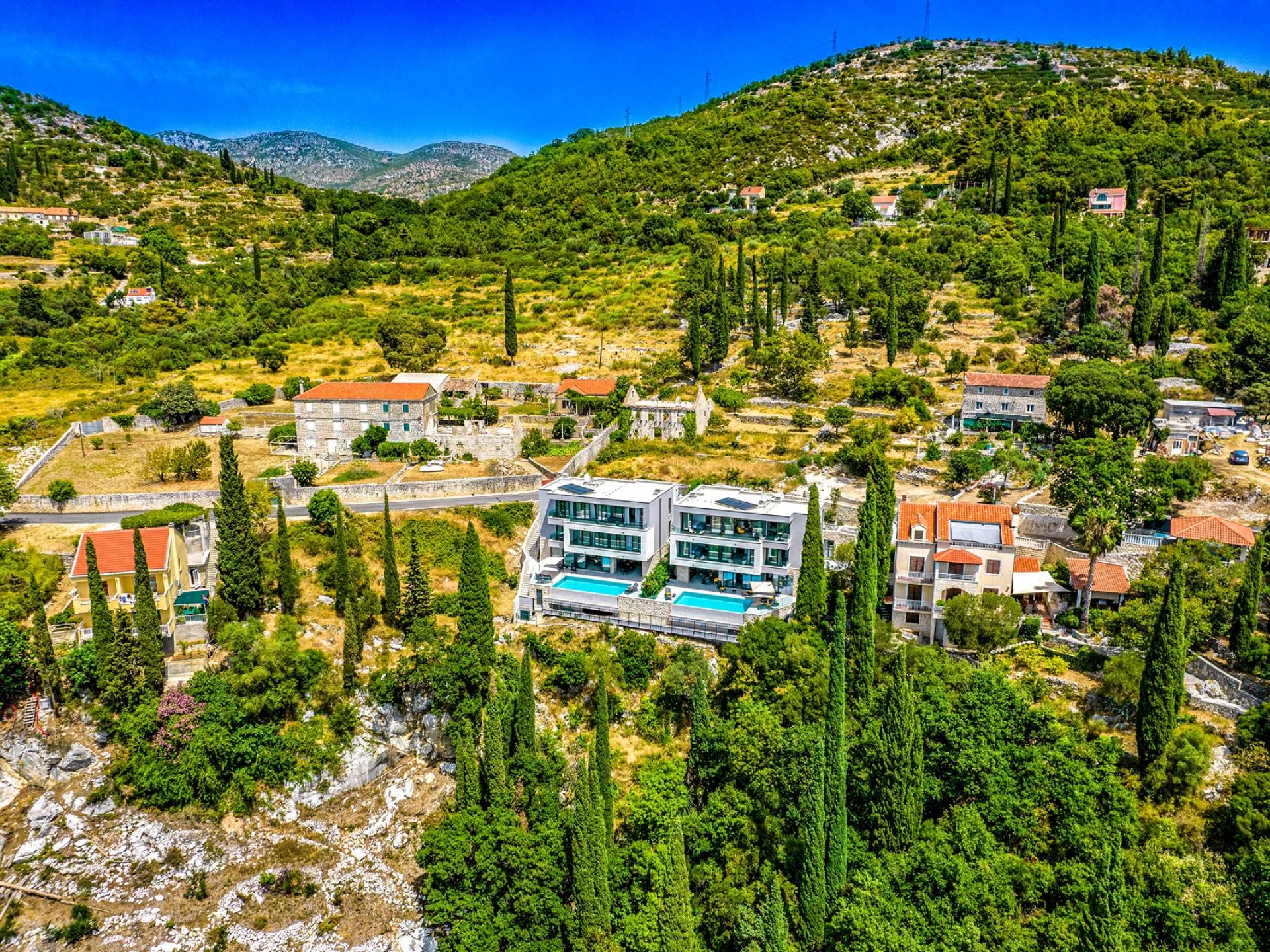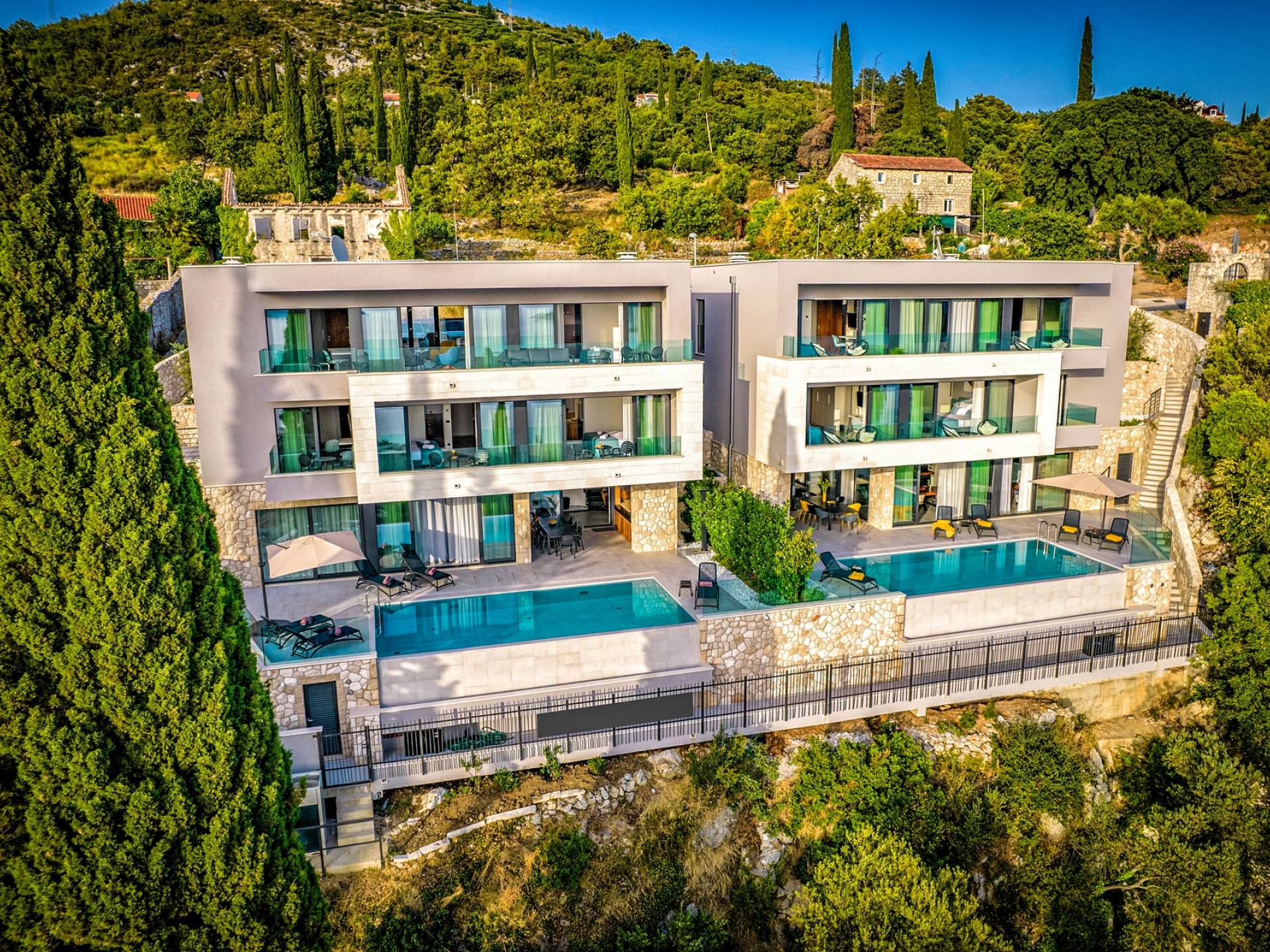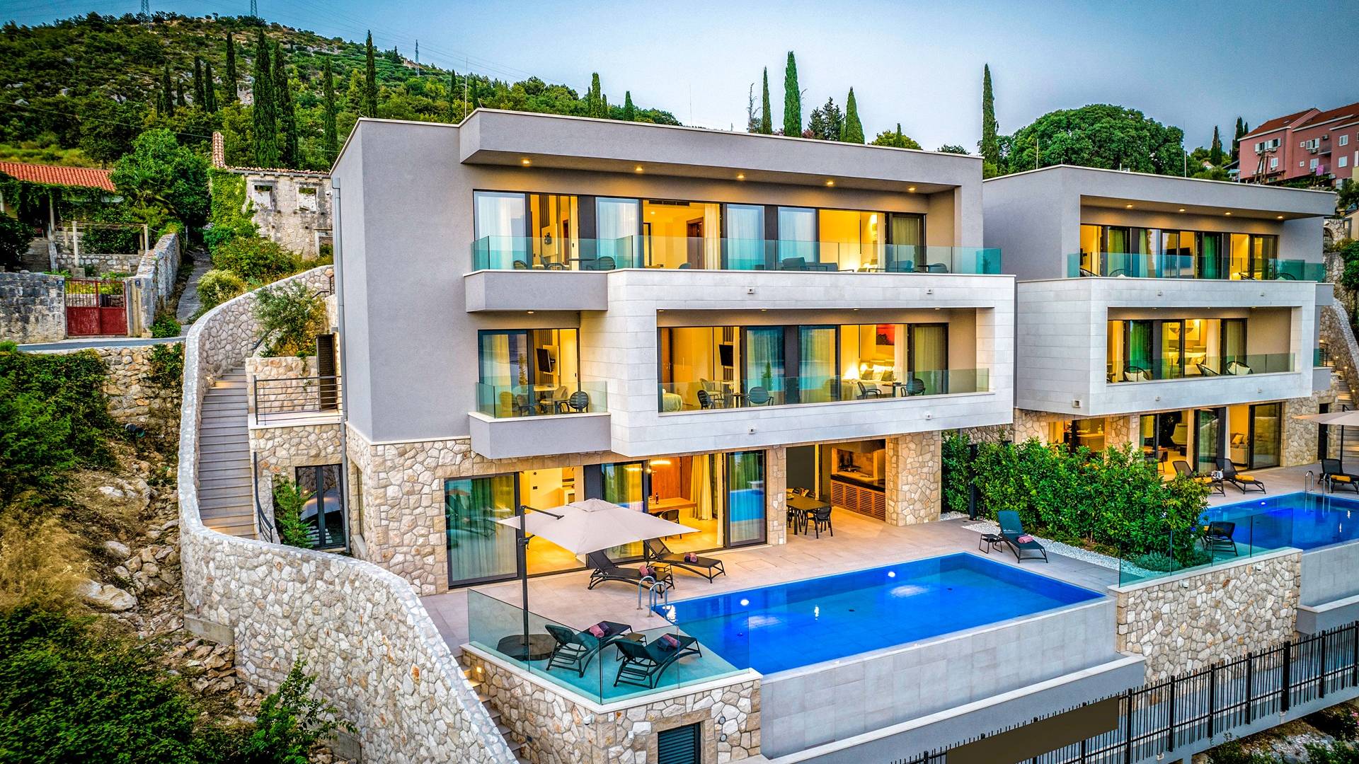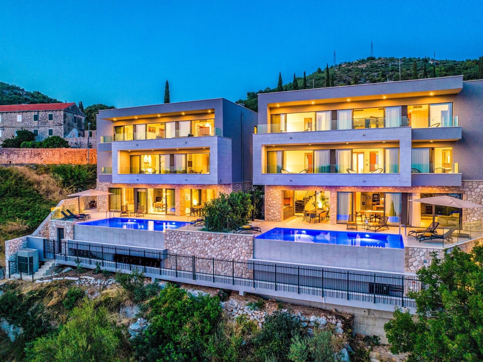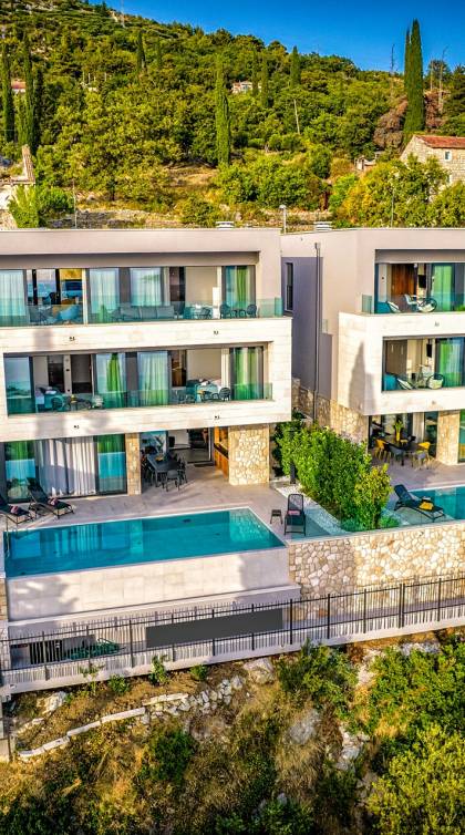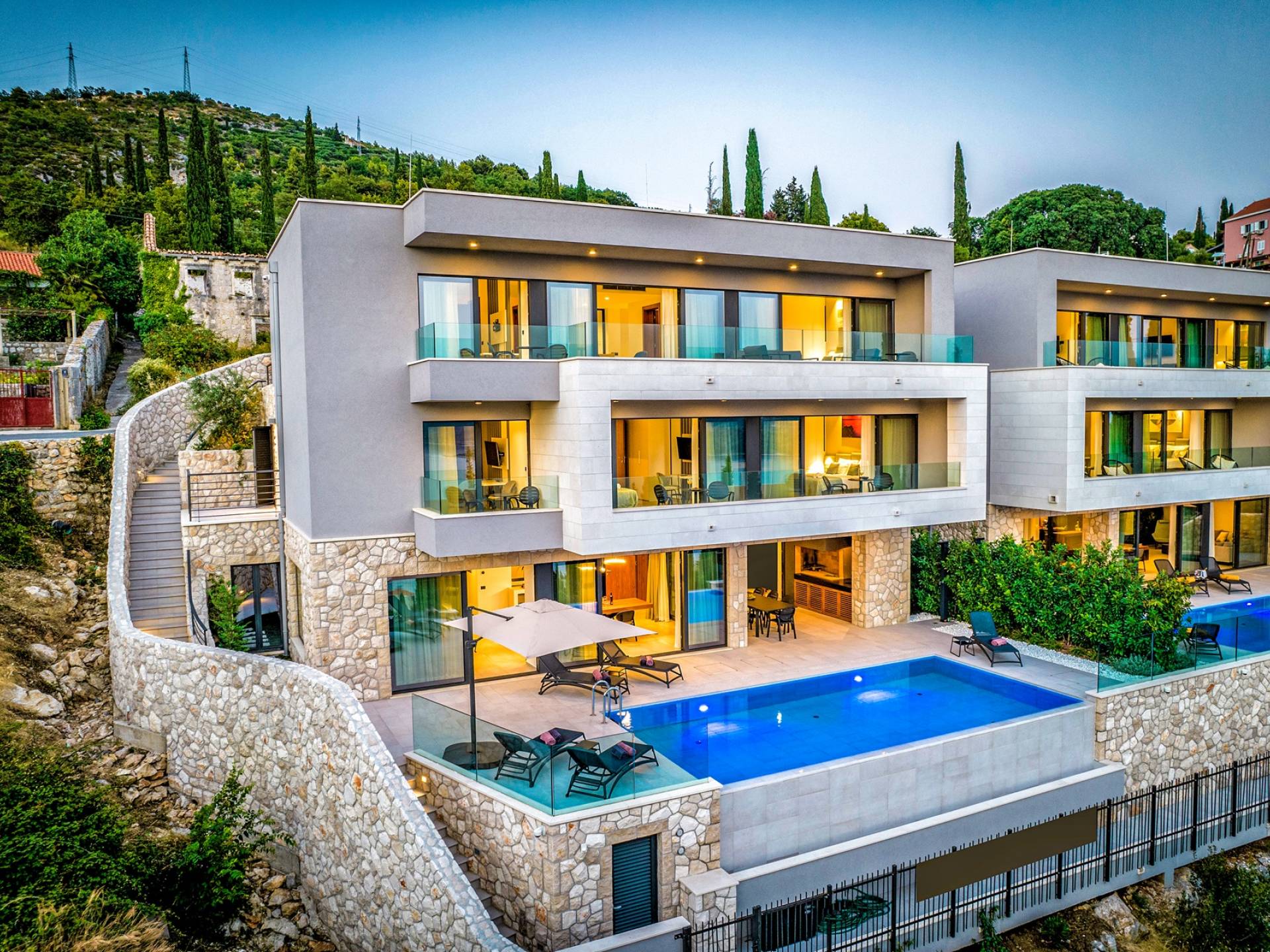 Estas villas de nueva construcción son un maravilloso ejemplo de arquitectura moderna e innovadora, espaciosas y aireadas, y los techos altos y las paredes de vidrio dan la sensación de libertad y abren la vista de las islas Dubrovnik. Los opuestos, es decir, las islas y el mar Adriático por un lado y las colinas circundantes por el otro, hacen que Orasac sea único. En medio de un hermoso paisaje natural, construido en una colina elevada, la villa ofrece una vista fantástica sobre el mar y la costa circundante. La villa con su mobiliario de alta calidad se ha integrado perfectamente en el paisaje de ladera mediterránea y se construyó en terrazas de varios niveles.