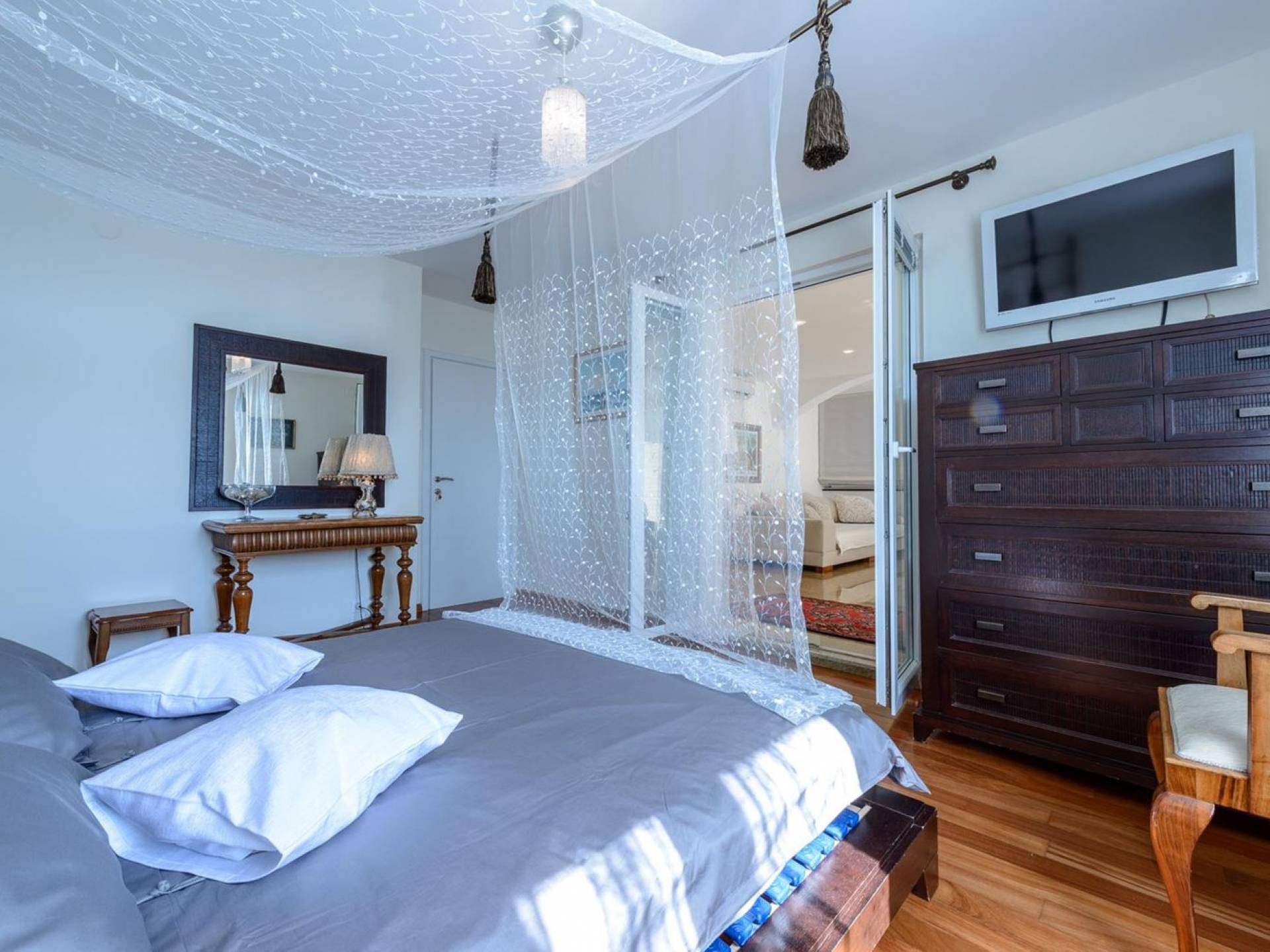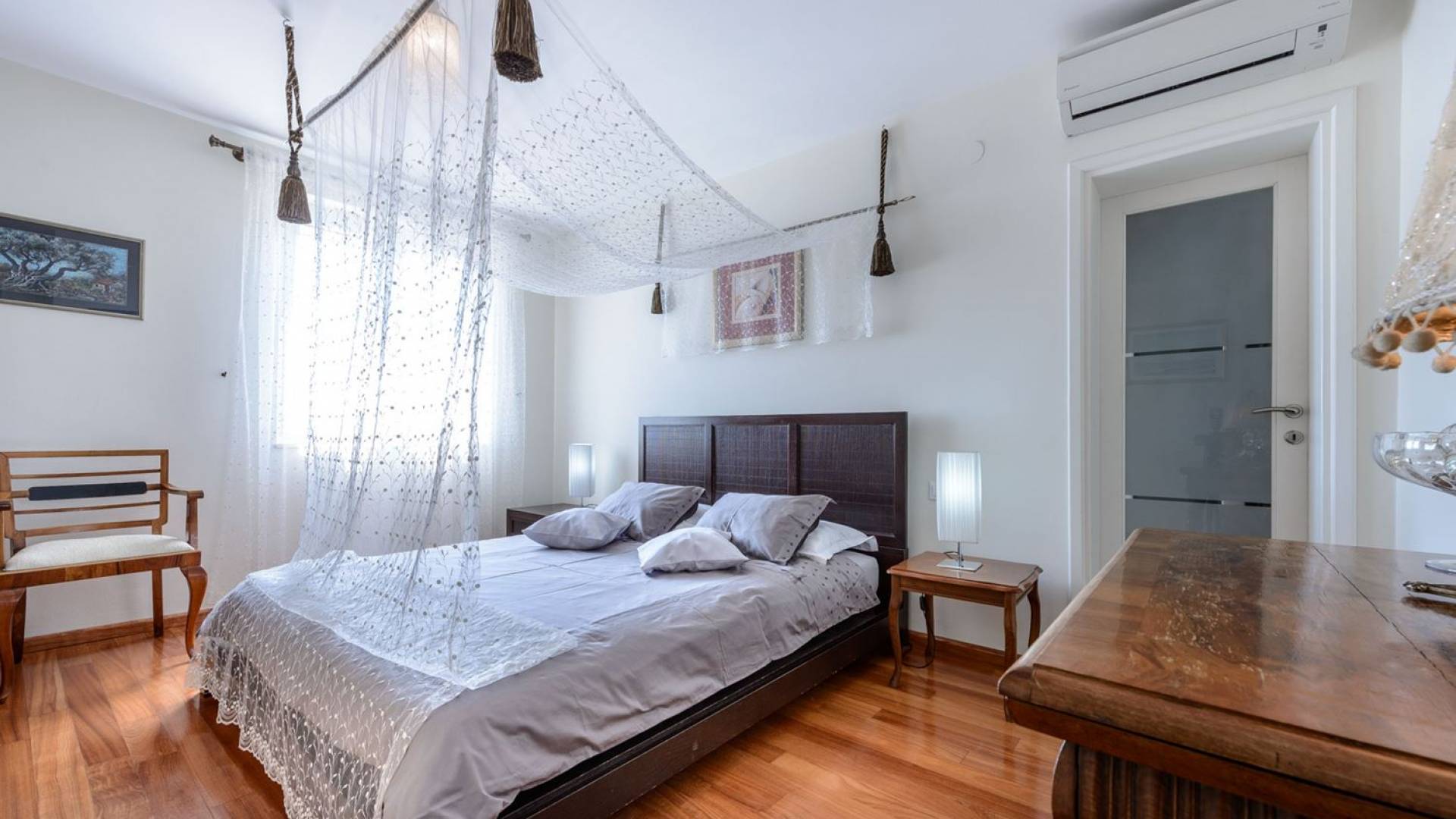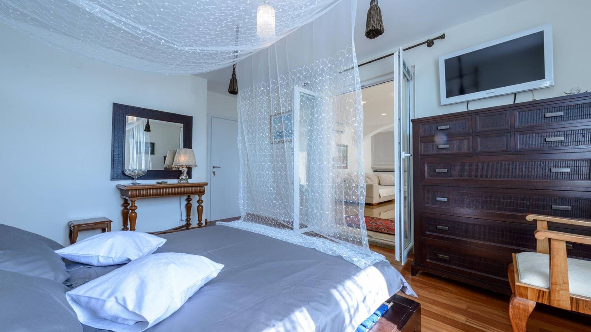 En el segundo piso de Villa Dubrovnik Residence hay habitaciones lujosamente decoradas con camas dobles, cada una con su propio baño. Cada habitación tiene televisión por satélite y aire acondicionado. El dormitorio principal tiene 1 cama doble, vestidor y baño grande con jacuzzi y ducha separada. El segundo dormitorio tiene 1 cama doble. El tercer dormitorio tiene 1 cama doble y 1 sofá cama. En la misma planta también encontrarás un salón único con sofá cama, TV y acceso a la terraza, desde donde podrás disfrutar de la vista romántica de toda la bahía y el mar infinito. Debajo de la piscina hay un apartamento separado con estacionamiento independiente y entrada donde viven los propietarios, los propietarios entran en la villa solo a pedido de los huéspedes o para mantener la piscina y el jardín de acuerdo con los huéspedes.