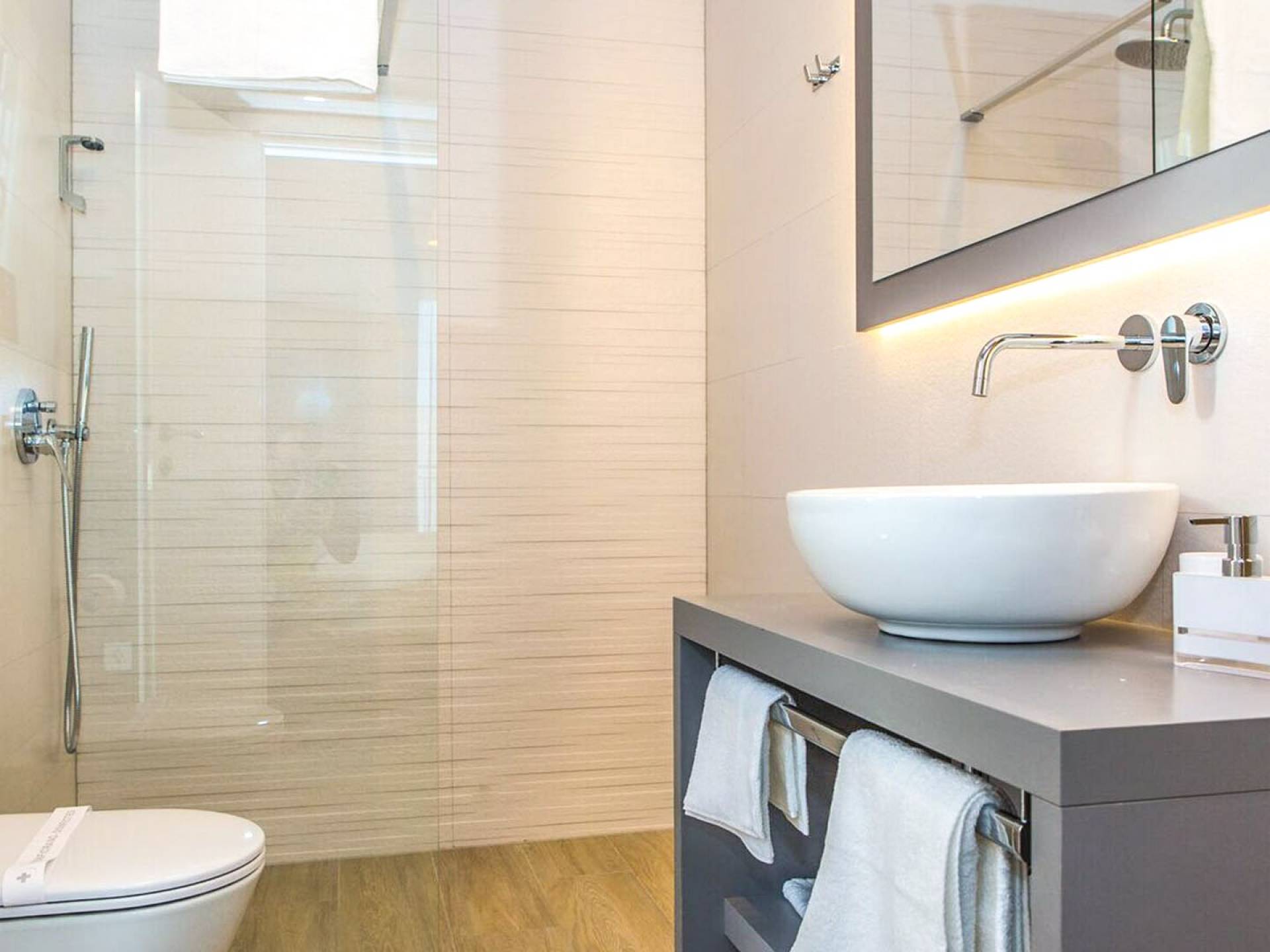 Una moderna escalera conduce al primer piso, diseñado como área de descanso con 3 dormitorios con camas dobles y baños en suite. Cada habitación de la villa está equipada con aire acondicionado y SAT-TV. Dos dormitorios comparten un balcón con vista parcial al mar.