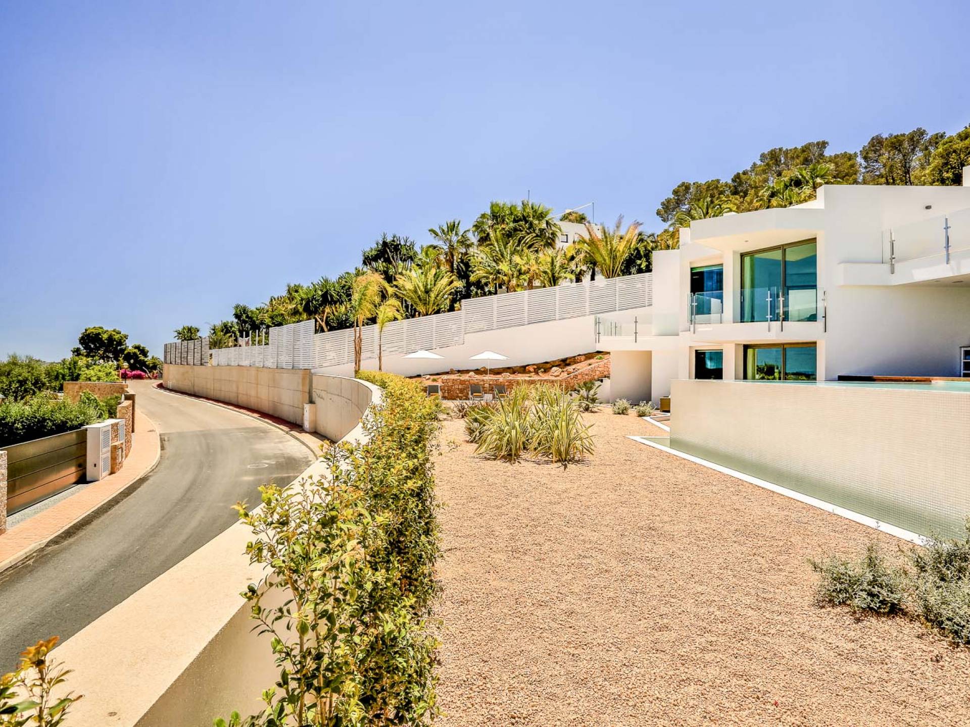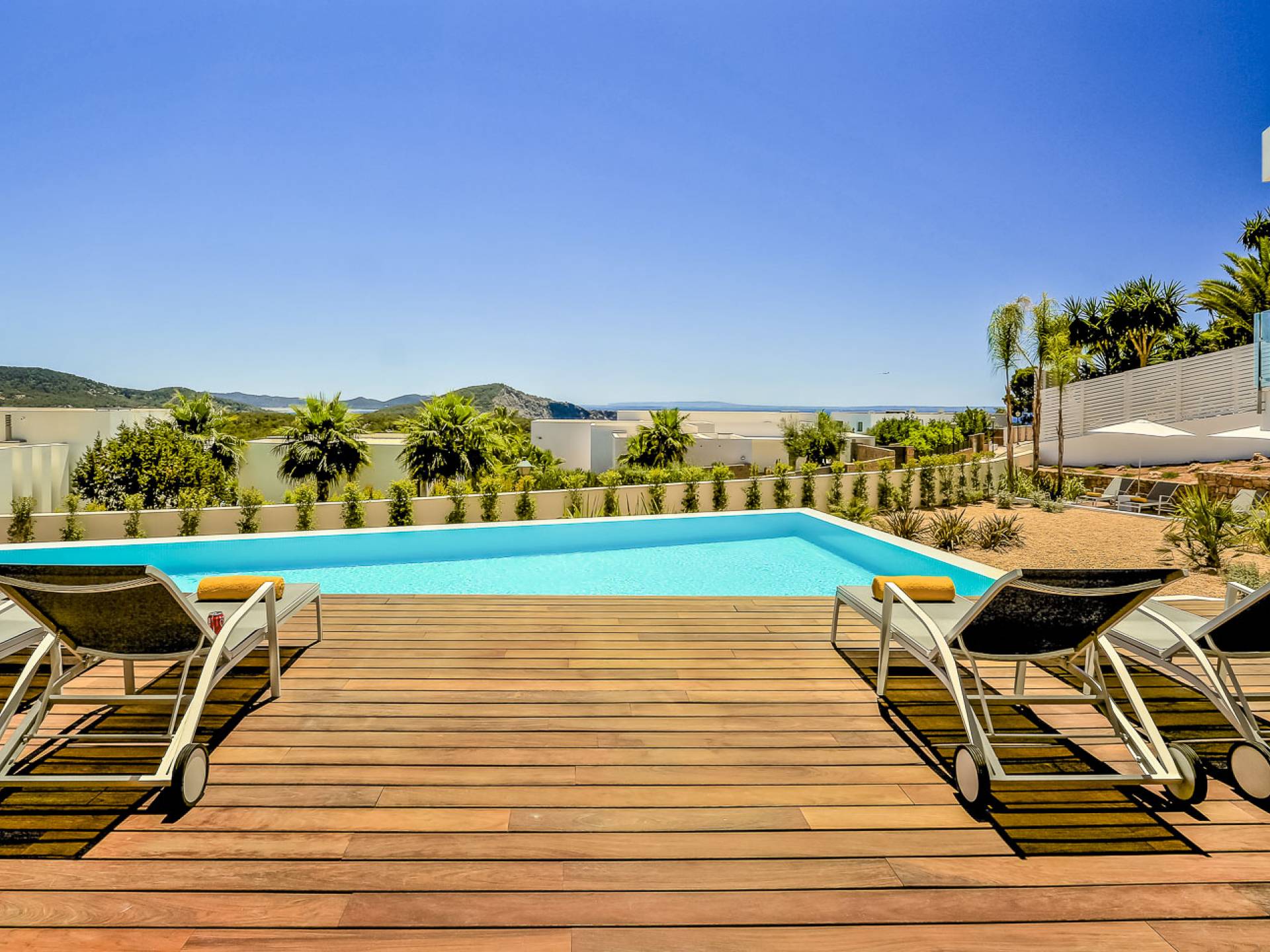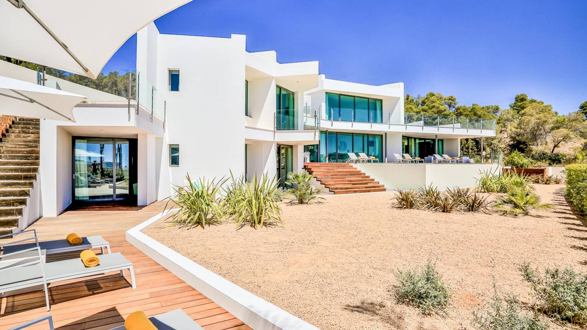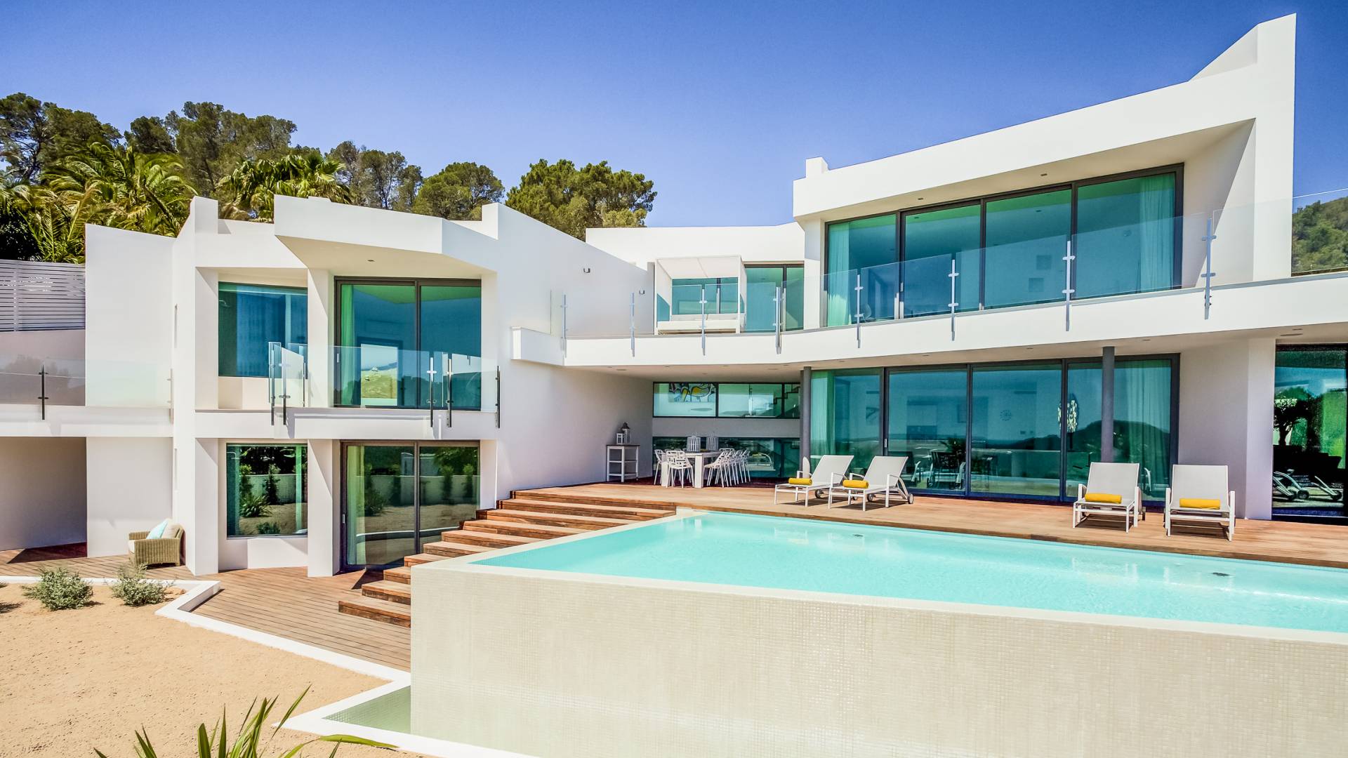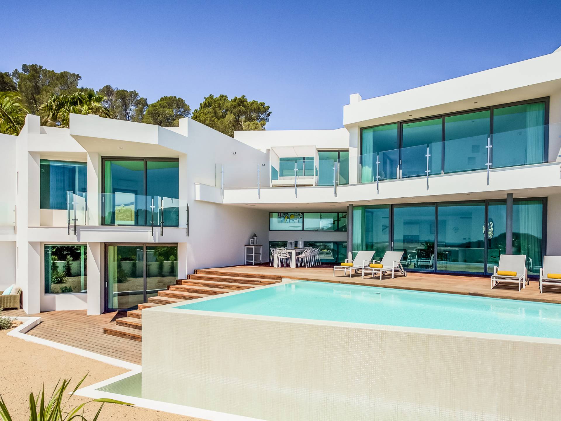 Fuera de Alegre Belle Villa Ibiza, hay jardines paisajísticos de hermoso diseño que están rodeados por un muro de alta seguridad de dos metros para mayor privacidad y un portón eléctrico con videoportero. Hay impresionantes terrazas de madera que rodean la piscina infinita, donde encontrará terrazas cubiertas y descubiertas, con muebles de lujo perfectos para relajarse y disfrutar del sol.