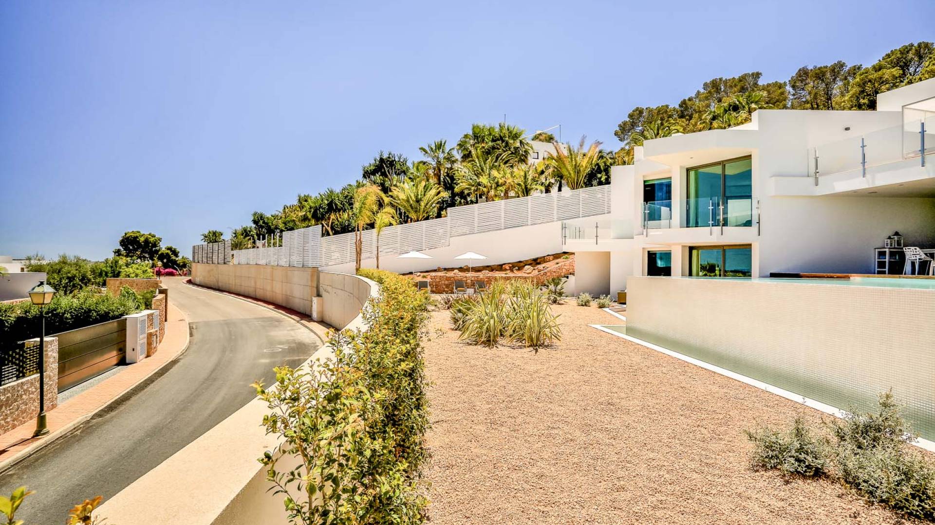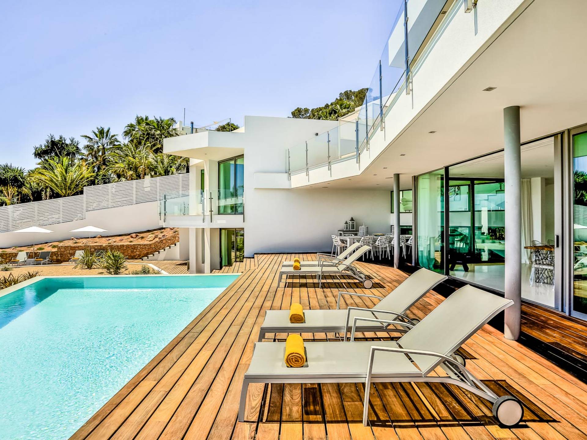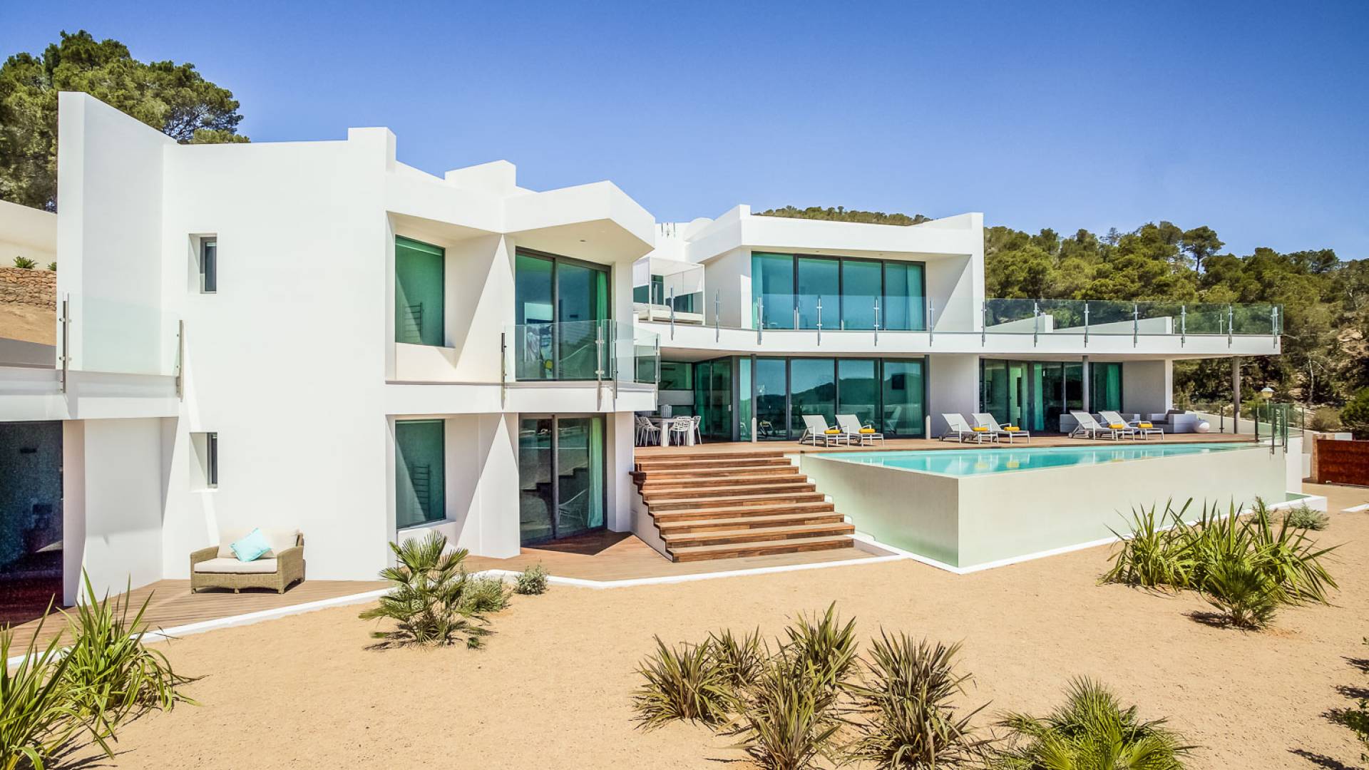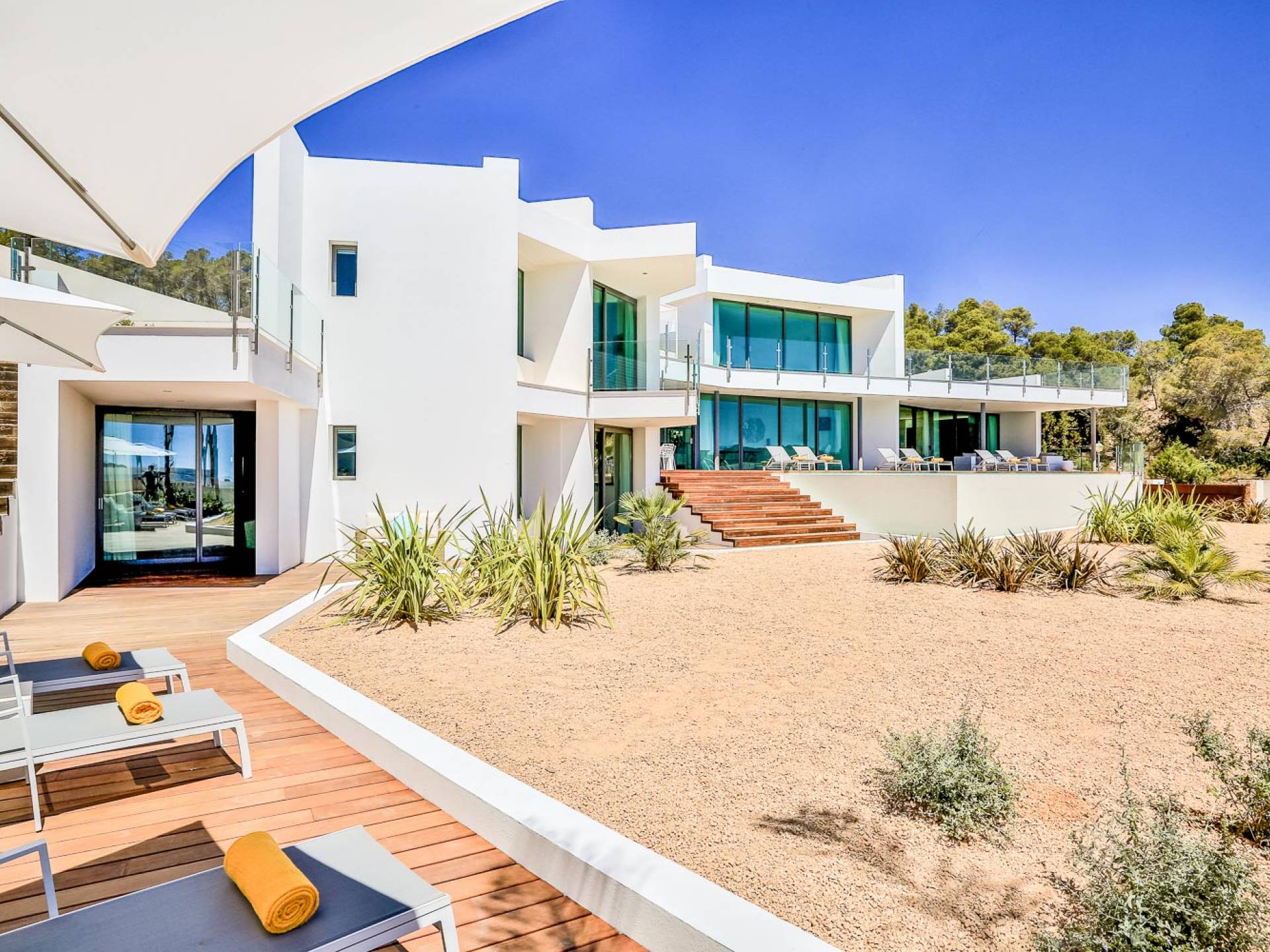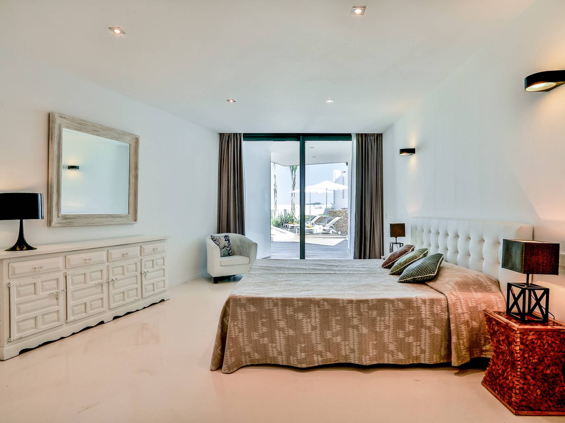 Fuera de Alegre Belle Villa Ibiza, hay jardines paisajísticos de hermoso diseño que están rodeados por un muro de alta seguridad de dos metros para mayor privacidad y un portón eléctrico con videoportero. Hay impresionantes terrazas de madera que rodean la piscina infinita, donde encontrará terrazas cubiertas y descubiertas, con muebles de lujo perfectos para relajarse y disfrutar del sol.