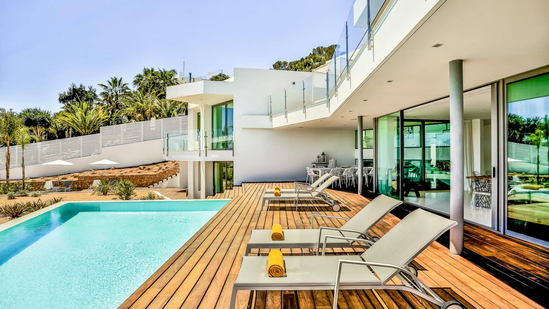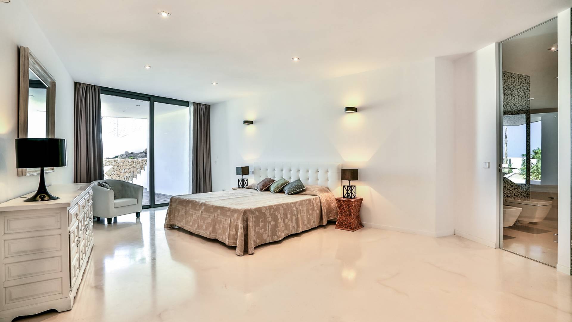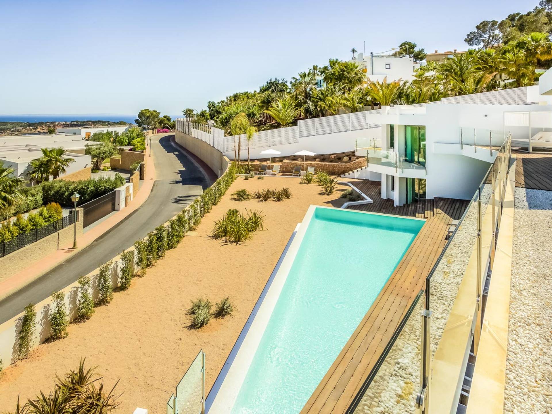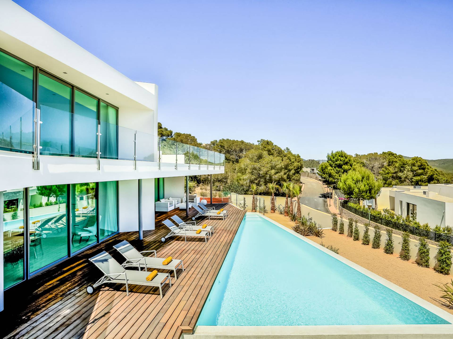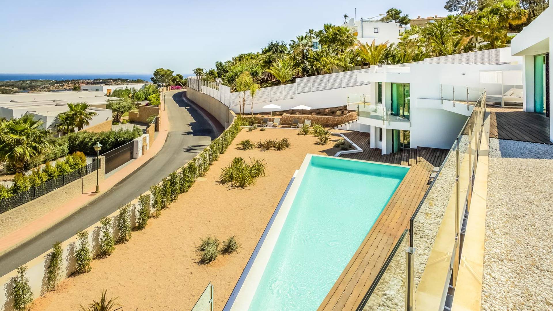 Fuera de Alegre Belle Villa Ibiza, hay jardines paisajísticos de hermoso diseño que están rodeados por un muro de alta seguridad de dos metros para mayor privacidad y un portón eléctrico con videoportero. Hay impresionantes terrazas de madera que rodean la piscina infinita, donde encontrará terrazas cubiertas y descubiertas, con muebles de lujo perfectos para relajarse y disfrutar del sol.
