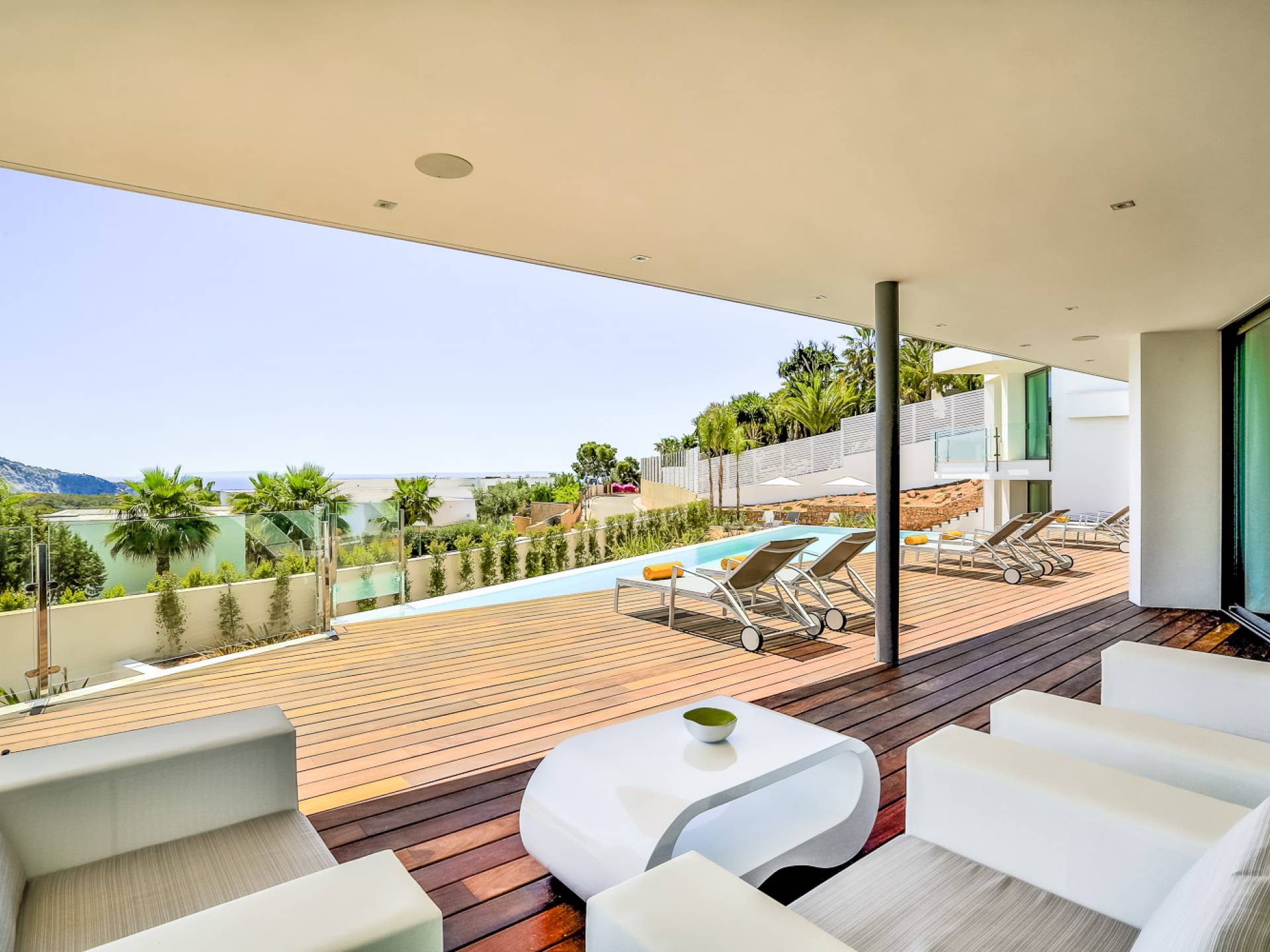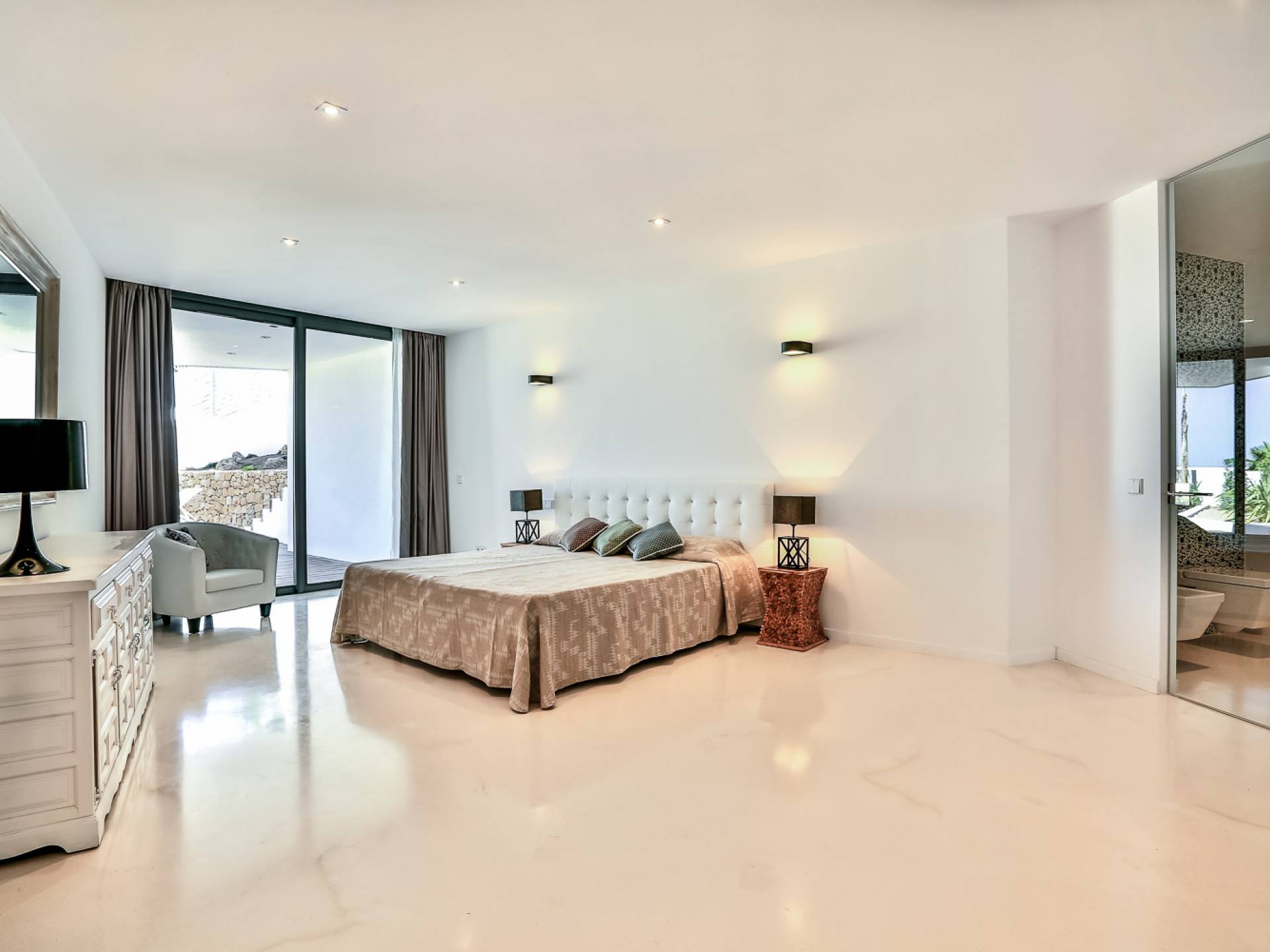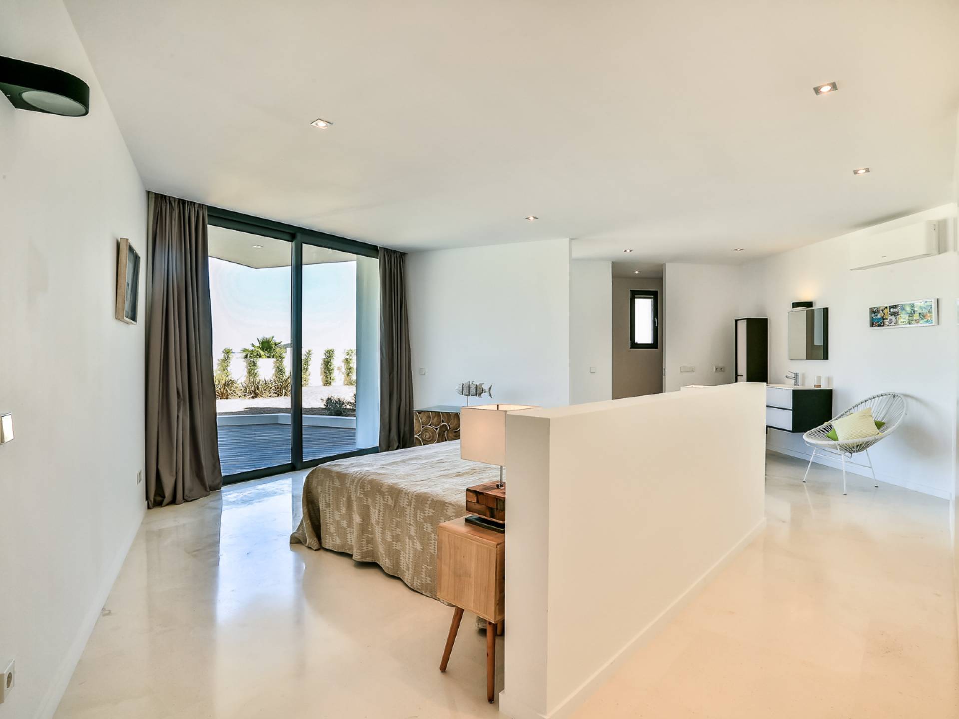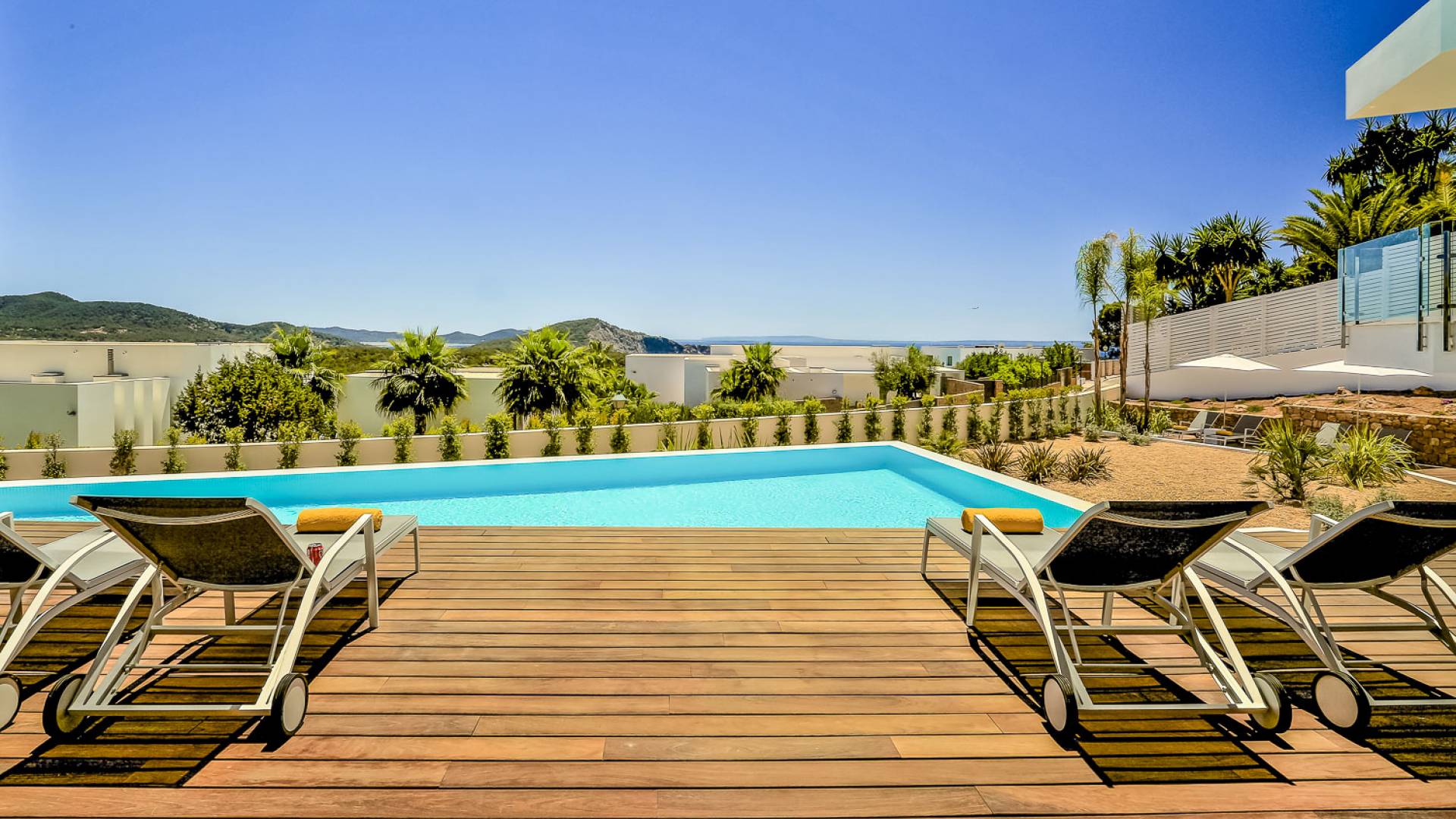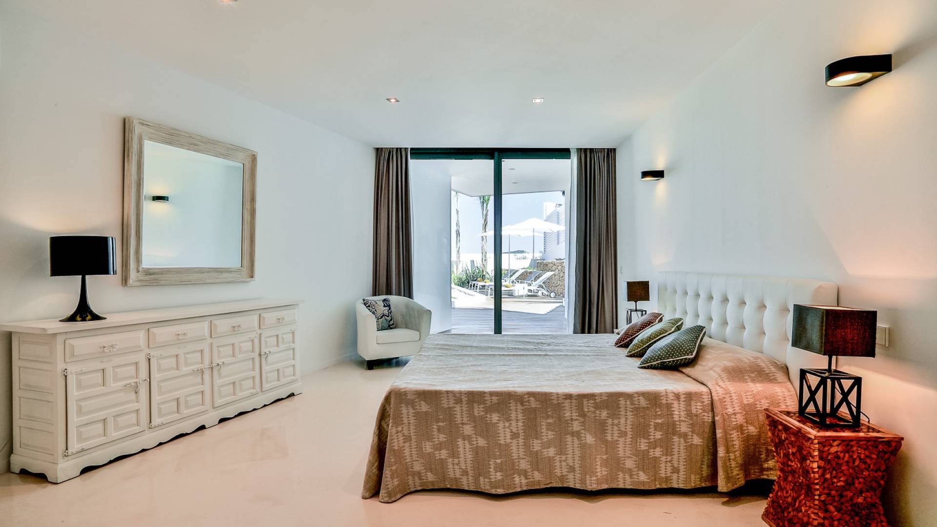 Fuera de Alegre Belle Villa Ibiza, hay jardines paisajísticos de hermoso diseño que están rodeados por un muro de alta seguridad de dos metros para mayor privacidad y un portón eléctrico con videoportero. Hay impresionantes terrazas de madera que rodean la piscina infinita, donde encontrará terrazas cubiertas y descubiertas, con muebles de lujo perfectos para relajarse y disfrutar del sol.