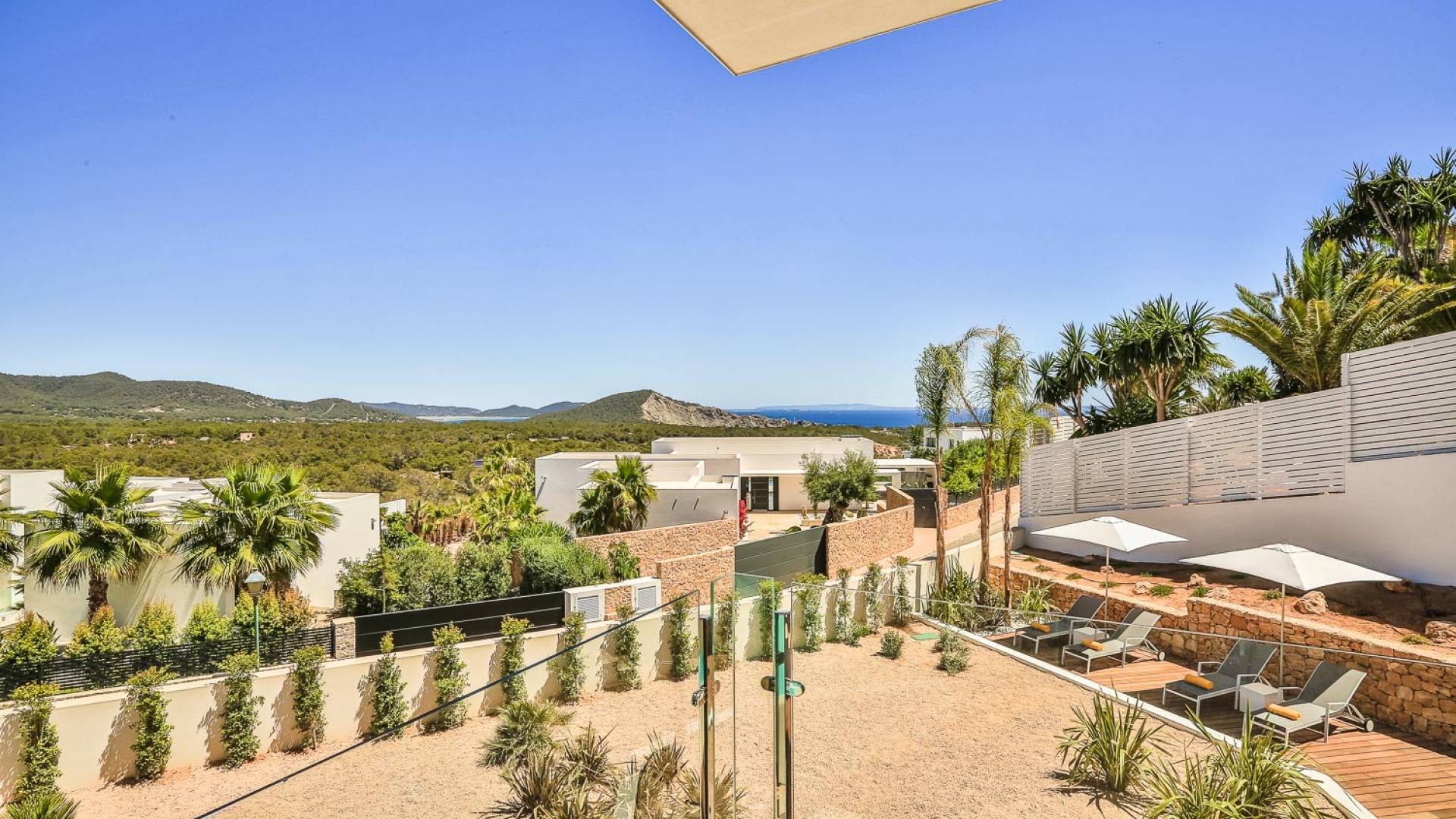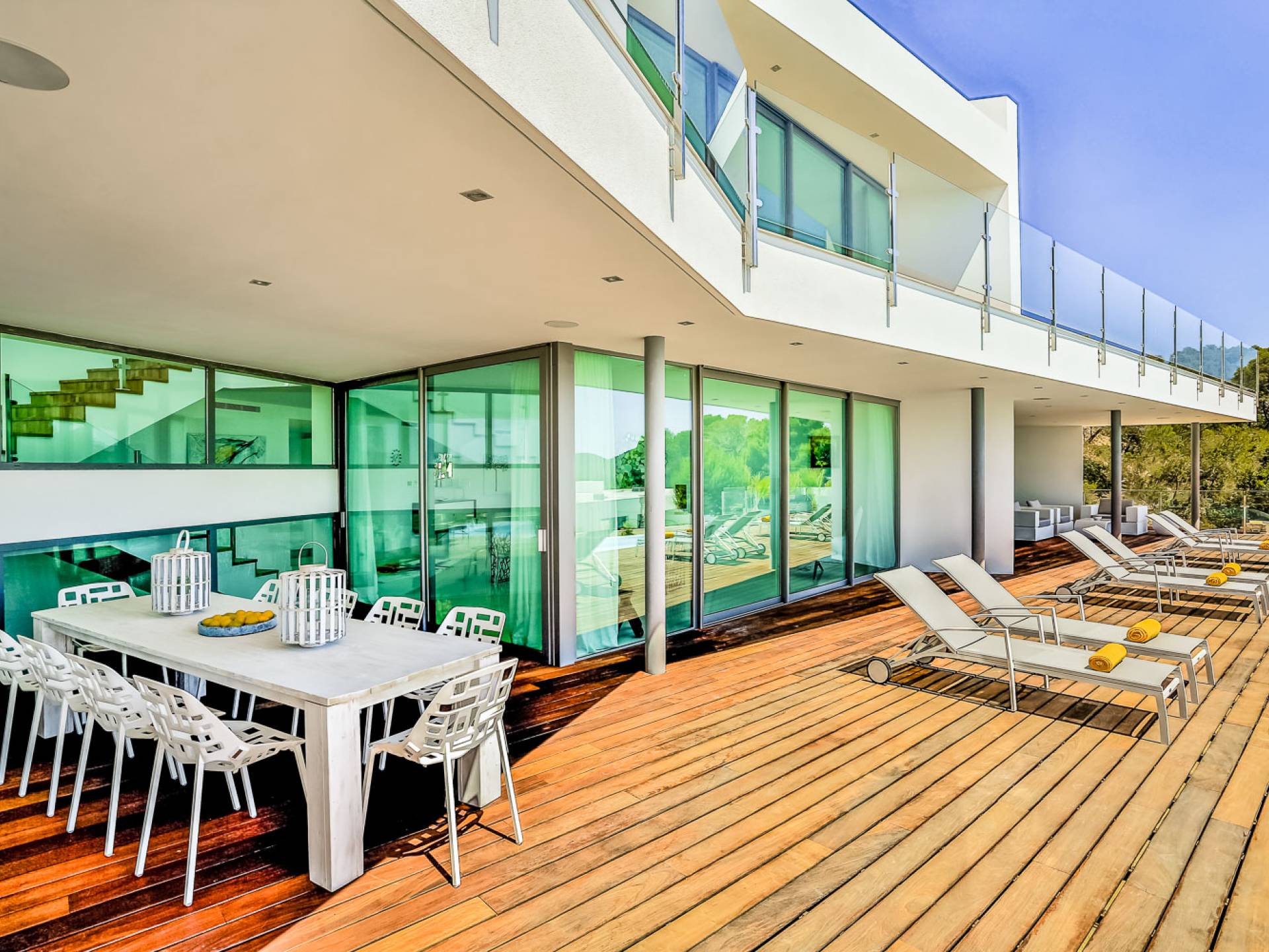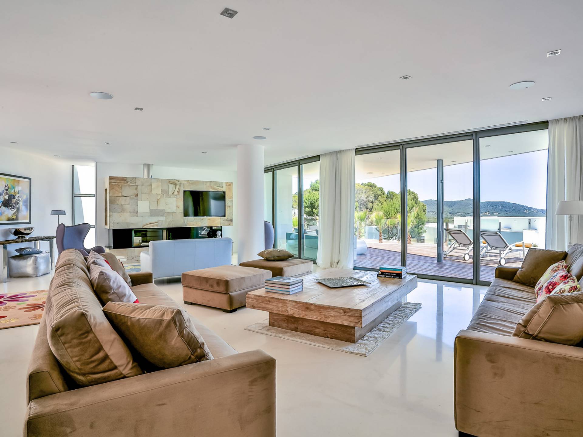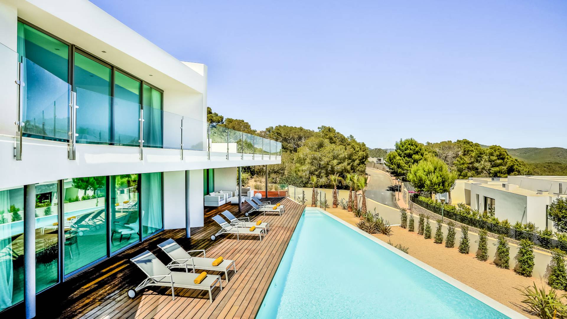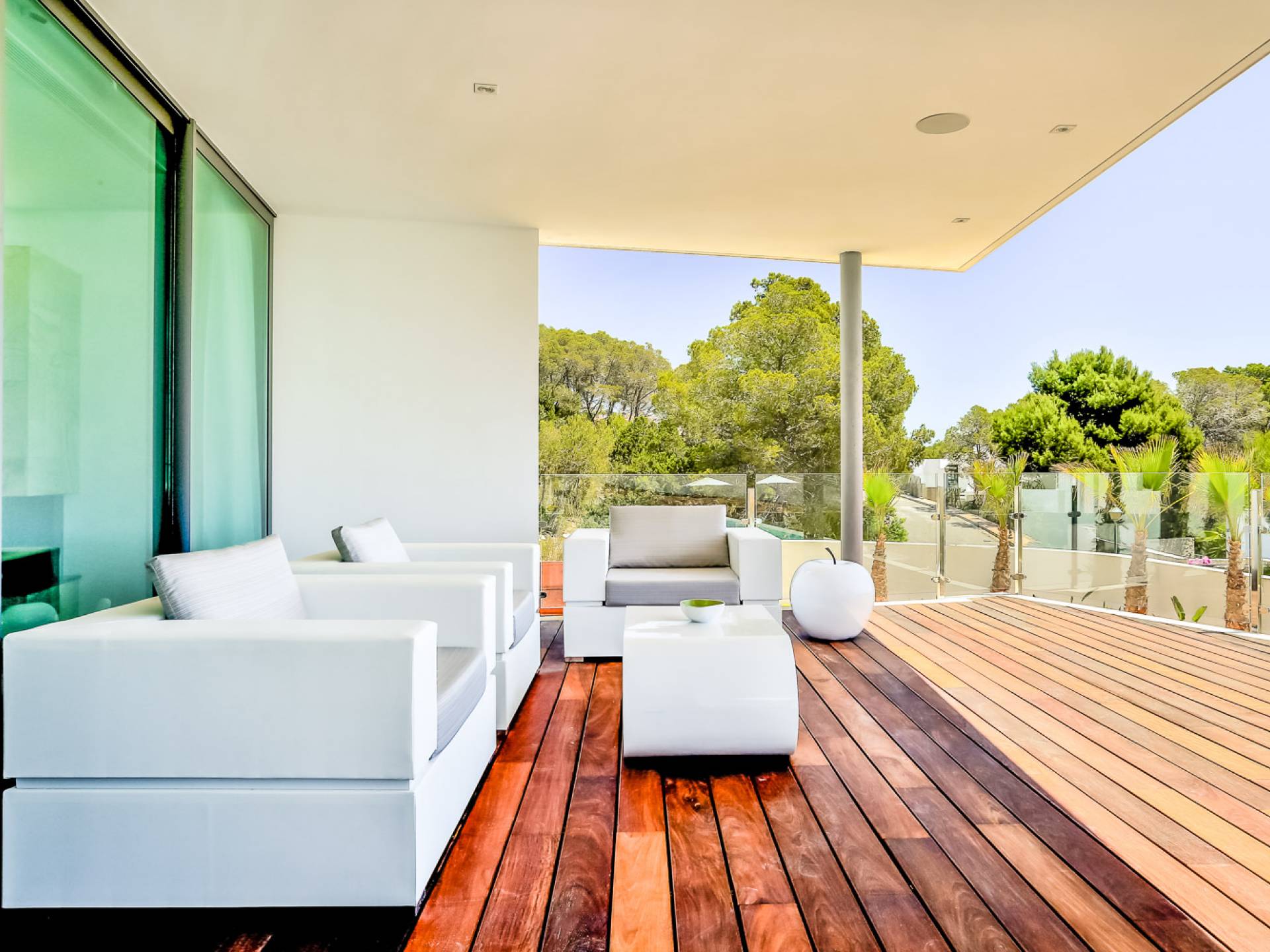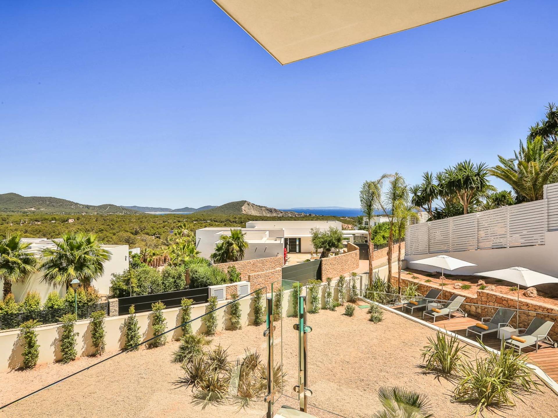 Fuera de Alegre Belle Villa Ibiza, hay jardines paisajísticos de hermoso diseño que están rodeados por un muro de alta seguridad de dos metros para mayor privacidad y un portón eléctrico con videoportero. Hay impresionantes terrazas de madera que rodean la piscina infinita, donde encontrará terrazas cubiertas y descubiertas, con muebles de lujo perfectos para relajarse y disfrutar del sol.