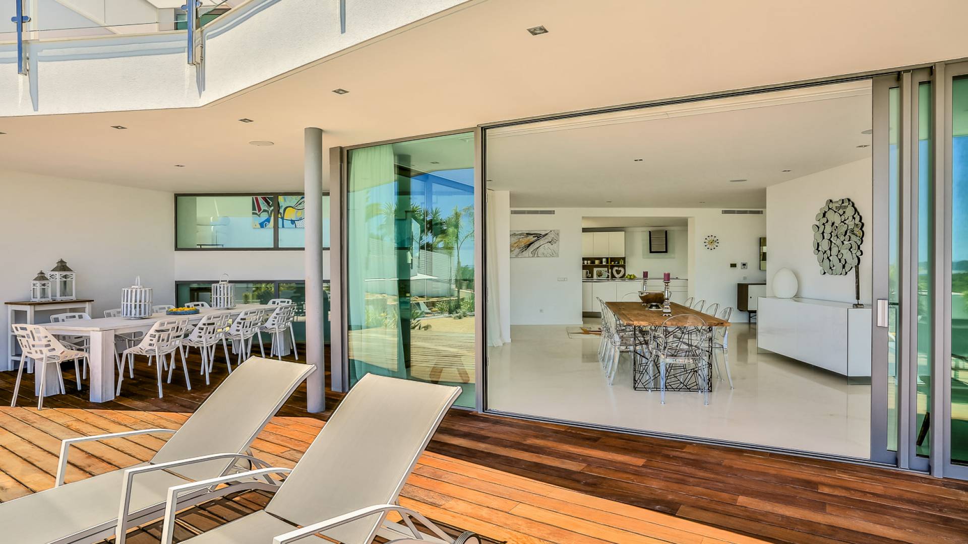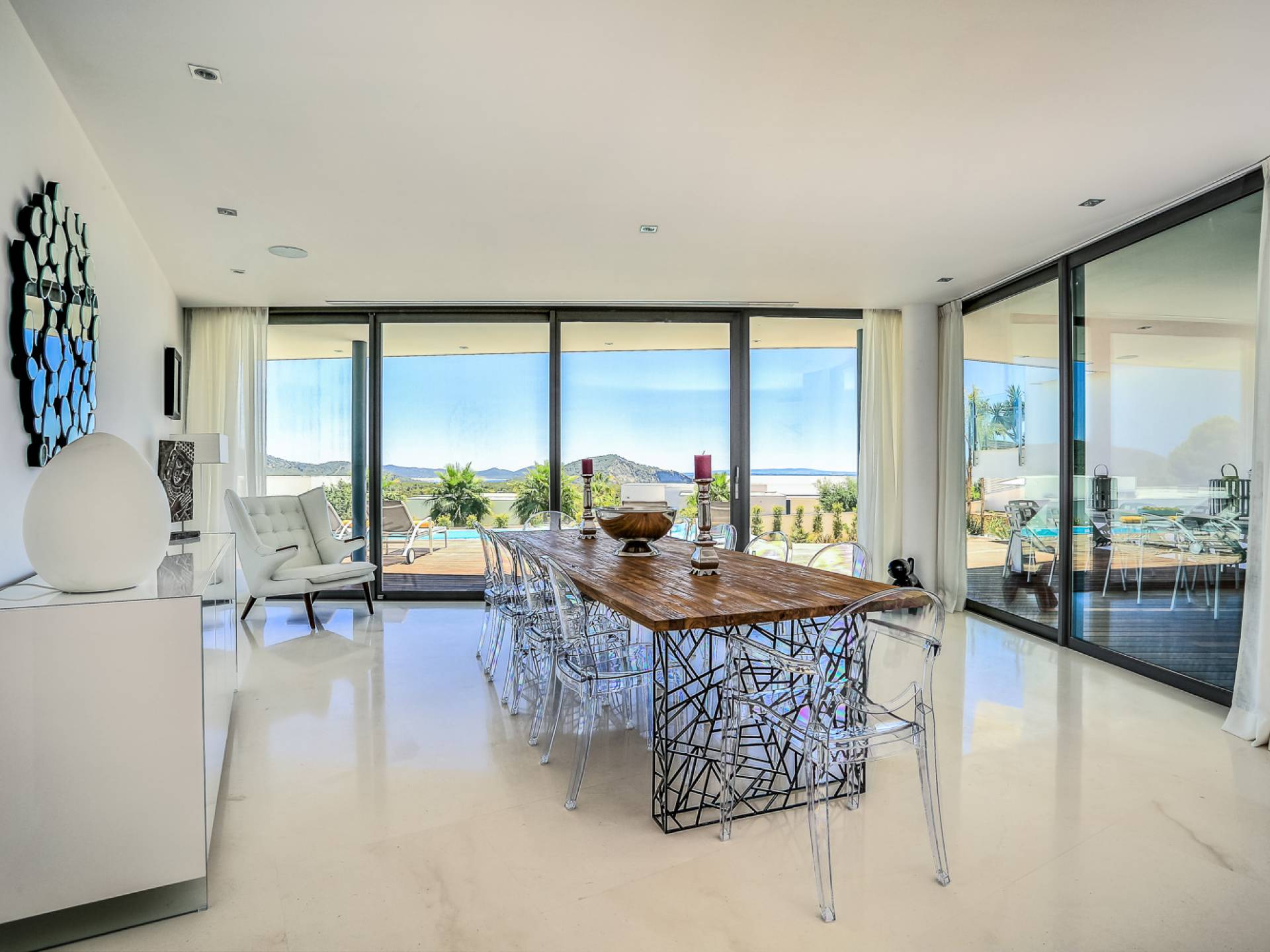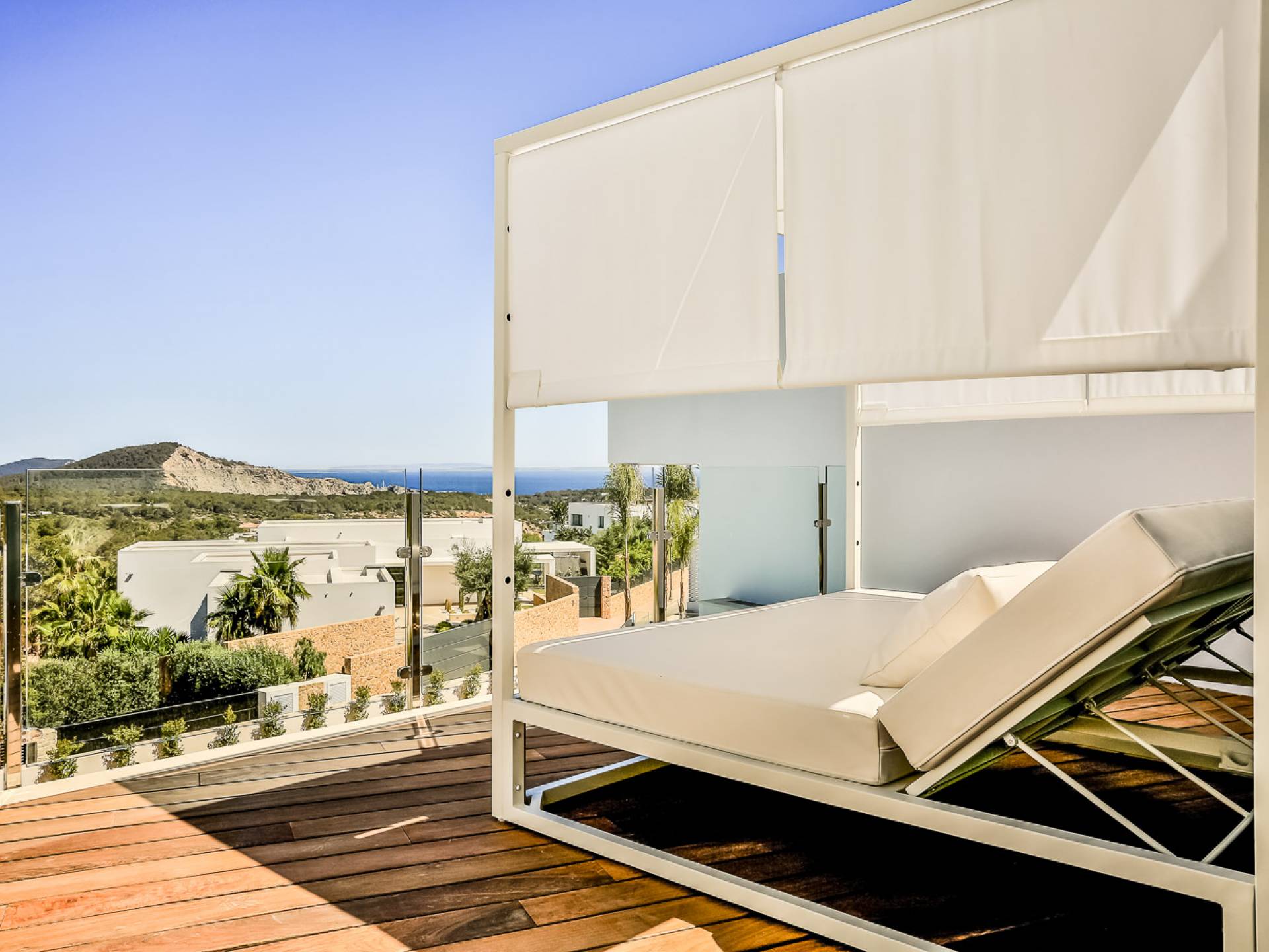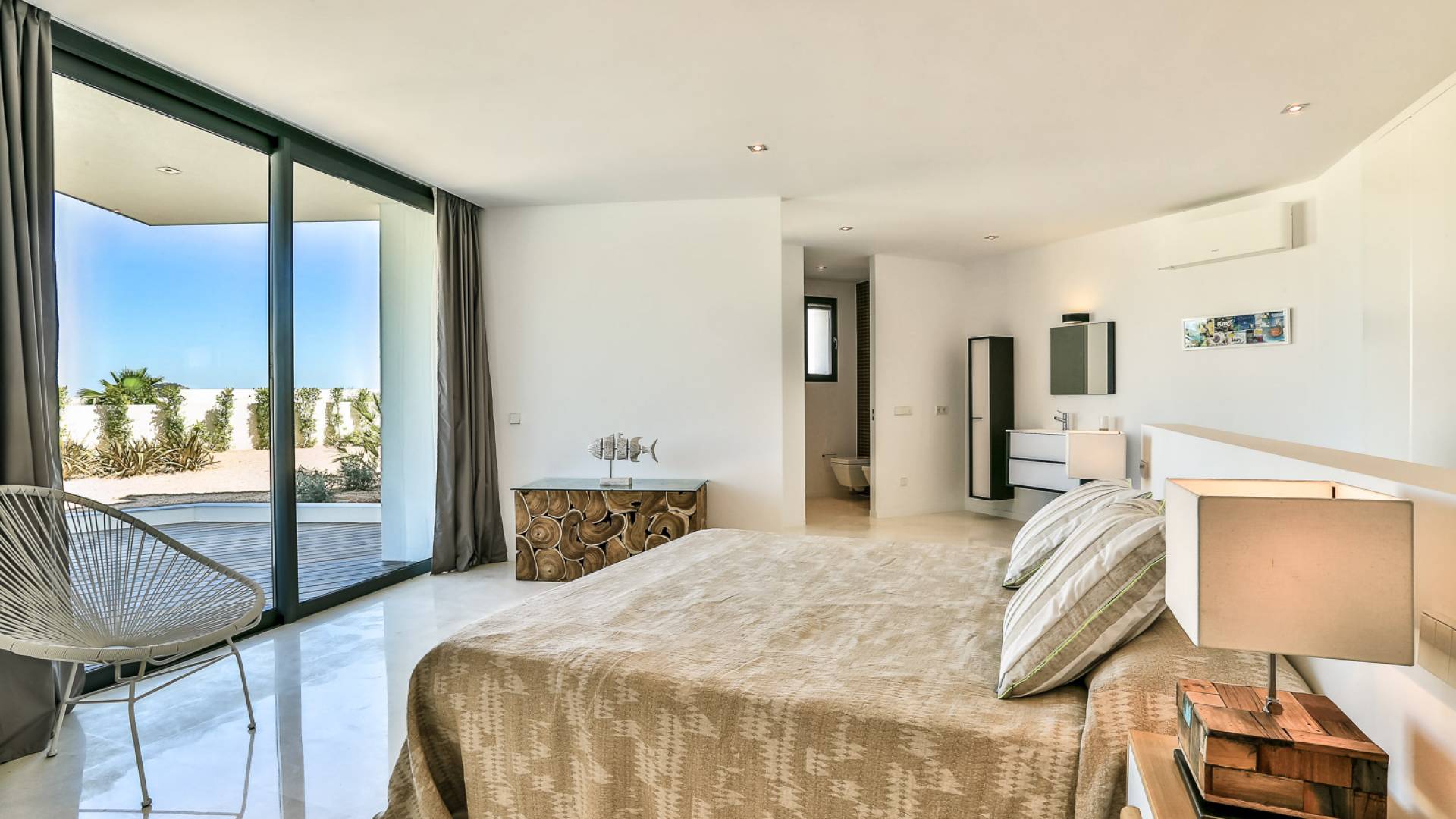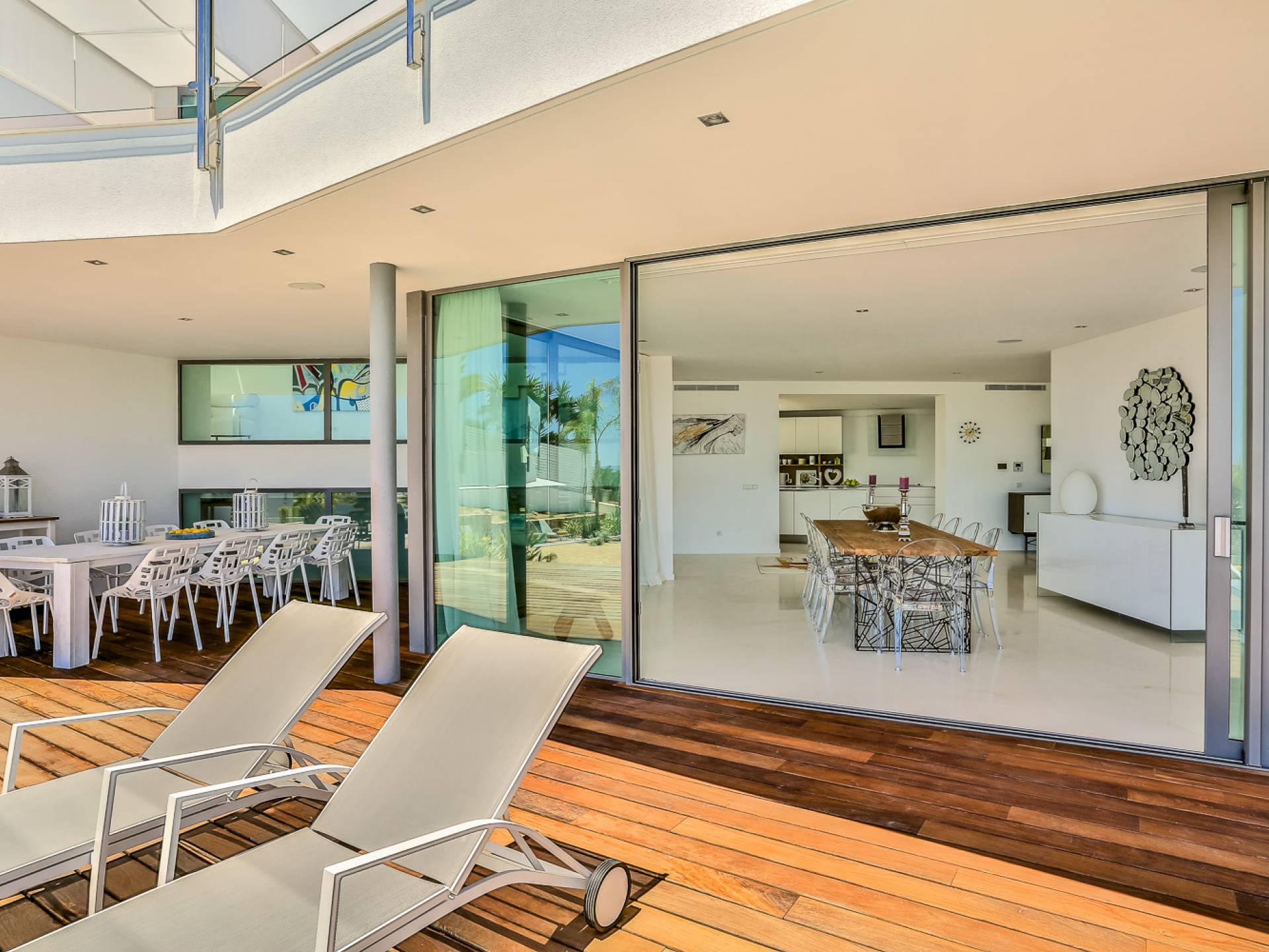 Fuera de Alegre Belle Villa Ibiza, hay jardines paisajísticos de hermoso diseño que están rodeados por un muro de alta seguridad de dos metros para mayor privacidad y un portón eléctrico con videoportero. Hay impresionantes terrazas de madera que rodean la piscina infinita, donde encontrará terrazas cubiertas y descubiertas, con muebles de lujo perfectos para relajarse y disfrutar del sol.