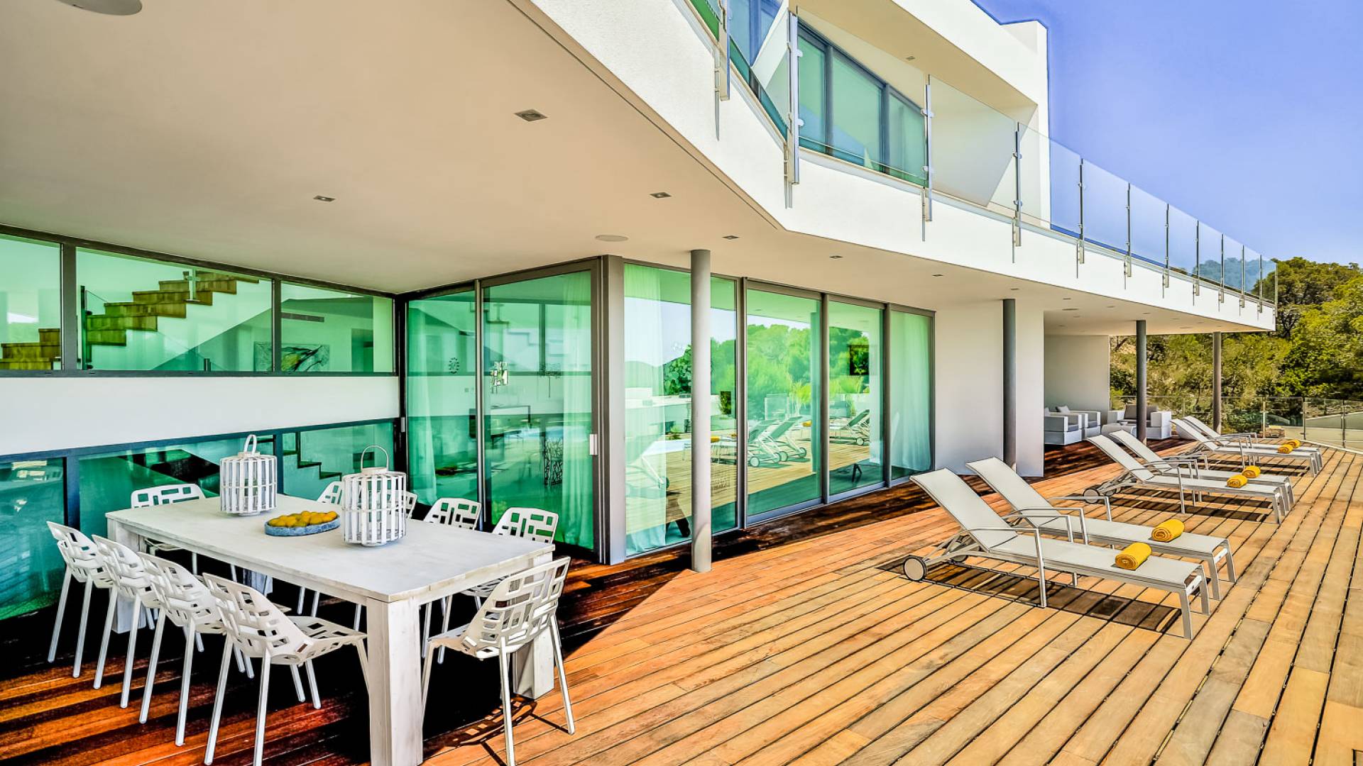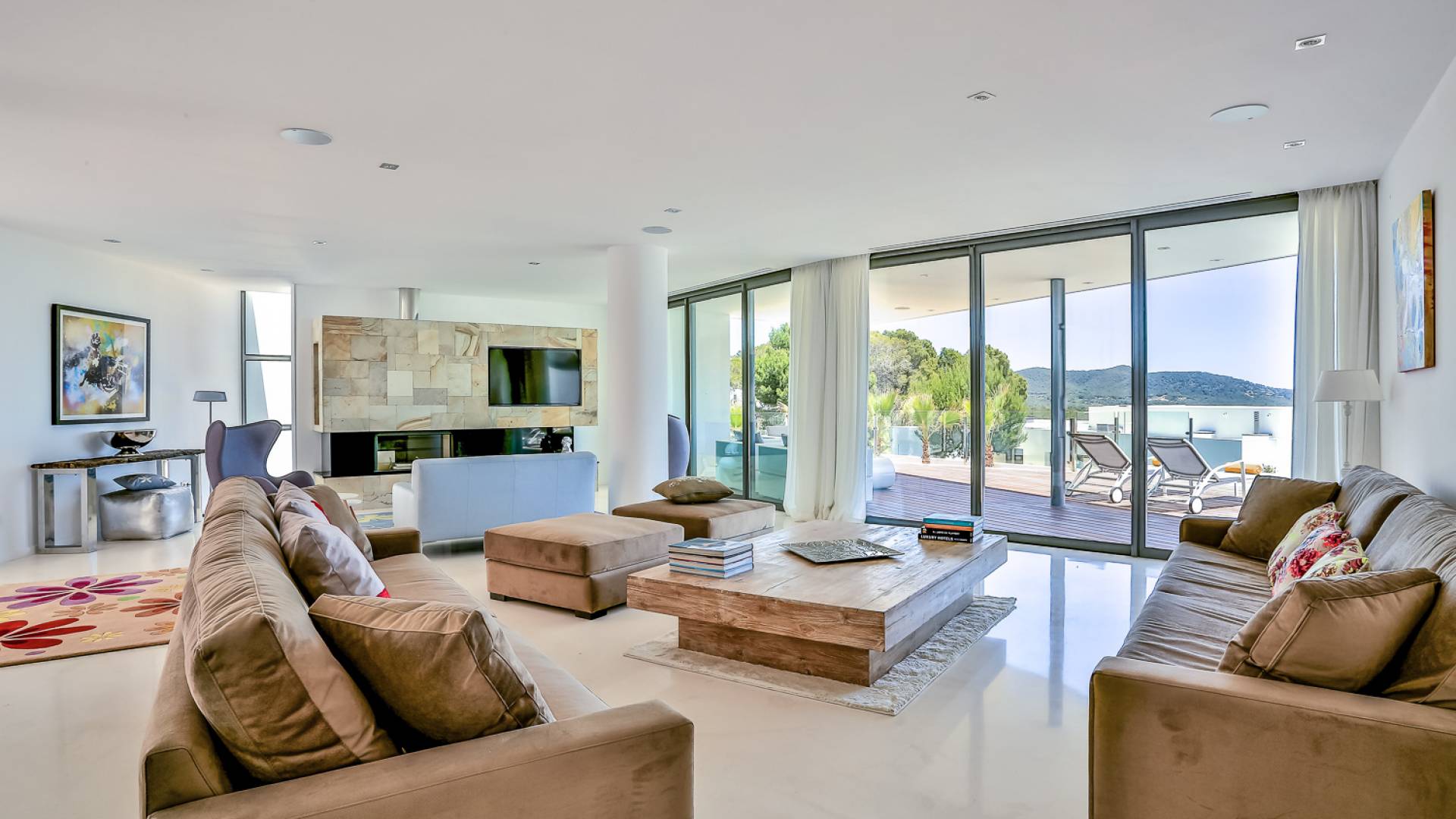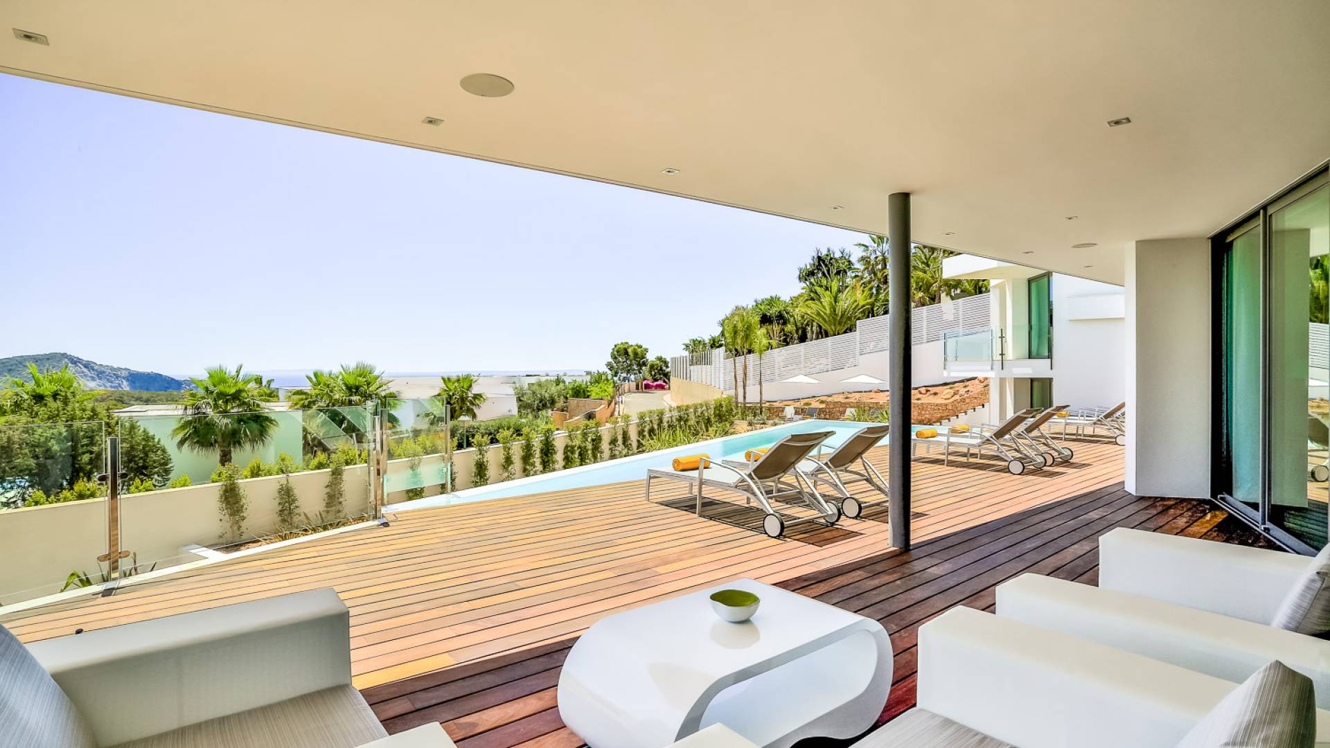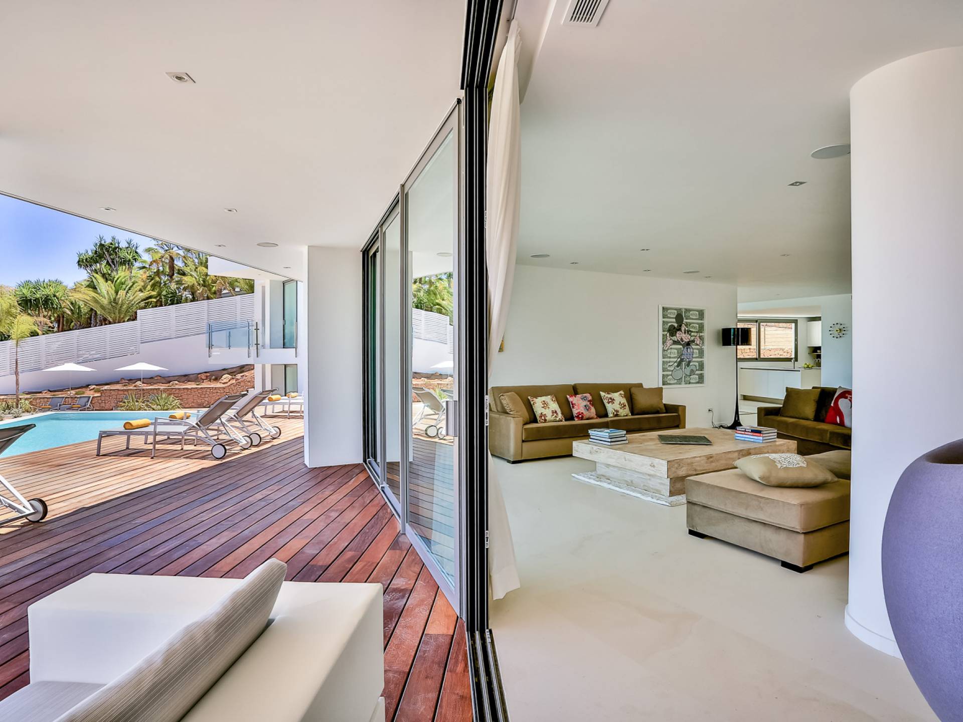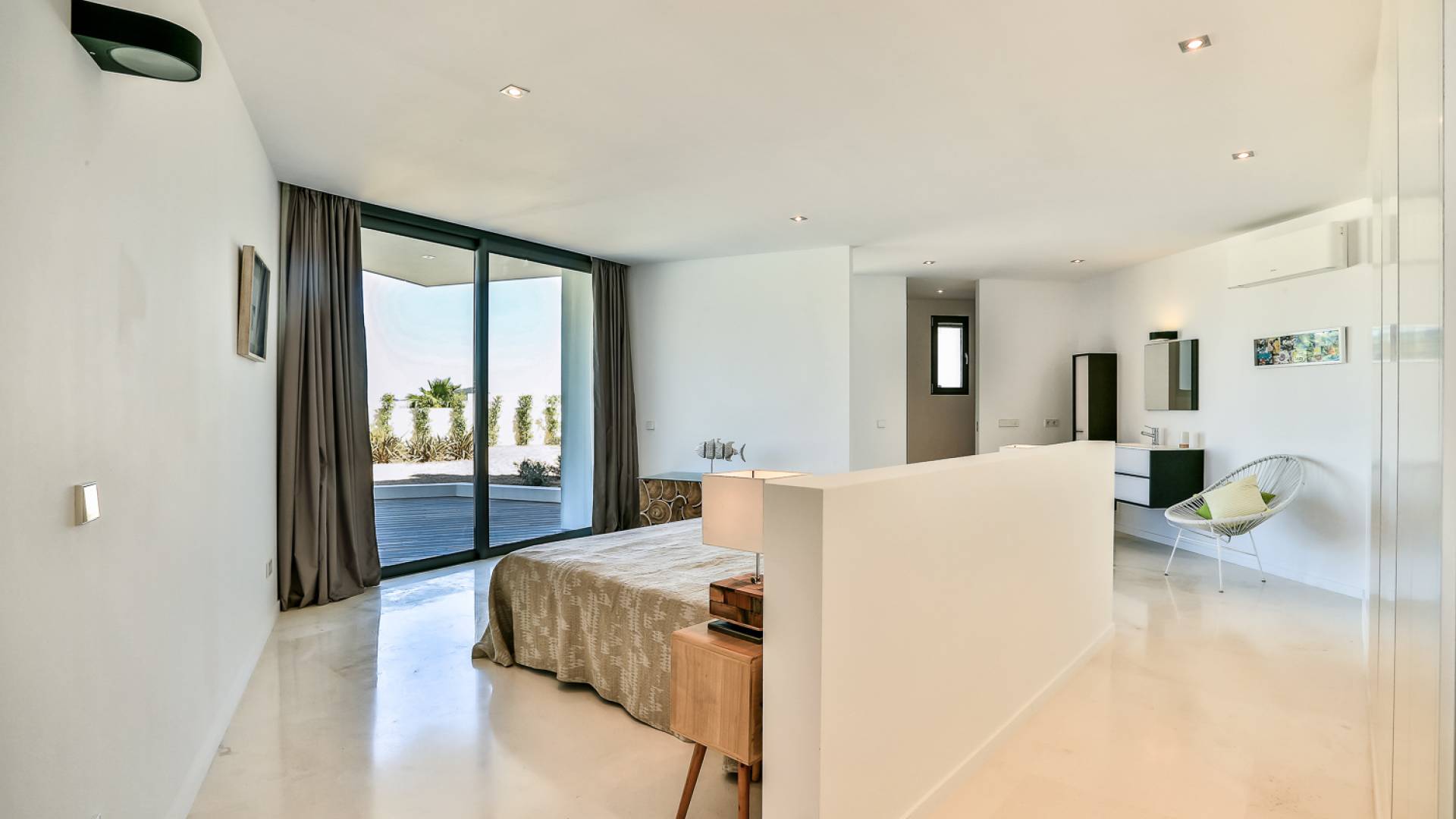 Fuera de Alegre Belle Villa Ibiza, hay jardines paisajísticos de hermoso diseño que están rodeados por un muro de alta seguridad de dos metros para mayor privacidad y un portón eléctrico con videoportero. Hay impresionantes terrazas de madera que rodean la piscina infinita, donde encontrará terrazas cubiertas y descubiertas, con muebles de lujo perfectos para relajarse y disfrutar del sol.