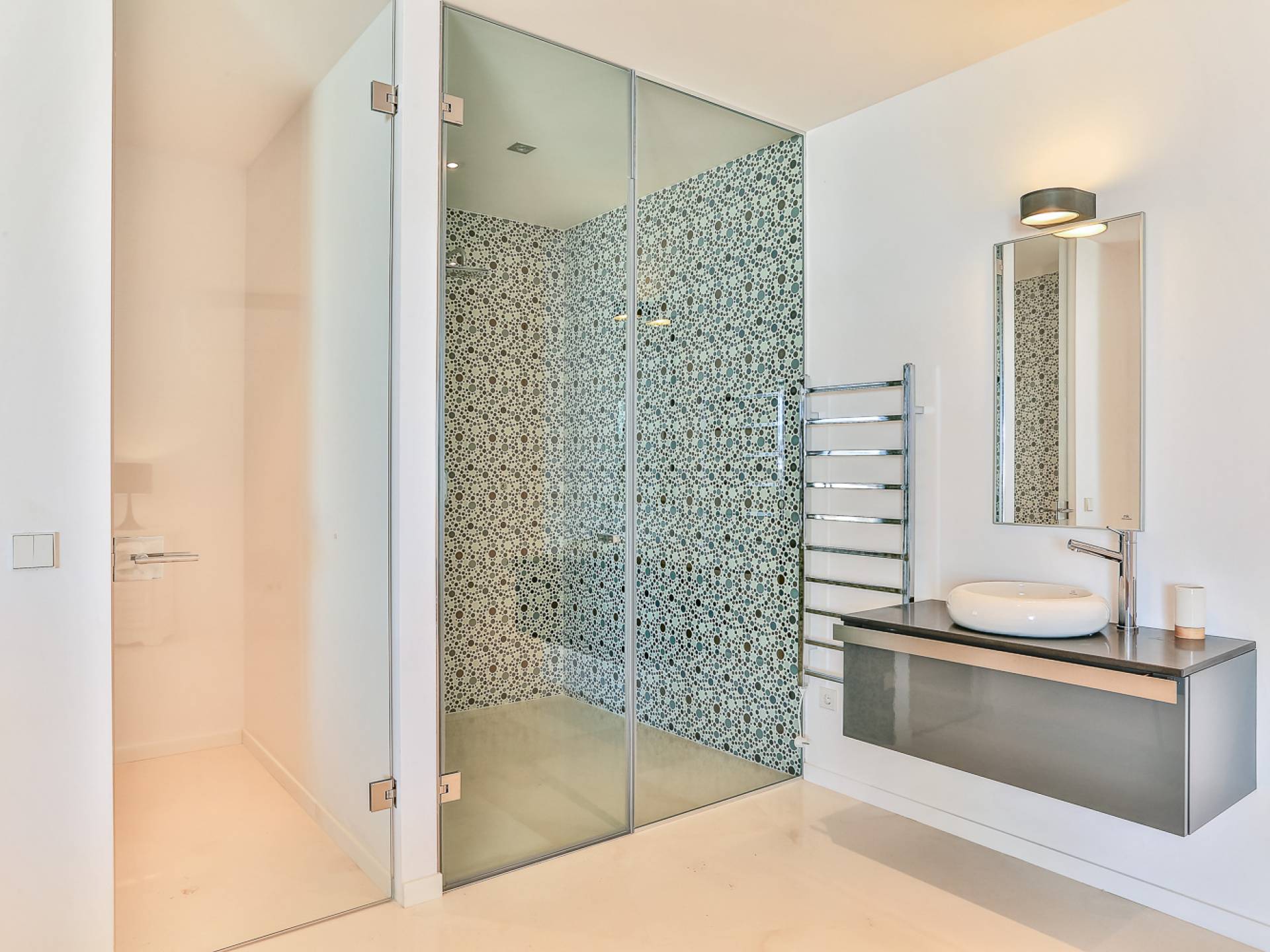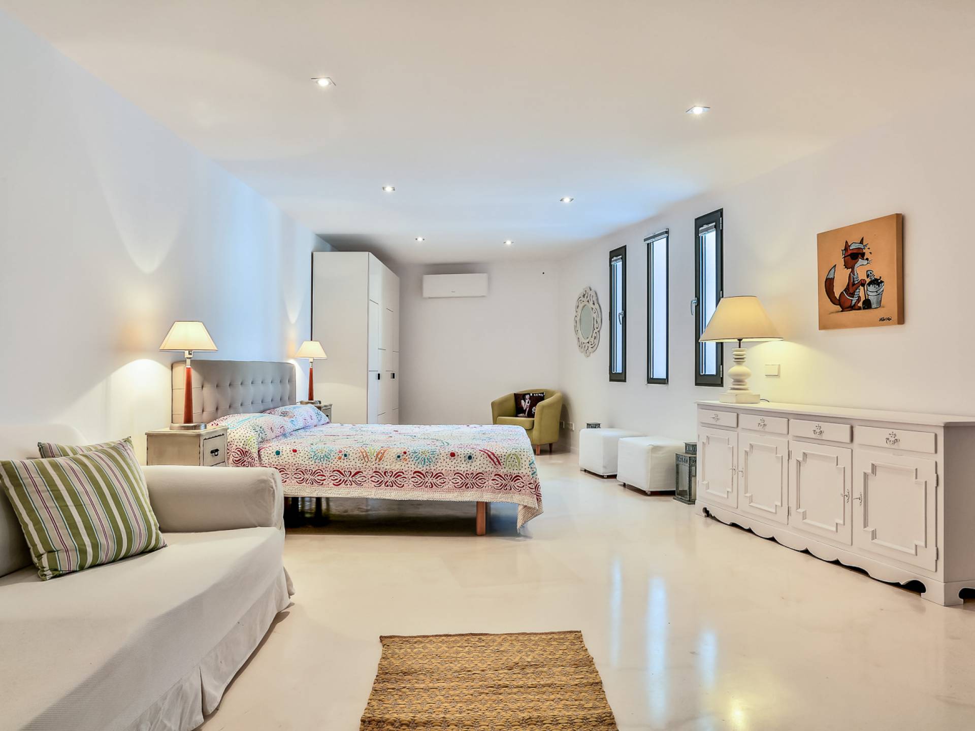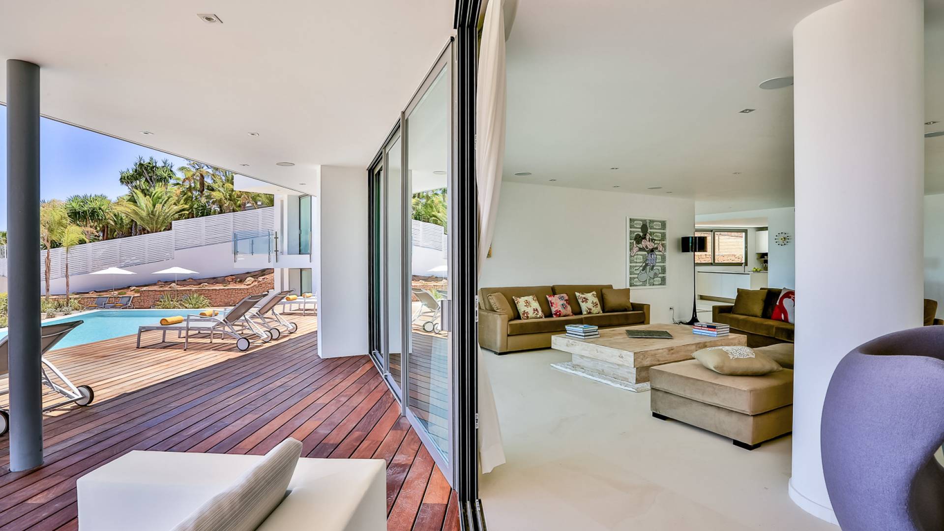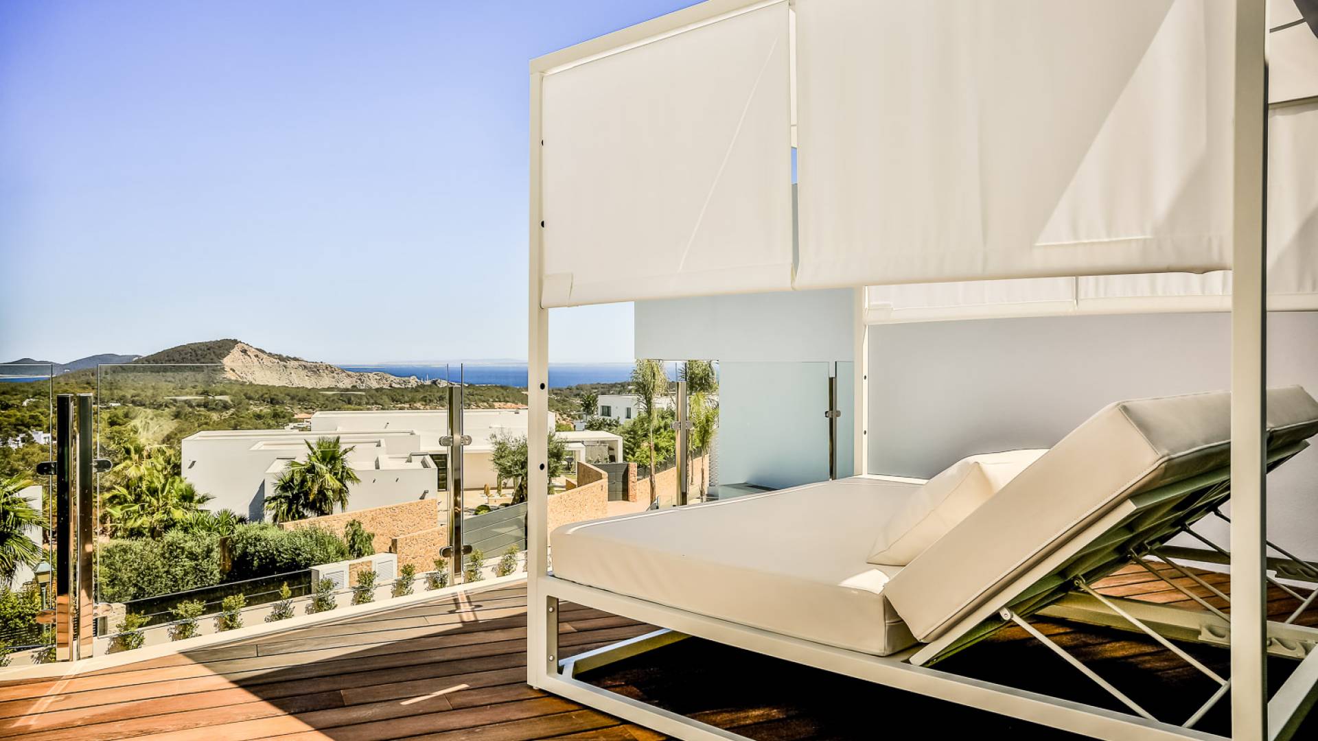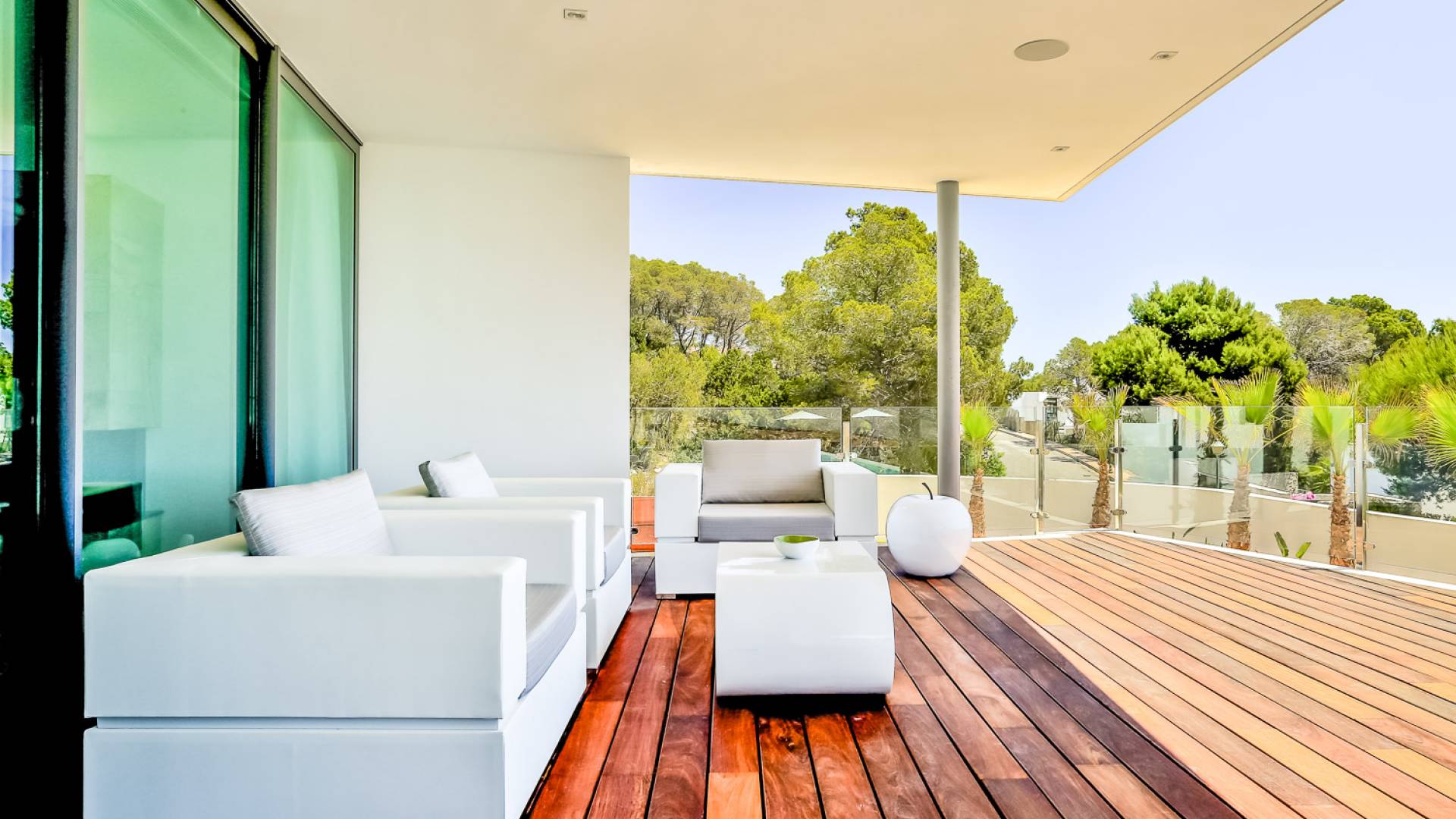 Fuera de Alegre Belle Villa Ibiza, hay jardines paisajísticos de hermoso diseño que están rodeados por un muro de alta seguridad de dos metros para mayor privacidad y un portón eléctrico con videoportero. Hay impresionantes terrazas de madera que rodean la piscina infinita, donde encontrará terrazas cubiertas y descubiertas, con muebles de lujo perfectos para relajarse y disfrutar del sol.