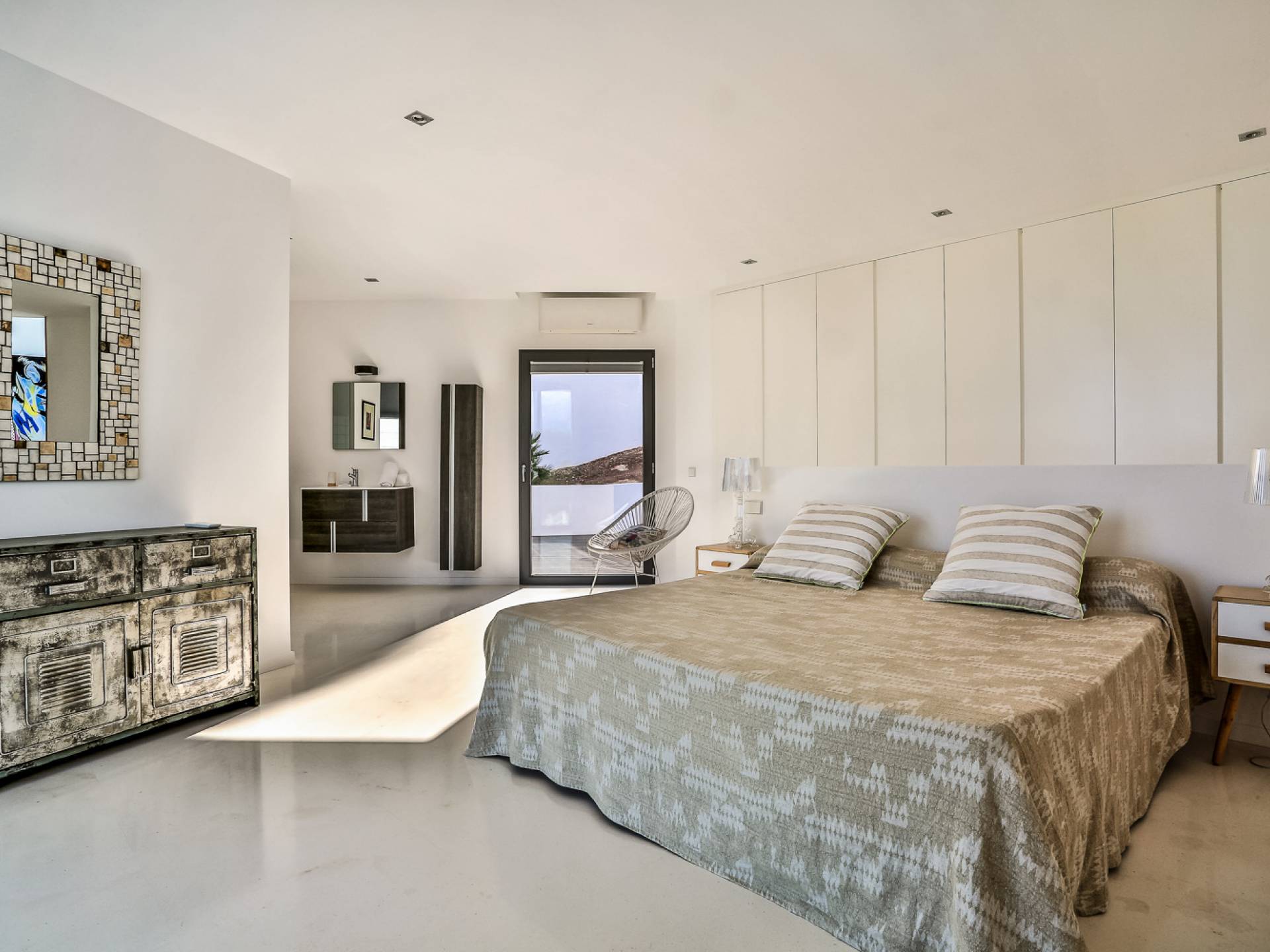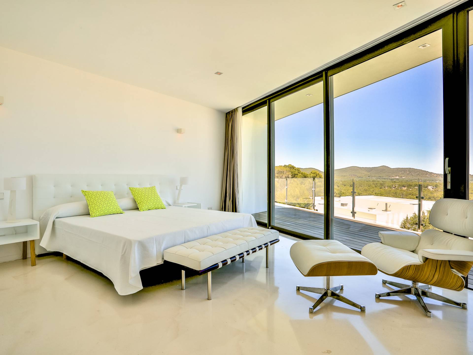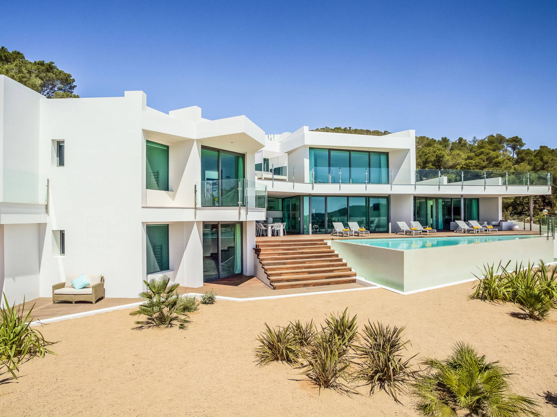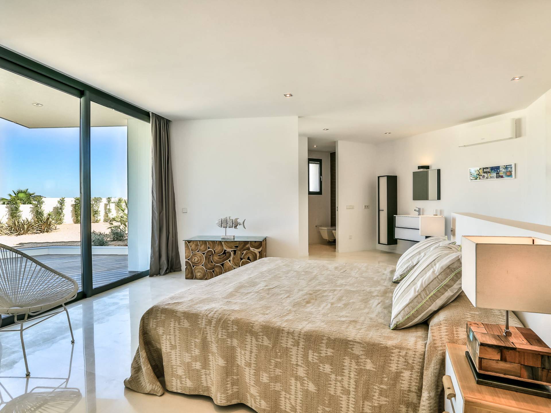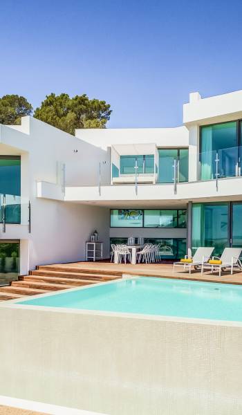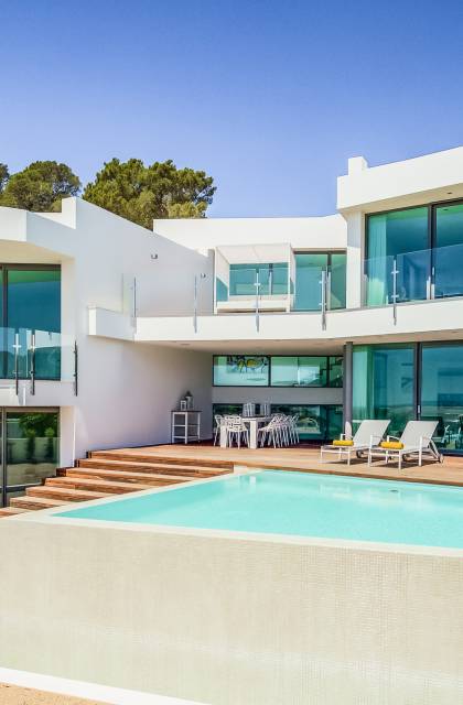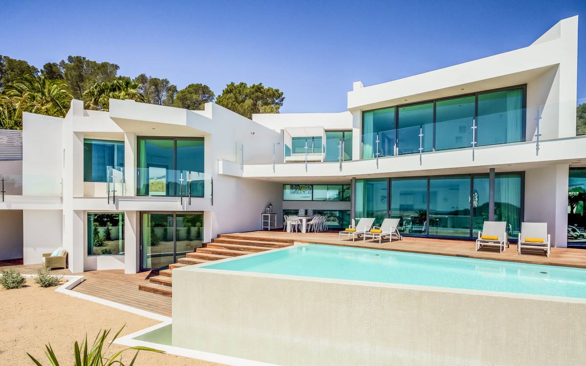 Alegre Belle Villa Ibiza es una obra maestra moderna con amplias terrazas y acabados de diseño. Esta increíble villa de diseño con orientación sur está situada en la costa sur de Ibiza en una de las zonas más cotizadas y tiene unas vistas panorámicas espectaculares de las cristalinas aguas del Mediterráneo y la isla de Formentera.