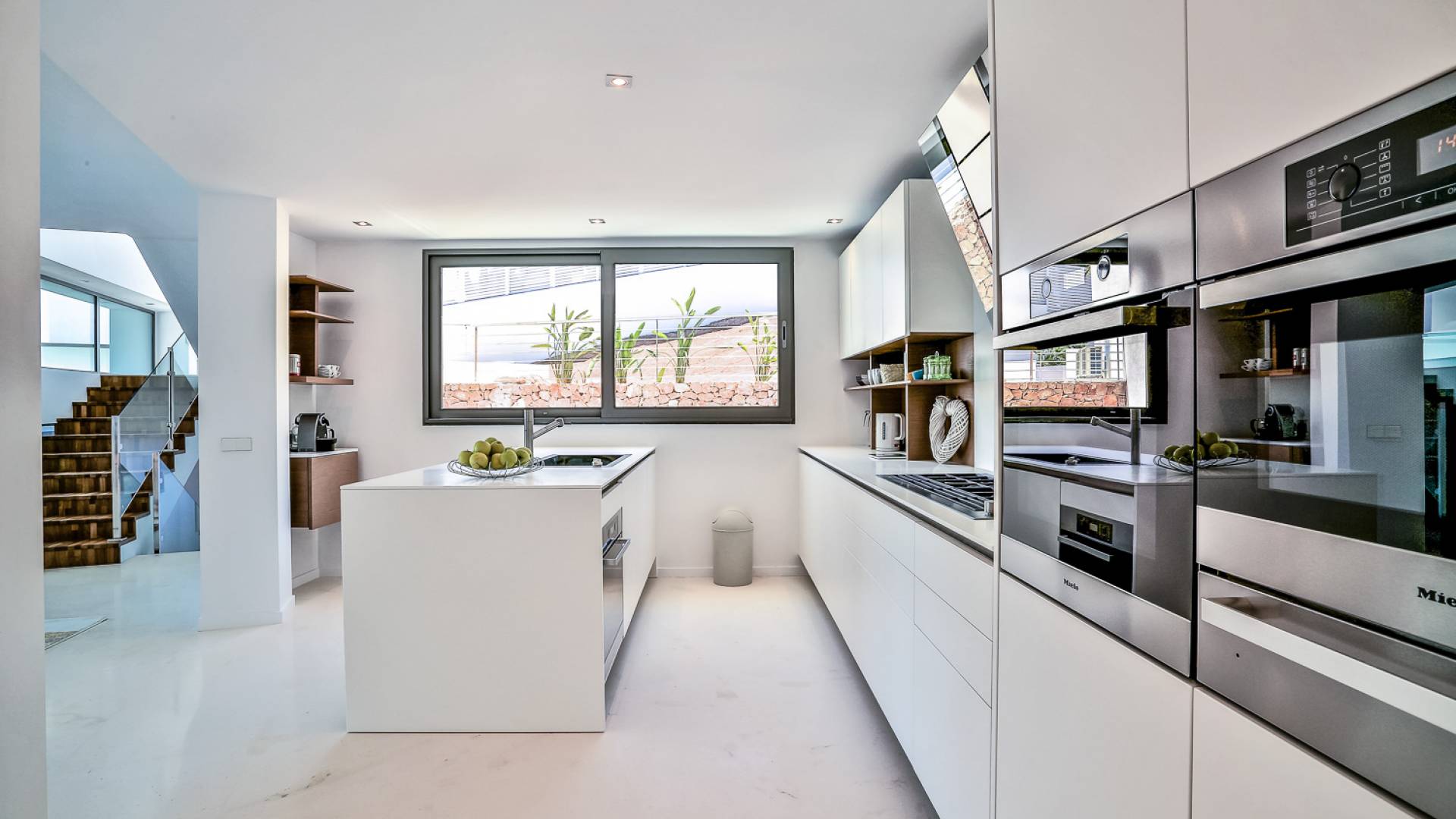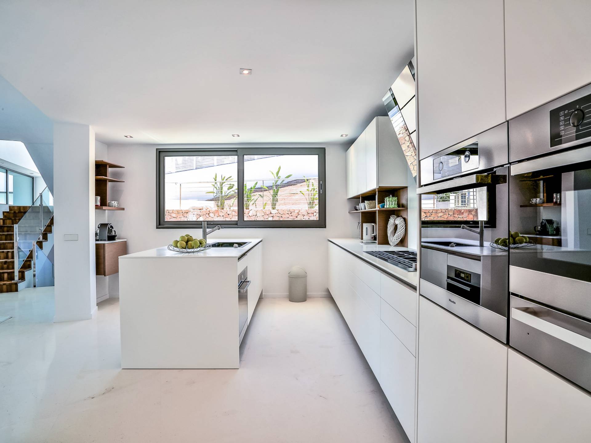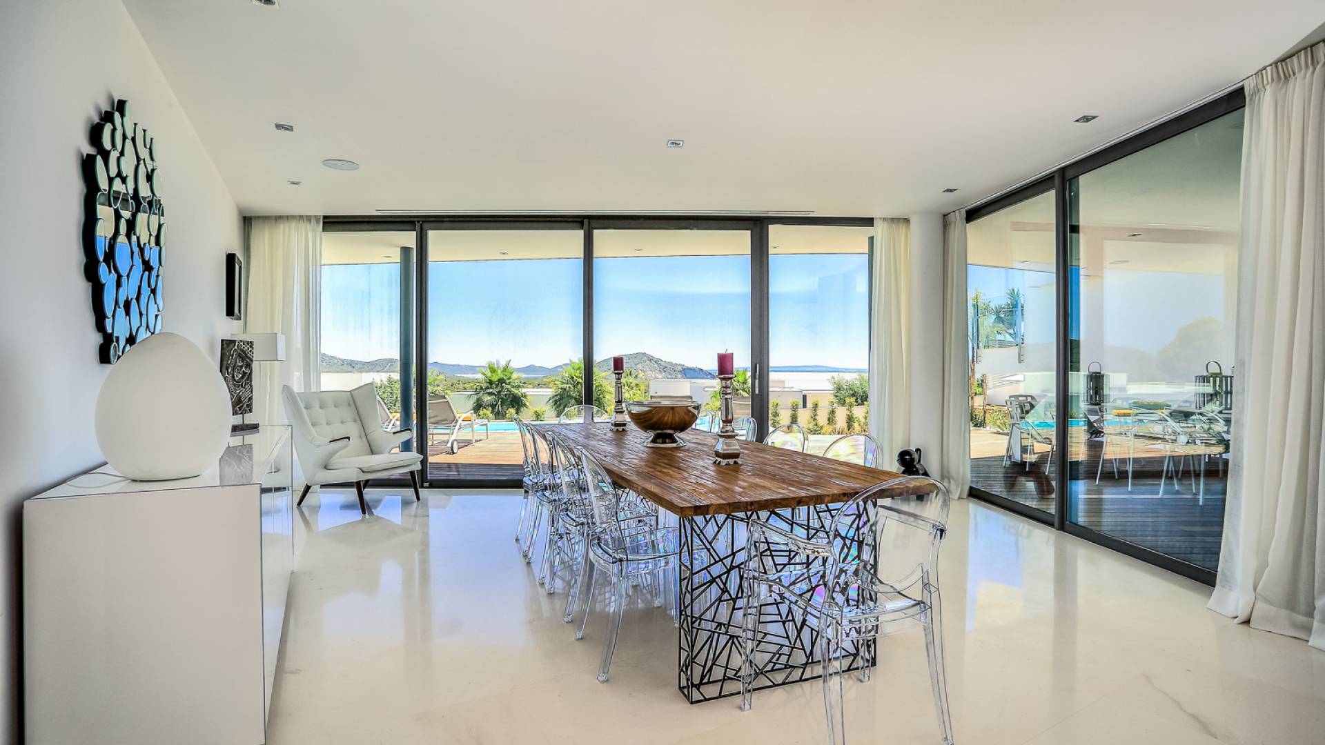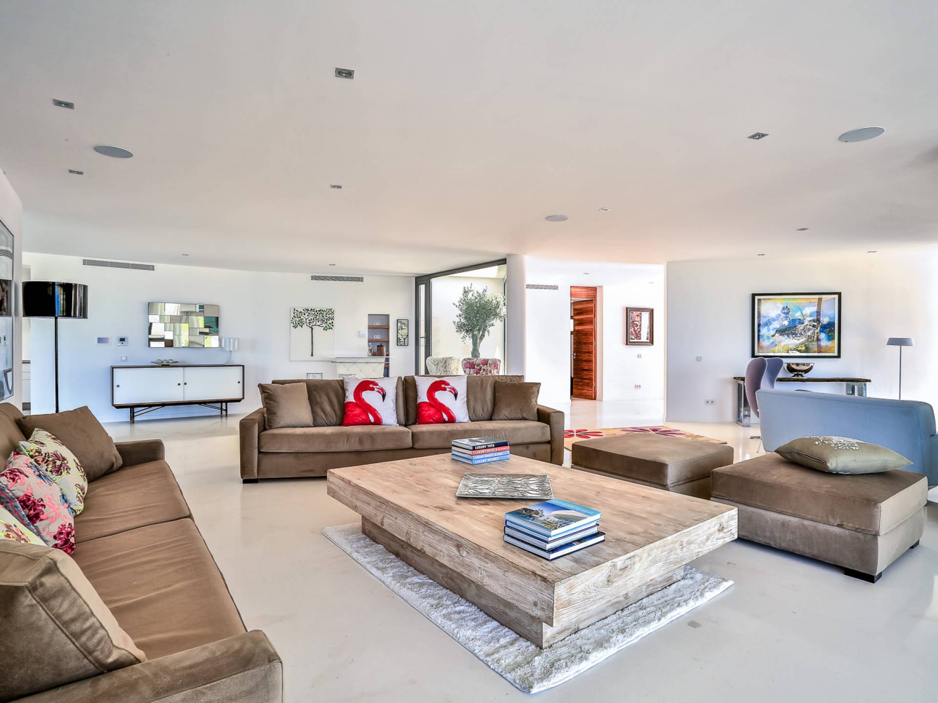 Las áreas de estar principales de esta propiedad son impresionantes con pisos de piedra blanca pulida, un salón espacioso y luminoso con una chimenea de piedra caliza de Bali y granito negro, un televisor inteligente Samsung de 55 pulgadas, hermosas áreas de comedor interiores y exteriores, y un diseñador Cocina Boffi totalmente equipada. Las habitaciones de la planta baja son de diseño abierto con grandes ventanales que ofrecen magníficas vistas panorámicas y el espacio es perfecto para el entretenimiento. Debajo de la cocina hay un apartamento de servicio / invitados de 1 dormitorio totalmente equipado con baño en suite que tiene su propio patio con acceso interno y externo, el lavadero y un gran espacio de almacenamiento seguro también se puede acceder desde este piso.