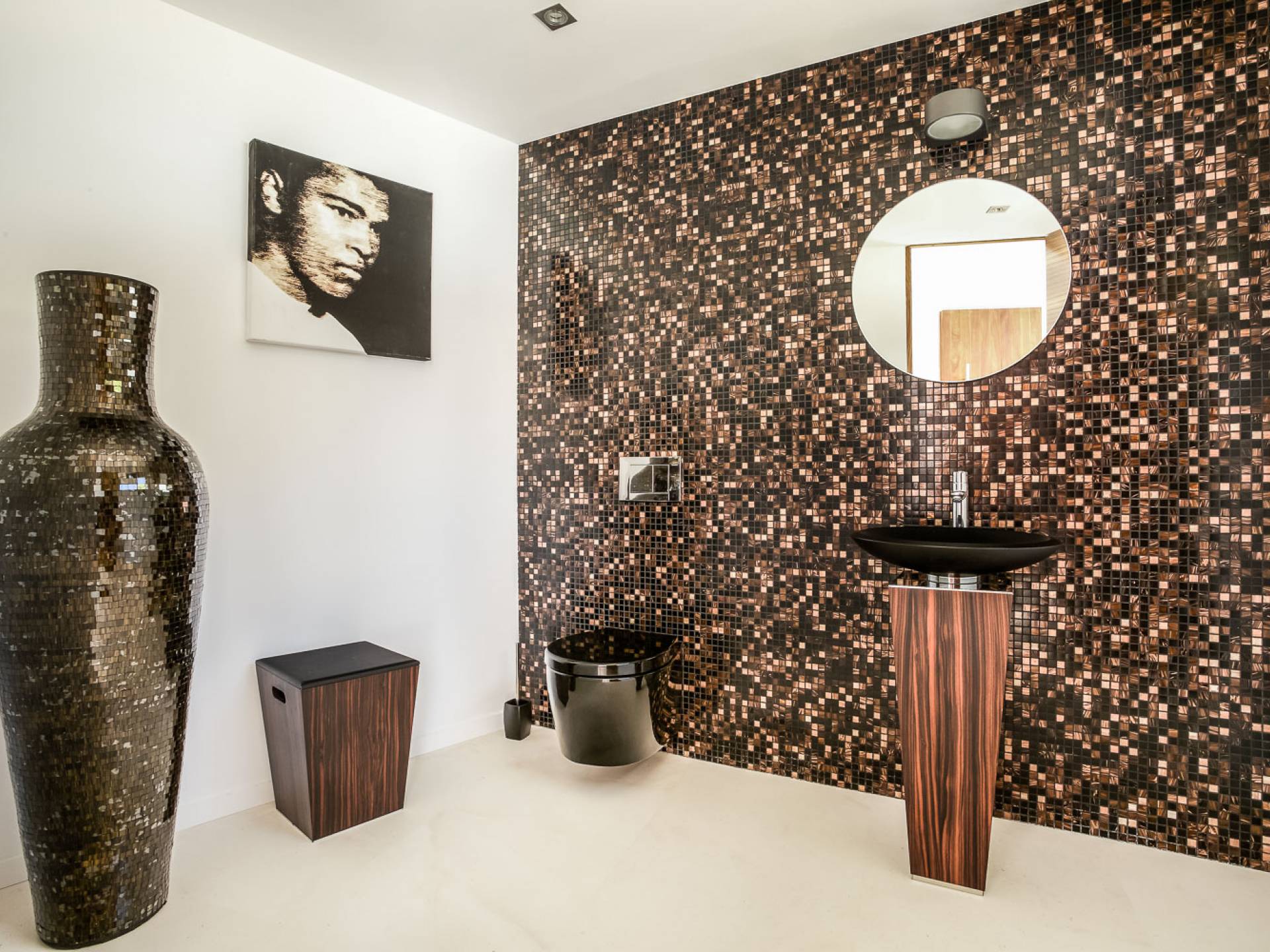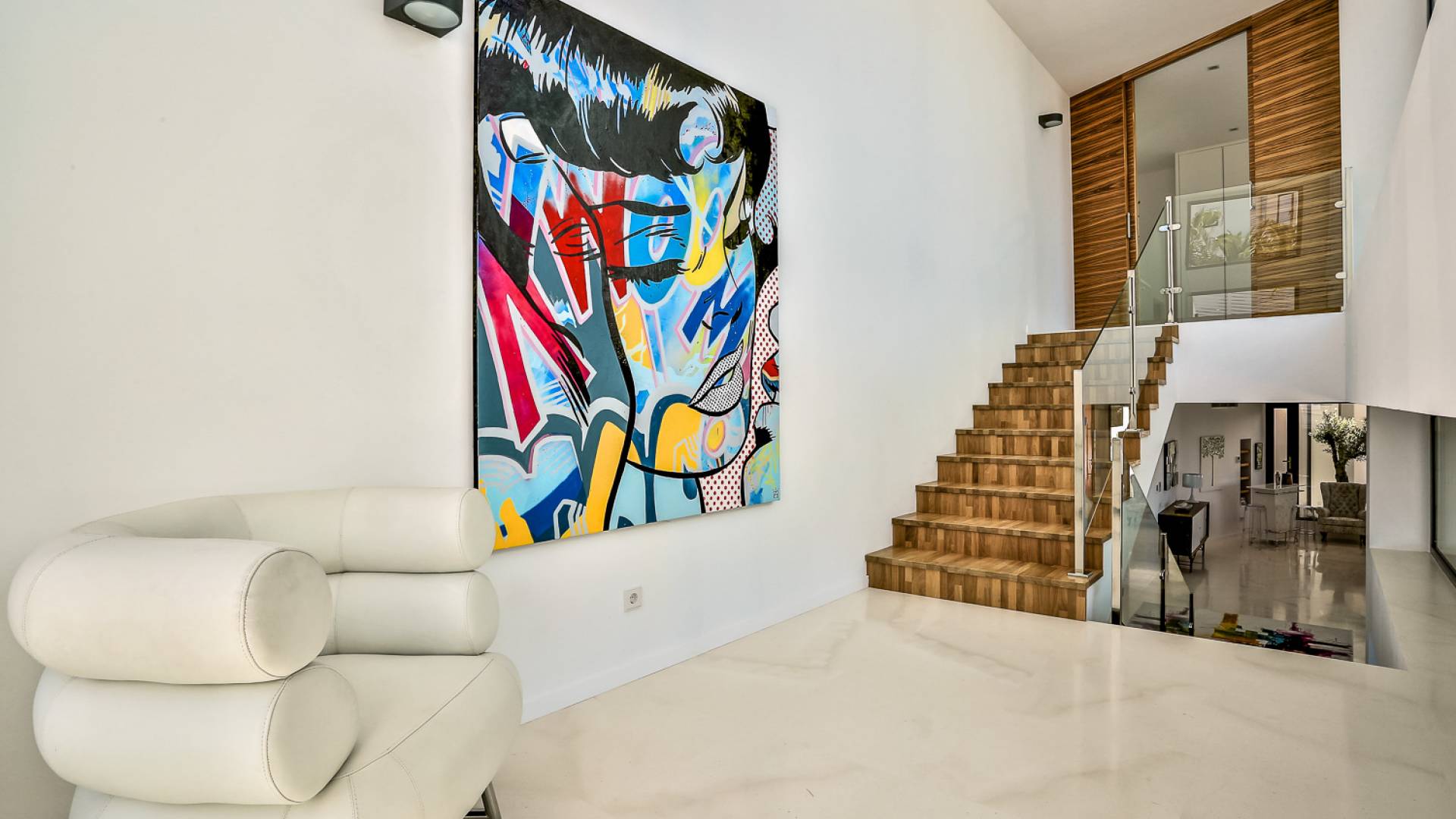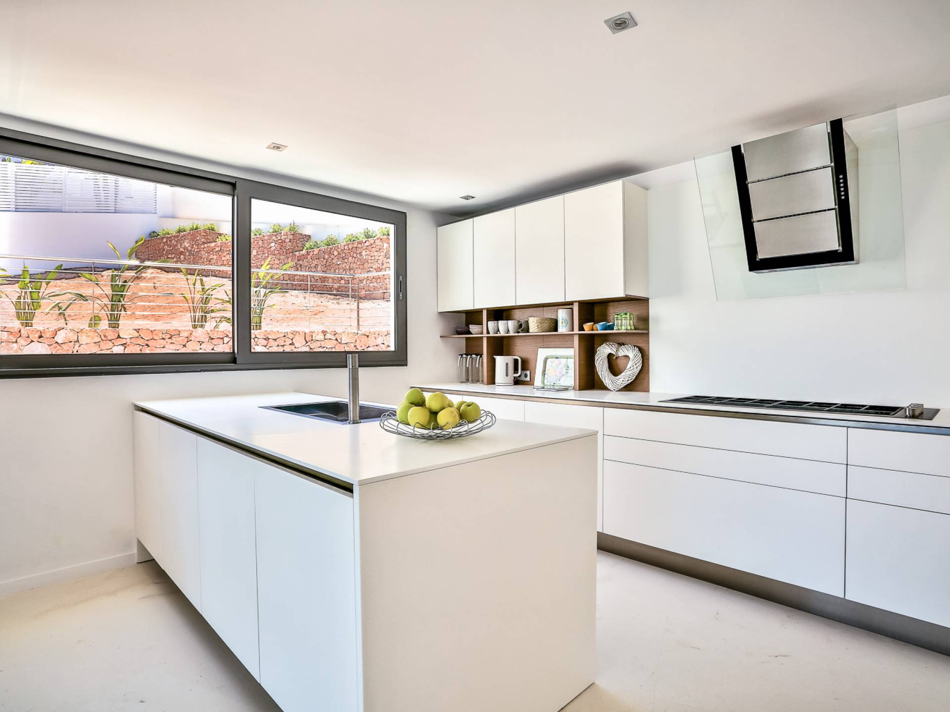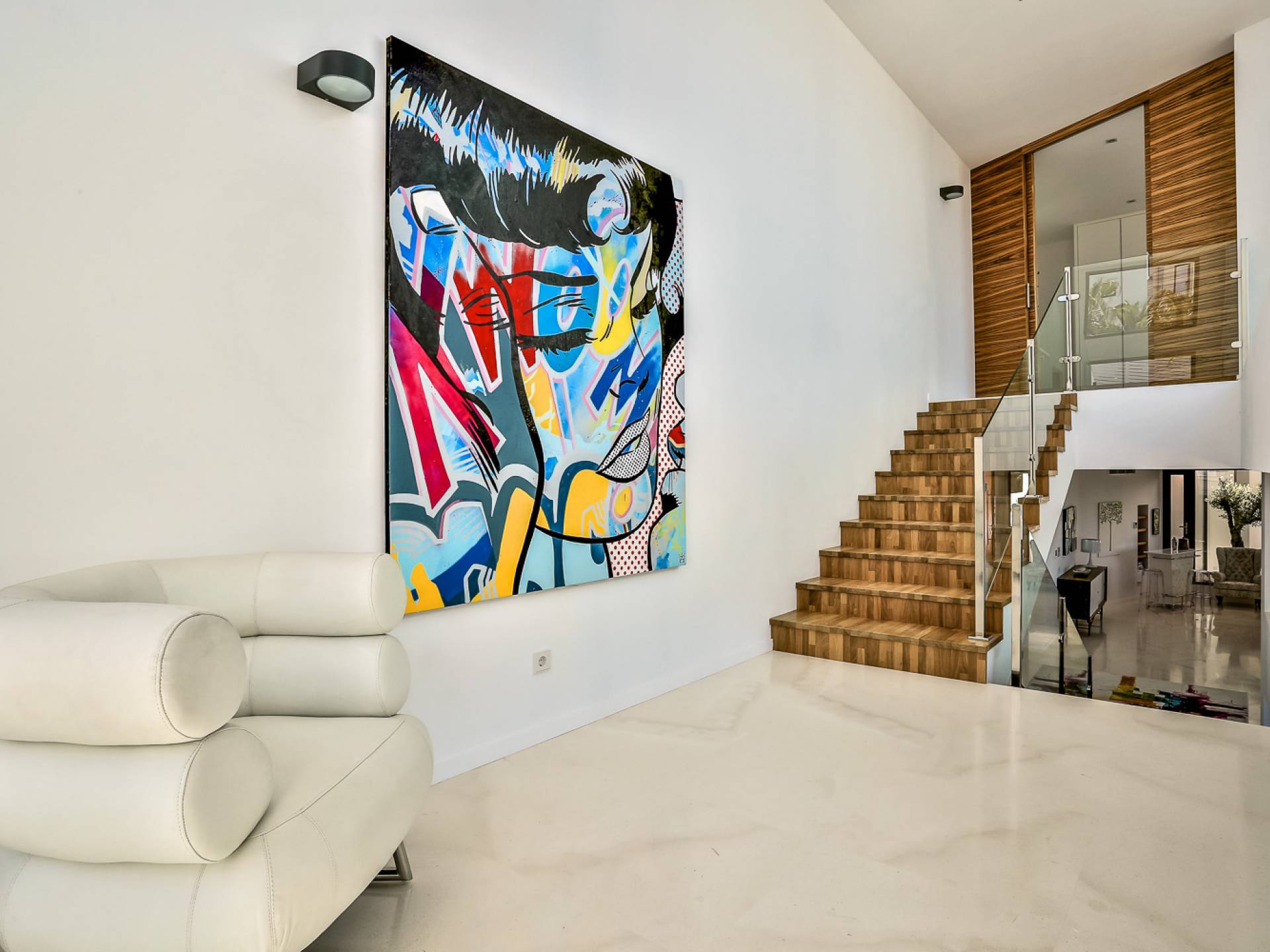 Las áreas de estar principales de esta propiedad son impresionantes con pisos de piedra blanca pulida, un salón espacioso y luminoso con una chimenea de piedra caliza de Bali y granito negro, un televisor inteligente Samsung de 55 pulgadas, hermosas áreas de comedor interiores y exteriores, y un diseñador Cocina Boffi totalmente equipada. Las habitaciones de la planta baja son de diseño abierto con grandes ventanales que ofrecen magníficas vistas panorámicas y el espacio es perfecto para el entretenimiento. Debajo de la cocina hay un apartamento de servicio / invitados de 1 dormitorio totalmente equipado con baño en suite que tiene su propio patio con acceso interno y externo, el lavadero y un gran espacio de almacenamiento seguro también se puede acceder desde este piso.