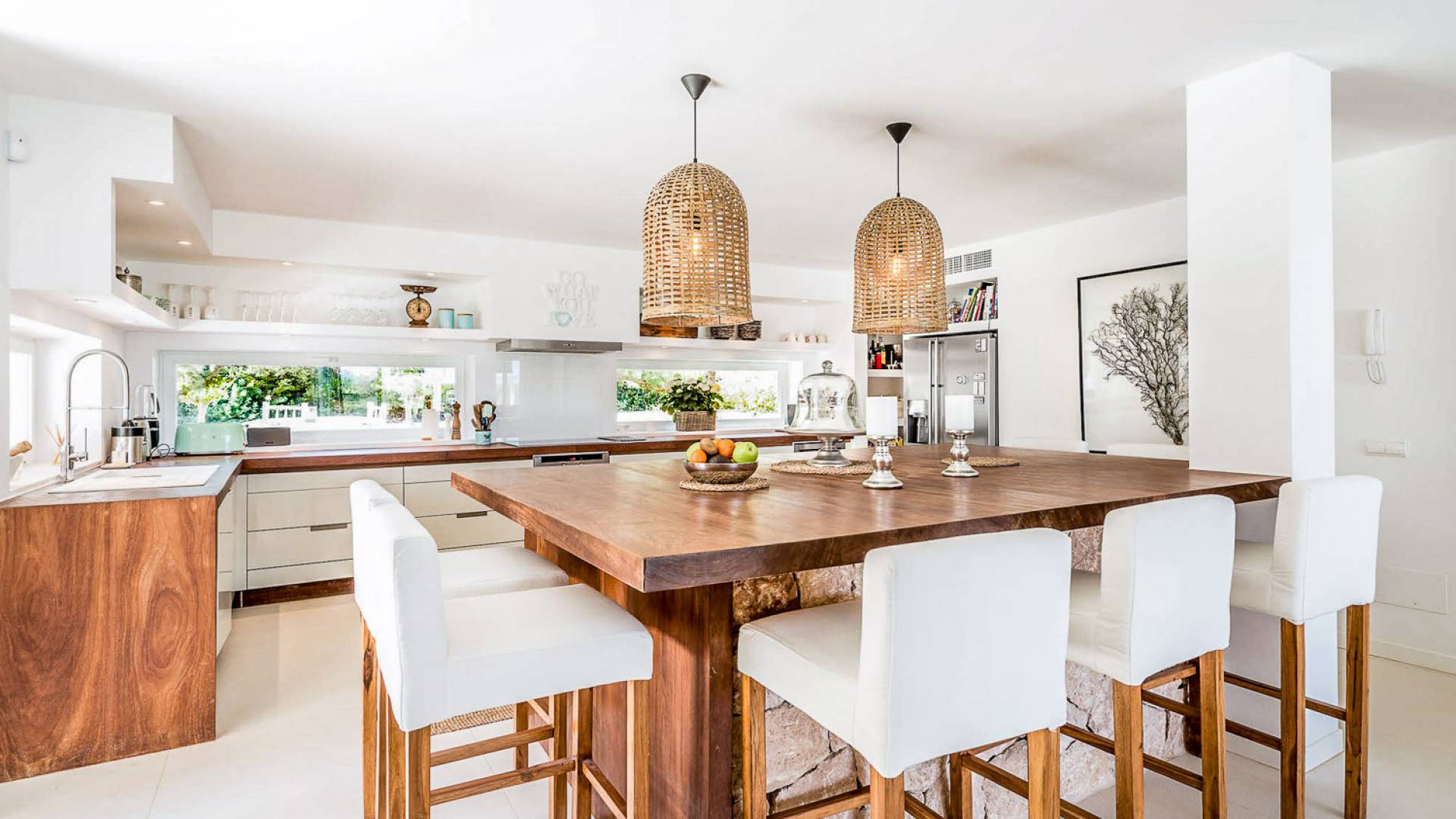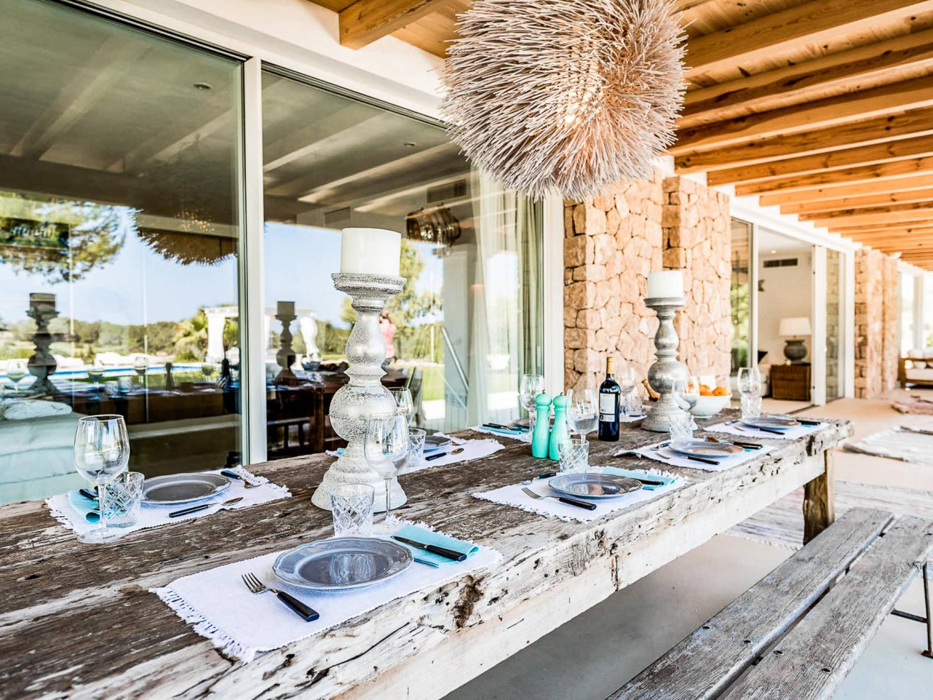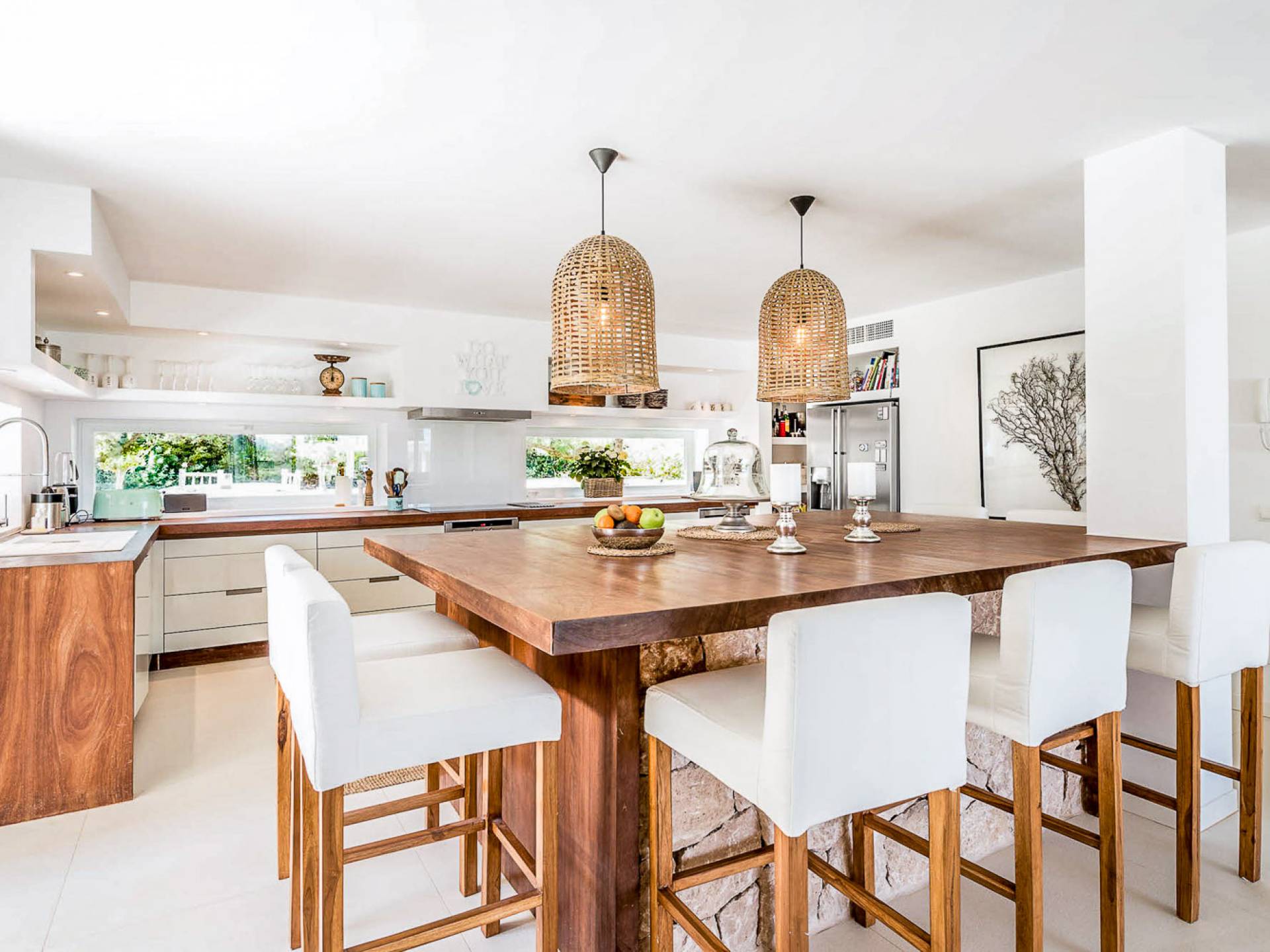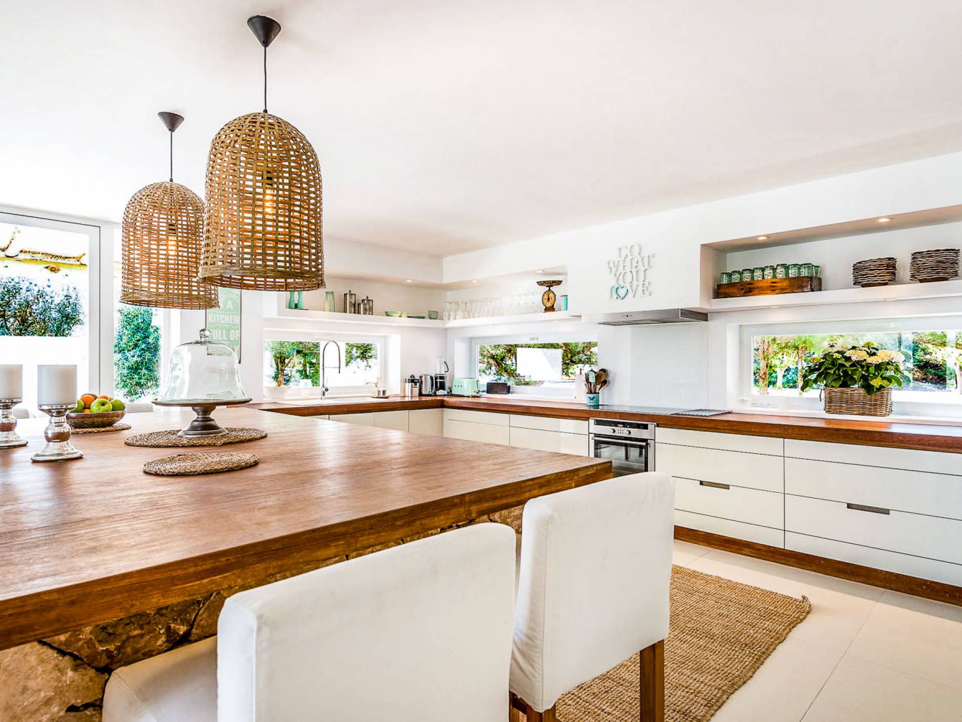 Las espaciosas áreas de estar son luminosas, de planta abierta y se combinan a la perfección con la sala de estar exterior. El salón cuenta con enormes ventanales que se abren a la terraza con vistas a la piscina; está bellamente decorado y amueblado y cuenta con un suntuoso sofá, un gran televisor con Sky y una chimenea. Hay una cocina impresionante, muy moderna y totalmente equipada con una isla central rodeada de 7 sillas; Incluye horno, vitrocerámica, lavavajillas, microondas, nevera grande, cafetera, tostadora, etc. En toda la propiedad hay aire acondicionado, calefacción y acceso a WiFi, también hay un aseo para invitados separado para mayor comodidad.