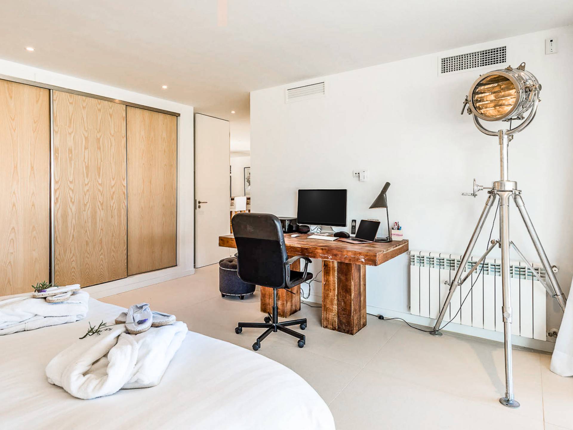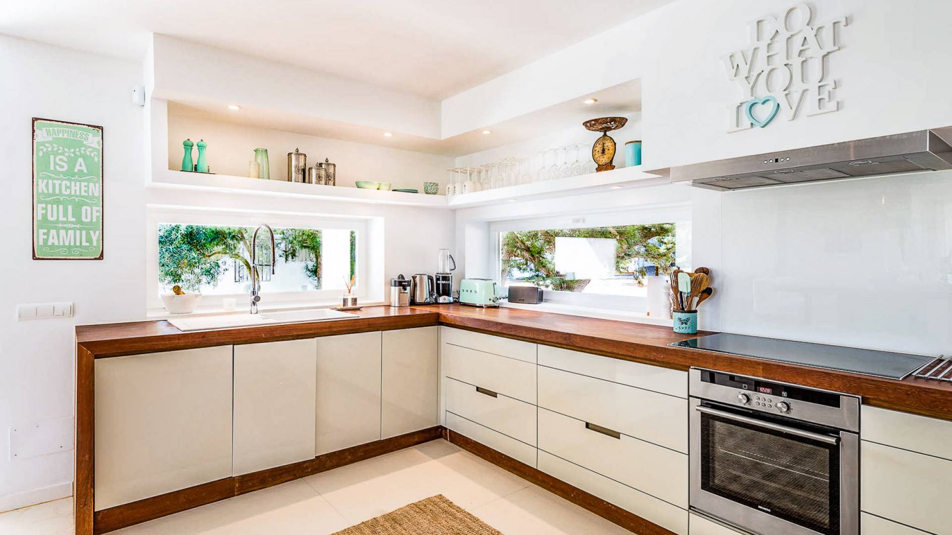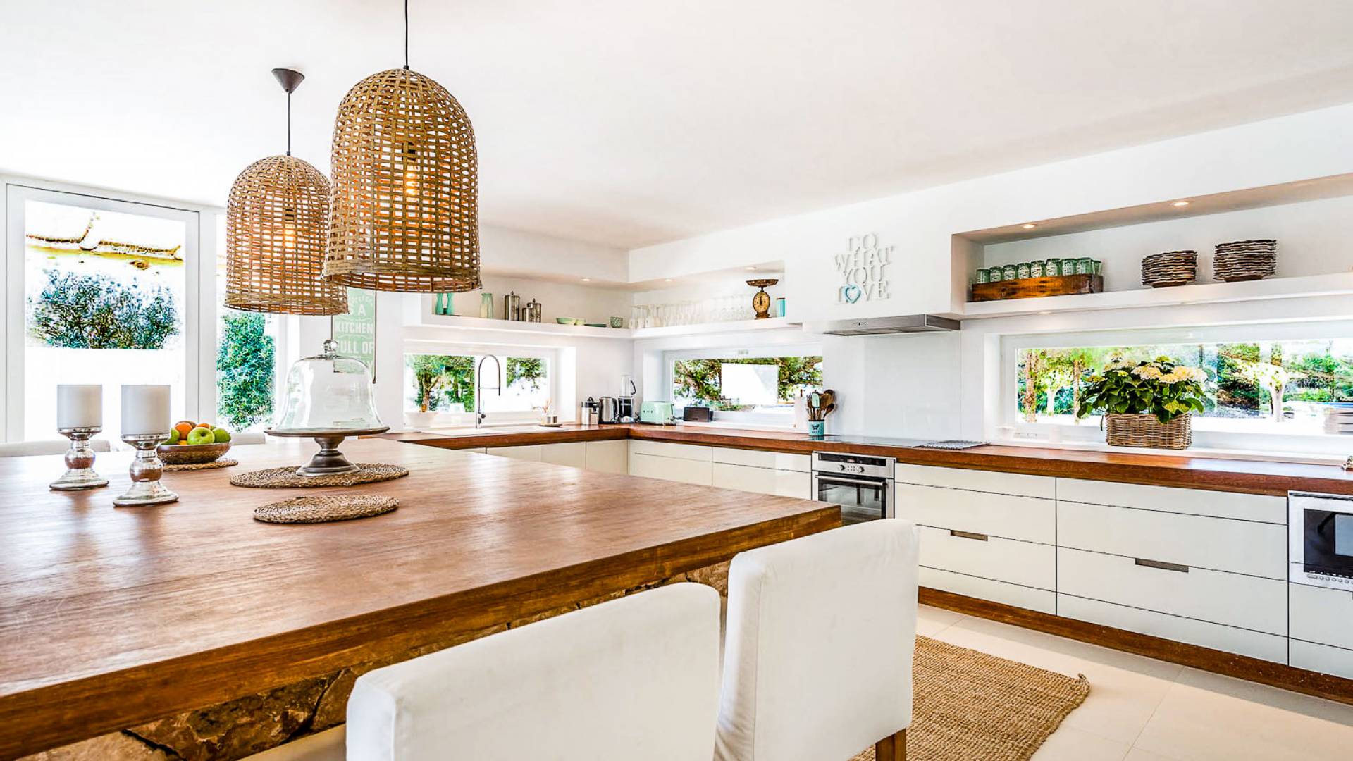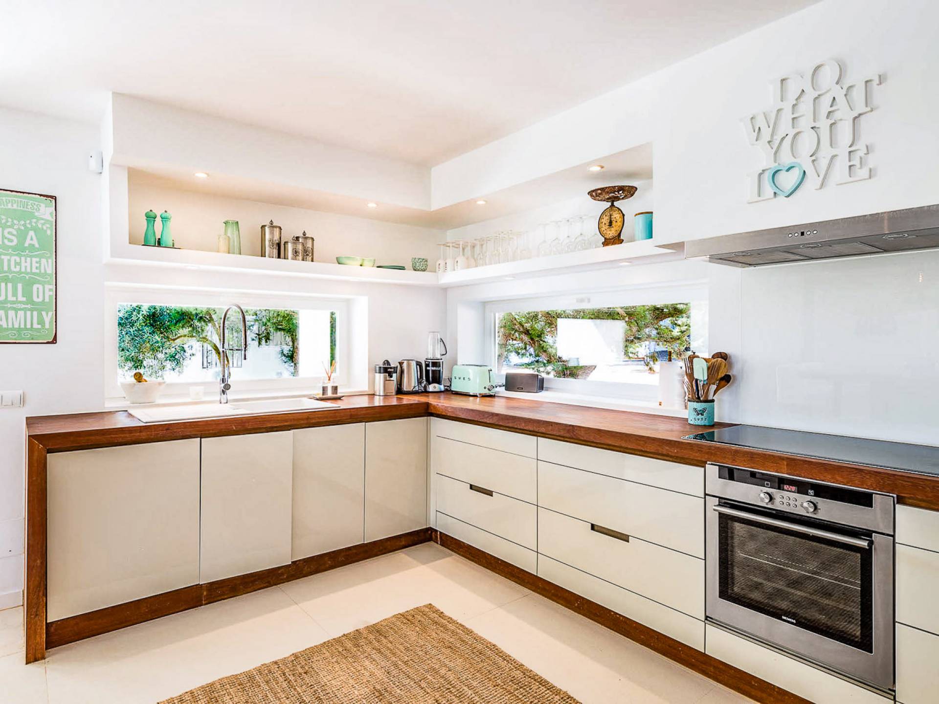 Las espaciosas áreas de estar son luminosas, de planta abierta y se combinan a la perfección con la sala de estar exterior. El salón cuenta con enormes ventanales que se abren a la terraza con vistas a la piscina; está bellamente decorado y amueblado y cuenta con un suntuoso sofá, un gran televisor con Sky y una chimenea. Hay una cocina impresionante, muy moderna y totalmente equipada con una isla central rodeada de 7 sillas; Incluye horno, vitrocerámica, lavavajillas, microondas, nevera grande, cafetera, tostadora, etc. En toda la propiedad hay aire acondicionado, calefacción y acceso a WiFi, también hay un aseo para invitados separado para mayor comodidad.