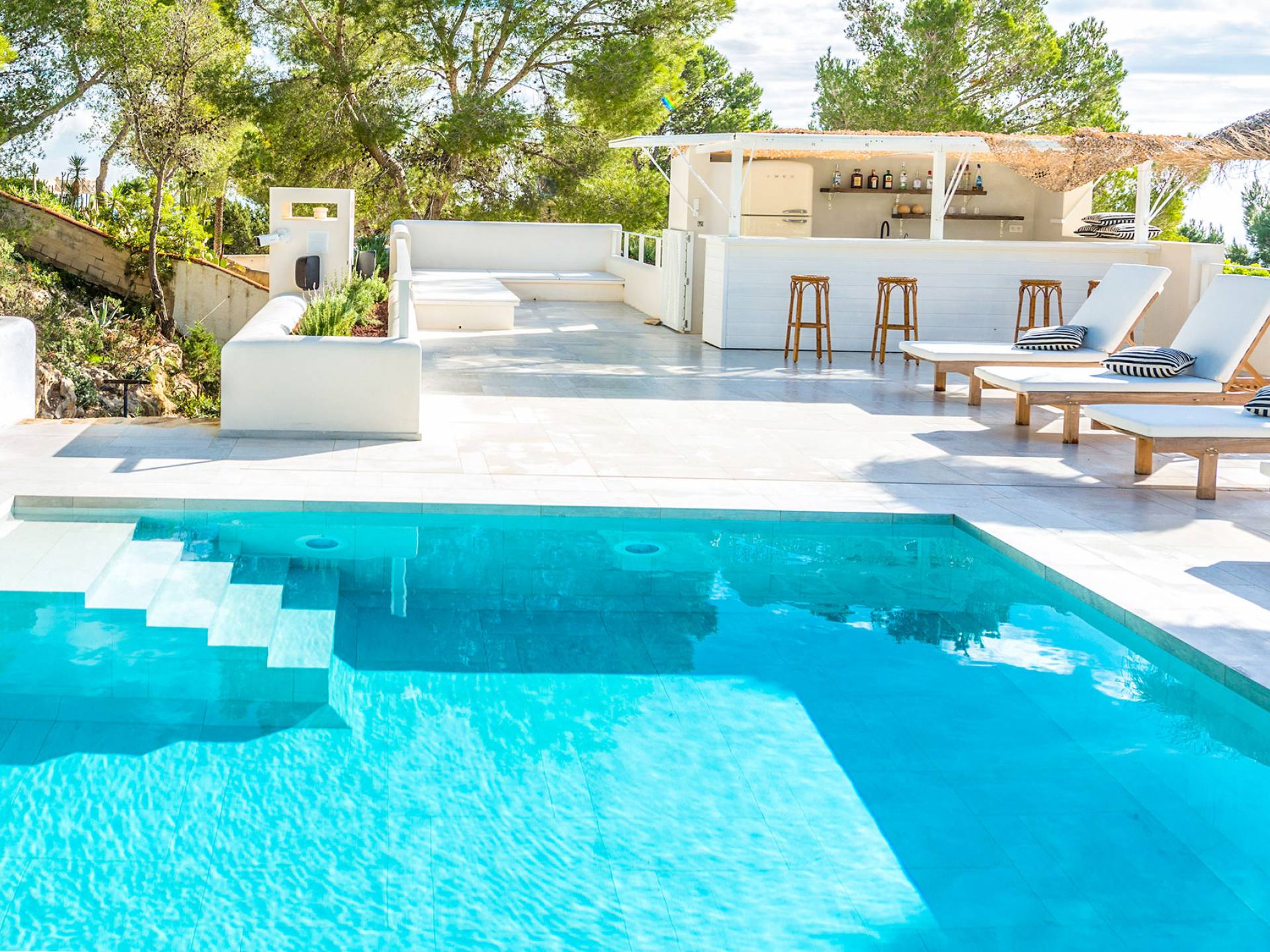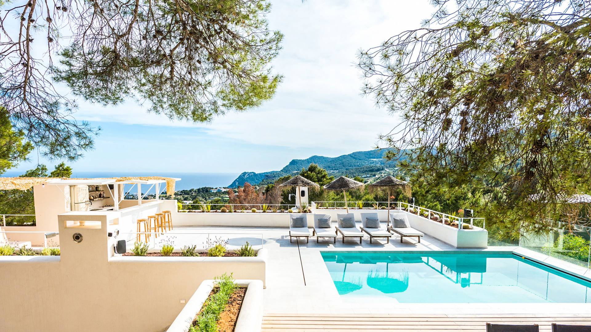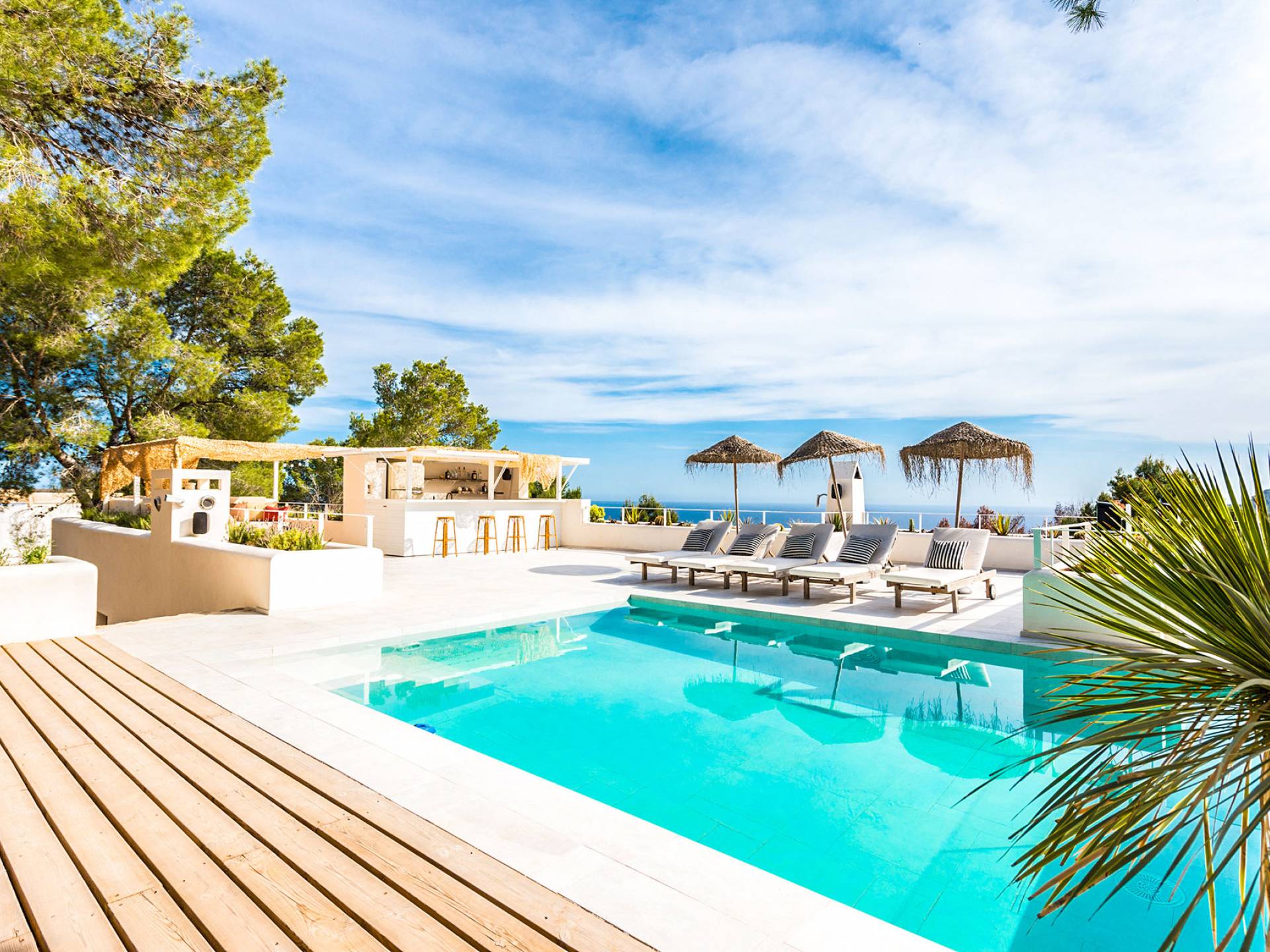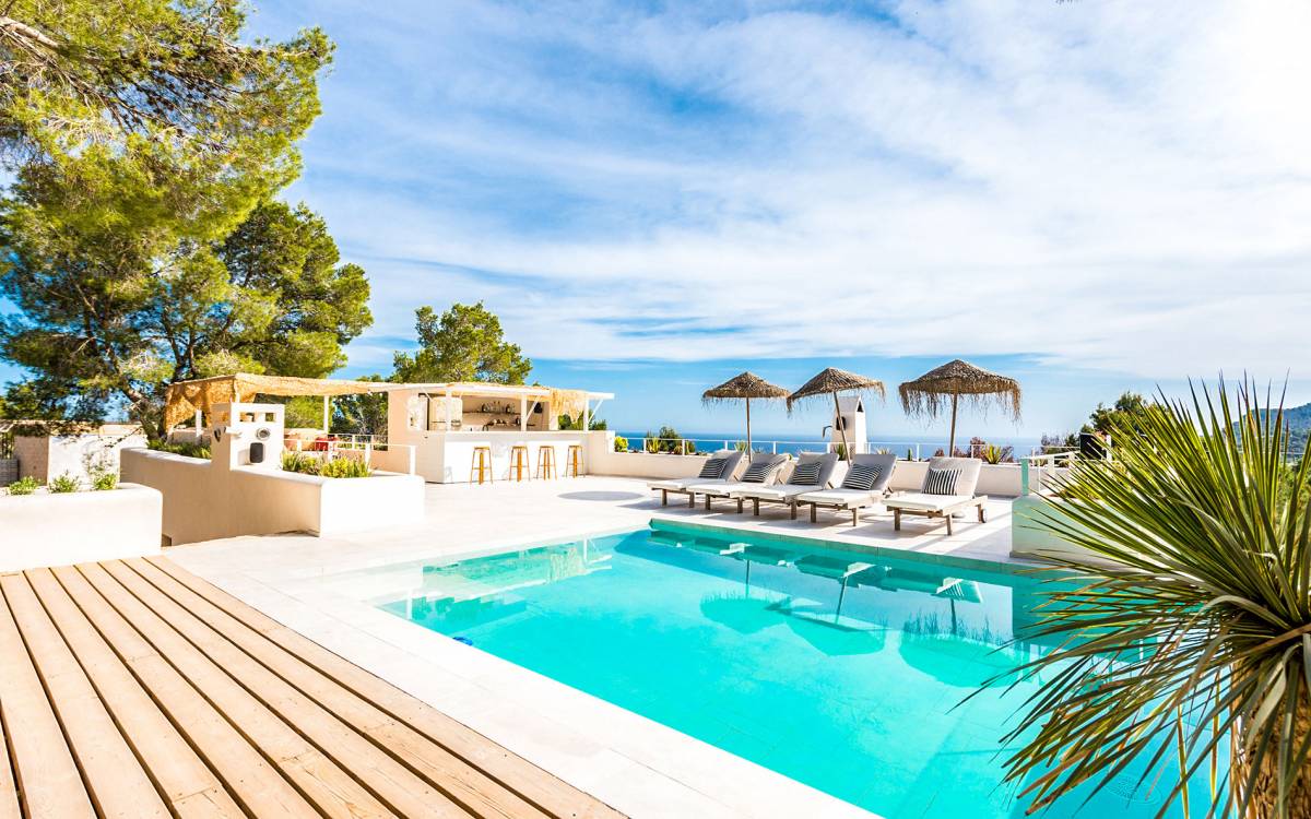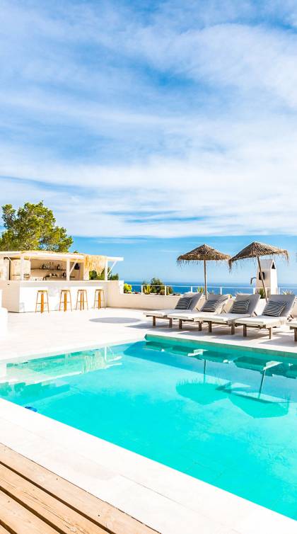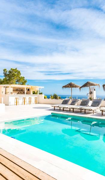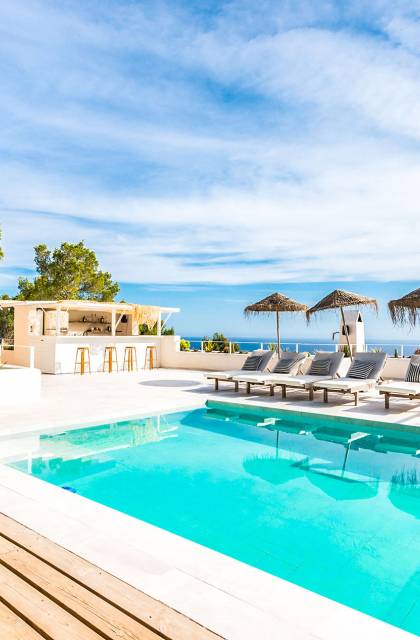 Villa Benito Ibiza es una villa de lujo en alquiler con 5 habitaciones y piscina privada. Propiedad única en la ladera construida en 4 niveles con vistas a la codiciada zona de Es Cubells, con increíbles vistas al mar y su propio Chiringuito, bar de piscina y cocina en la azotea...