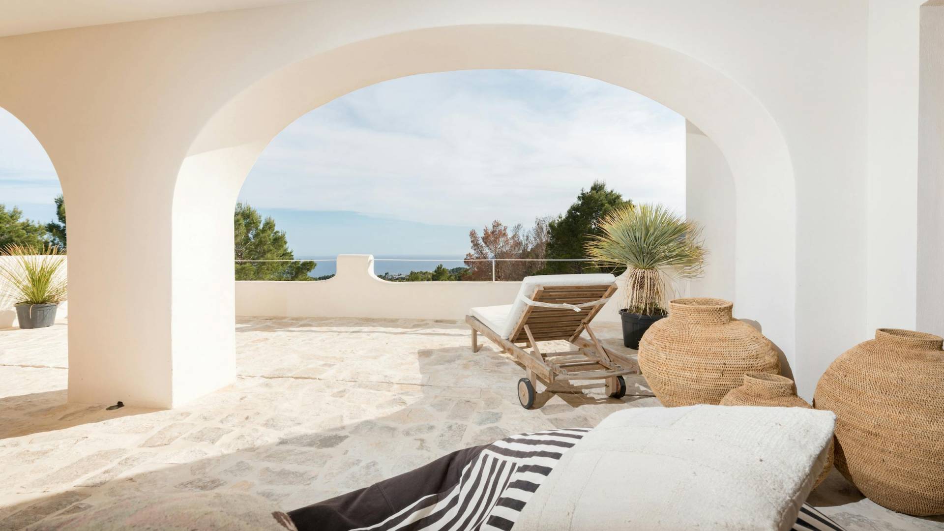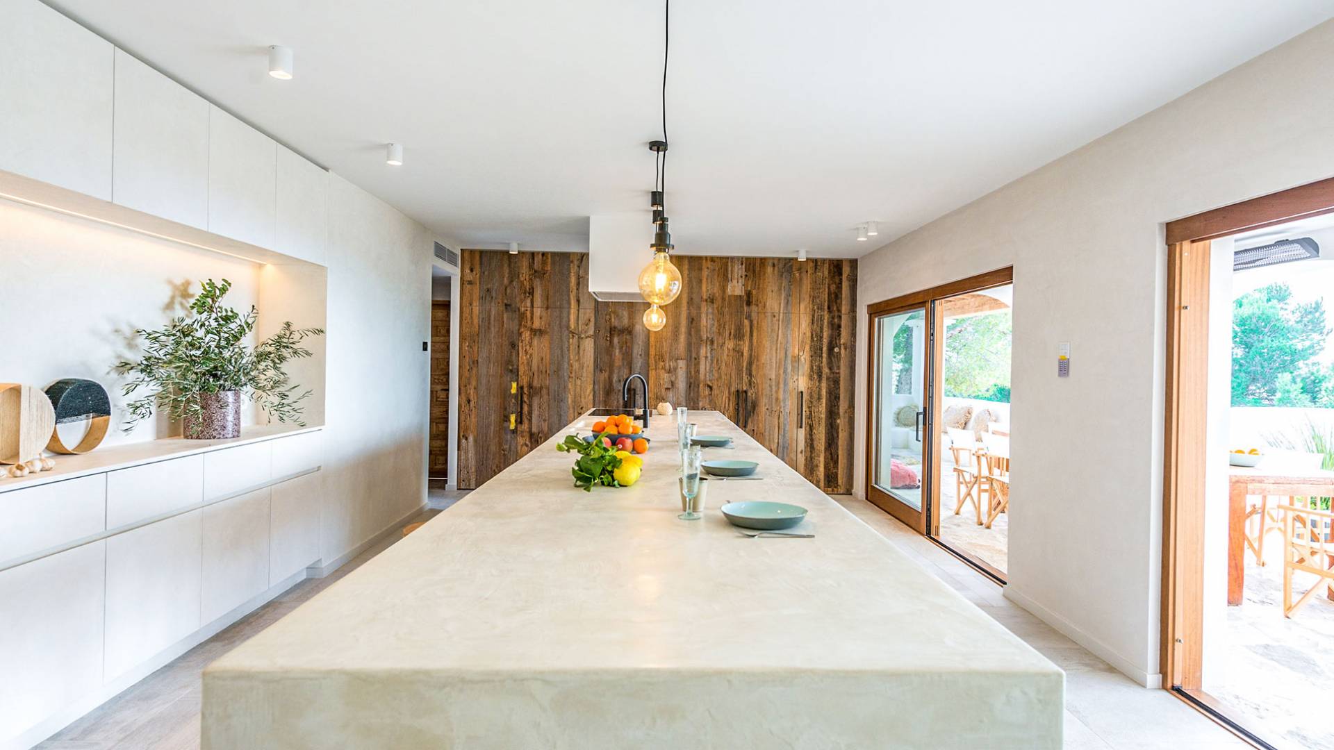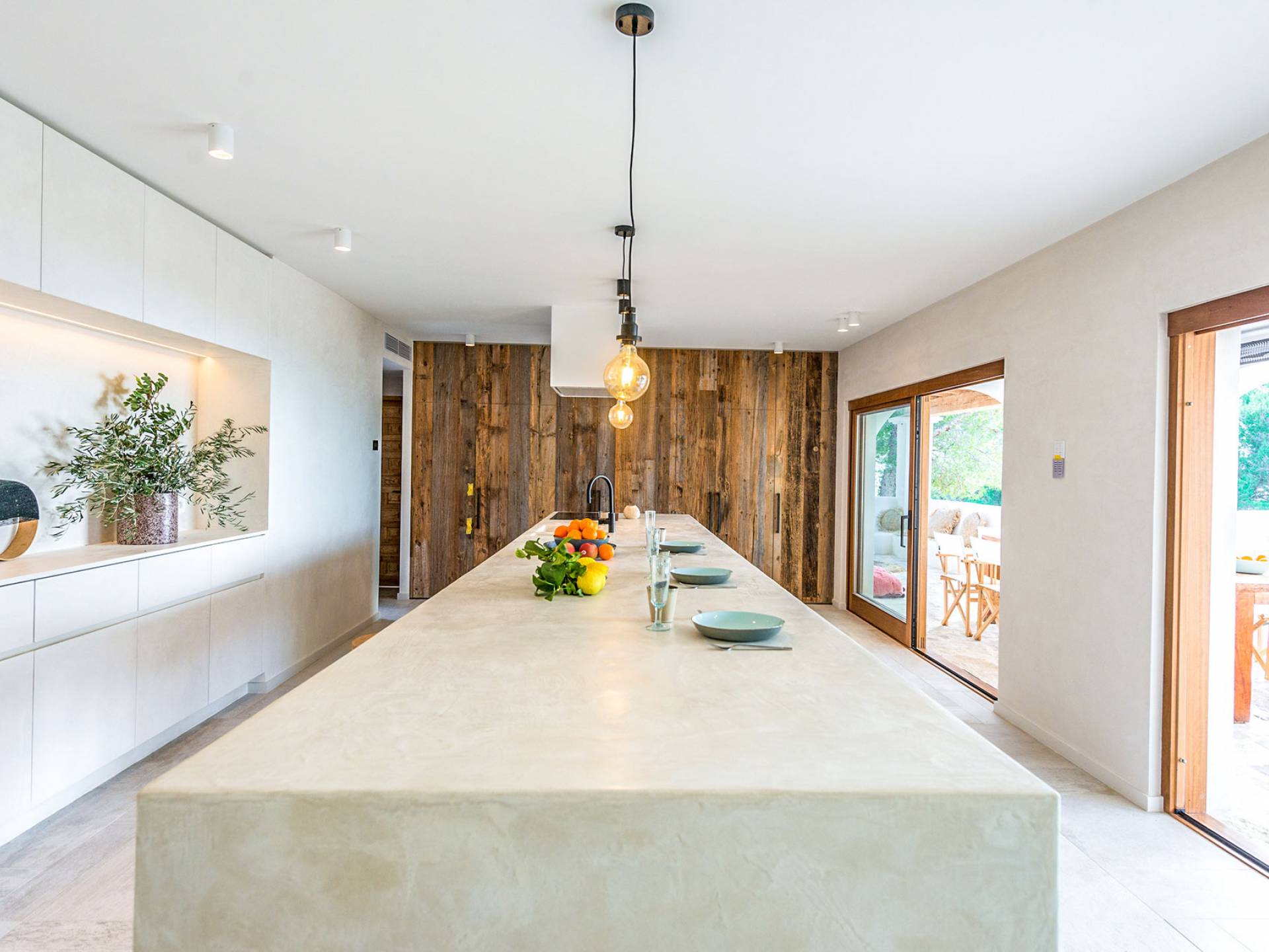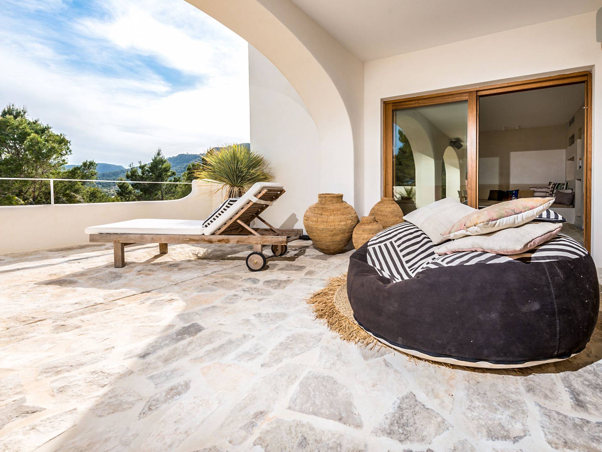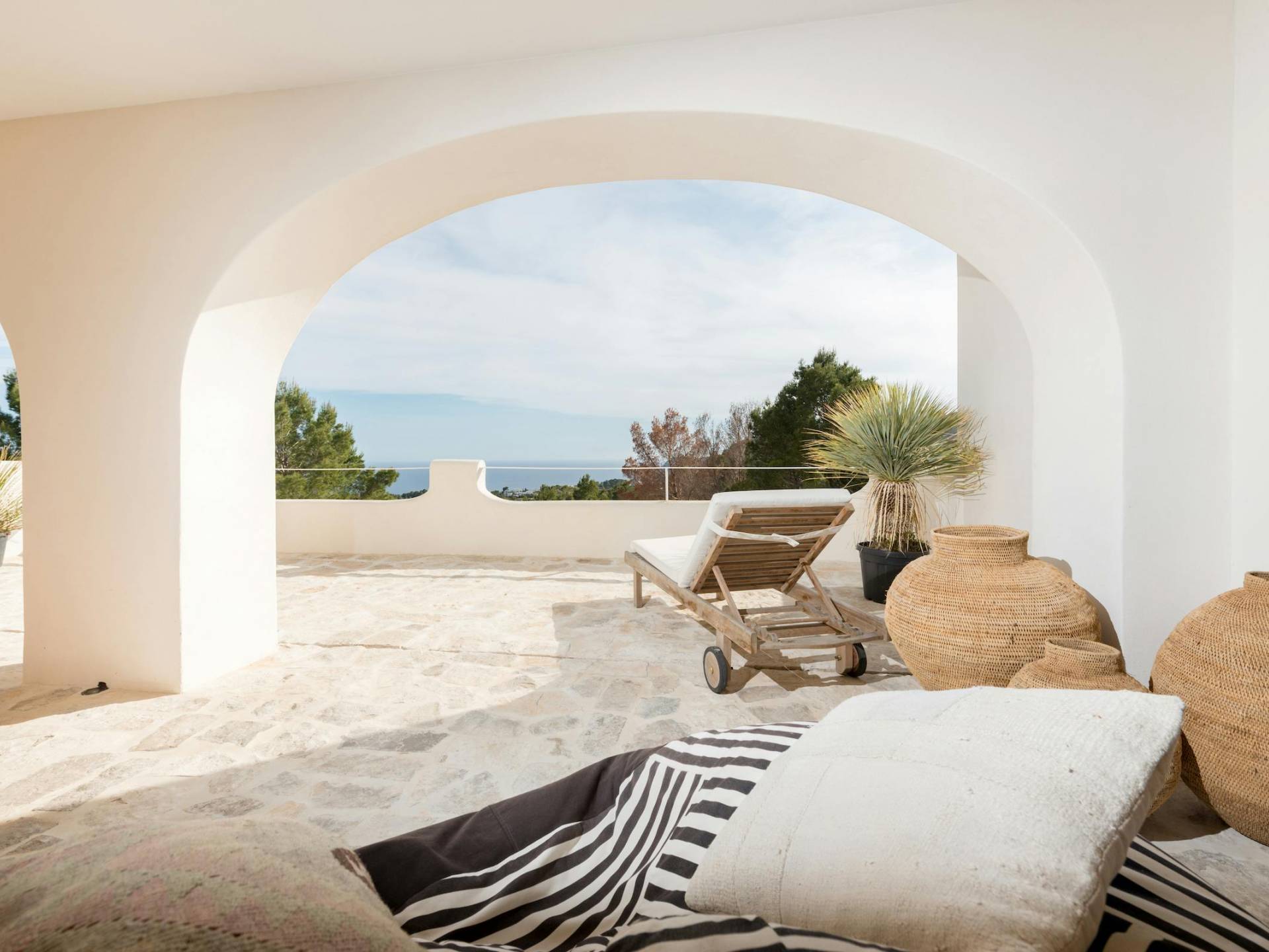 El tercer nivel se divide en 3 áreas, incluida una amplia terraza al aire libre con una generosa zona de descanso y hay una mesa grande que permite a todos los invitados disfrutar de un comedor adicional al aire libre mientras disfrutan de las vistas a través de los típicos arcos ibicencos. . La terraza fluye a la perfección hacia la amplia y moderna área de la cocina, que está totalmente equipada con todos los dispositivos para facilitar sus aventuras culinarias. Cuenta con una enorme isla de cocina y los magníficos armarios empotrados han sido hechos a mano con madera de granero canadiense de 200 años. Escondida se encuentra la sublime sala de estar con un gran televisor, una chimenea y una ventana Trompe l'oil con vista al valle. Además, el dormitorio principal se encuentra en este nivel.