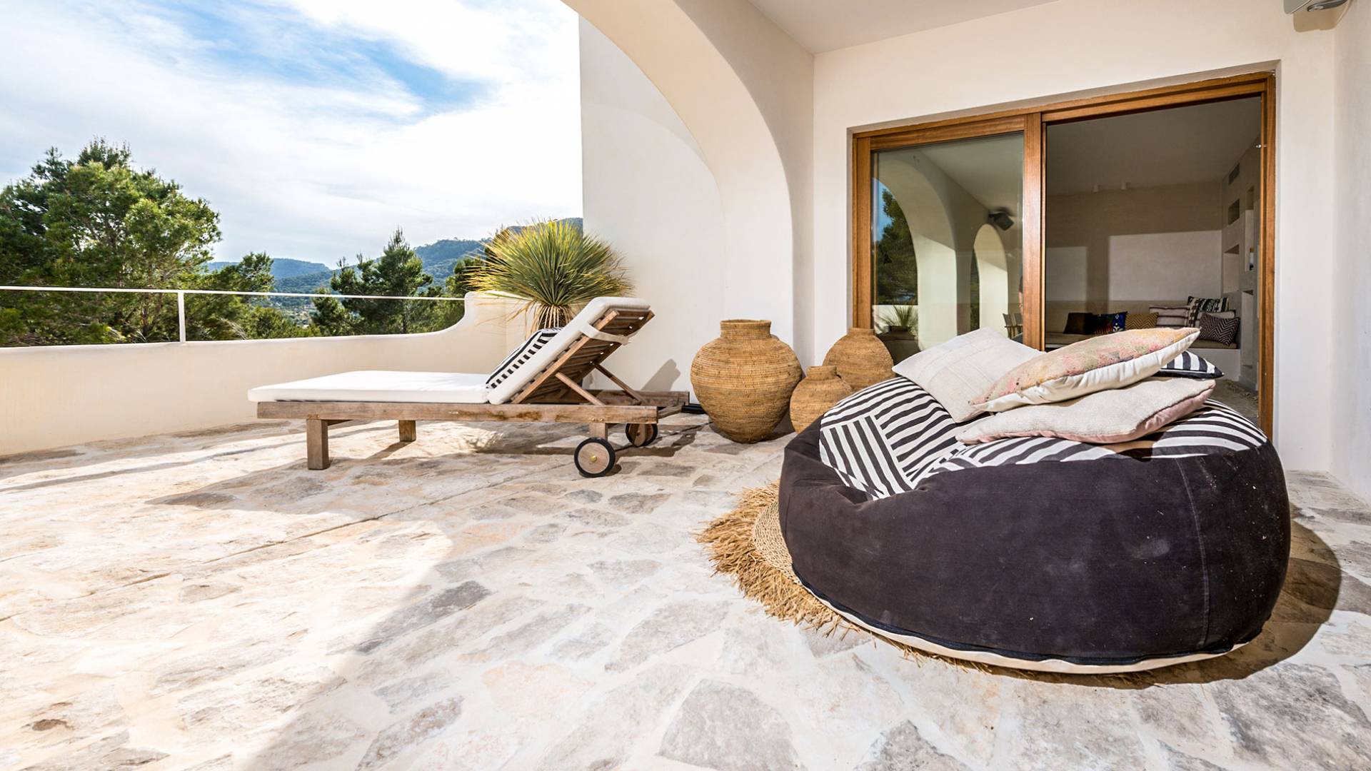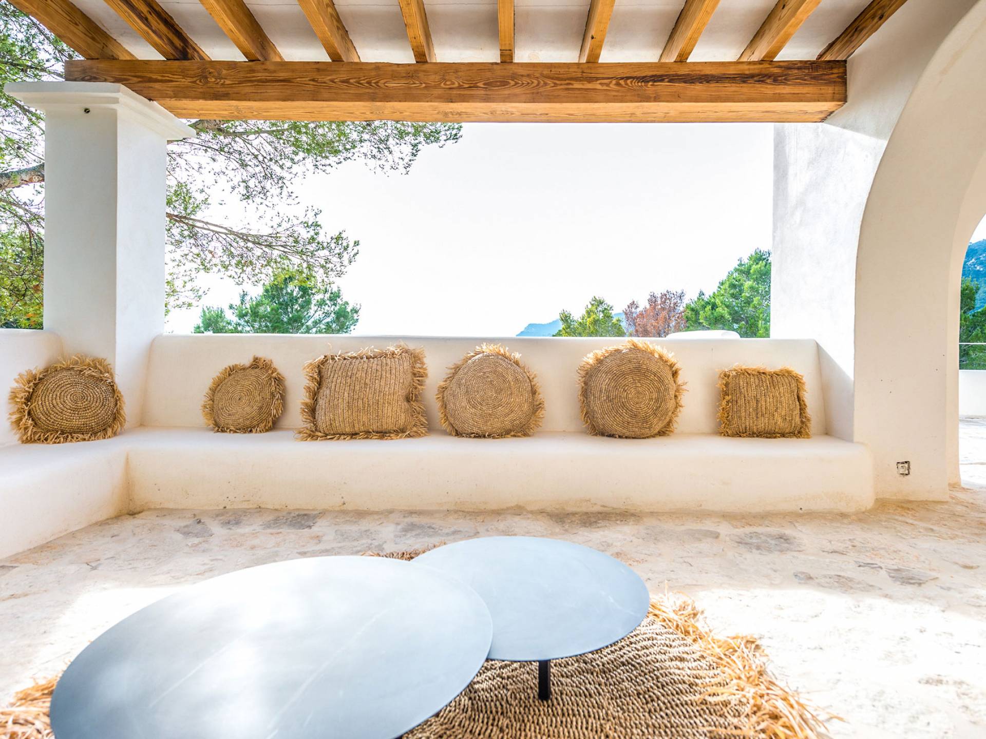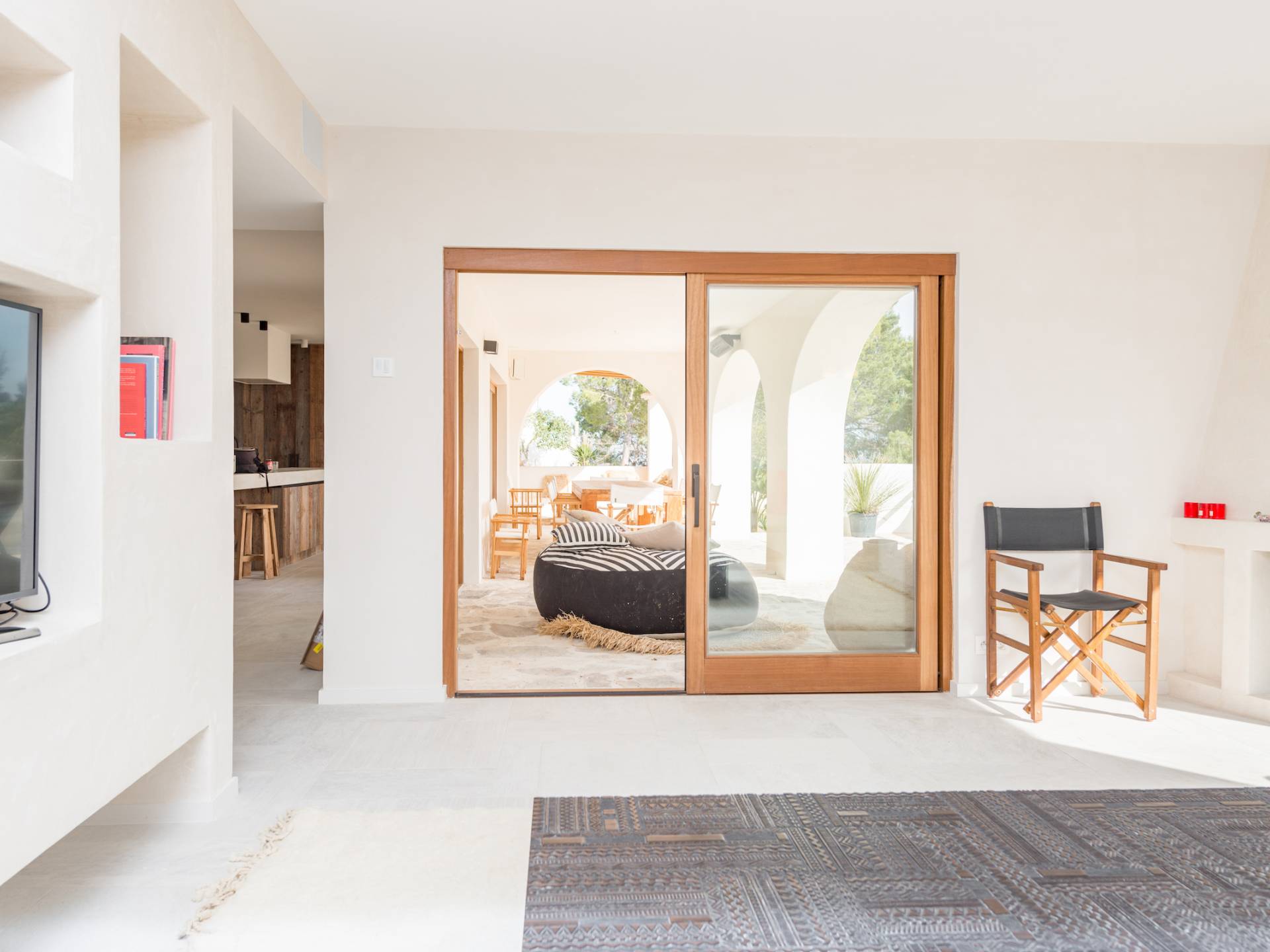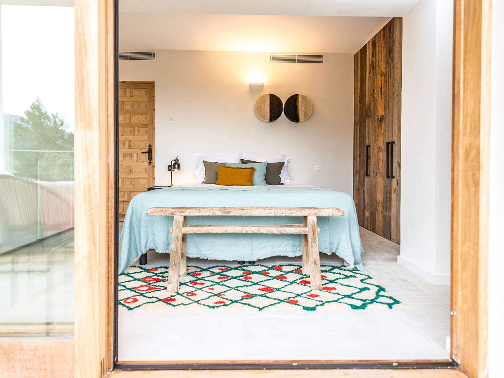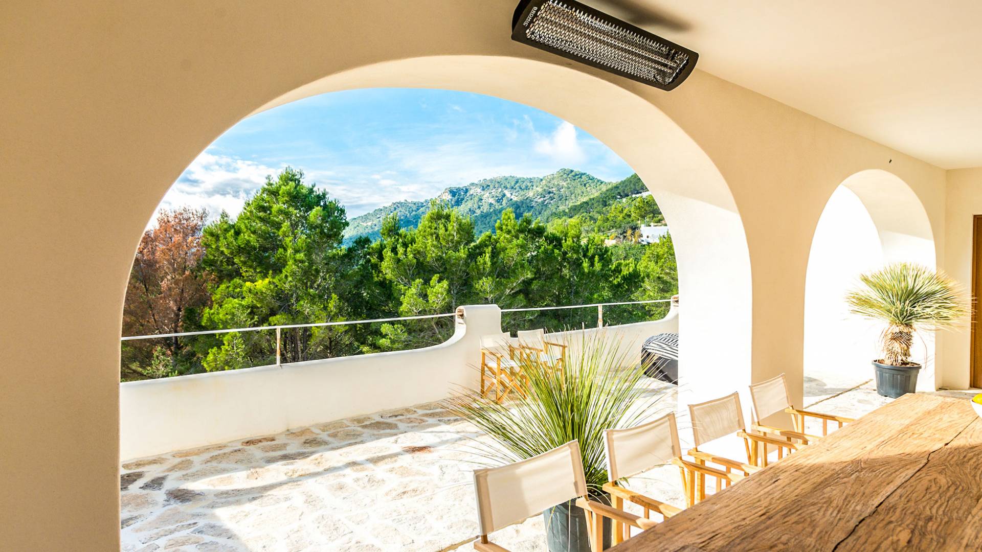 El tercer nivel se divide en 3 áreas, incluida una amplia terraza al aire libre con una generosa zona de descanso y hay una mesa grande que permite a todos los invitados disfrutar de un comedor adicional al aire libre mientras disfrutan de las vistas a través de los típicos arcos ibicencos. . La terraza fluye a la perfección hacia la amplia y moderna área de la cocina, que está totalmente equipada con todos los dispositivos para facilitar sus aventuras culinarias. Cuenta con una enorme isla de cocina y los magníficos armarios empotrados han sido hechos a mano con madera de granero canadiense de 200 años. Escondida se encuentra la sublime sala de estar con un gran televisor, una chimenea y una ventana Trompe l'oil con vista al valle. Además, el dormitorio principal se encuentra en este nivel.