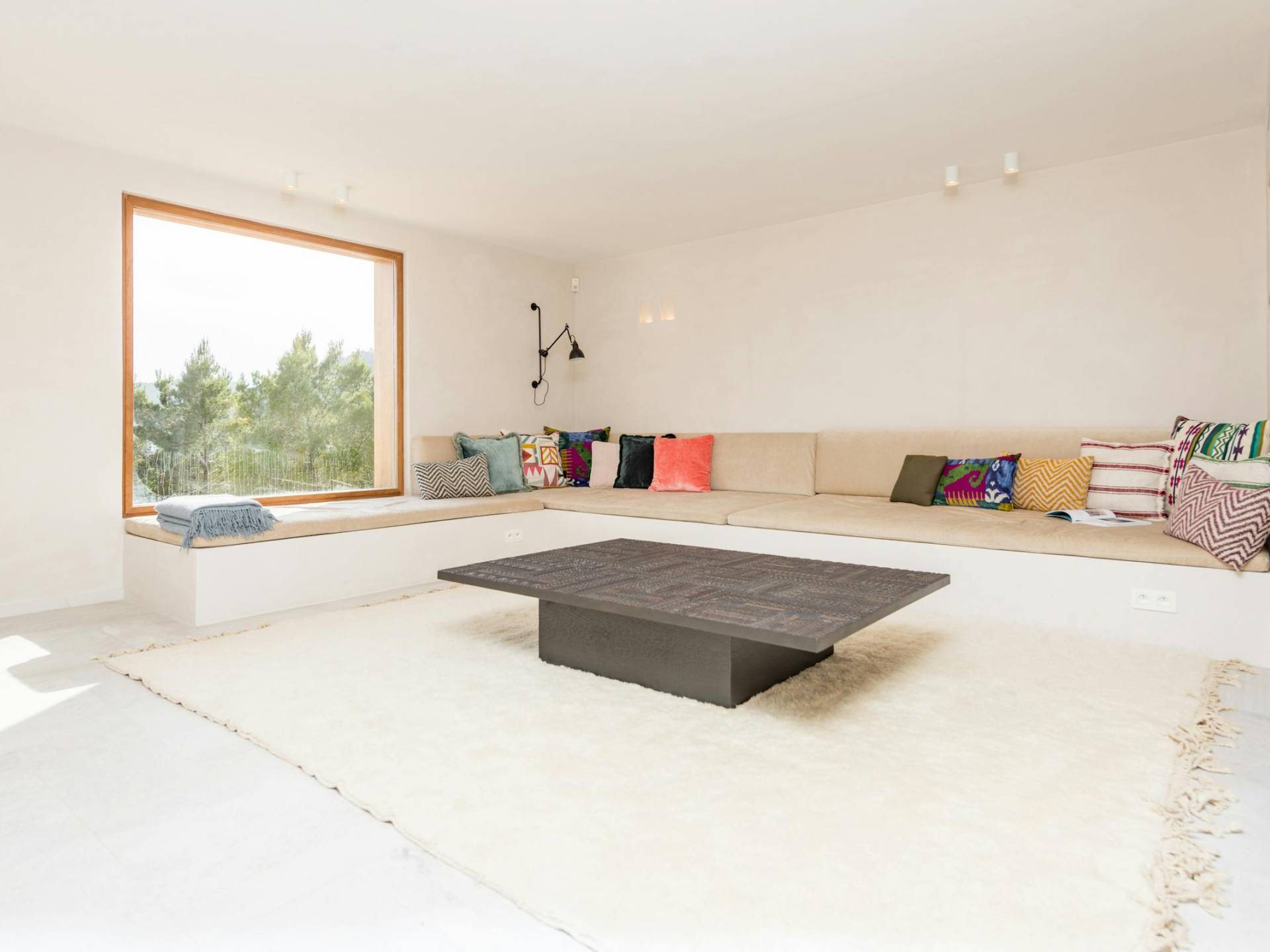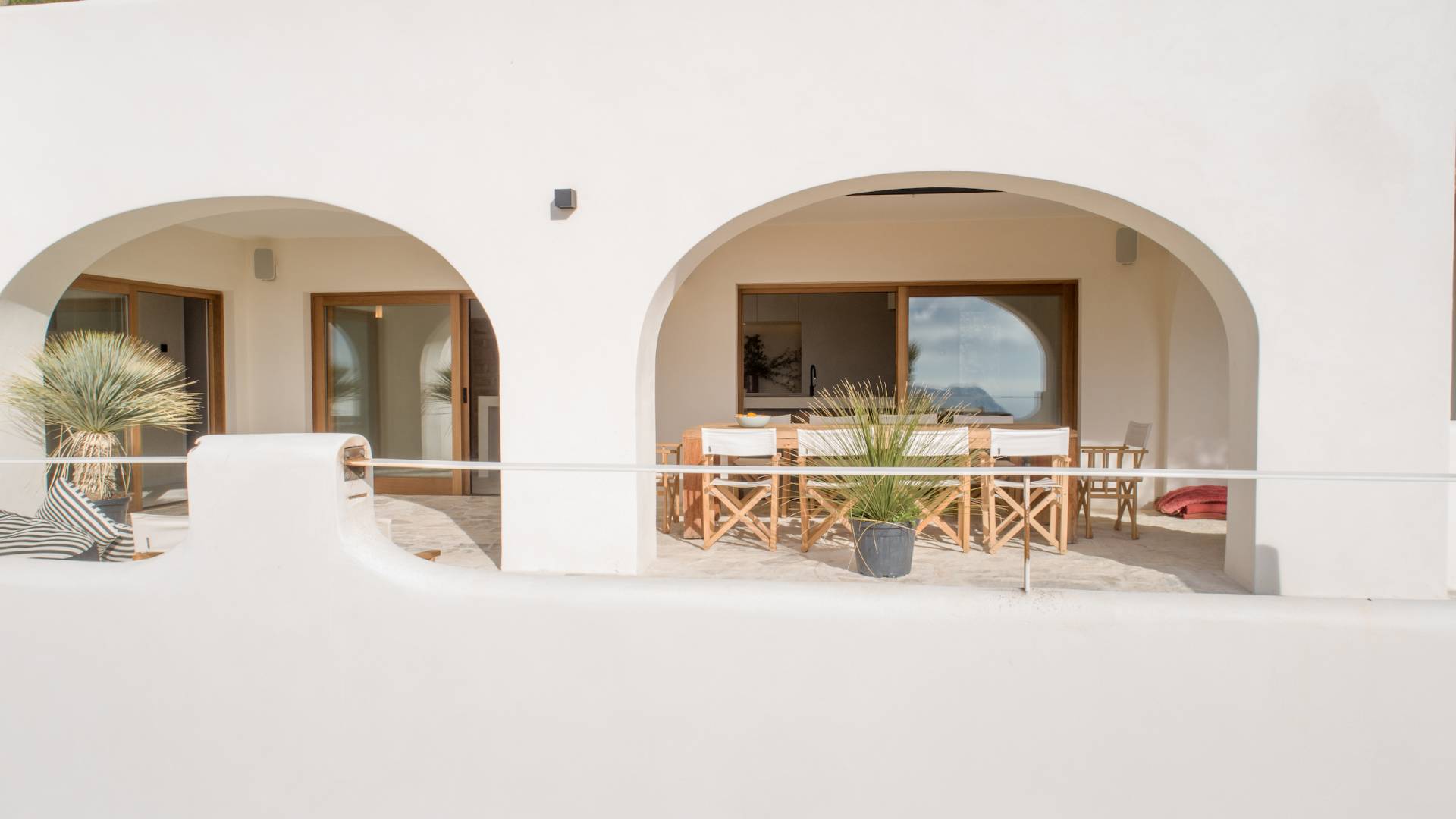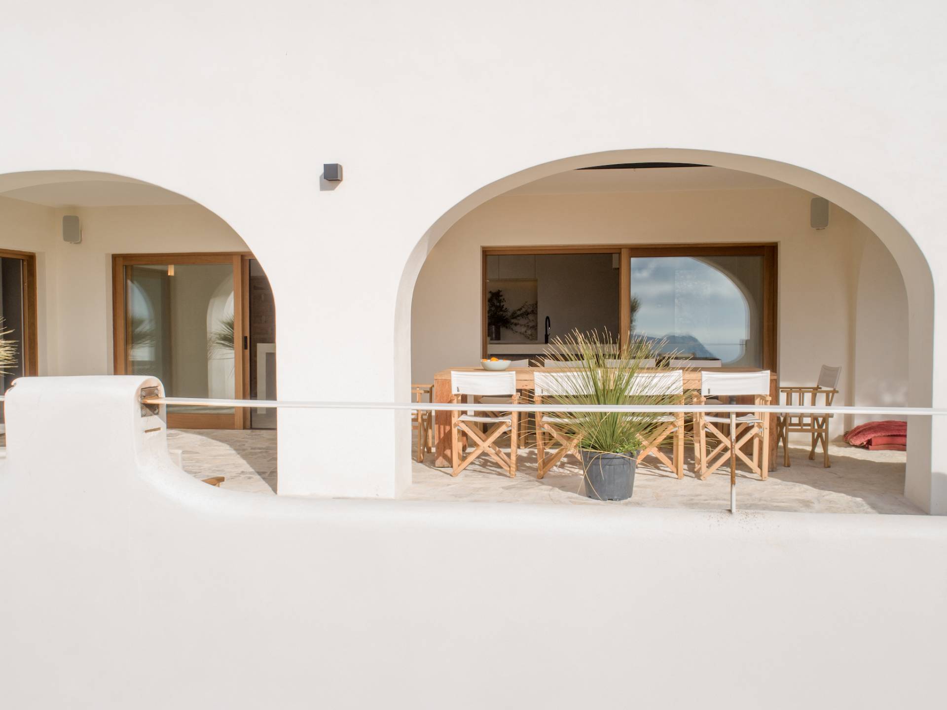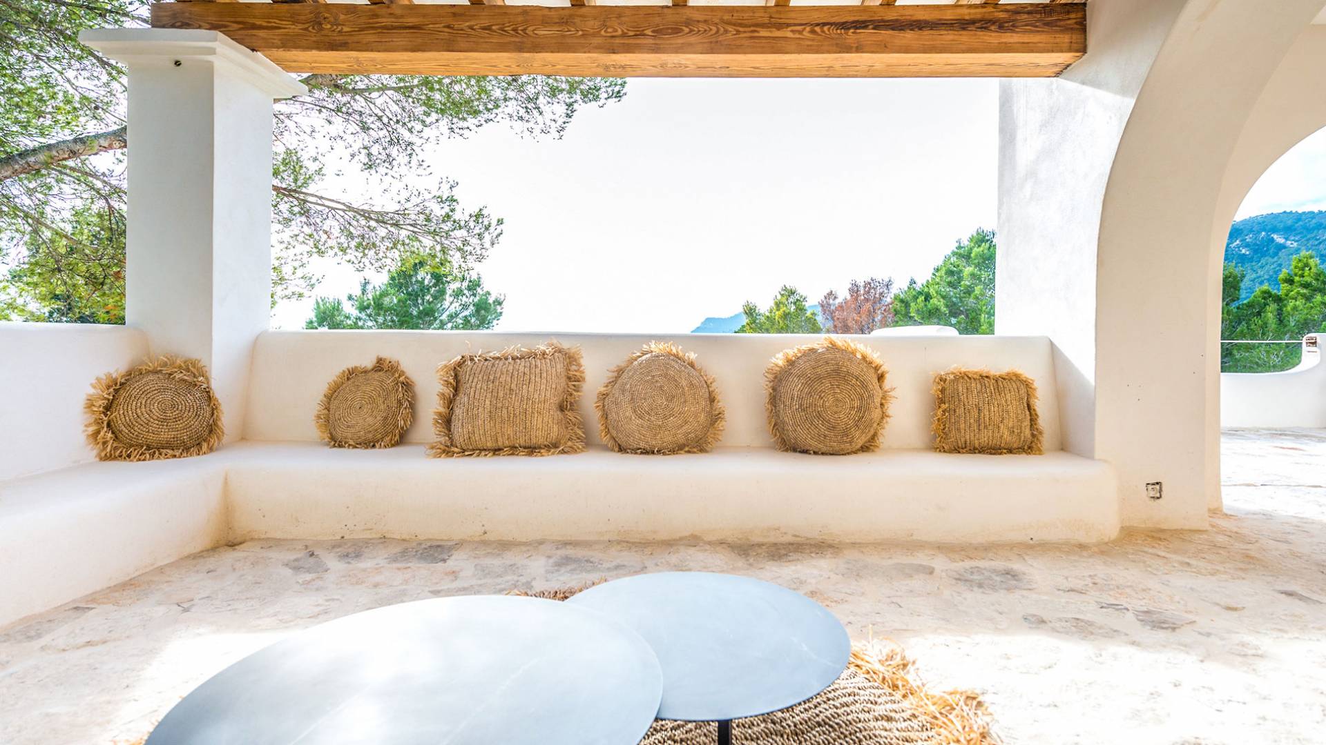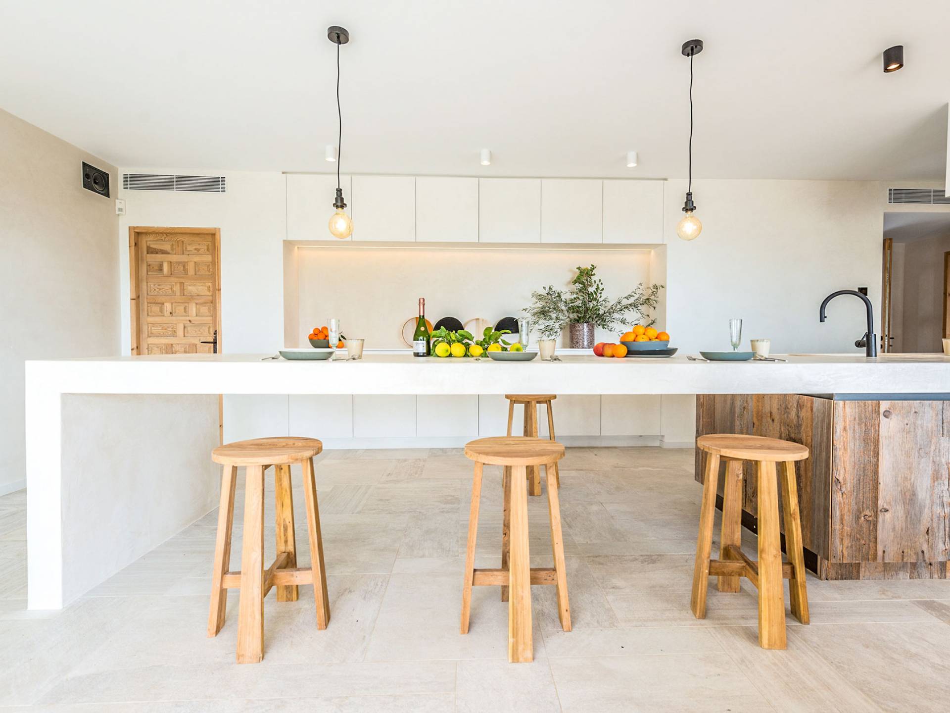 El tercer nivel se divide en 3 áreas, incluida una amplia terraza al aire libre con una generosa zona de descanso y hay una mesa grande que permite a todos los invitados disfrutar de un comedor adicional al aire libre mientras disfrutan de las vistas a través de los típicos arcos ibicencos. . La terraza fluye a la perfección hacia la amplia y moderna área de la cocina, que está totalmente equipada con todos los dispositivos para facilitar sus aventuras culinarias. Cuenta con una enorme isla de cocina y los magníficos armarios empotrados han sido hechos a mano con madera de granero canadiense de 200 años. Escondida se encuentra la sublime sala de estar con un gran televisor, una chimenea y una ventana Trompe l'oil con vista al valle. Además, el dormitorio principal se encuentra en este nivel.