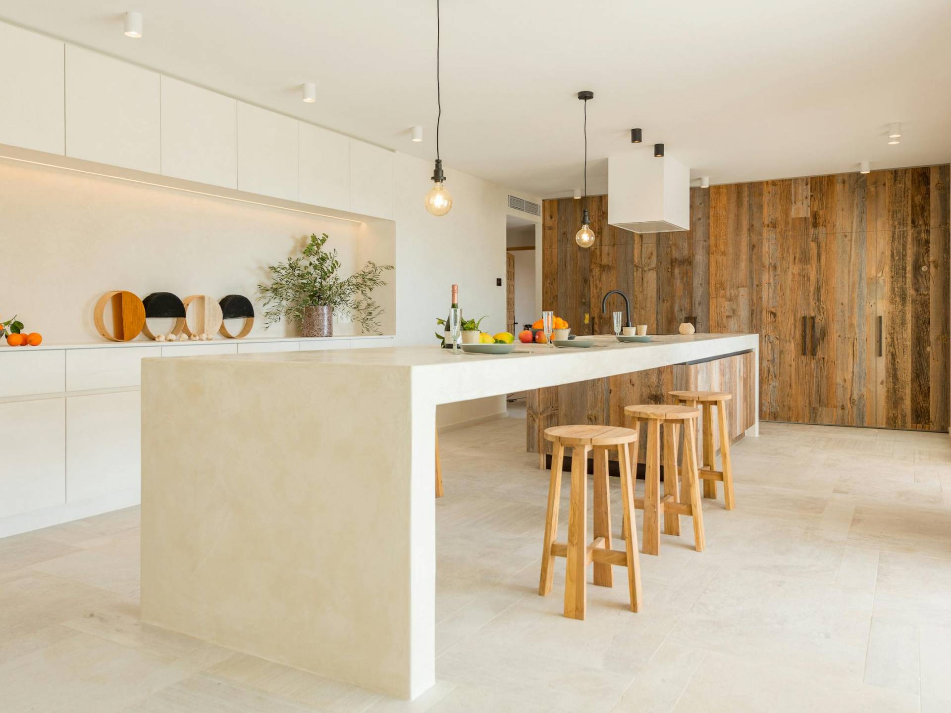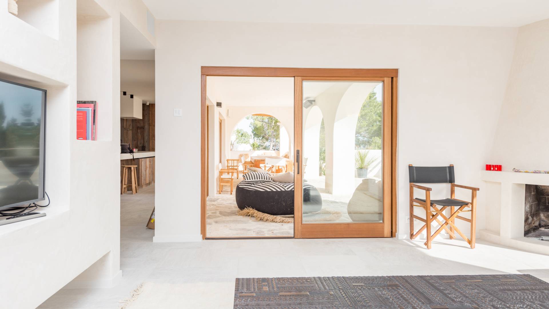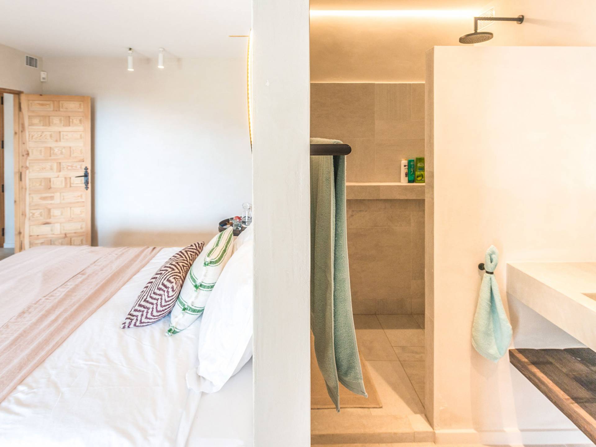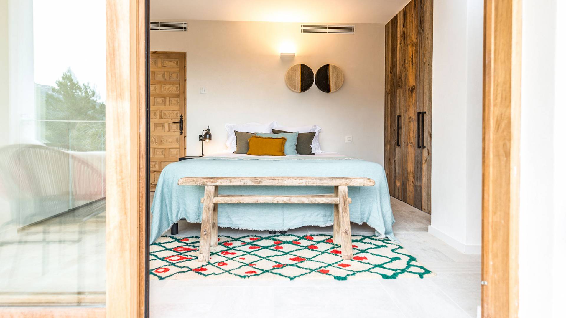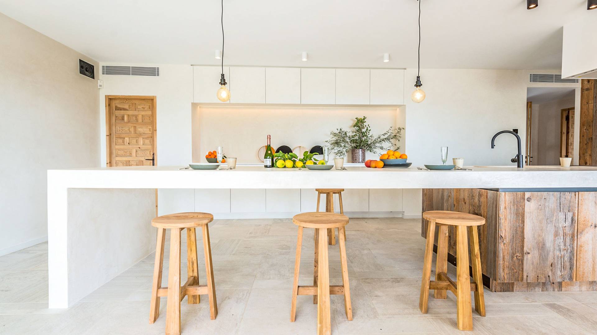 El tercer nivel se divide en 3 áreas, incluida una amplia terraza al aire libre con una generosa zona de descanso y hay una mesa grande que permite a todos los invitados disfrutar de un comedor adicional al aire libre mientras disfrutan de las vistas a través de los típicos arcos ibicencos. . La terraza fluye a la perfección hacia la amplia y moderna área de la cocina, que está totalmente equipada con todos los dispositivos para facilitar sus aventuras culinarias. Cuenta con una enorme isla de cocina y los magníficos armarios empotrados han sido hechos a mano con madera de granero canadiense de 200 años. Escondida se encuentra la sublime sala de estar con un gran televisor, una chimenea y una ventana Trompe l'oil con vista al valle. Además, el dormitorio principal se encuentra en este nivel.