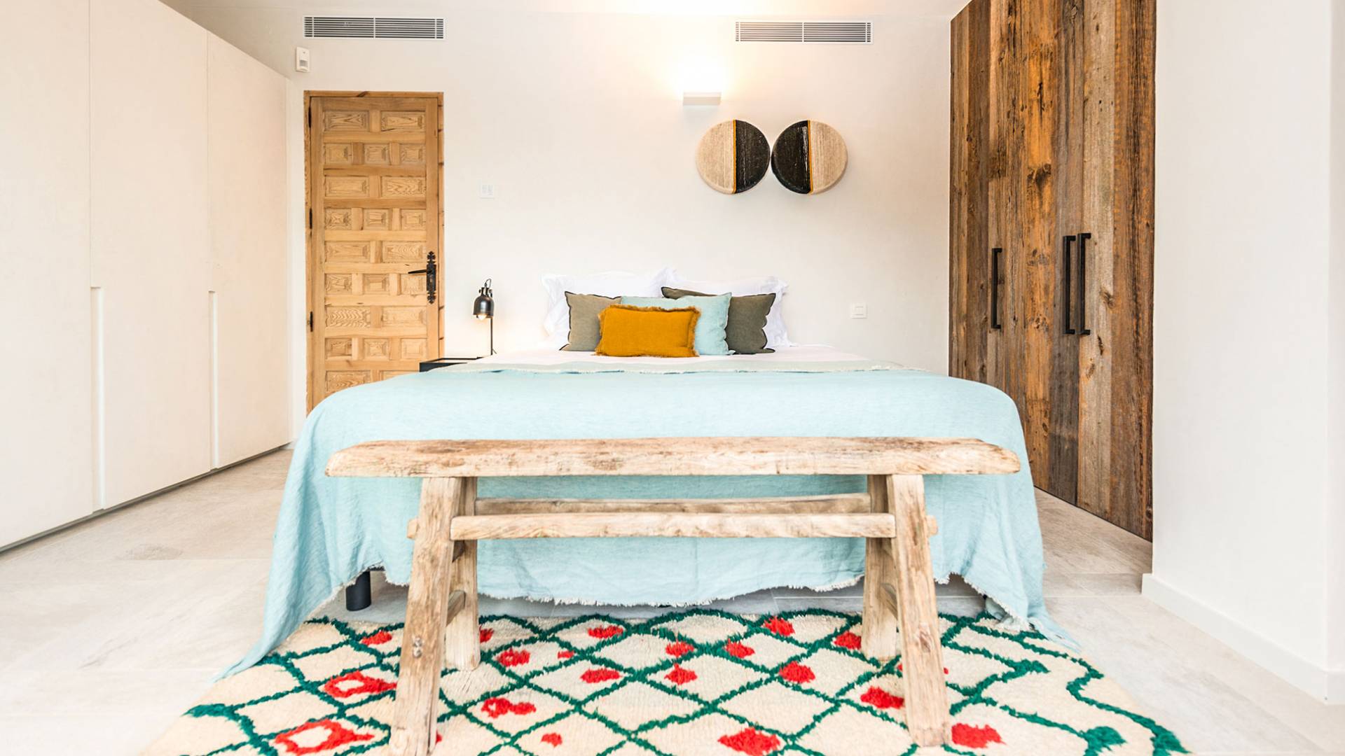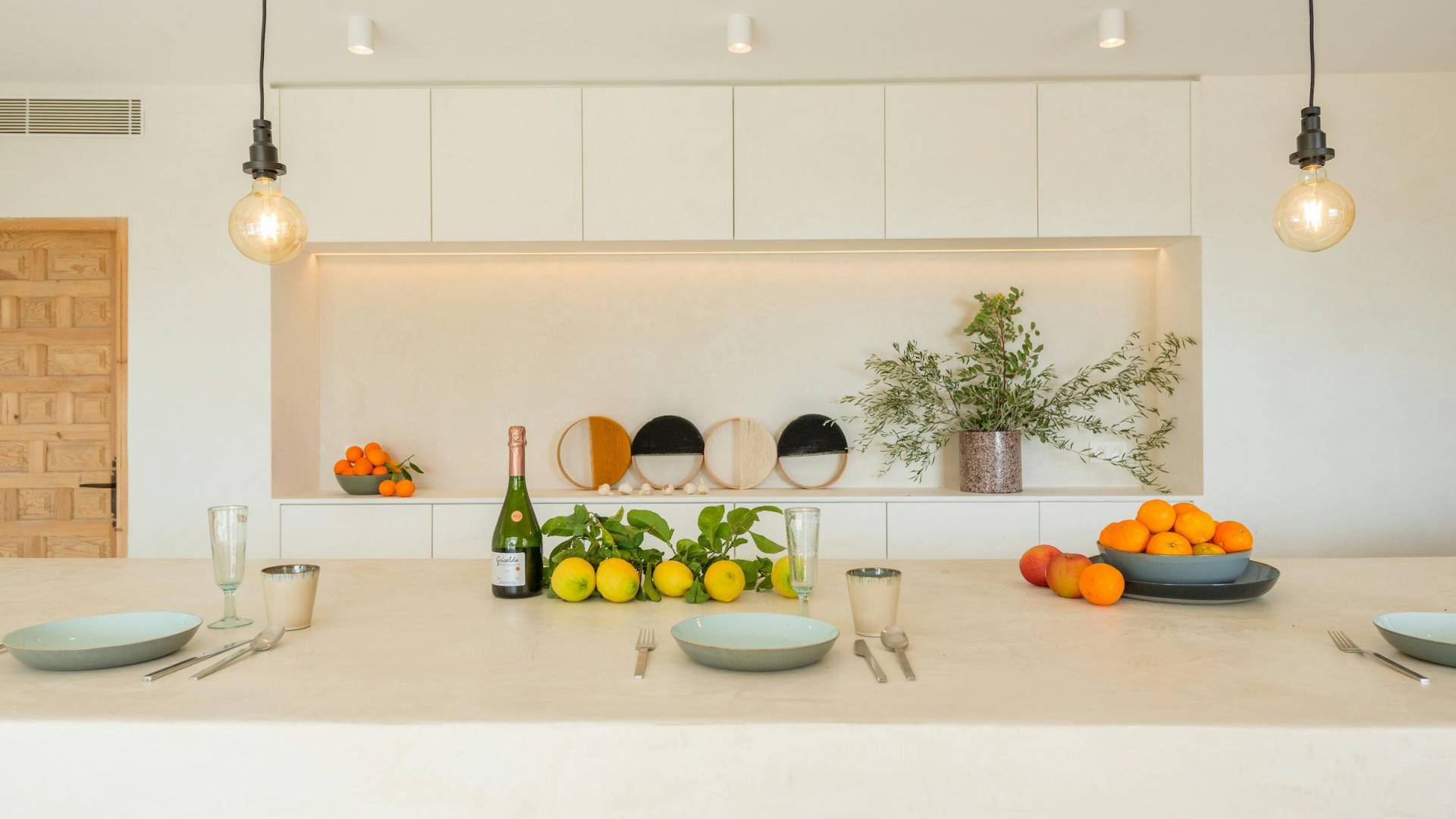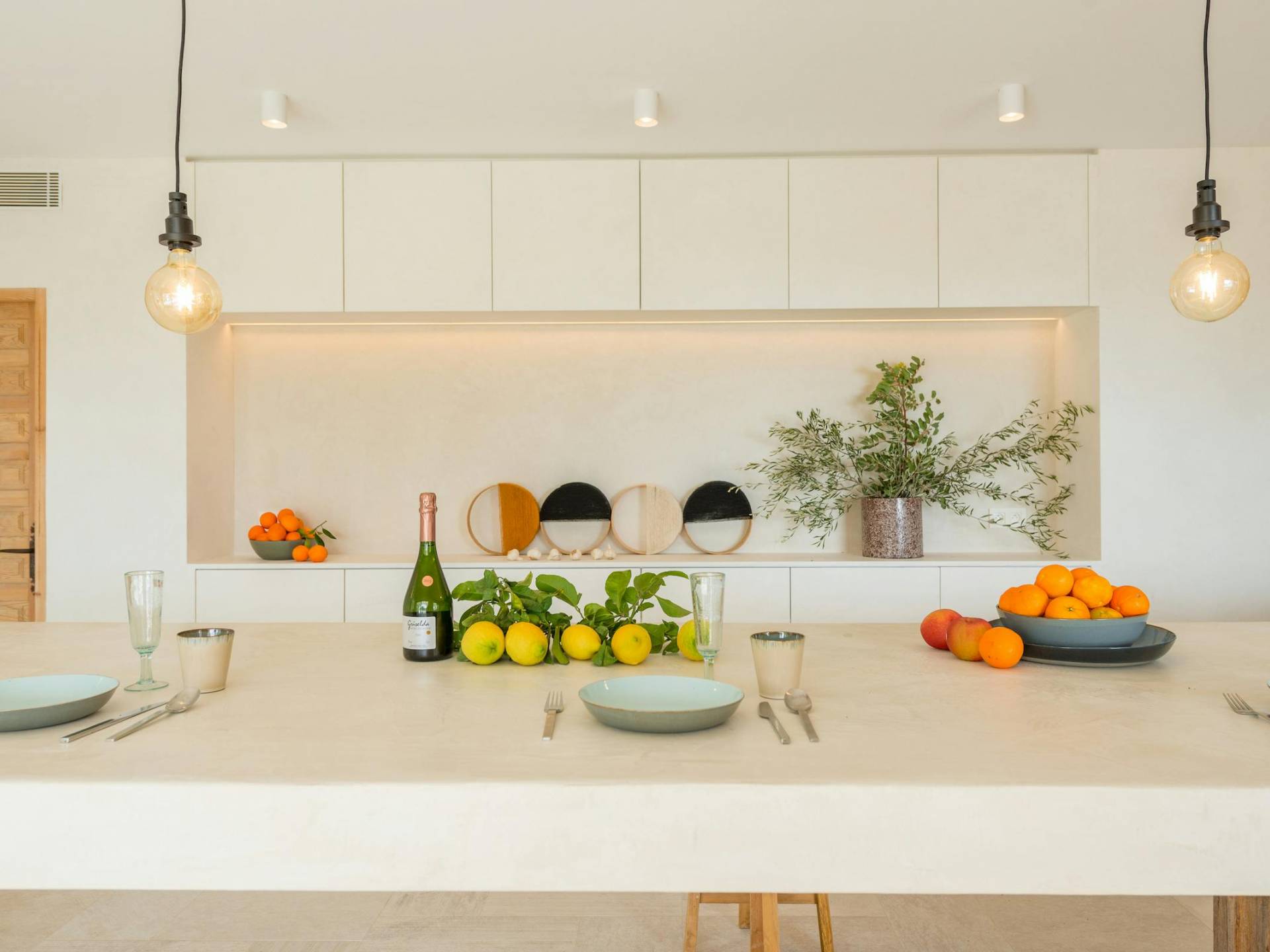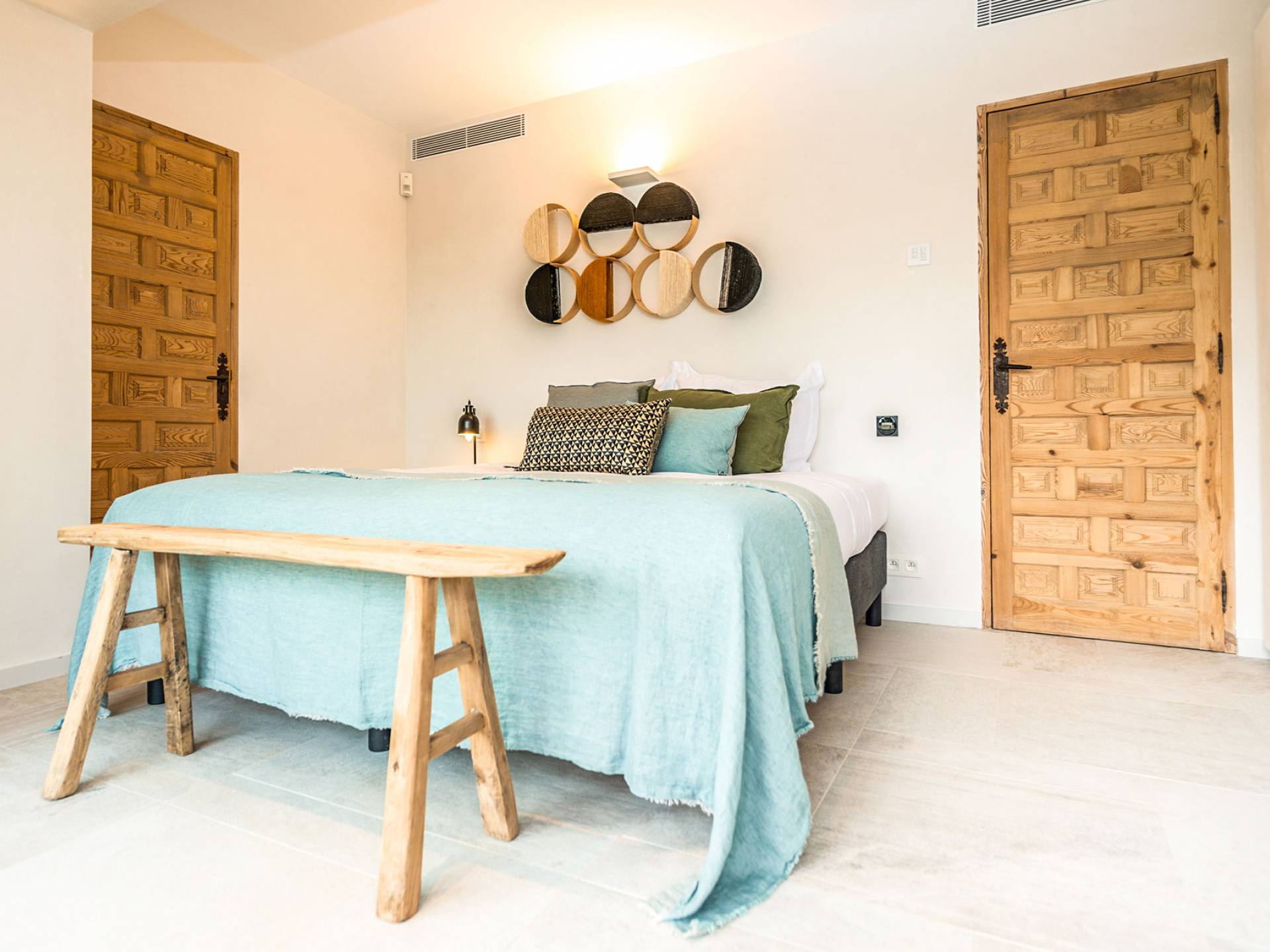 El tercer nivel se divide en 3 áreas, incluida una amplia terraza al aire libre con una generosa zona de descanso y hay una mesa grande que permite a todos los invitados disfrutar de un comedor adicional al aire libre mientras disfrutan de las vistas a través de los típicos arcos ibicencos. . La terraza fluye a la perfección hacia la amplia y moderna área de la cocina, que está totalmente equipada con todos los dispositivos para facilitar sus aventuras culinarias. Cuenta con una enorme isla de cocina y los magníficos armarios empotrados han sido hechos a mano con madera de granero canadiense de 200 años. Escondida se encuentra la sublime sala de estar con un gran televisor, una chimenea y una ventana Trompe l'oil con vista al valle. Además, el dormitorio principal se encuentra en este nivel.