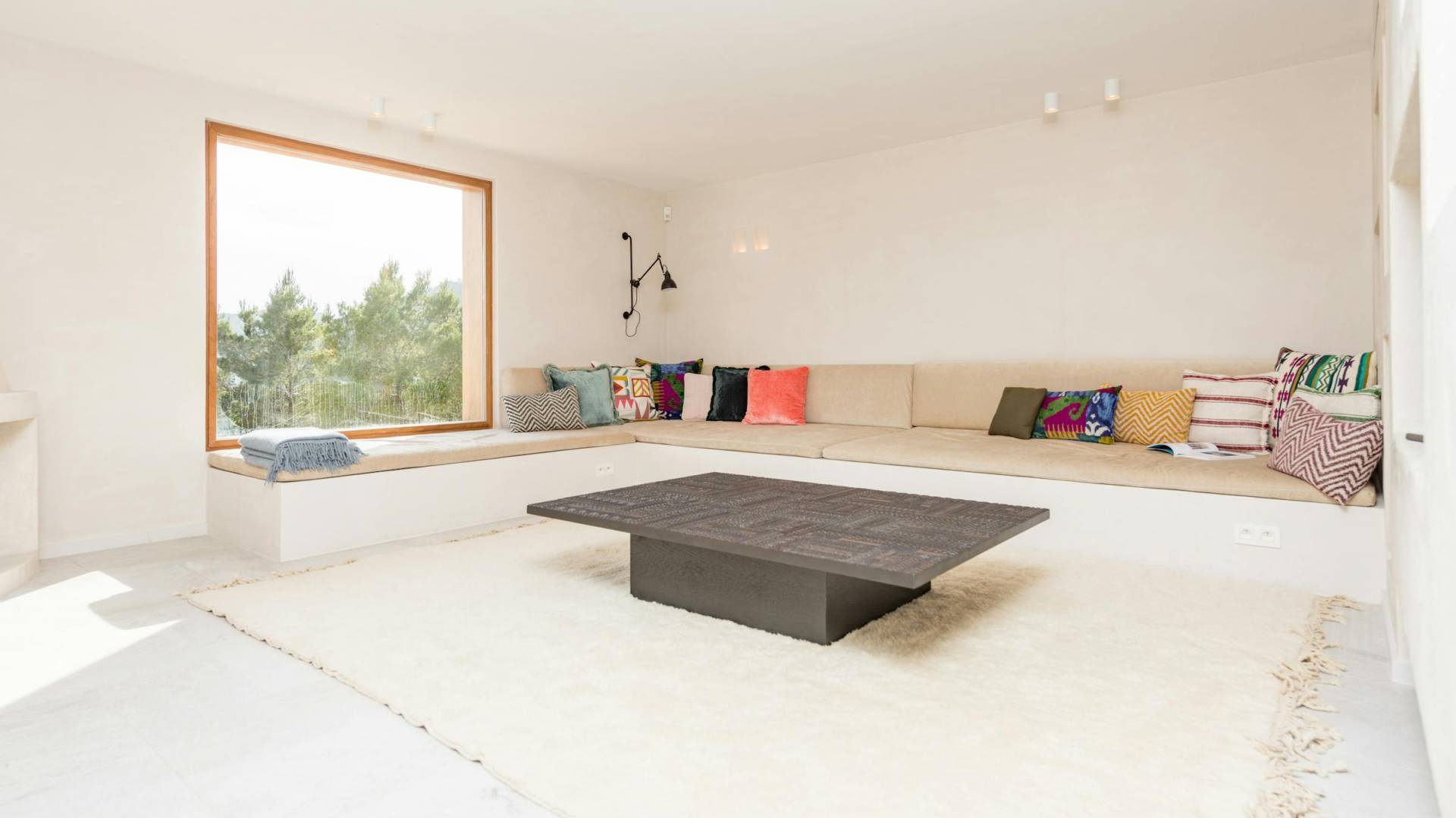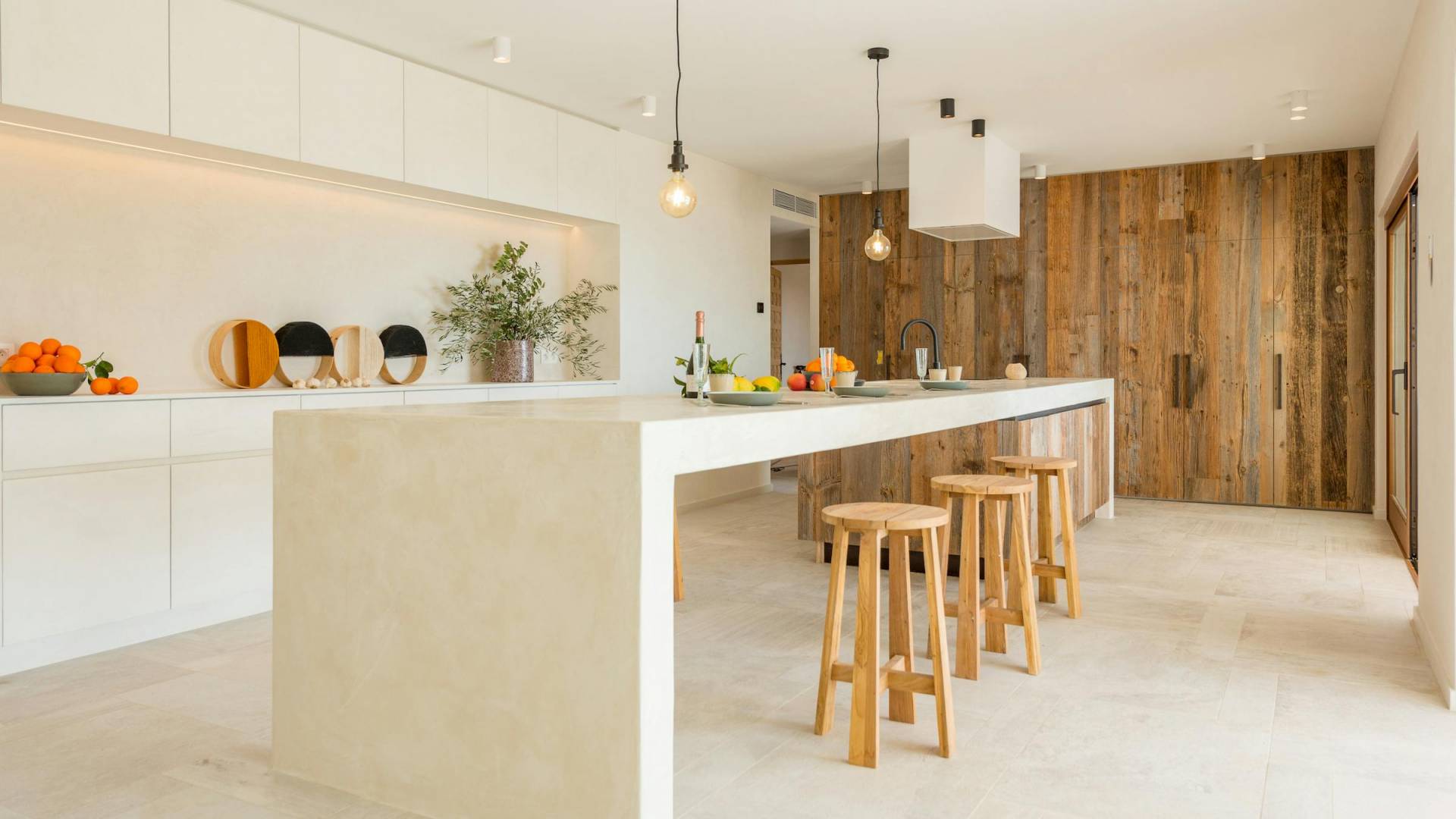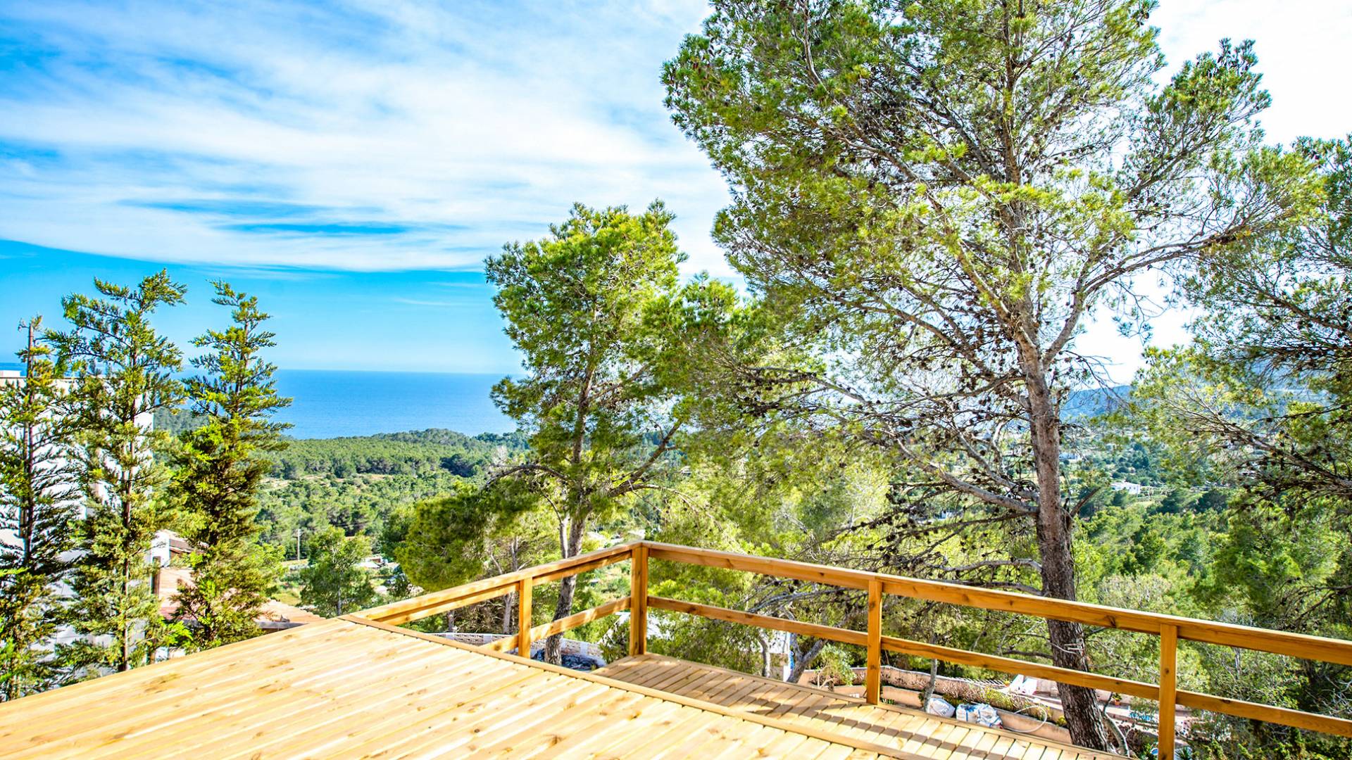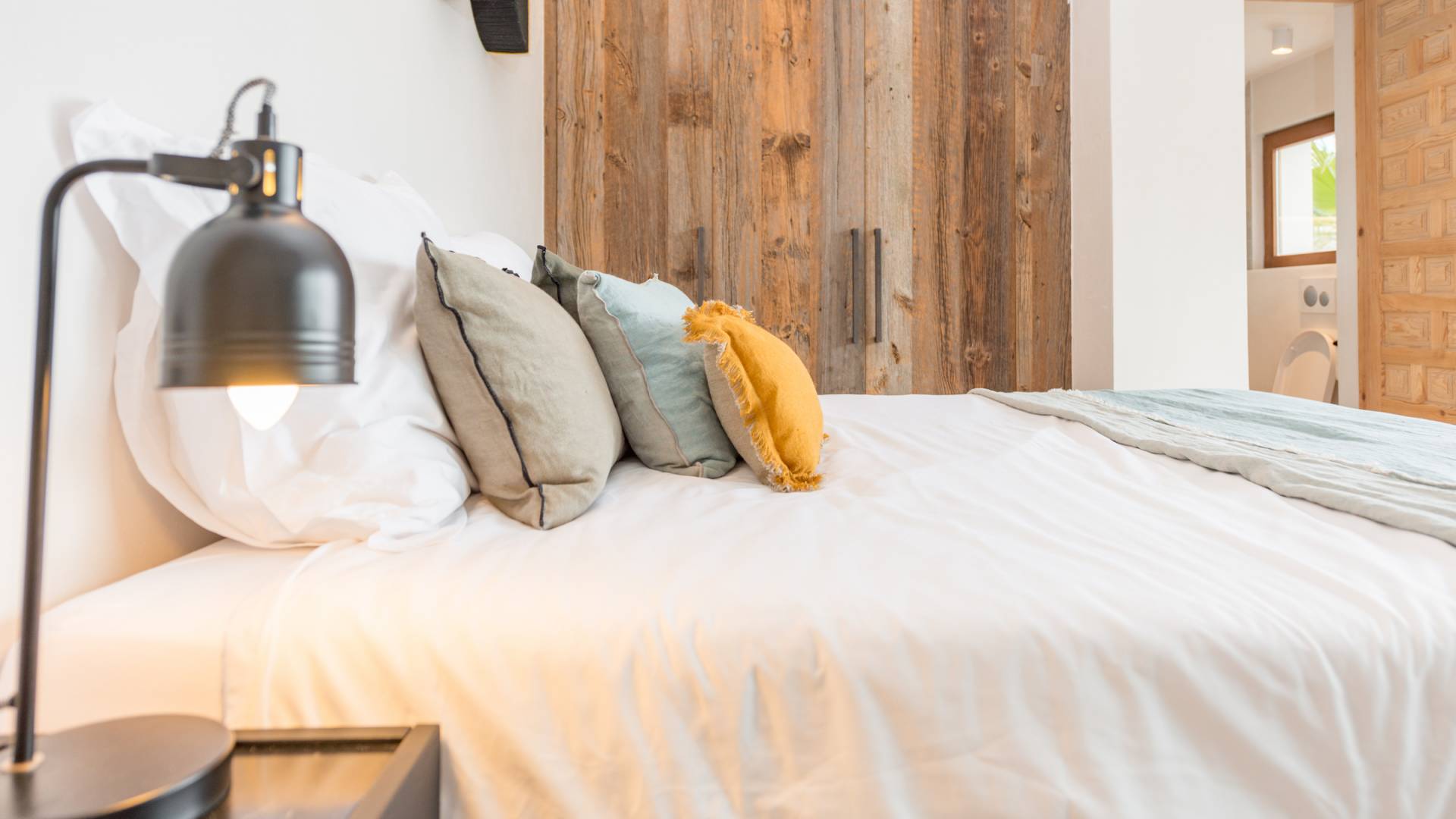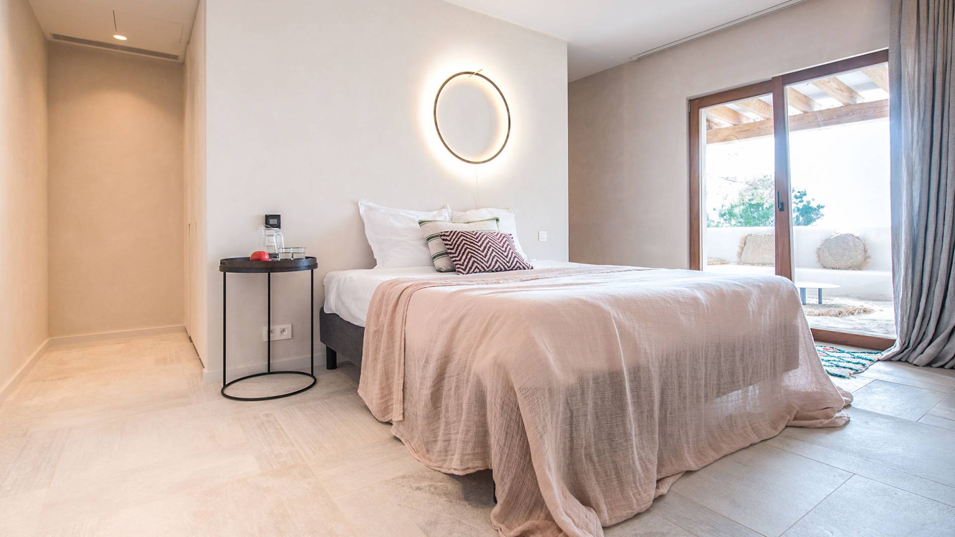 El tercer nivel se divide en 3 áreas, incluida una amplia terraza al aire libre con una generosa zona de descanso y hay una mesa grande que permite a todos los invitados disfrutar de un comedor adicional al aire libre mientras disfrutan de las vistas a través de los típicos arcos ibicencos. . La terraza fluye a la perfección hacia la amplia y moderna área de la cocina, que está totalmente equipada con todos los dispositivos para facilitar sus aventuras culinarias. Cuenta con una enorme isla de cocina y los magníficos armarios empotrados han sido hechos a mano con madera de granero canadiense de 200 años. Escondida se encuentra la sublime sala de estar con un gran televisor, una chimenea y una ventana Trompe l'oil con vista al valle. Además, el dormitorio principal se encuentra en este nivel.
