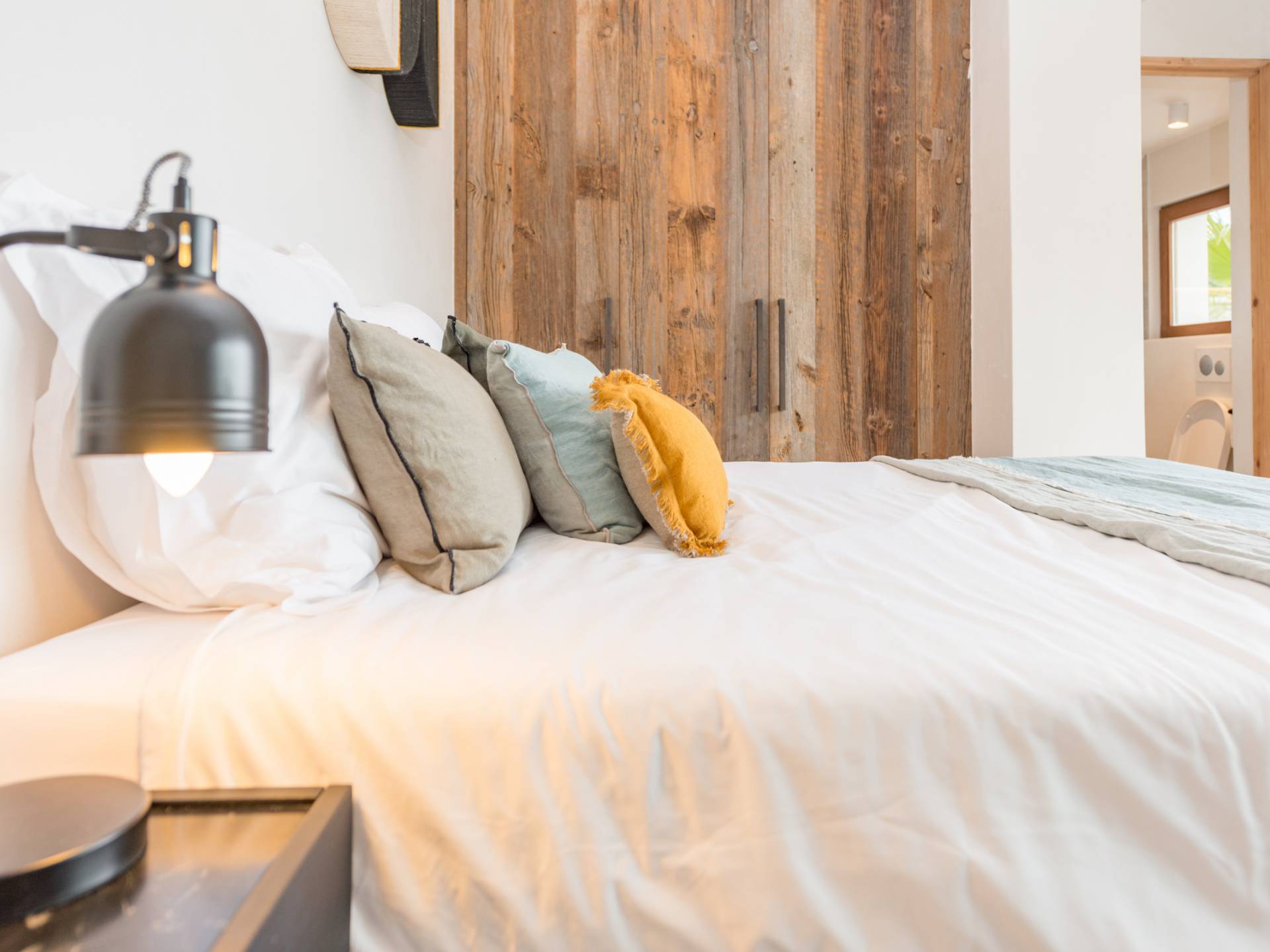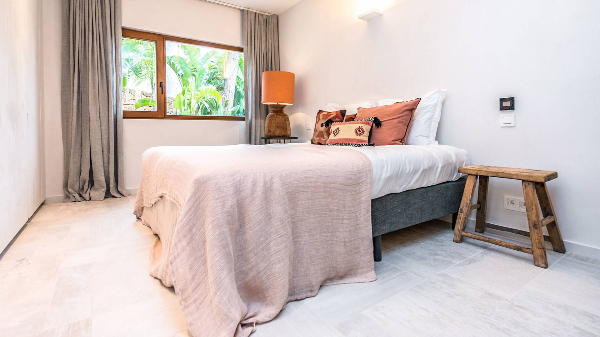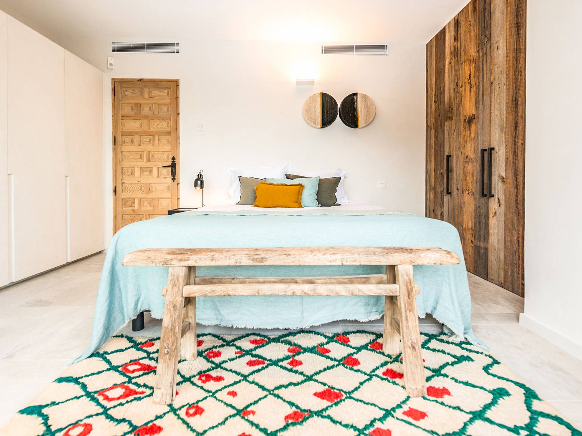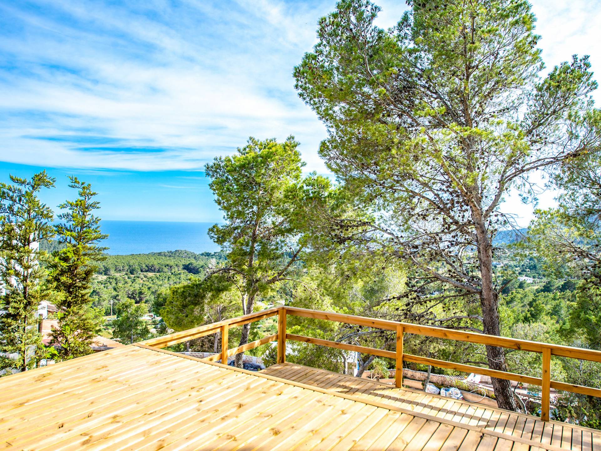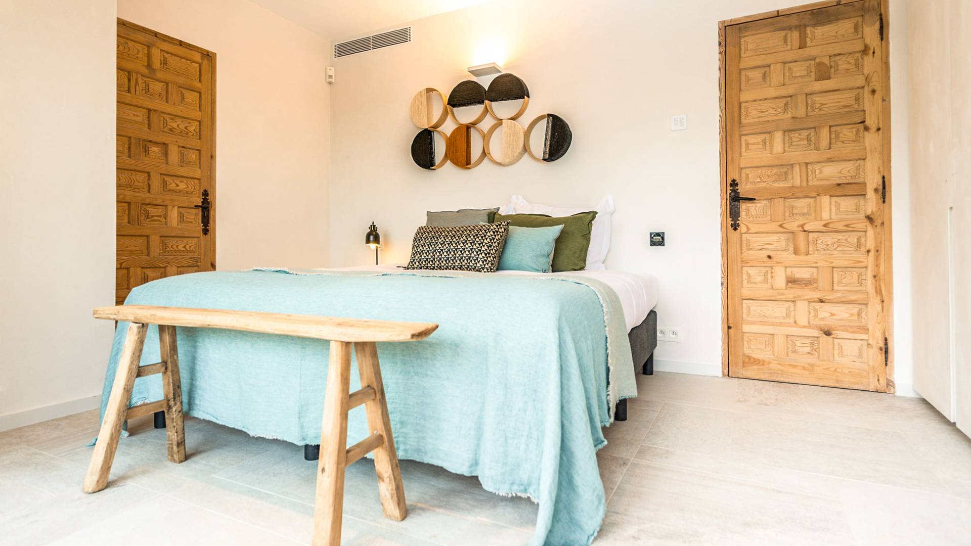 El tercer nivel se divide en 3 áreas, incluida una amplia terraza al aire libre con una generosa zona de descanso y hay una mesa grande que permite a todos los invitados disfrutar de un comedor adicional al aire libre mientras disfrutan de las vistas a través de los típicos arcos ibicencos. . La terraza fluye a la perfección hacia la amplia y moderna área de la cocina, que está totalmente equipada con todos los dispositivos para facilitar sus aventuras culinarias. Cuenta con una enorme isla de cocina y los magníficos armarios empotrados han sido hechos a mano con madera de granero canadiense de 200 años. Escondida se encuentra la sublime sala de estar con un gran televisor, una chimenea y una ventana Trompe l'oil con vista al valle. Además, el dormitorio principal se encuentra en este nivel.