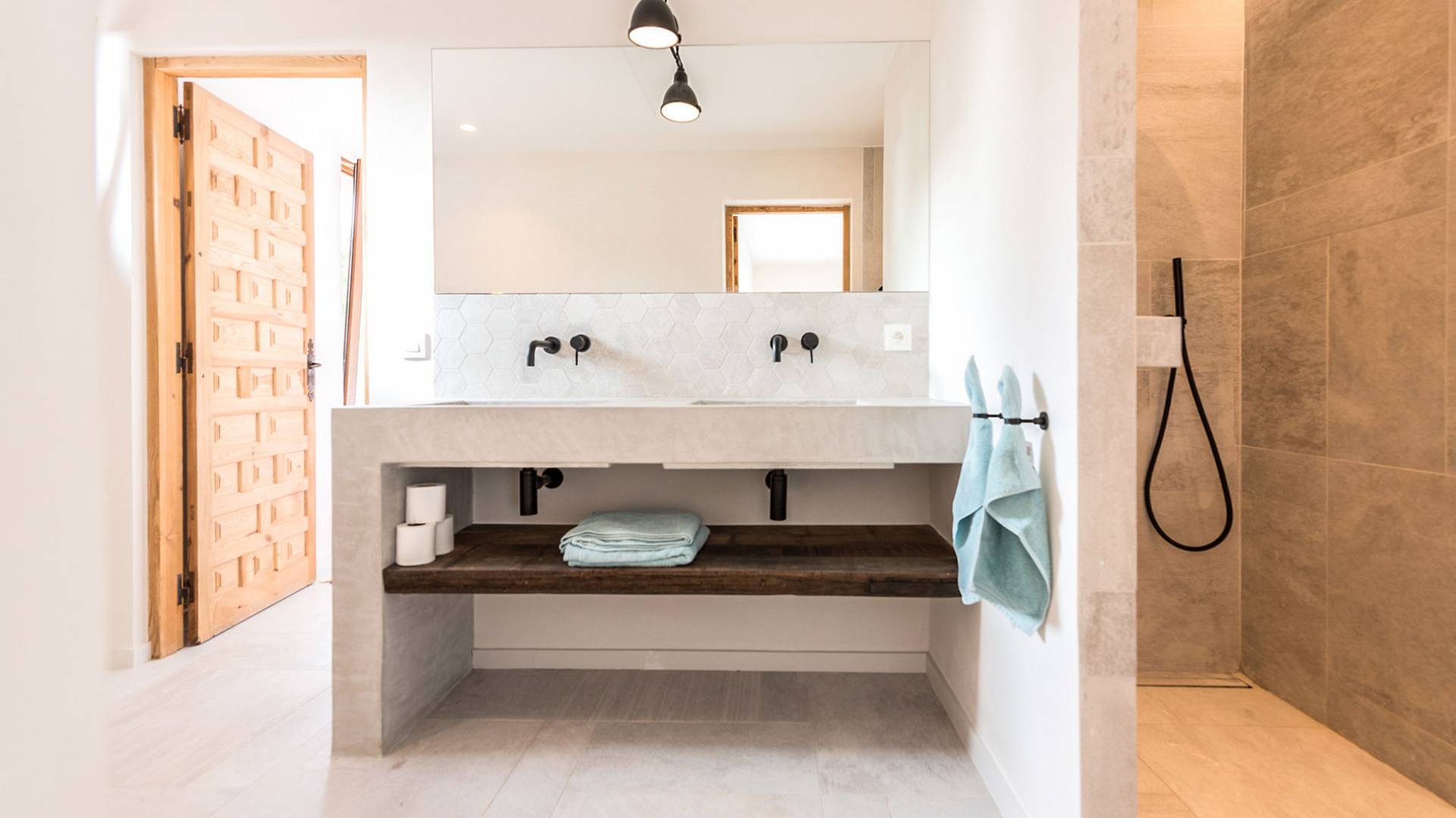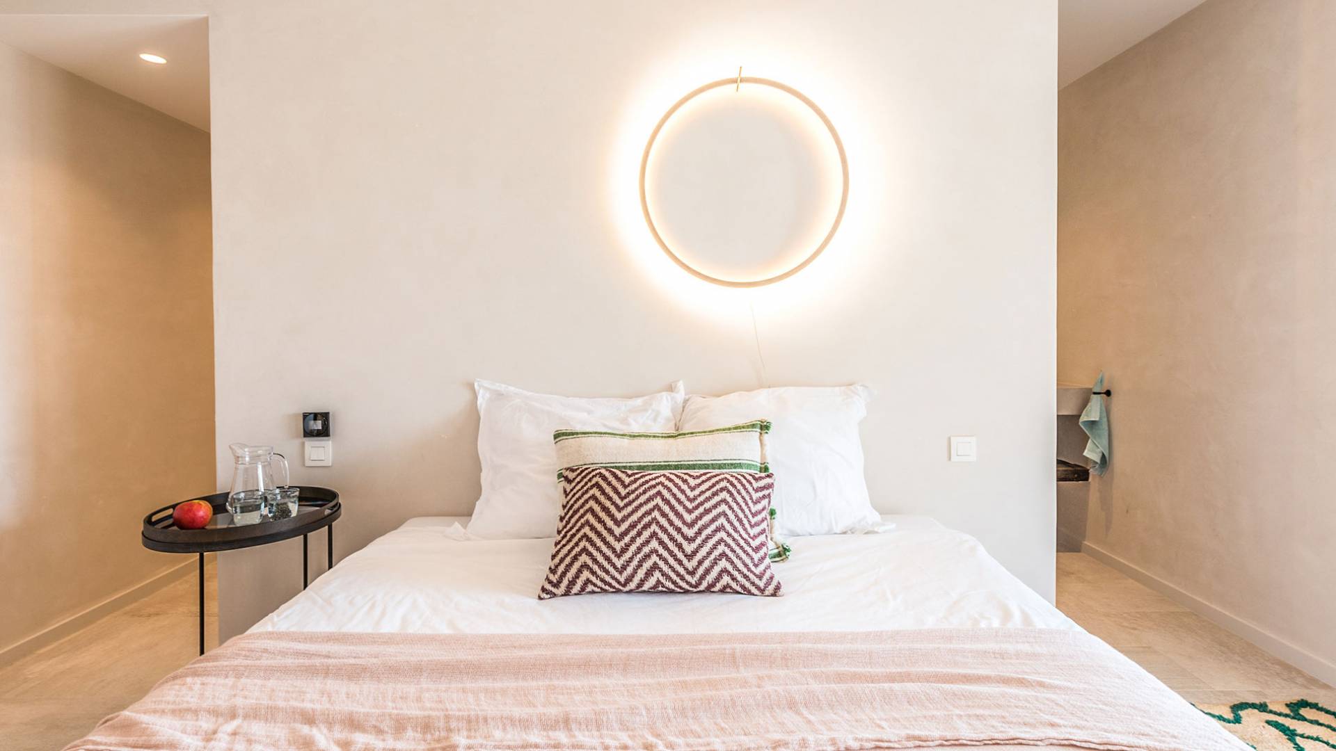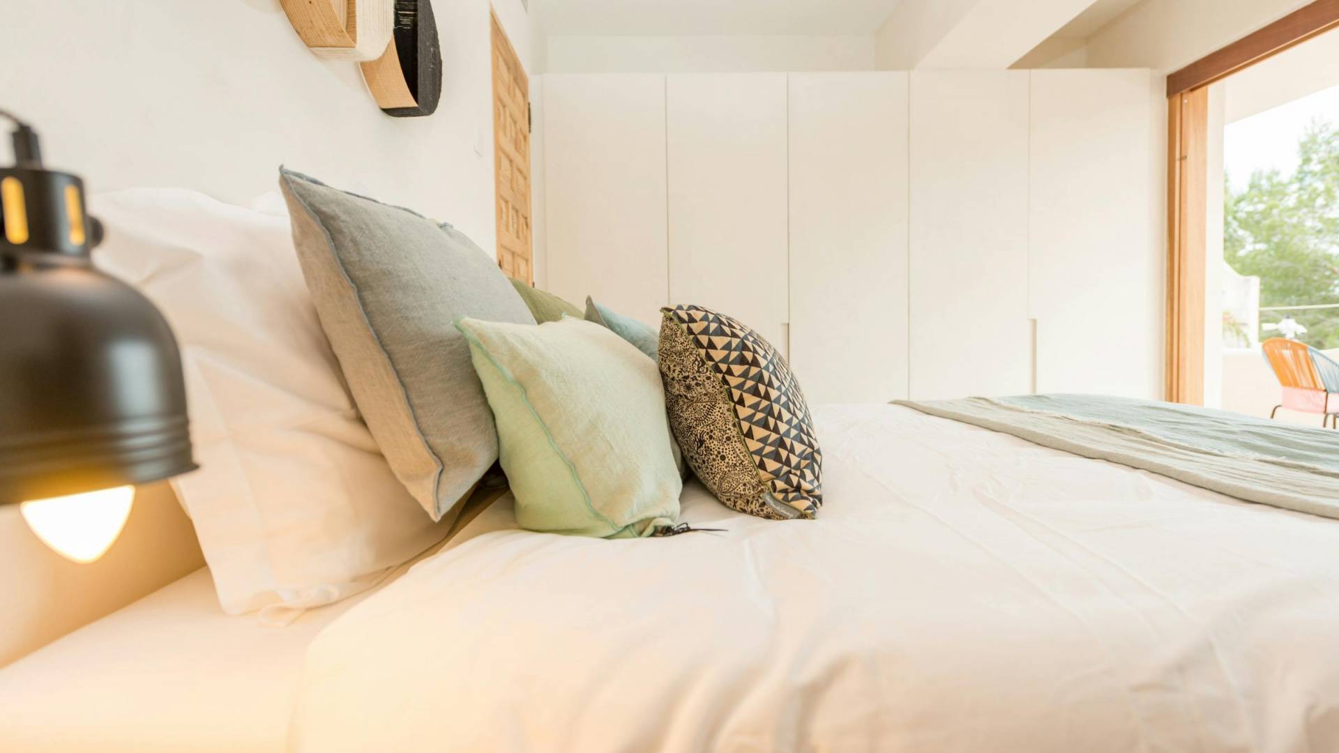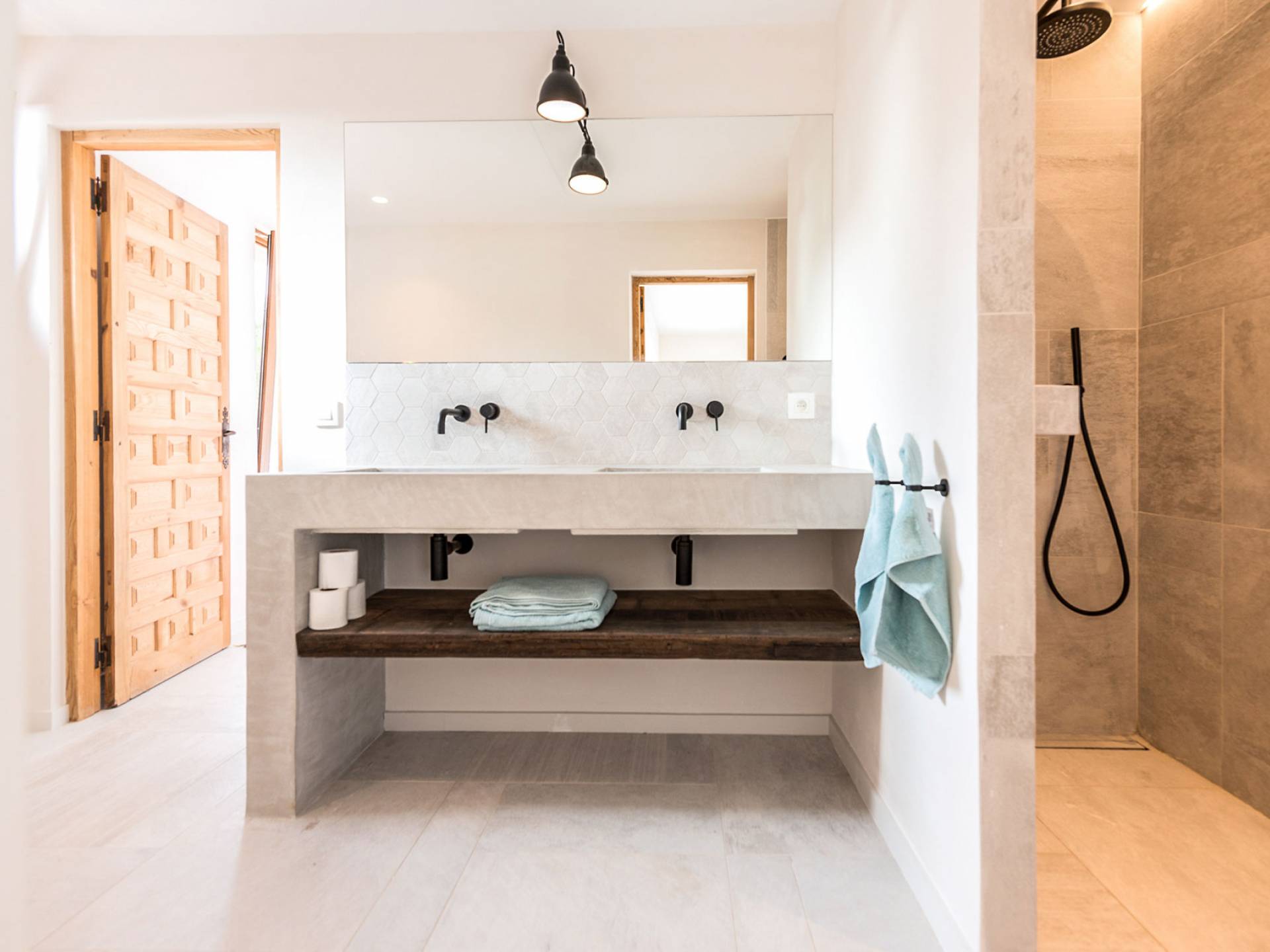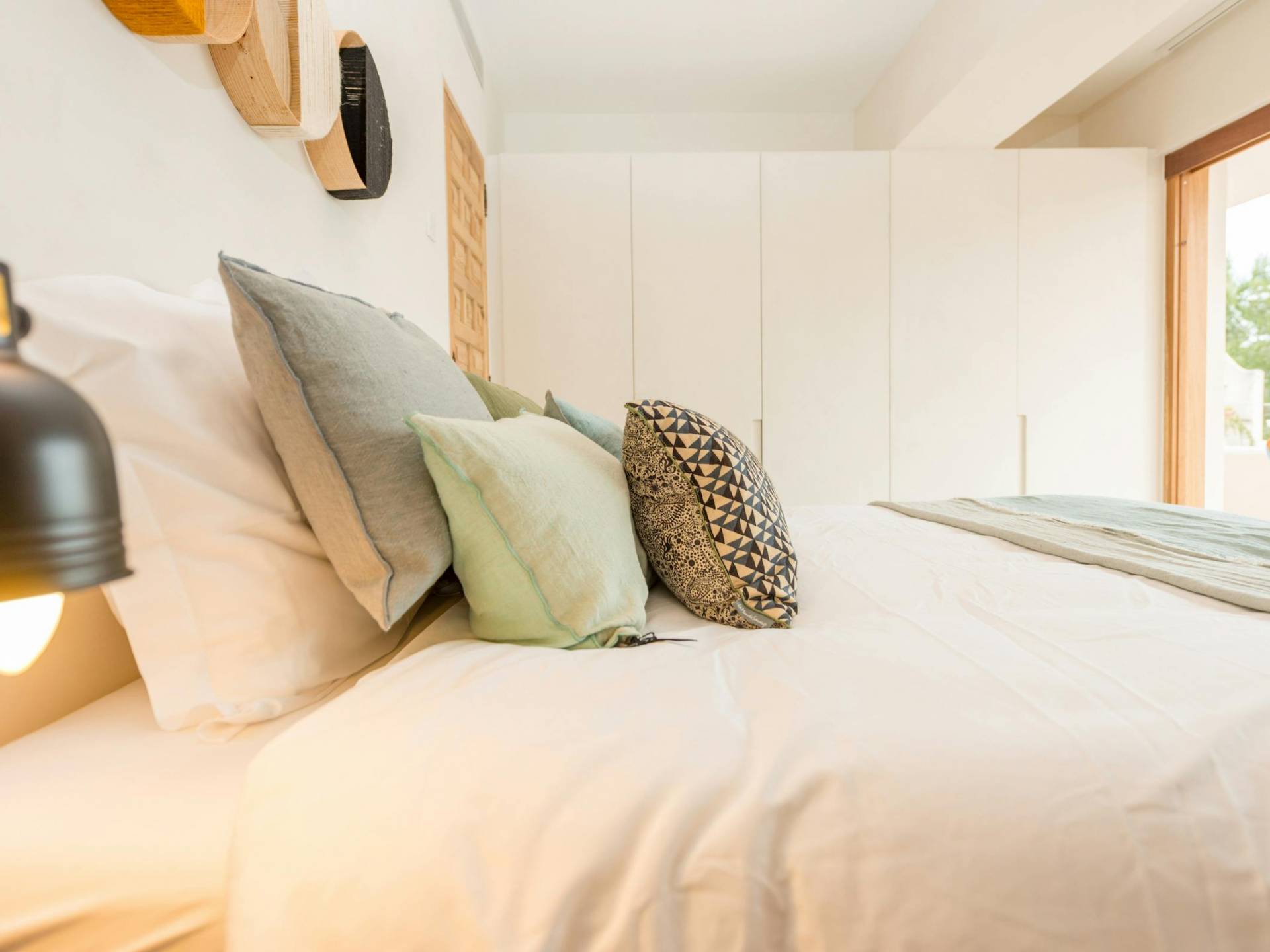 El tercer nivel se divide en 3 áreas, incluida una amplia terraza al aire libre con una generosa zona de descanso y hay una mesa grande que permite a todos los invitados disfrutar de un comedor adicional al aire libre mientras disfrutan de las vistas a través de los típicos arcos ibicencos. . La terraza fluye a la perfección hacia la amplia y moderna área de la cocina, que está totalmente equipada con todos los dispositivos para facilitar sus aventuras culinarias. Cuenta con una enorme isla de cocina y los magníficos armarios empotrados han sido hechos a mano con madera de granero canadiense de 200 años. Escondida se encuentra la sublime sala de estar con un gran televisor, una chimenea y una ventana Trompe l'oil con vista al valle. Además, el dormitorio principal se encuentra en este nivel.