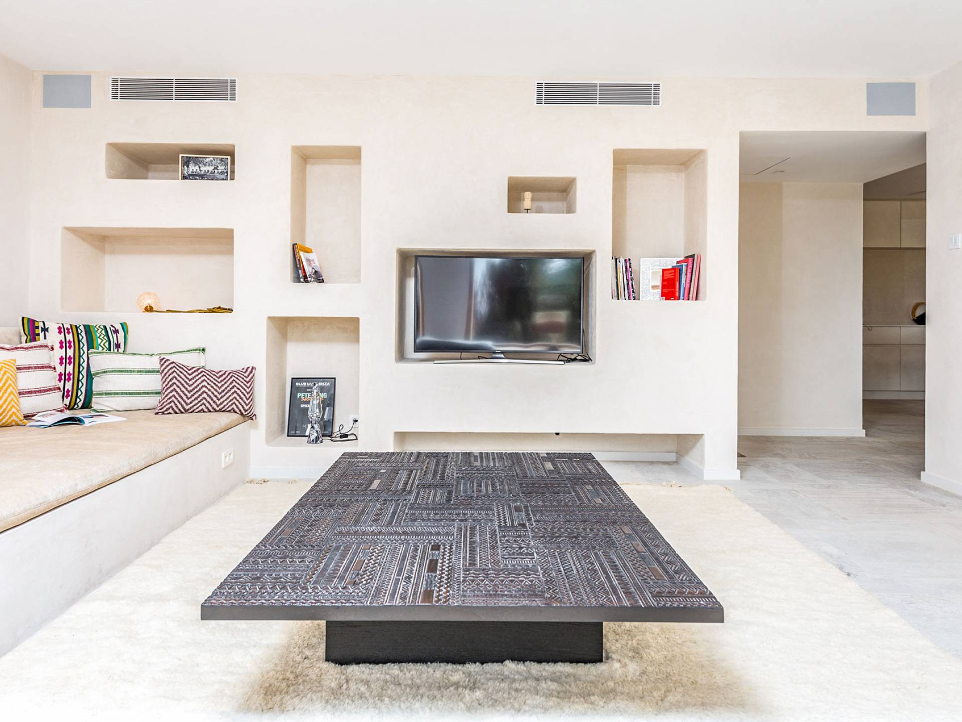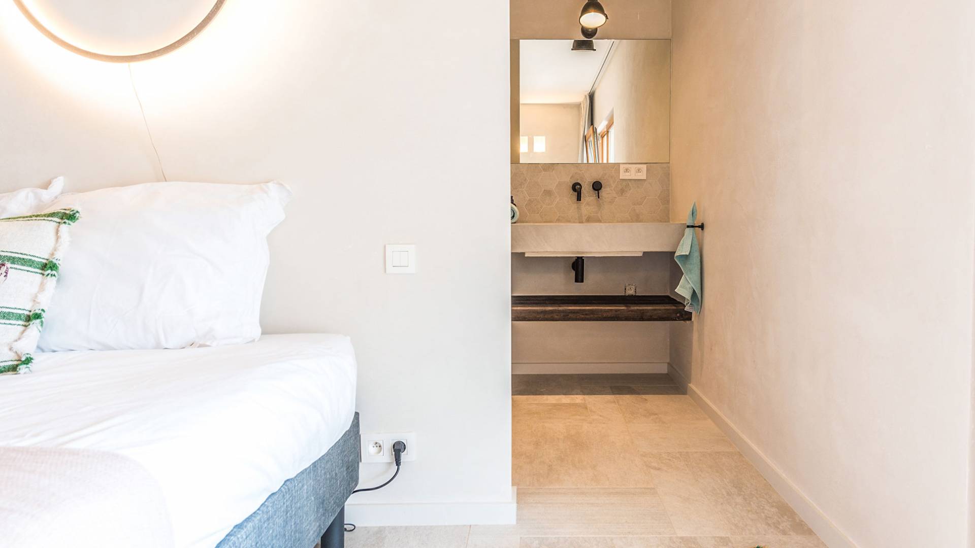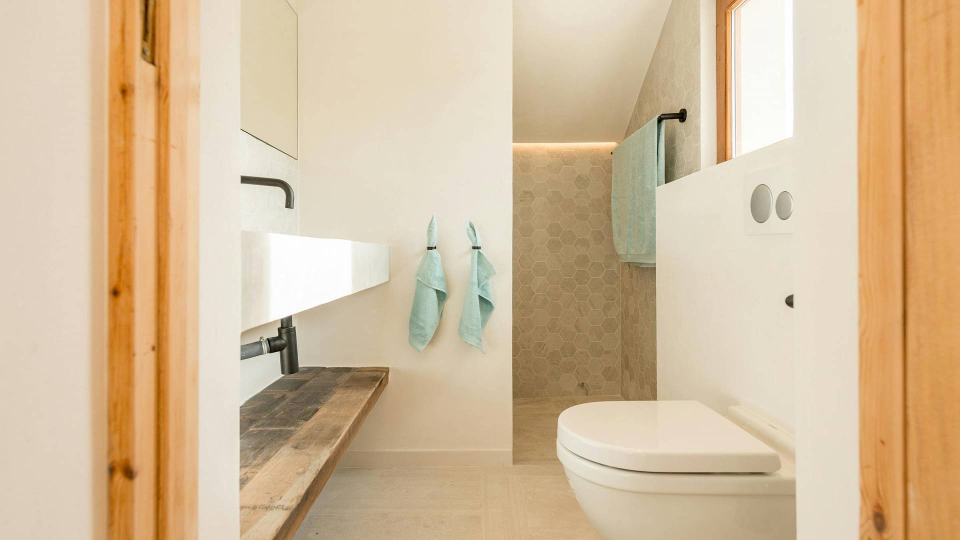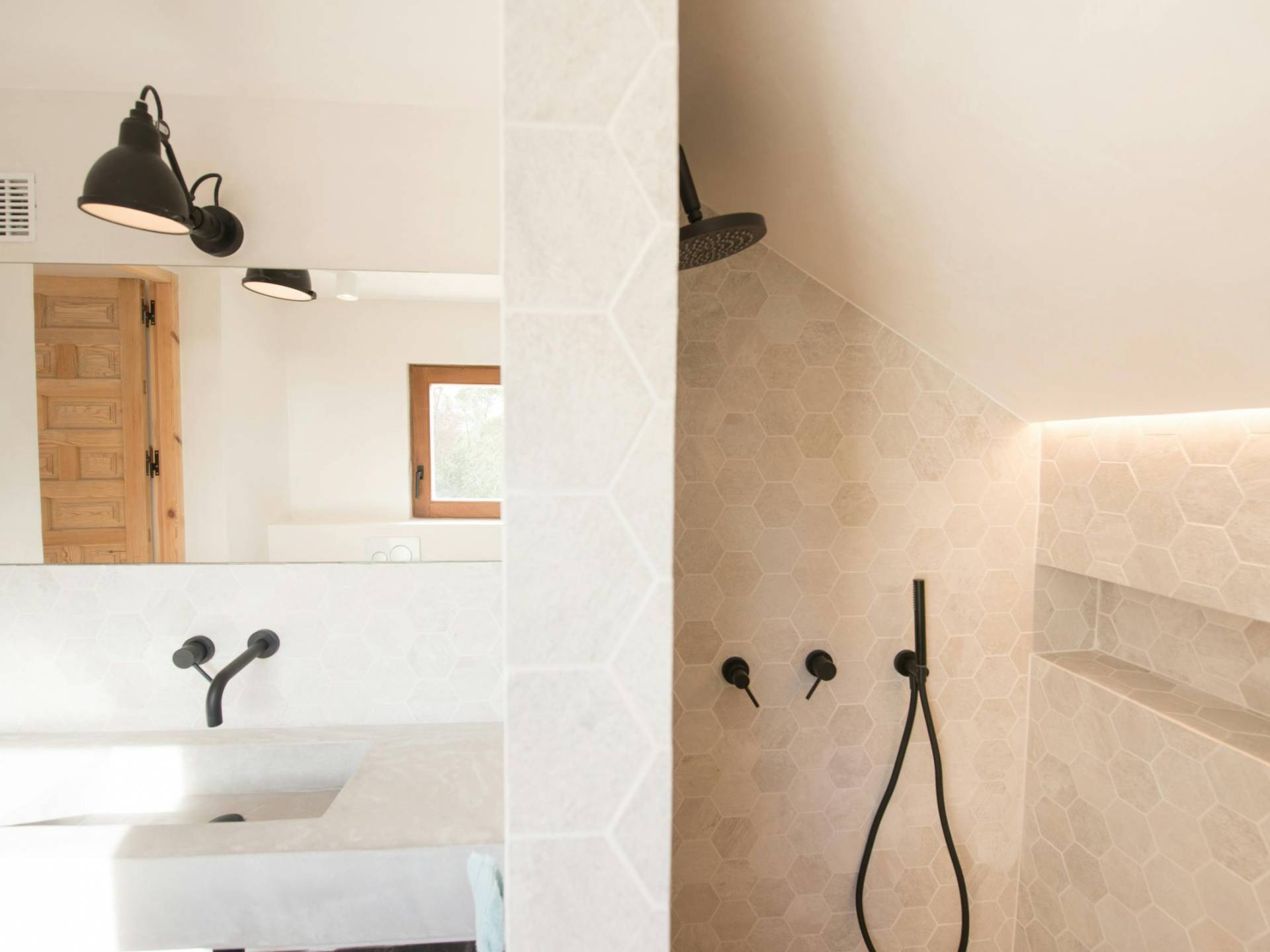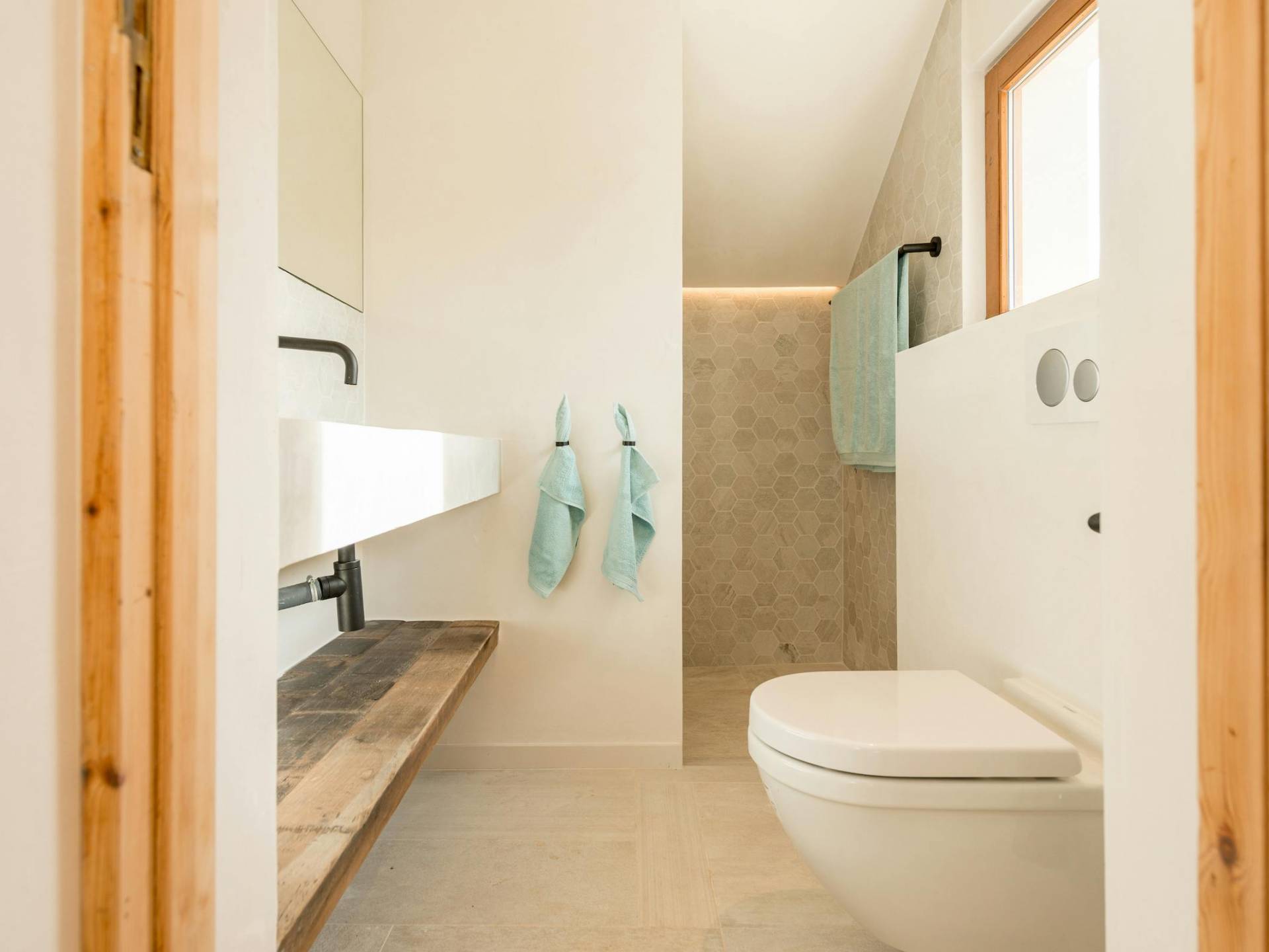 El tercer nivel se divide en 3 áreas, incluida una amplia terraza al aire libre con una generosa zona de descanso y hay una mesa grande que permite a todos los invitados disfrutar de un comedor adicional al aire libre mientras disfrutan de las vistas a través de los típicos arcos ibicencos. . La terraza fluye a la perfección hacia la amplia y moderna área de la cocina, que está totalmente equipada con todos los dispositivos para facilitar sus aventuras culinarias. Cuenta con una enorme isla de cocina y los magníficos armarios empotrados han sido hechos a mano con madera de granero canadiense de 200 años. Escondida se encuentra la sublime sala de estar con un gran televisor, una chimenea y una ventana Trompe l'oil con vista al valle. Además, el dormitorio principal se encuentra en este nivel.