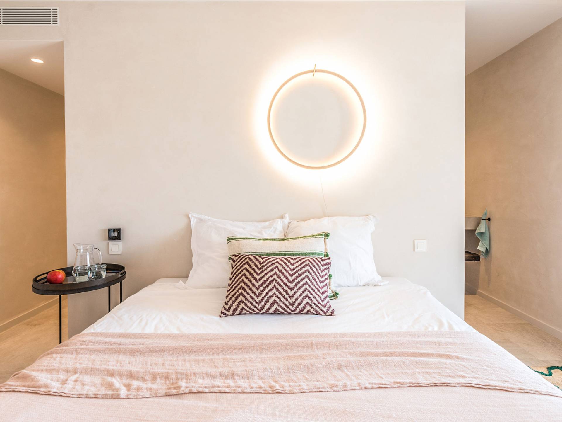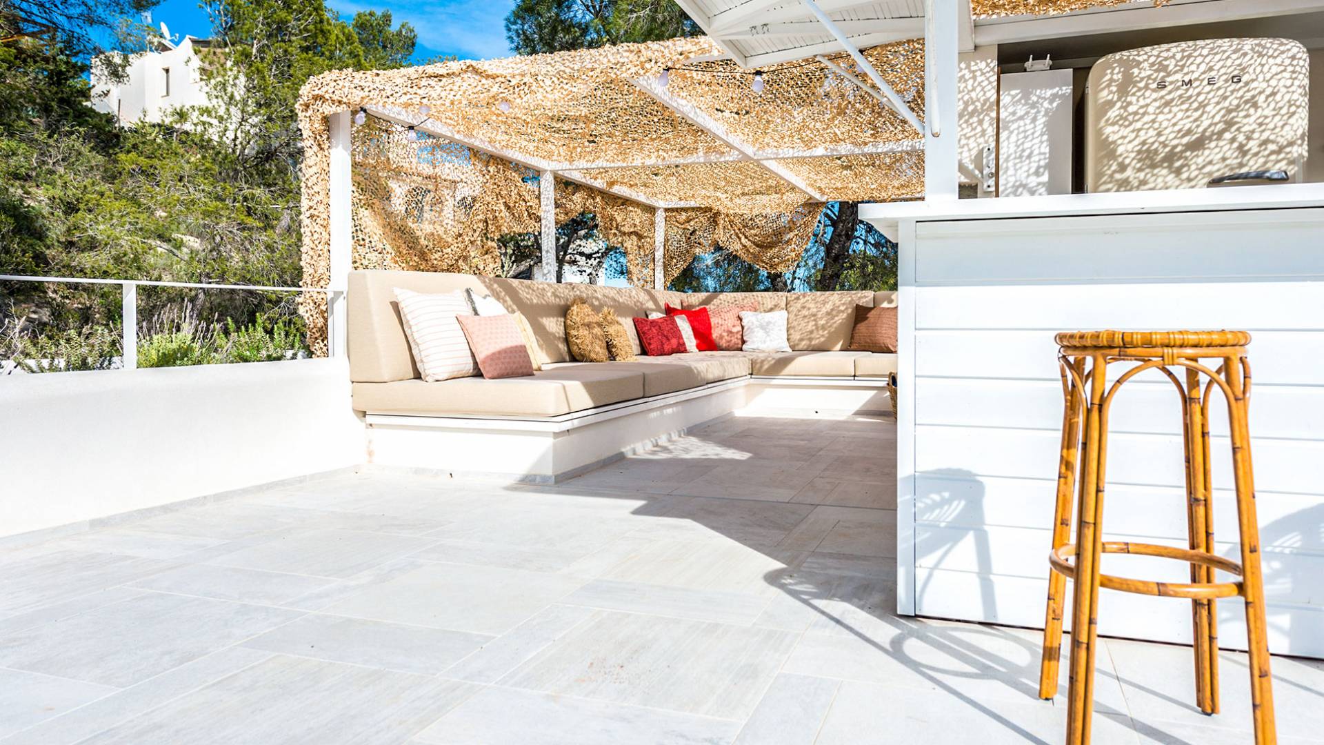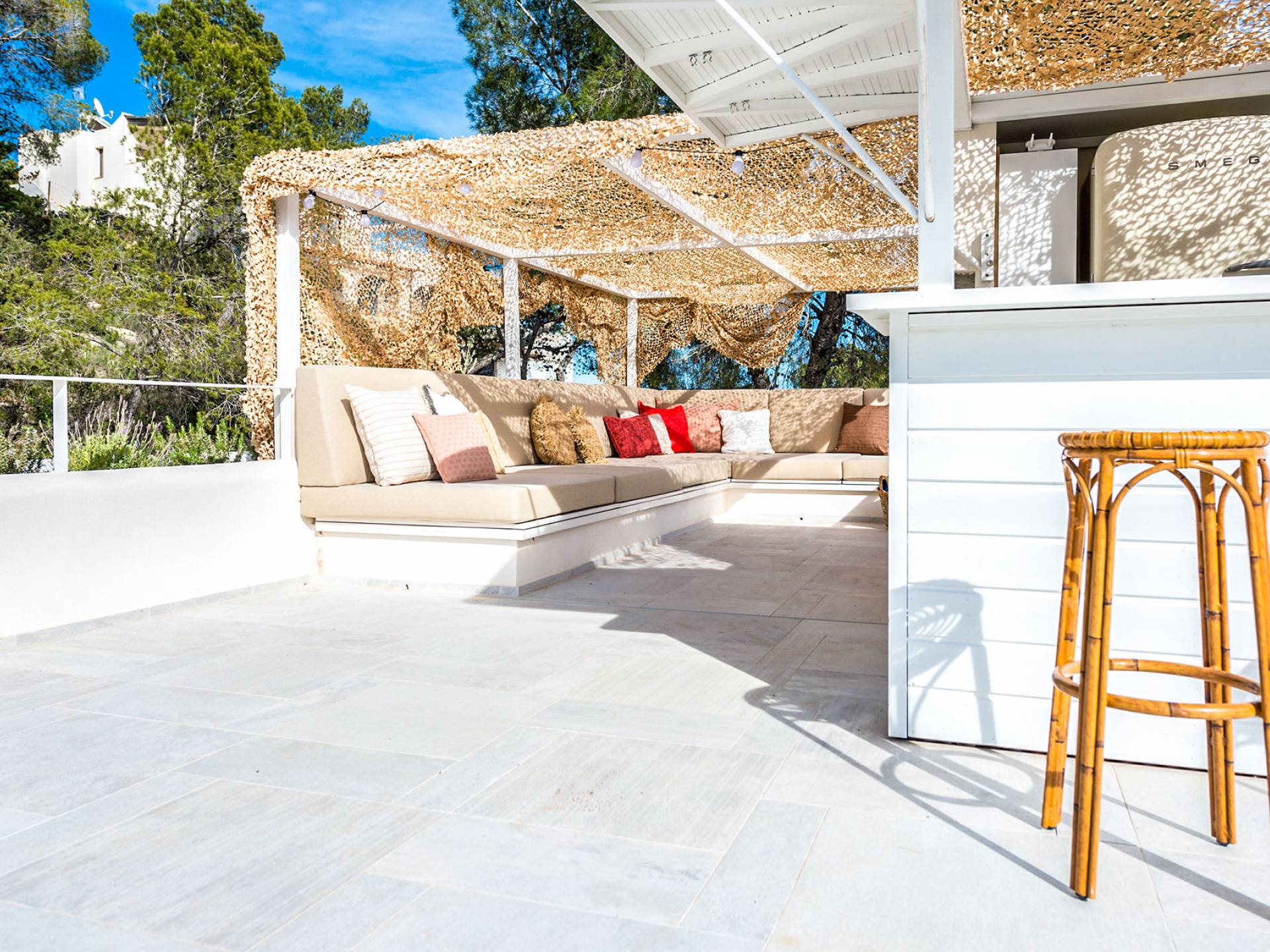 Las escaleras exteriores ubicadas en la parte trasera del edificio lo guían al 4to nivel donde encontrará el bar en la azotea estilo Chiringuito que crea esa sensación inigualable de club de playa de Ibiza. Es el lugar ideal para relajarse con amigos y familiares junto a la piscina, preparar deliciosas comidas en la cocina al aire libre y barbacoa o simplemente relajarse con un libro en el rincón chill-out o en las tumbonas. ¡Este nivel también cuenta con un comedor al aire libre, donde puedes disfrutar de una cena inolvidable frente a un divino atardecer mediterráneo como telón de fondo!