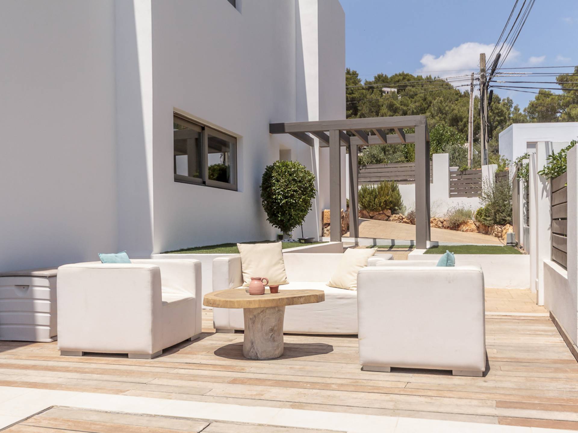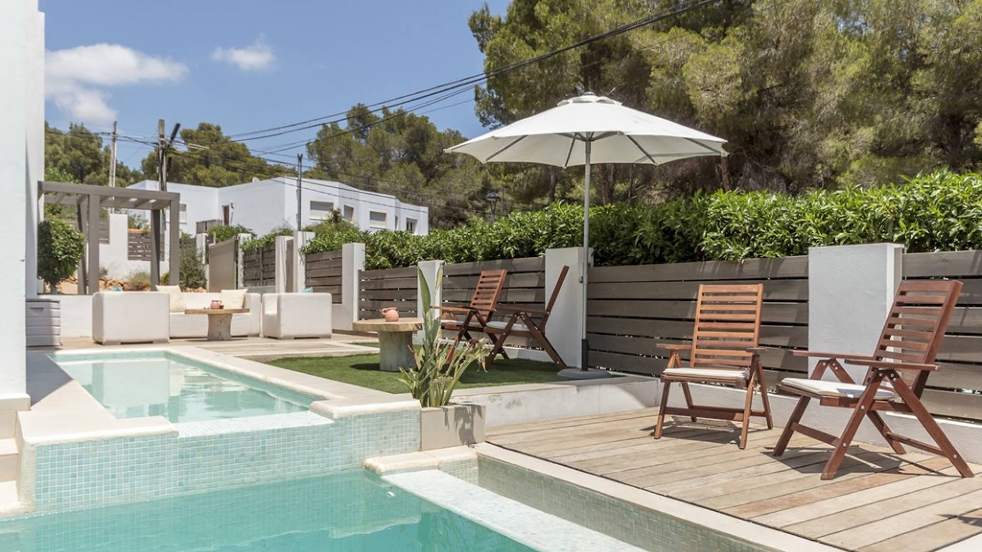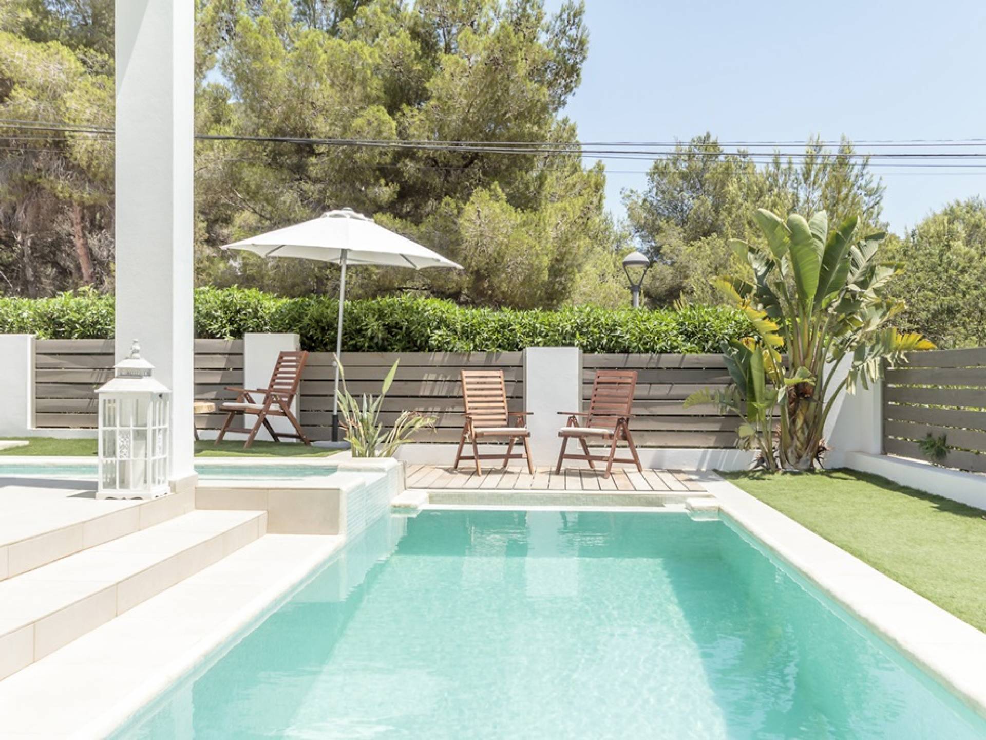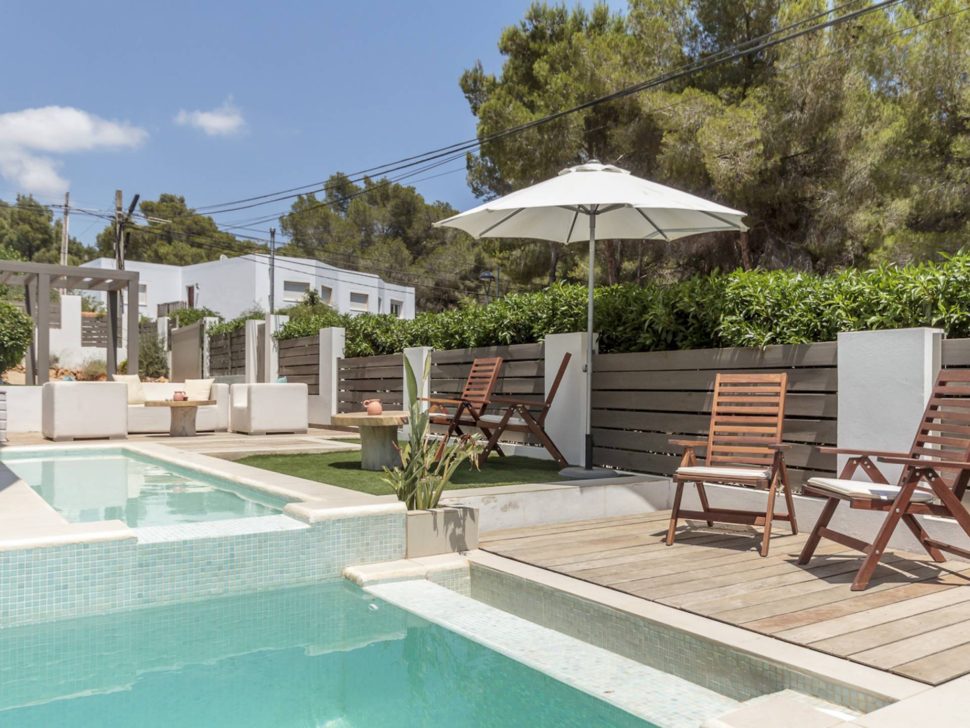 El exterior de Can Koby Villa Ibiza tiene varias terrazas con hamacas y sillas, cuenta con una gran mesa de comedor exterior para 8 personas y hay una barbacoa. Hay una fabulosa piscina infinita en forma de L que consta de dos partes; una parte poco profunda (ideal para niños pequeños) y una parte más profunda. El acceso a la casa es a través de un portón con intercomunicador o por la puerta del garaje eléctrica, también hay espacio para estacionar un coche en la propiedad. La casa está construida en una parcela de esquina y por lo tanto solo tiene vecinos por un lado, además tiene la ventaja añadida de estar orientada al sur, por lo que las terrazas y la piscina tienen sol todo el día.