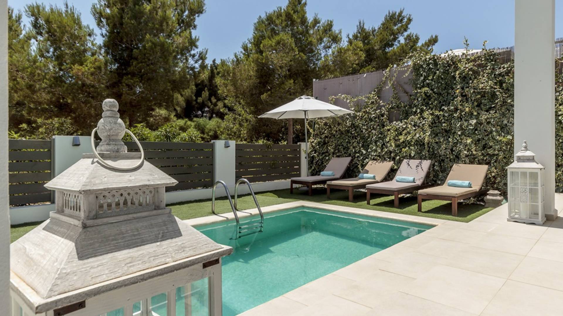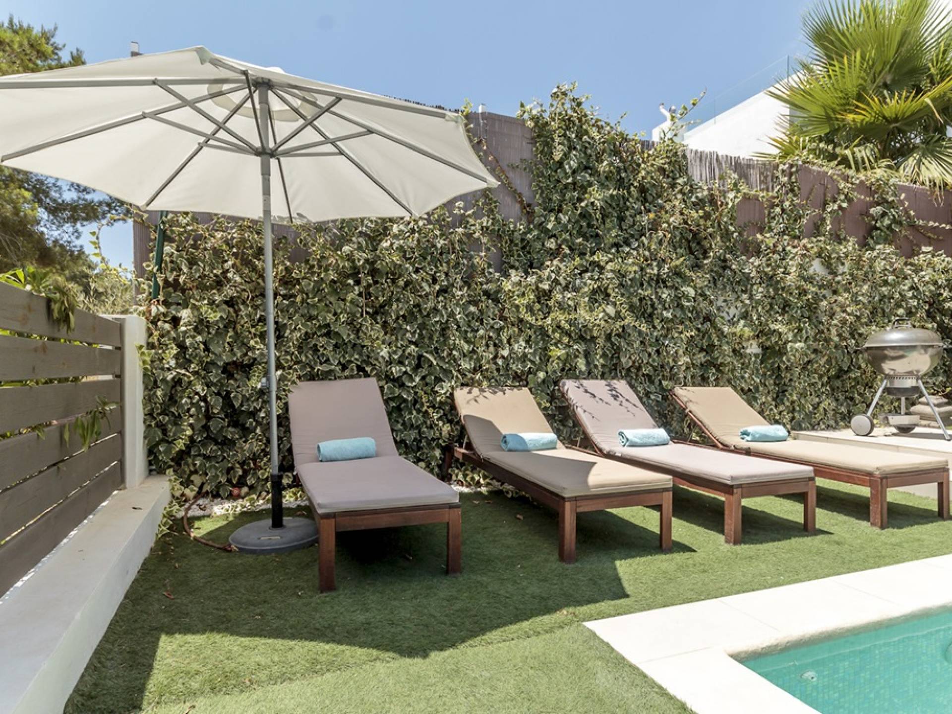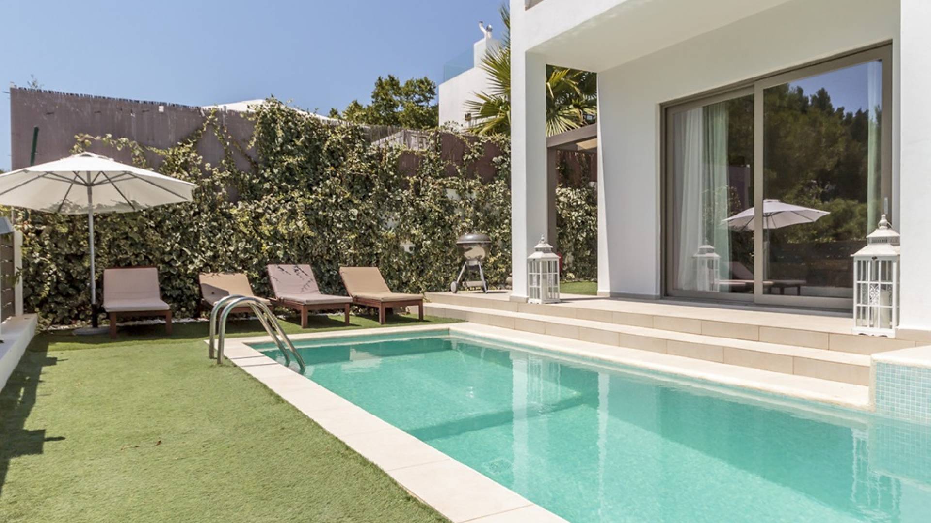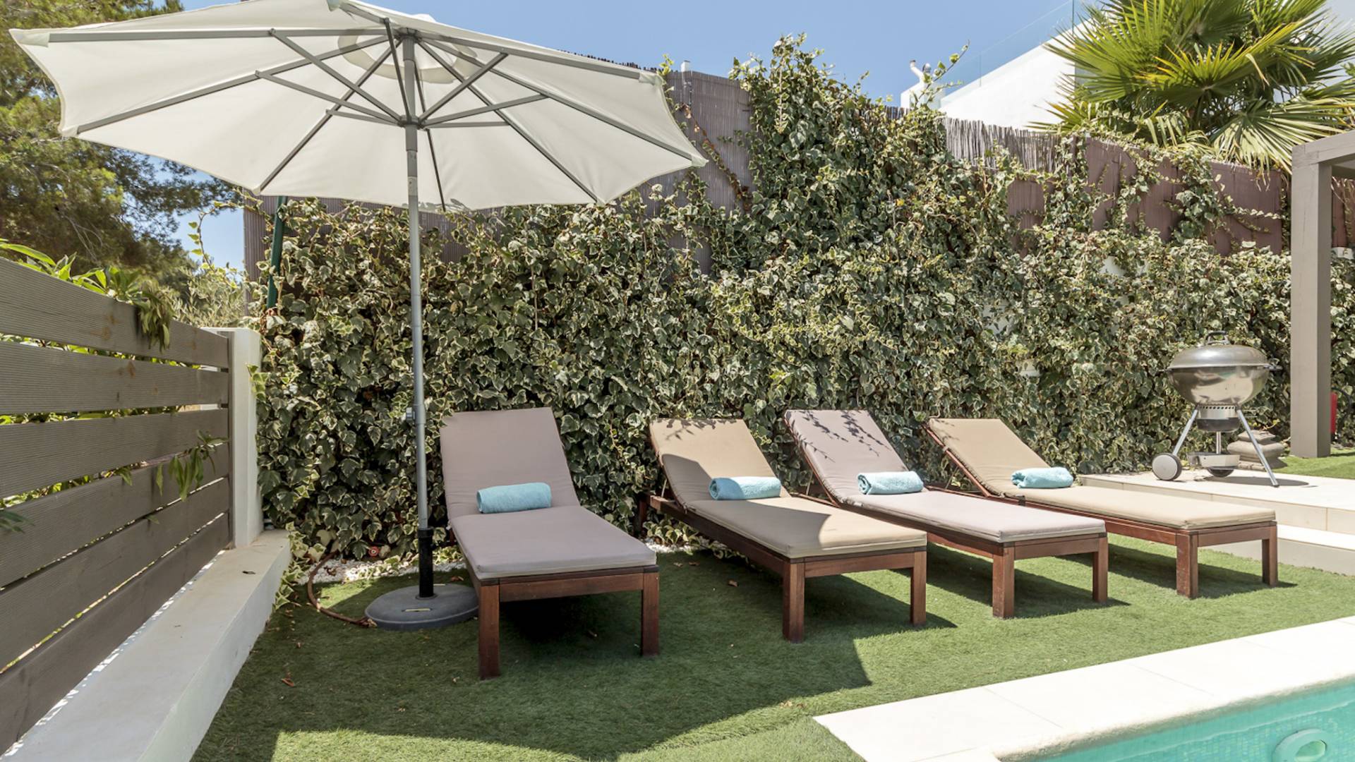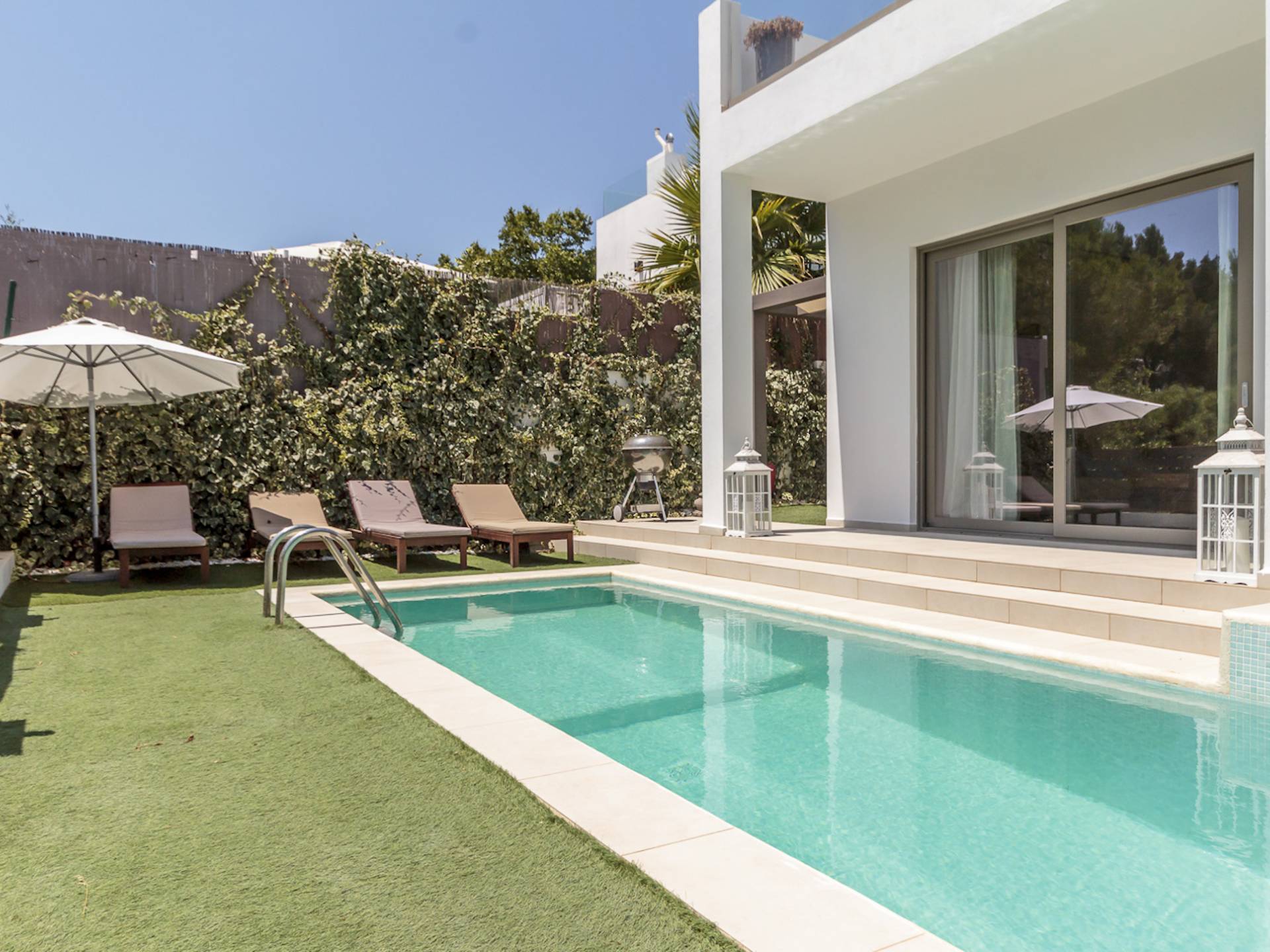 El exterior de Can Koby Villa Ibiza tiene varias terrazas con hamacas y sillas, cuenta con una gran mesa de comedor exterior para 8 personas y hay una barbacoa. Hay una fabulosa piscina infinita en forma de L que consta de dos partes; una parte poco profunda (ideal para niños pequeños) y una parte más profunda. El acceso a la casa es a través de un portón con intercomunicador o por la puerta del garaje eléctrica, también hay espacio para estacionar un coche en la propiedad. La casa está construida en una parcela de esquina y por lo tanto solo tiene vecinos por un lado, además tiene la ventaja añadida de estar orientada al sur, por lo que las terrazas y la piscina tienen sol todo el día.