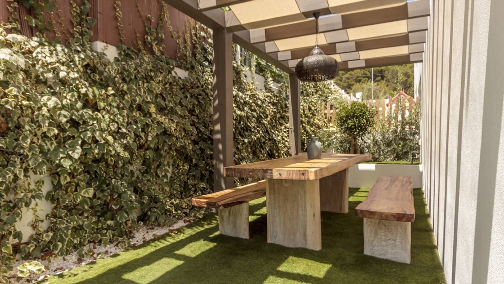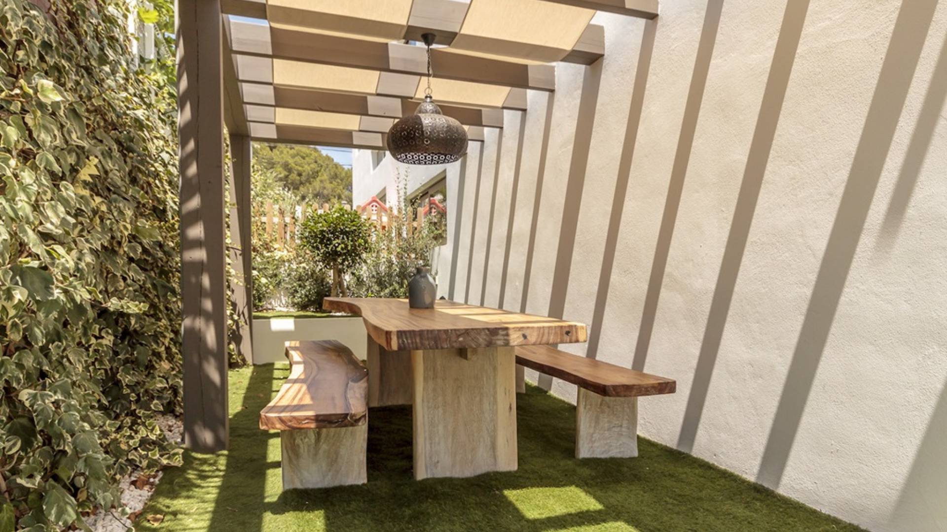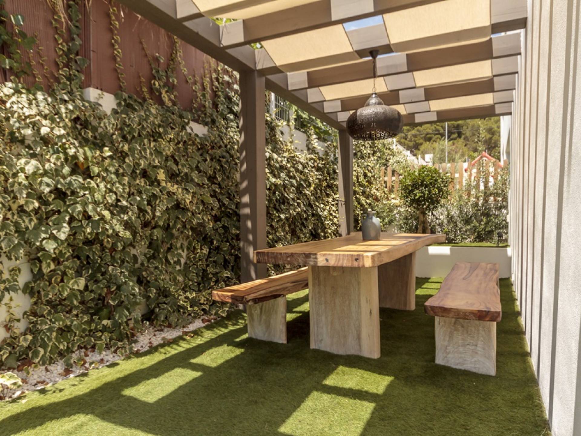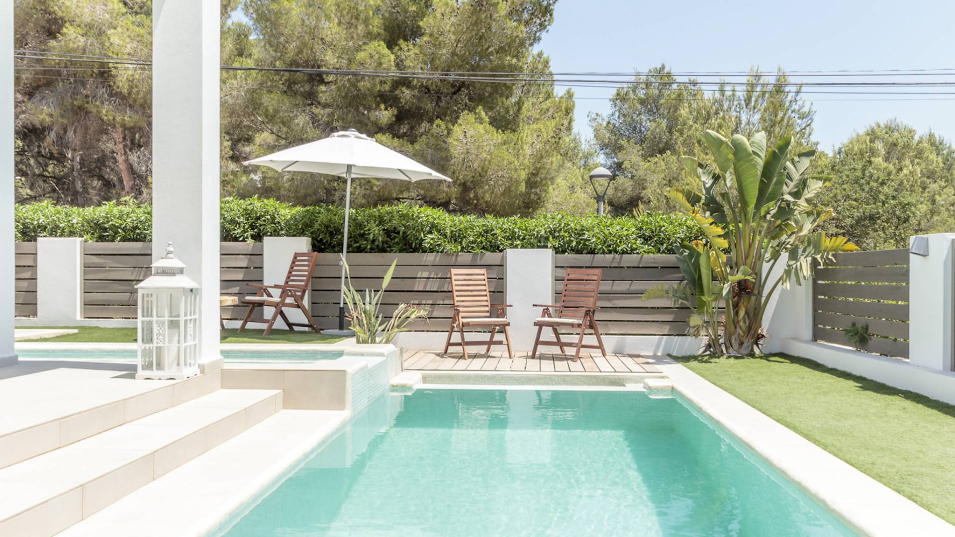 El exterior de Can Koby Villa Ibiza tiene varias terrazas con hamacas y sillas, cuenta con una gran mesa de comedor exterior para 8 personas y hay una barbacoa. Hay una fabulosa piscina infinita en forma de L que consta de dos partes; una parte poco profunda (ideal para niños pequeños) y una parte más profunda. El acceso a la casa es a través de un portón con intercomunicador o por la puerta del garaje eléctrica, también hay espacio para estacionar un coche en la propiedad. La casa está construida en una parcela de esquina y por lo tanto solo tiene vecinos por un lado, además tiene la ventaja añadida de estar orientada al sur, por lo que las terrazas y la piscina tienen sol todo el día.