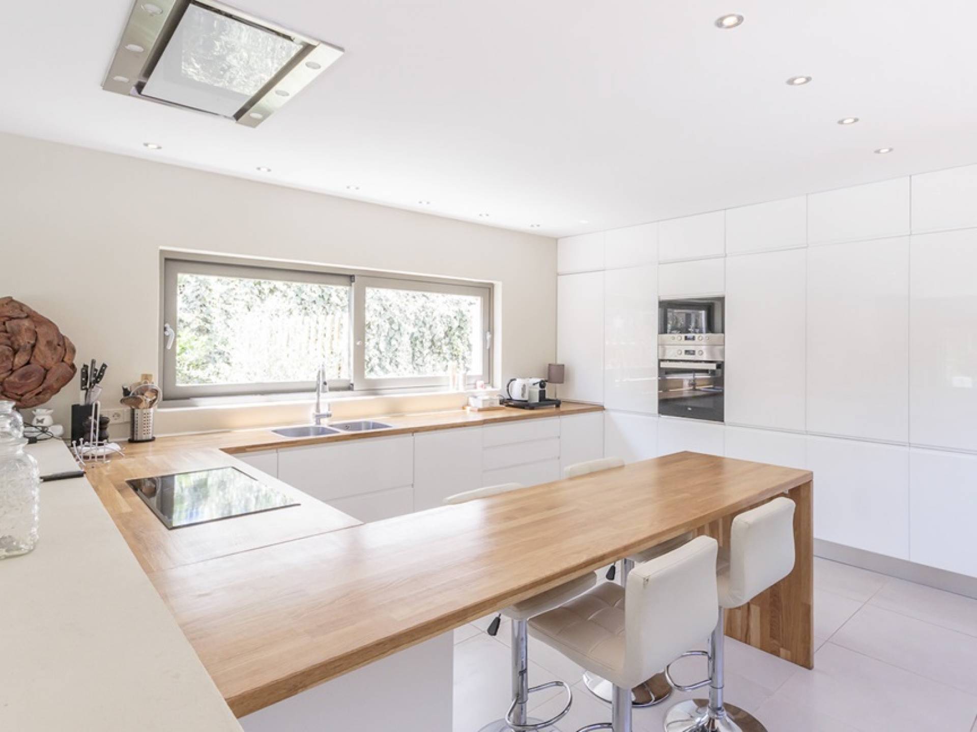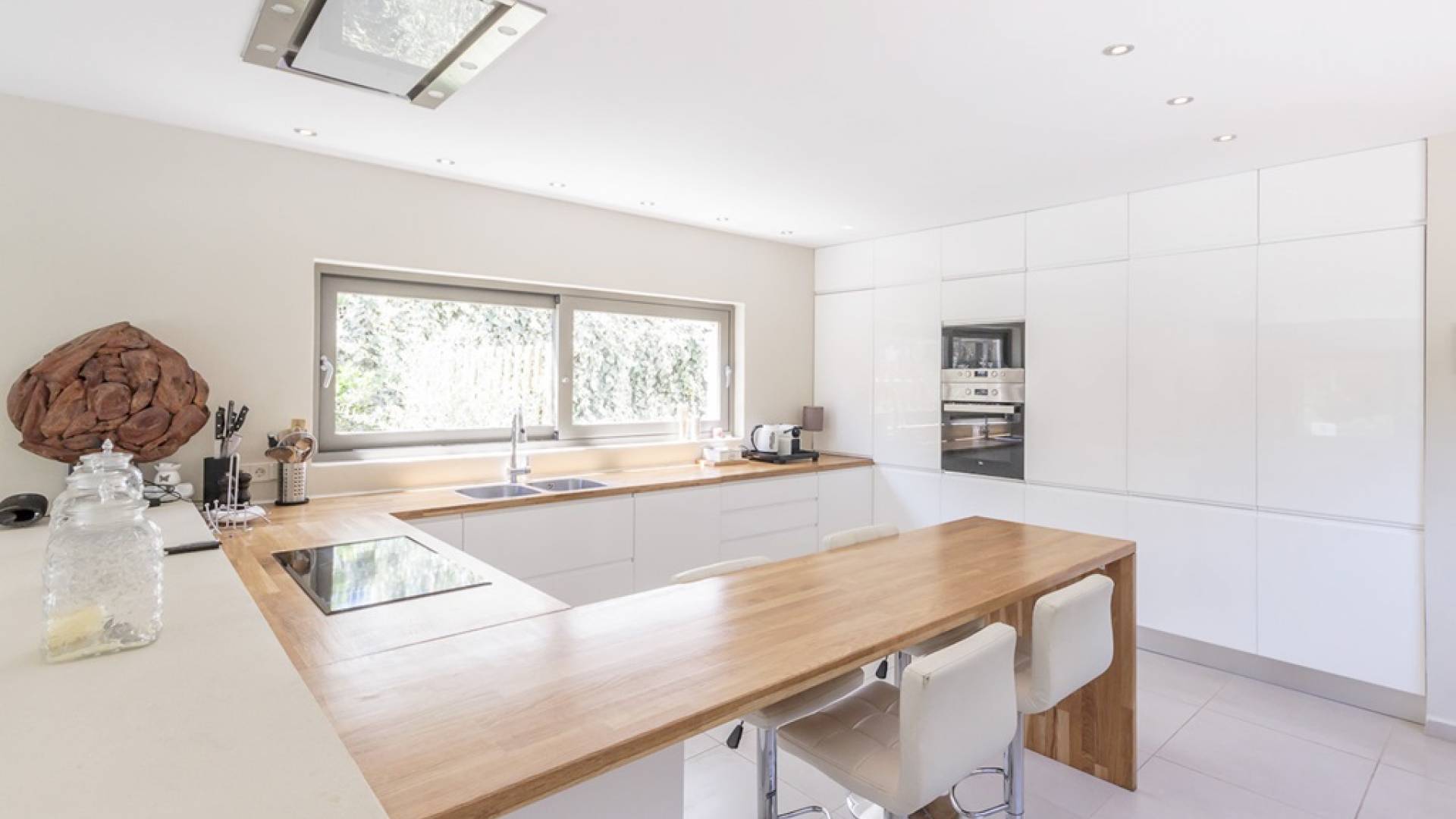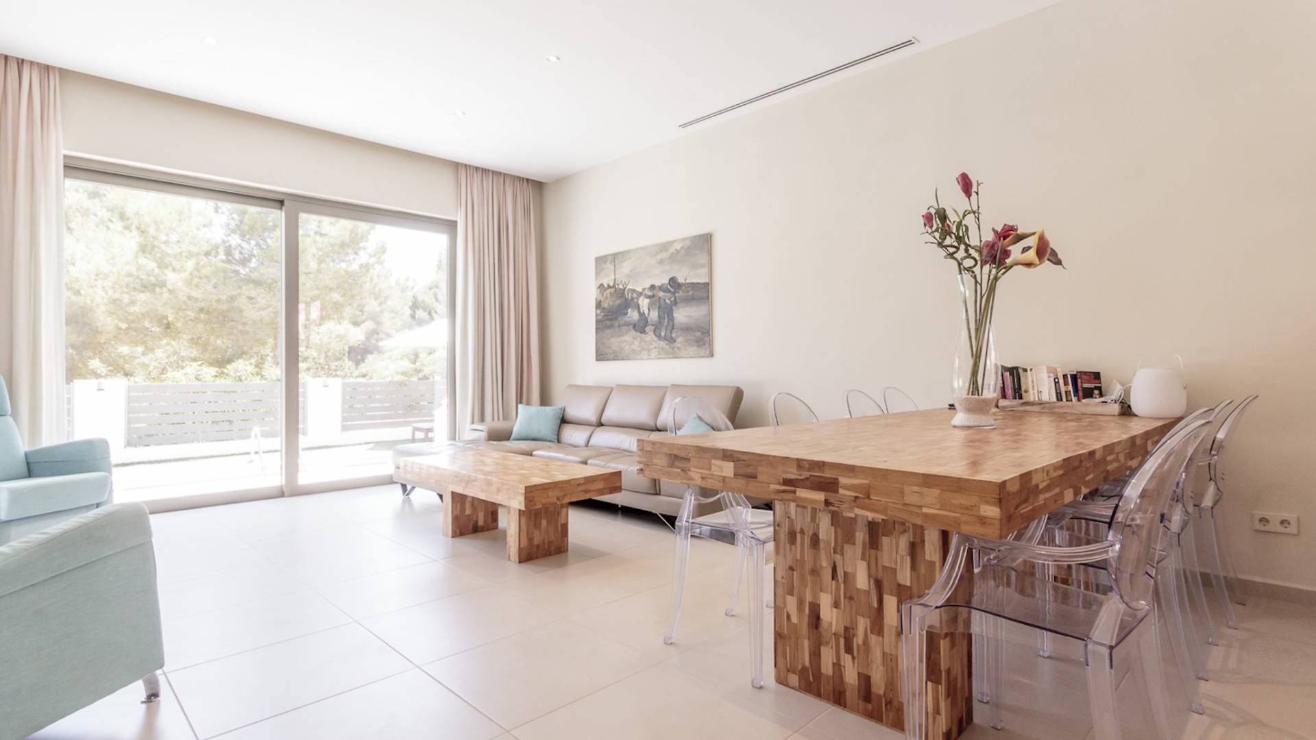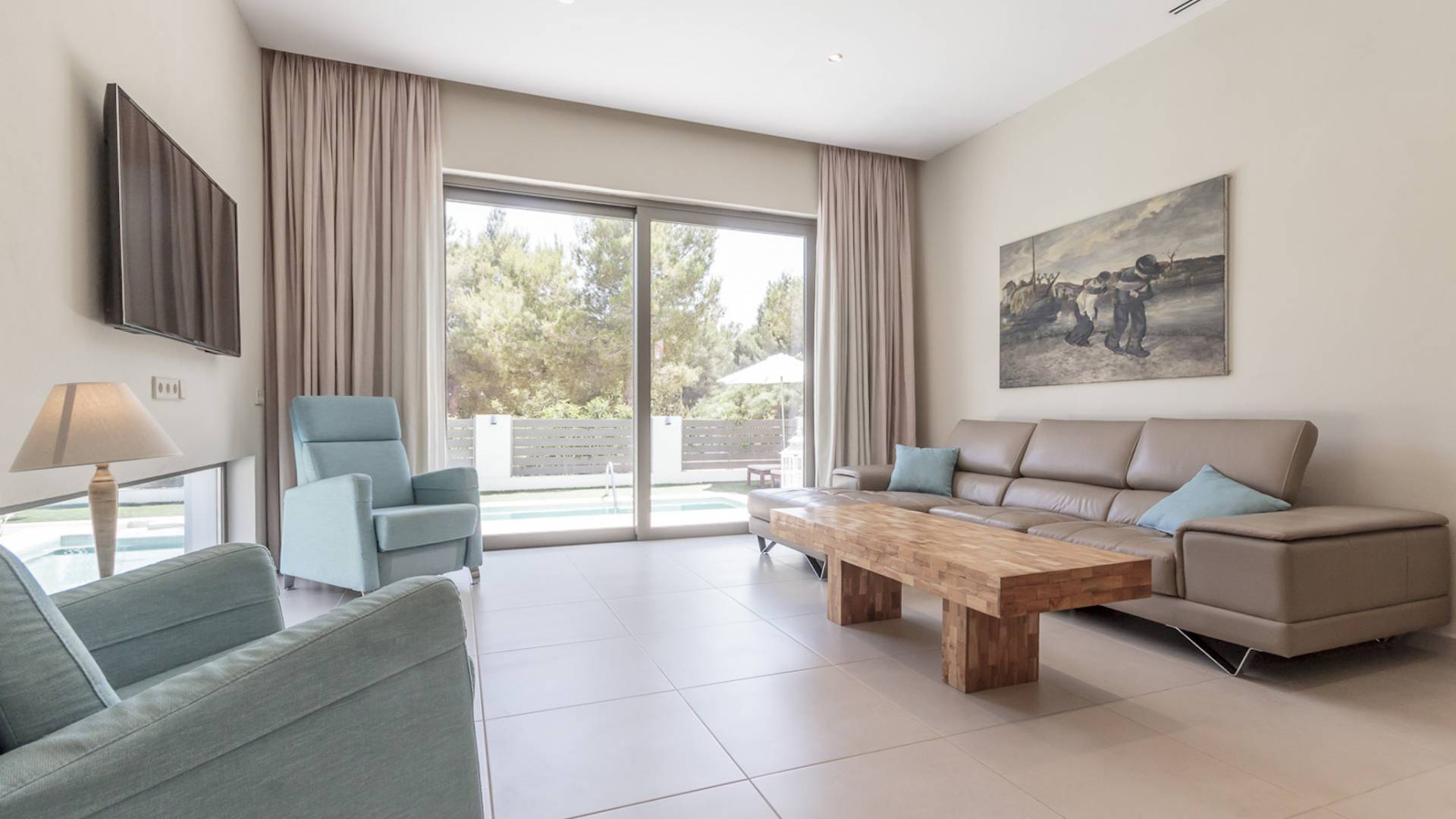 Las áreas de estar constan de una espaciosa y cómoda sala de estar (40m2) y una cocina abierta con barra desayunadora (30m2), ambas en la planta baja ofrecen todo el lujo necesario para una estancia confortable. La cocina está equipada con nevera / congelador doble, lavadora, lavavajillas, cocina de inducción y extractor de techo. Todos los muebles de madera dentro y fuera de la casa están bellamente diseñados y han sido importados de Bali. Toda la casa tiene aire acondicionado a través del techo.