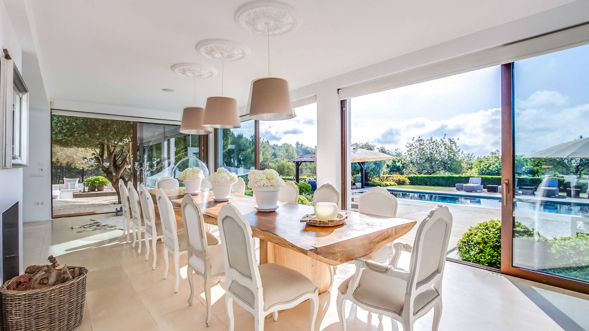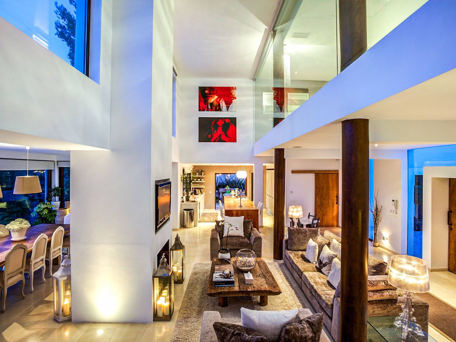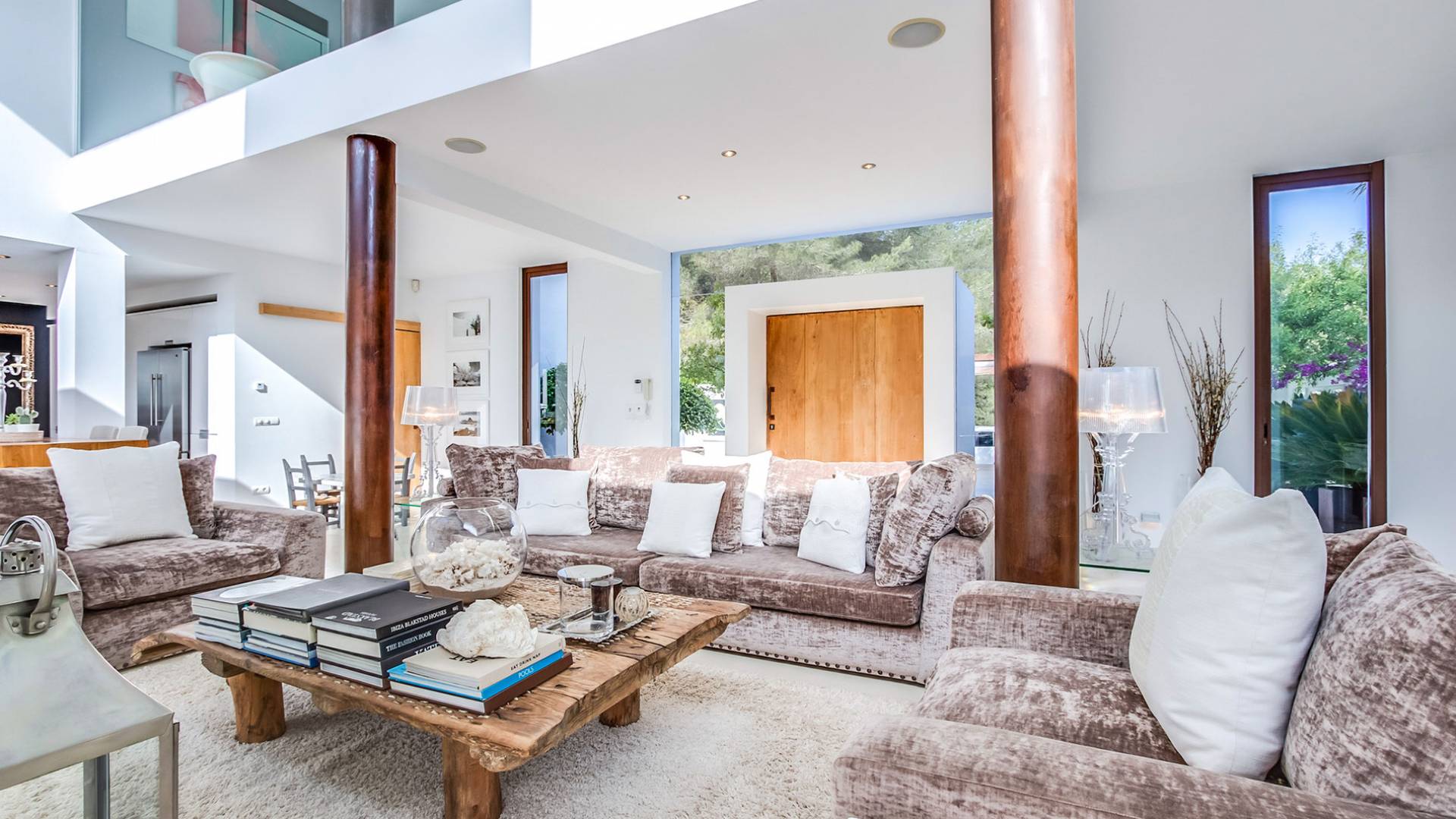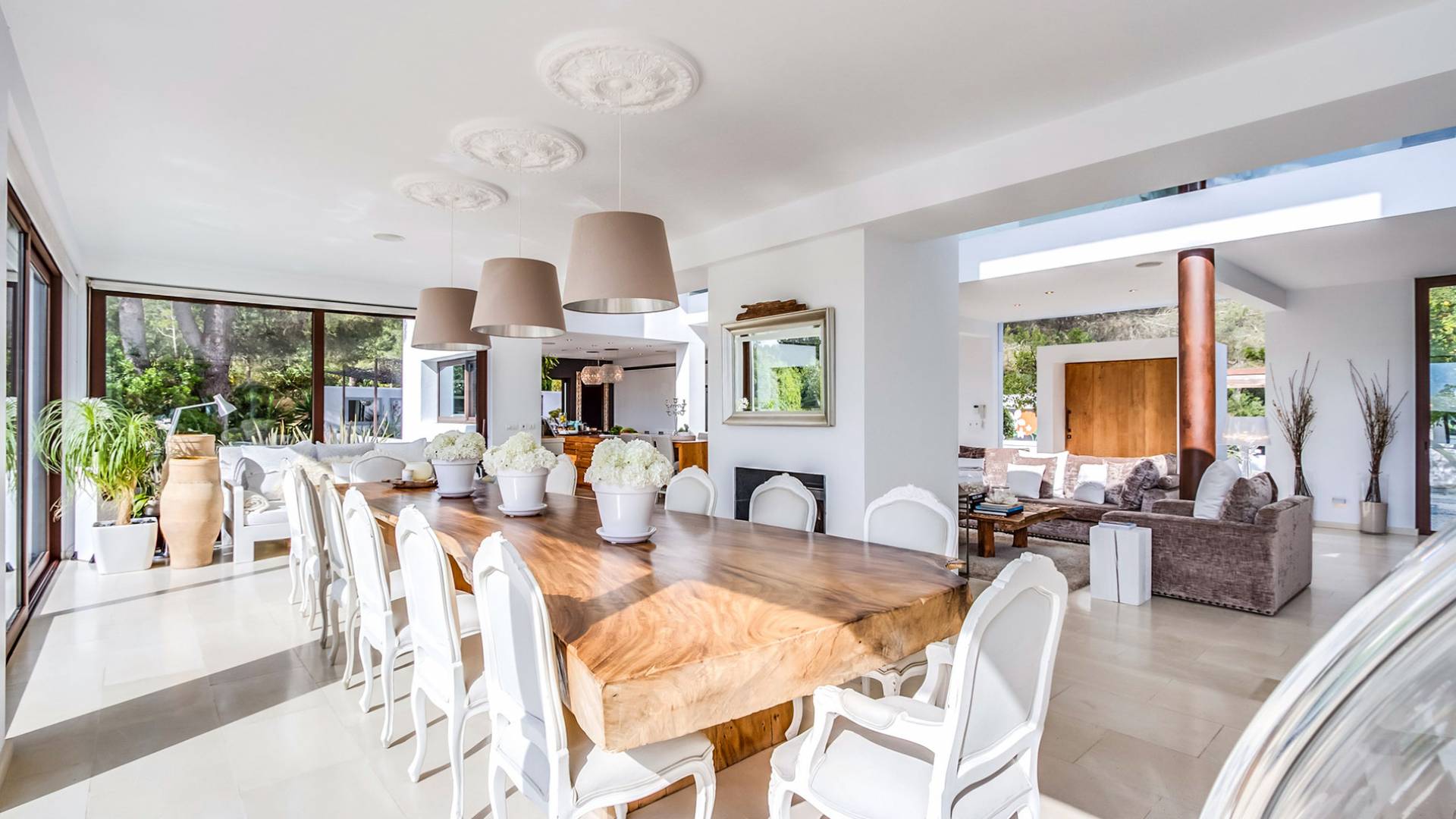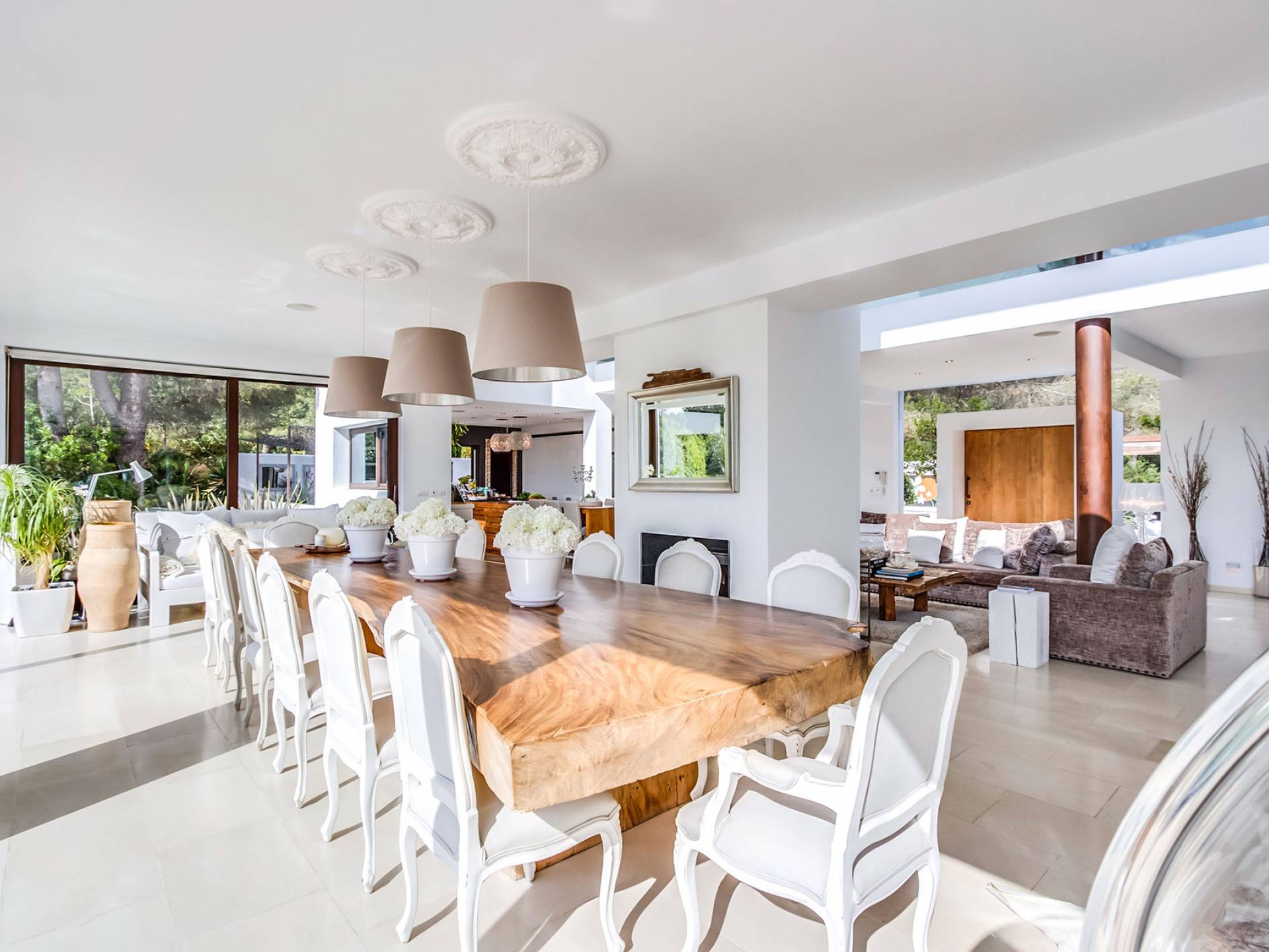 El diseño de planta abierta de San Lorenzo Deluxe Villa Ibiza une a la perfección la sala de estar con la cocina, el comedor y el exterior. Las grandes puertas de vidrio del piso al techo se abren a la piscina y al jardín, hay sofás gigantes estilo salón y una gran mesa de comedor de roble macizo para 14 personas. Las instalaciones incluyen un televisor de plasma de 42 ", sonido envolvente y un reproductor de DVD Blu-ray (una amplia biblioteca de DVD disponible), Sky TV y un sistema de sonido totalmente integrado conectado en toda la casa y en la terraza de la piscina. También hay conexión Wi-Fi en todo la casa.