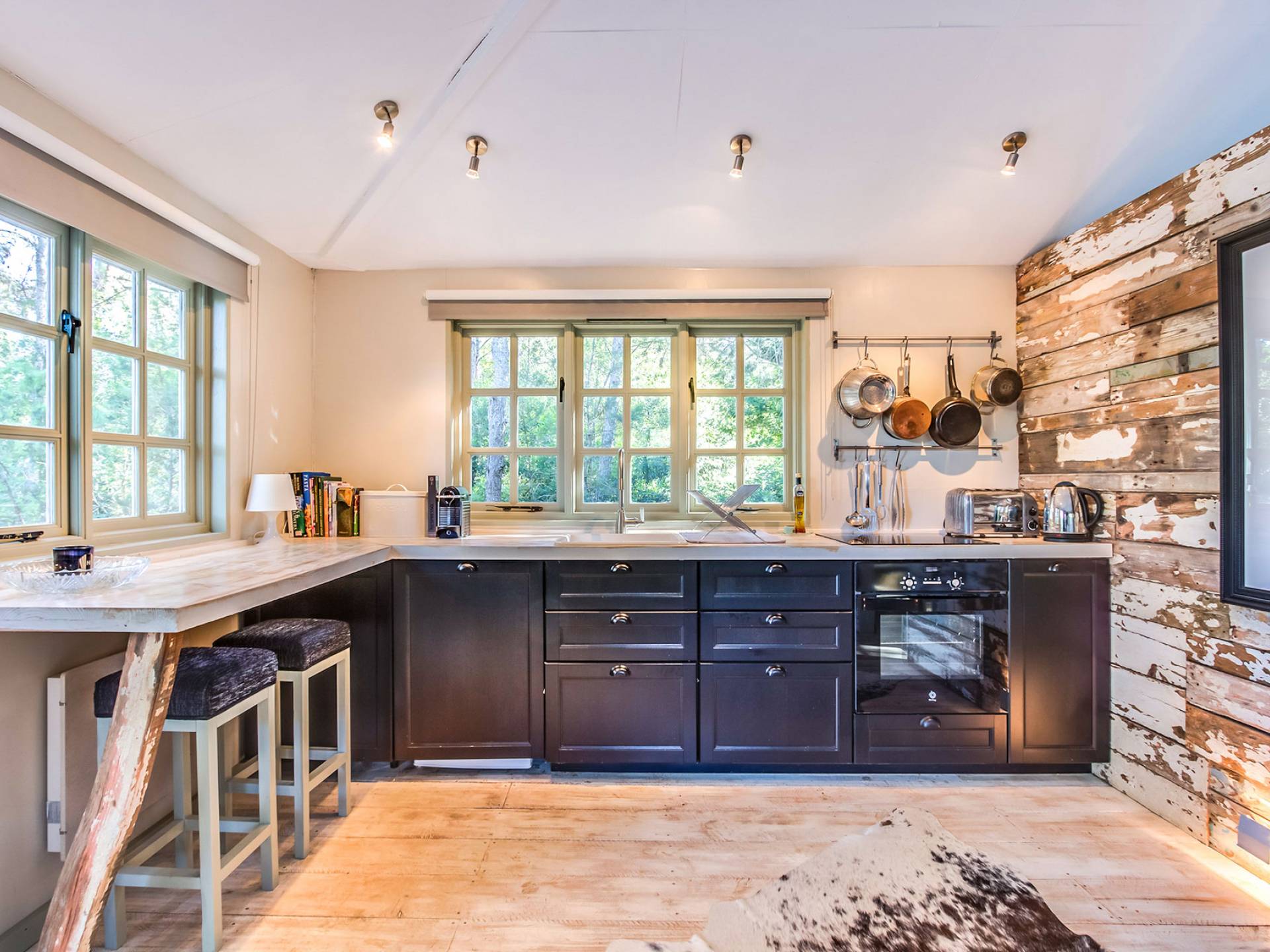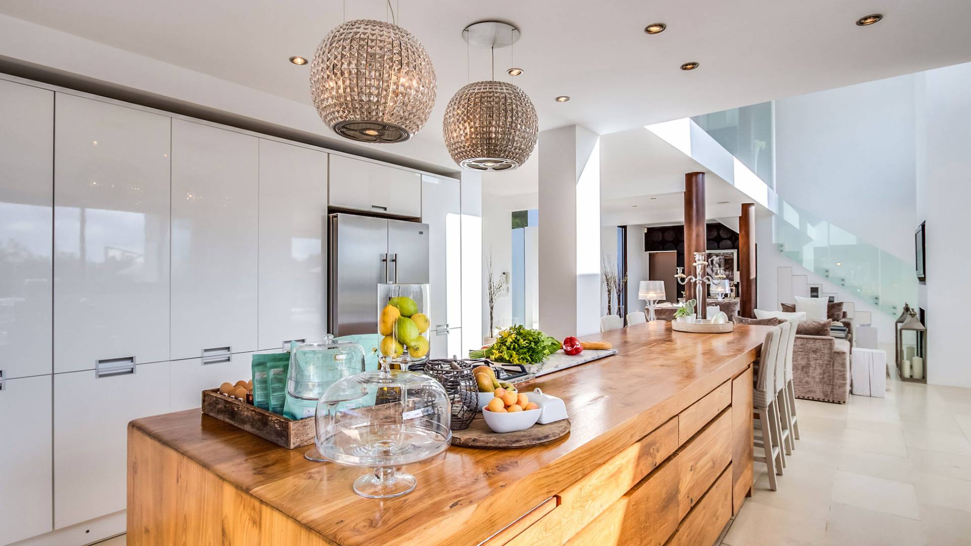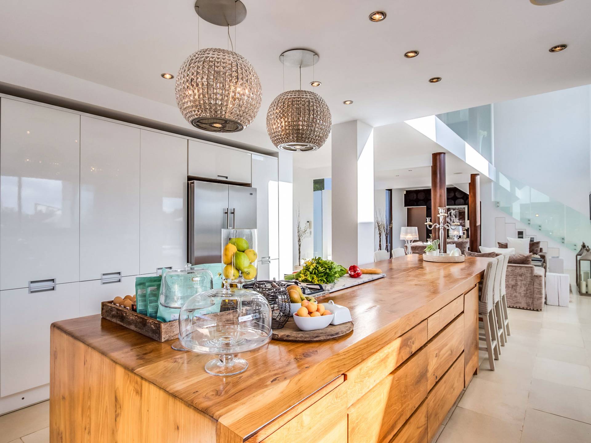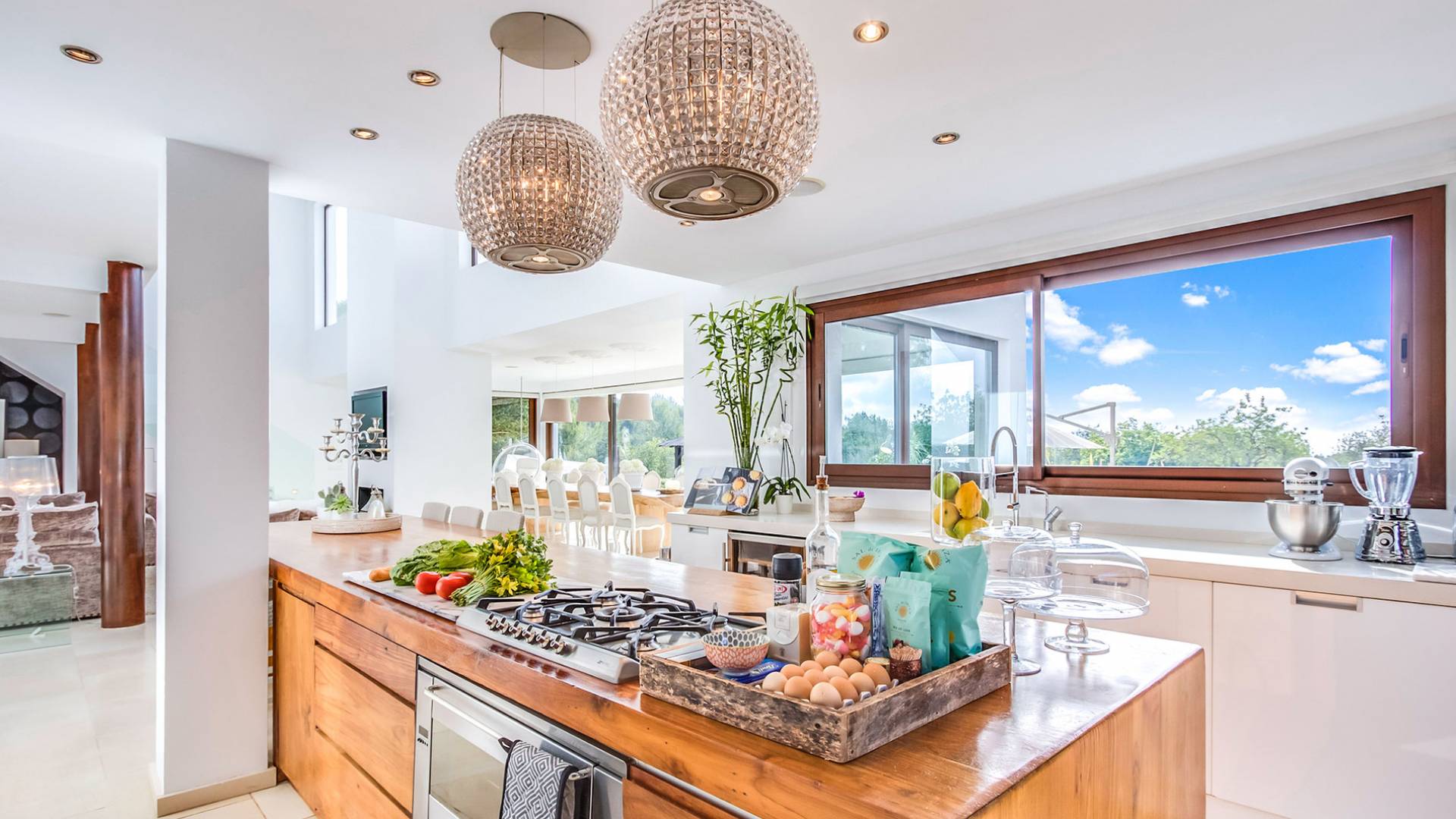 La cocina sumamente equipada rodea una isla central de 5 metros de largo y una barra de desayuno. Hay una nevera-congelador americana de 3 puertas y un dispensador de hielo, junto con un enfriador de vino, 2 lavavajillas, un grifo de agua caliente instantánea Quooker, un horno Smeg y una placa de 5 fuegos son solo algunas de las instalaciones disponibles.