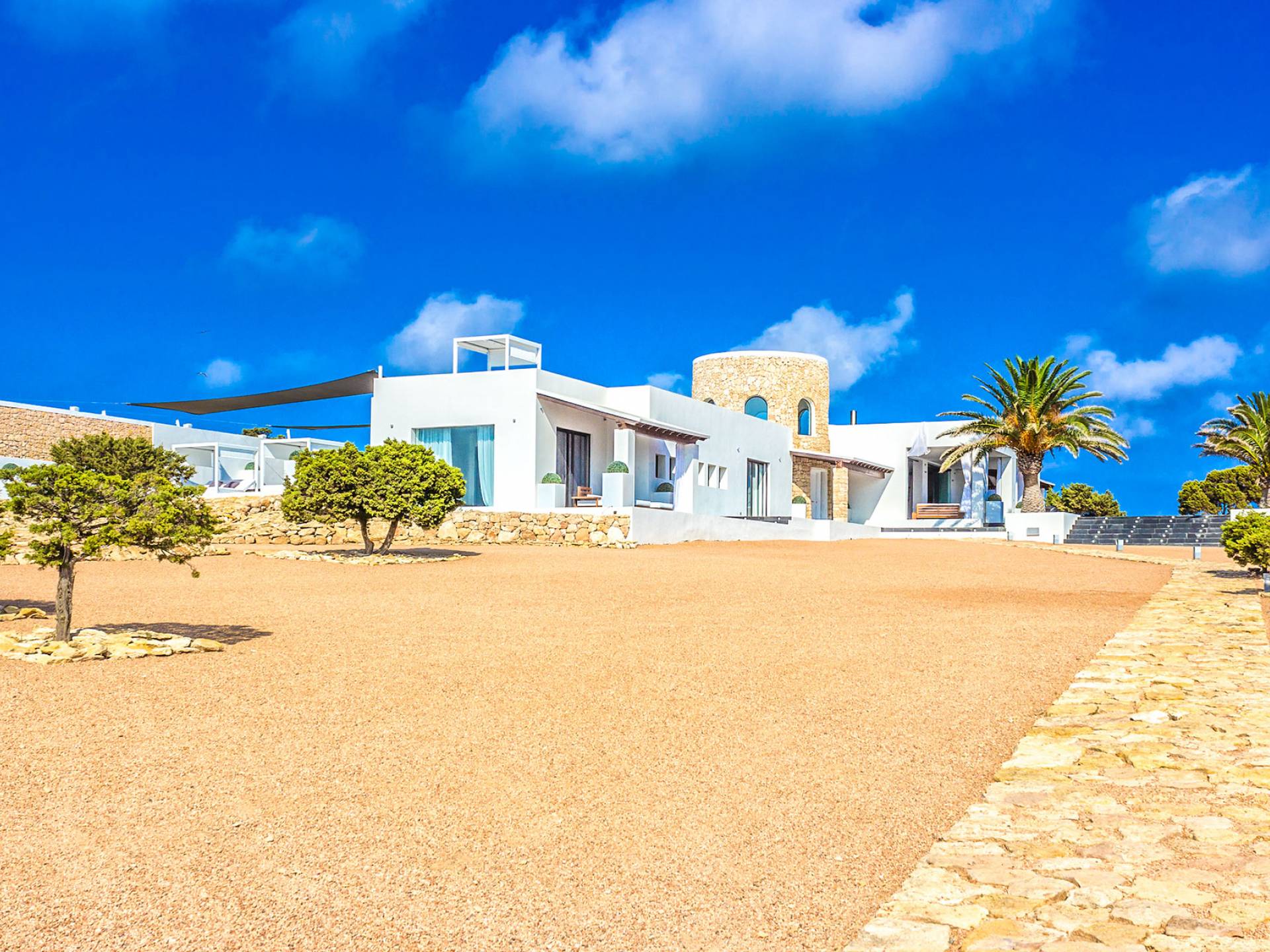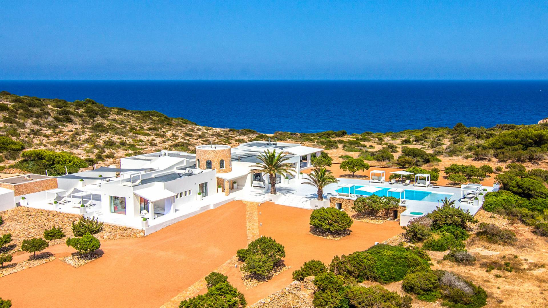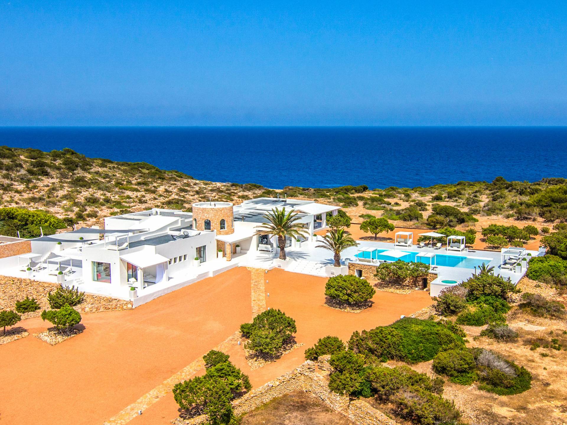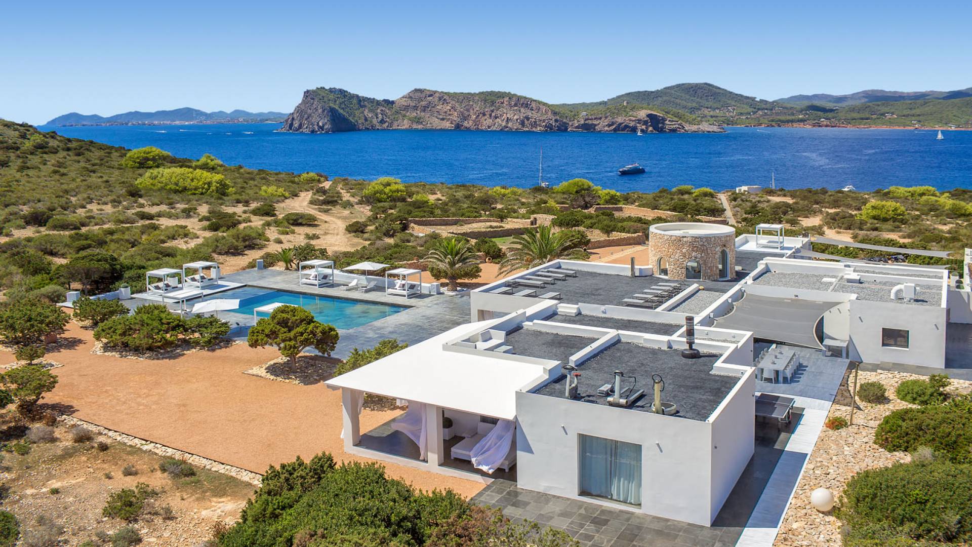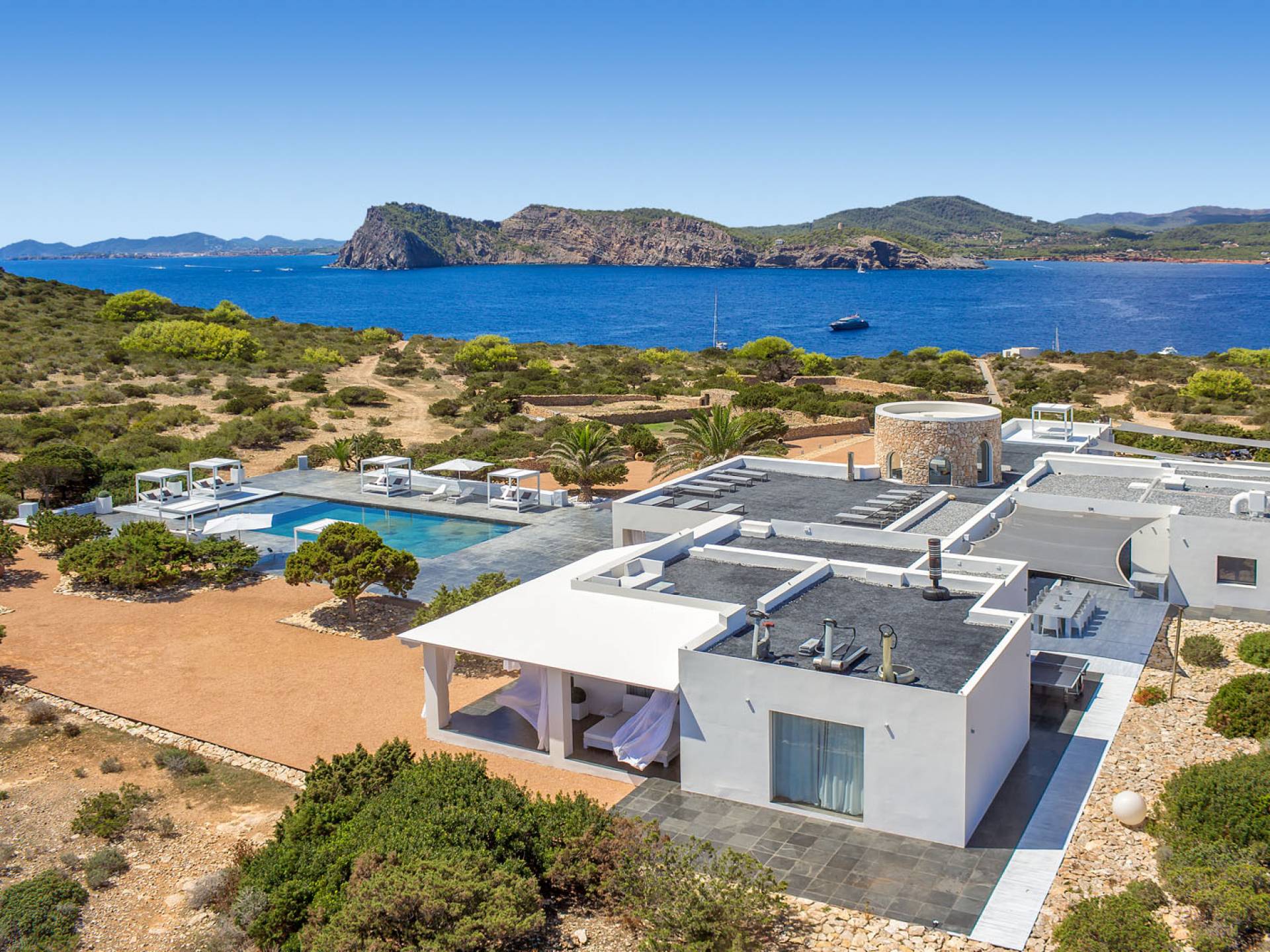 Toda la finca que rodea esta villa de lujo cuenta con impresionantes vistas en todas direcciones, como la isla de Ibiza y el mar Mediterráneo. Hay magníficas y espaciosas terrazas con zonas chill-out al amanecer y al atardecer, así como una piscina de 17 mx 8 m, para una mayor relajación, hay una piscina de hidromasaje al aire libre, un baño de vapor y una sauna. Disfrute del sol desde la mañana hasta la noche en estas amplias terrazas y podrá disfrutar de un comedor al aire libre con vista en el área de comedor al aire libre con barbacoa. Tagomago Private Island tiene seguridad las 24 horas y solo es accesible en la costa oeste, el aterrizaje de helicópteros es una posibilidad y un yate privado está disponible para alquilar (precio en la solicitud).
