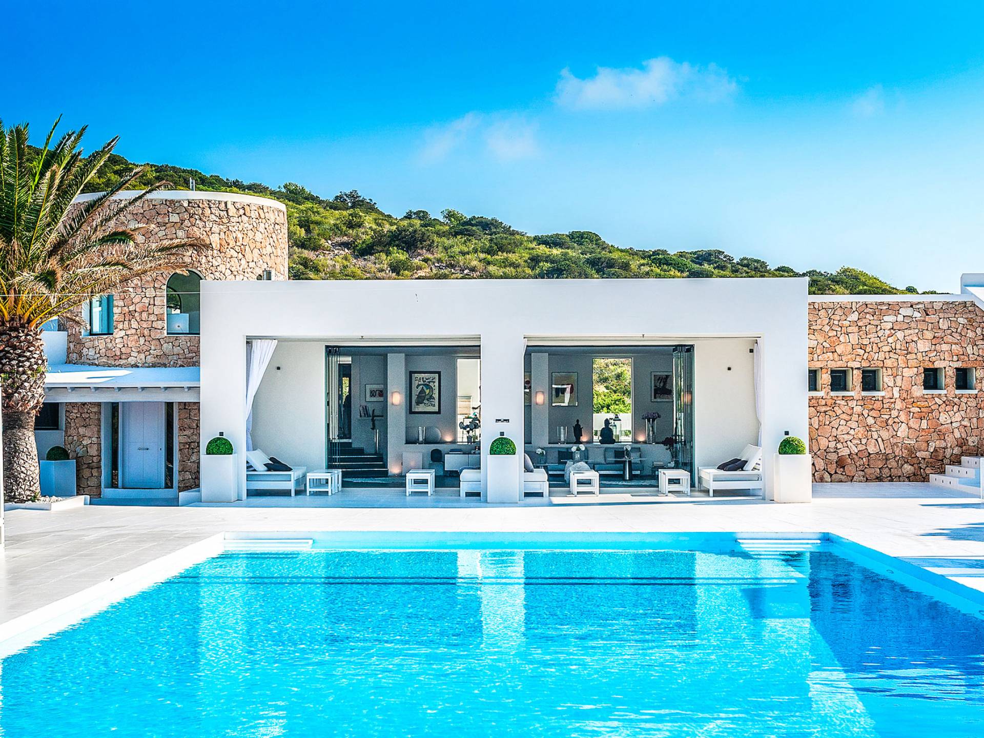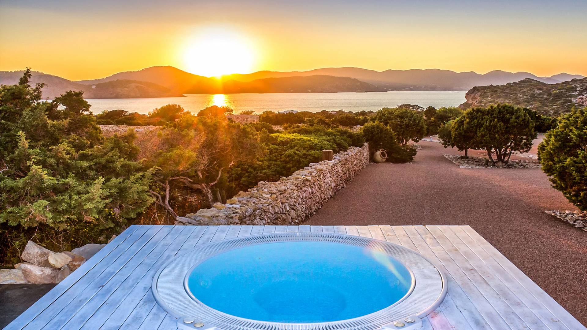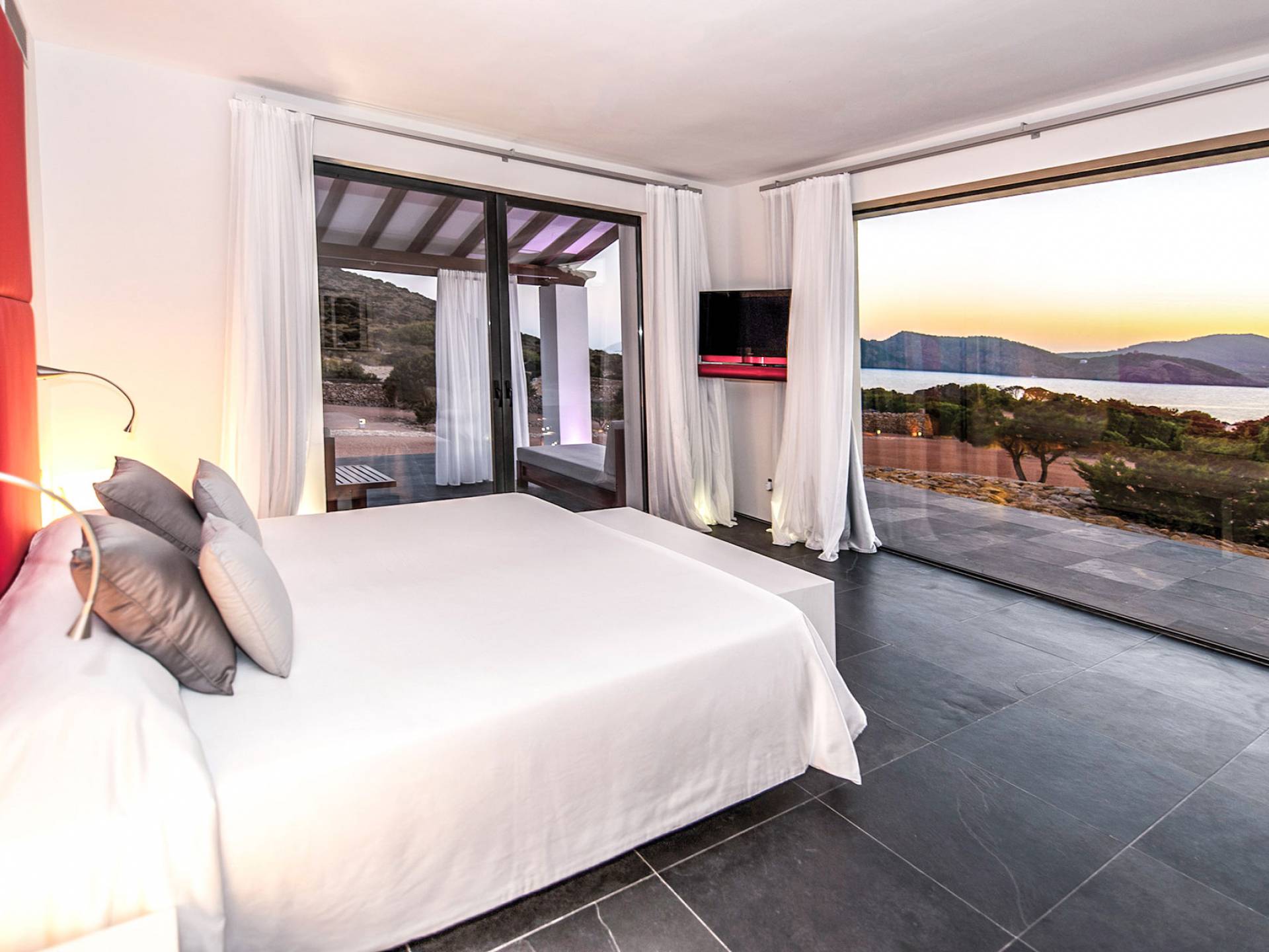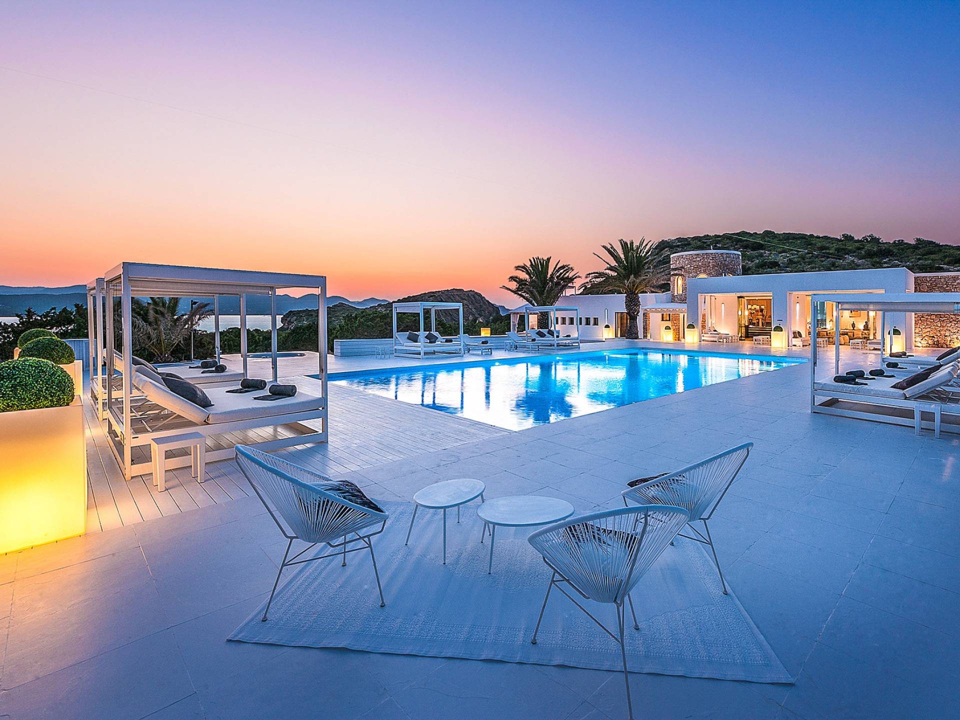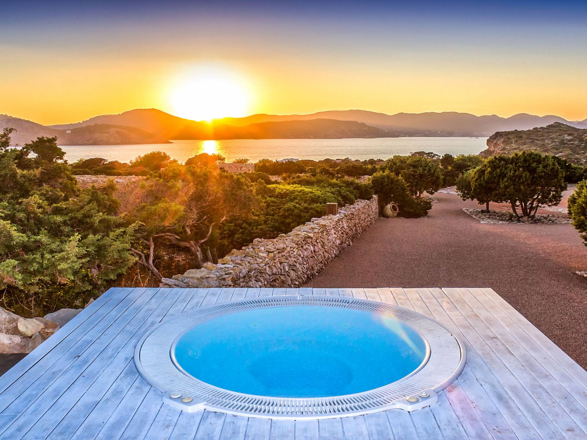 Toda la finca que rodea esta villa de lujo cuenta con impresionantes vistas en todas direcciones, como la isla de Ibiza y el mar Mediterráneo. Hay magníficas y espaciosas terrazas con zonas chill-out al amanecer y al atardecer, así como una piscina de 17 mx 8 m, para una mayor relajación, hay una piscina de hidromasaje al aire libre, un baño de vapor y una sauna. Disfrute del sol desde la mañana hasta la noche en estas amplias terrazas y podrá disfrutar de un comedor al aire libre con vista en el área de comedor al aire libre con barbacoa. Tagomago Private Island tiene seguridad las 24 horas y solo es accesible en la costa oeste, el aterrizaje de helicópteros es una posibilidad y un yate privado está disponible para alquilar (precio en la solicitud).
