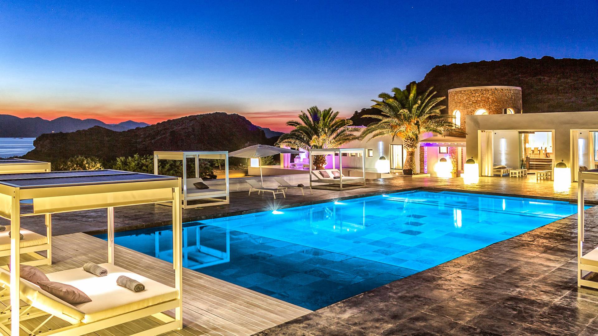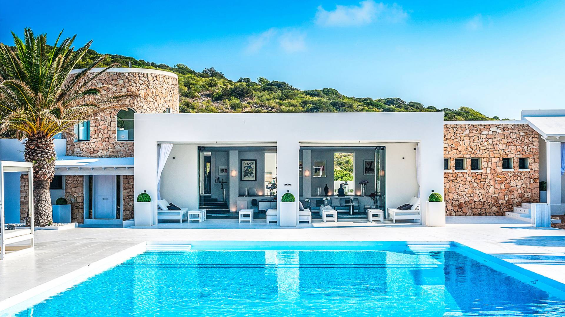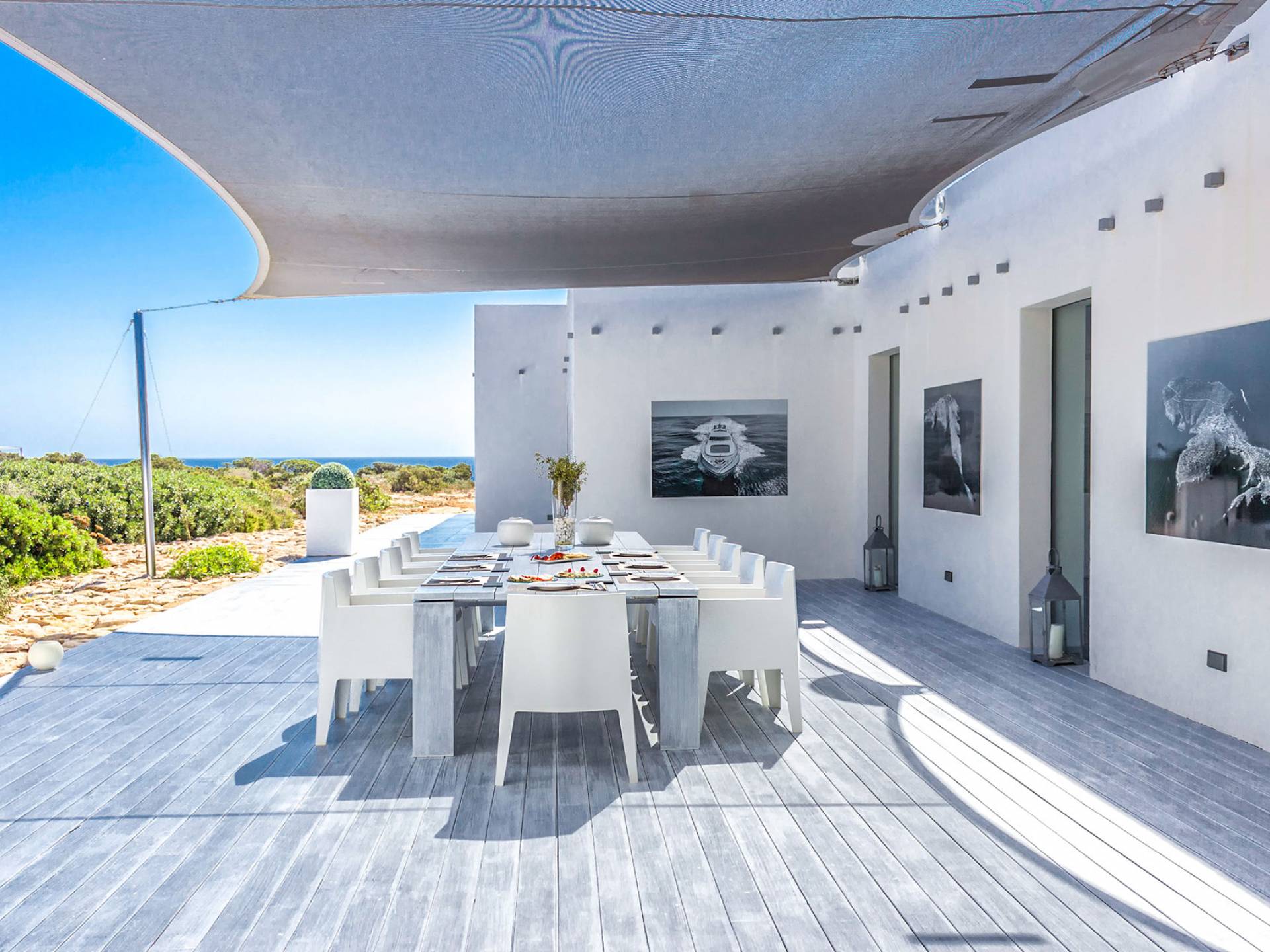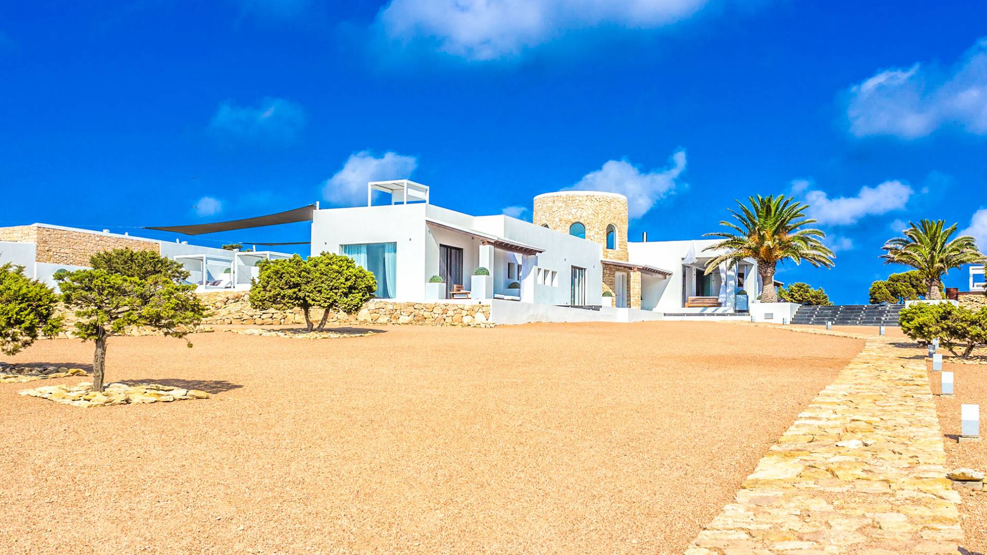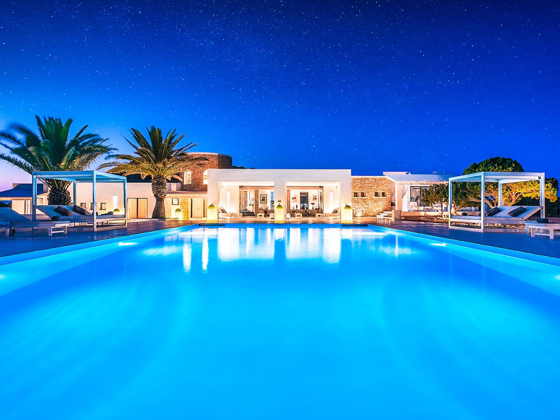 Toda la finca que rodea esta villa de lujo cuenta con impresionantes vistas en todas direcciones, como la isla de Ibiza y el mar Mediterráneo. Hay magníficas y espaciosas terrazas con zonas chill-out al amanecer y al atardecer, así como una piscina de 17 mx 8 m, para una mayor relajación, hay una piscina de hidromasaje al aire libre, un baño de vapor y una sauna. Disfrute del sol desde la mañana hasta la noche en estas amplias terrazas y podrá disfrutar de un comedor al aire libre con vista en el área de comedor al aire libre con barbacoa. Tagomago Private Island tiene seguridad las 24 horas y solo es accesible en la costa oeste, el aterrizaje de helicópteros es una posibilidad y un yate privado está disponible para alquilar (precio en la solicitud).