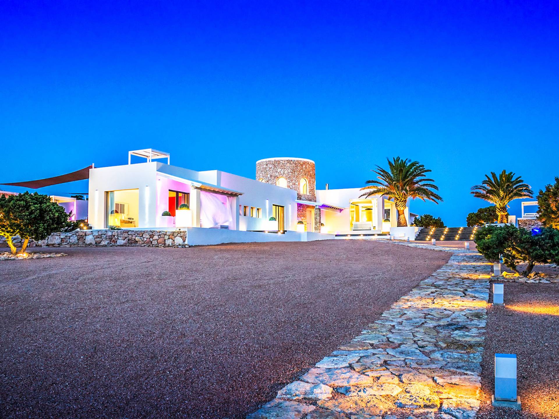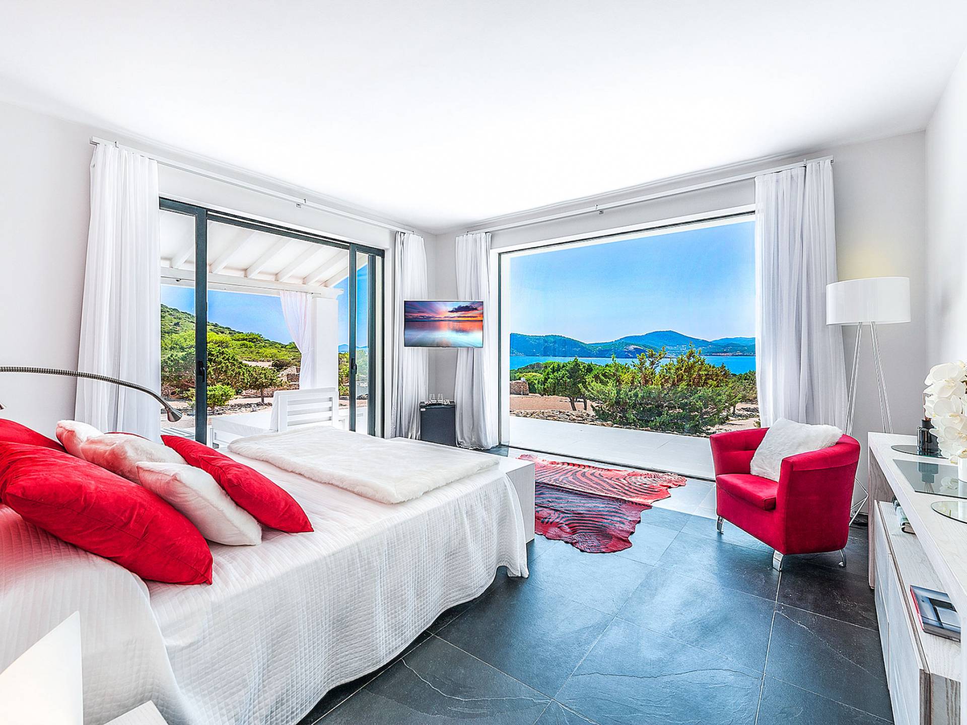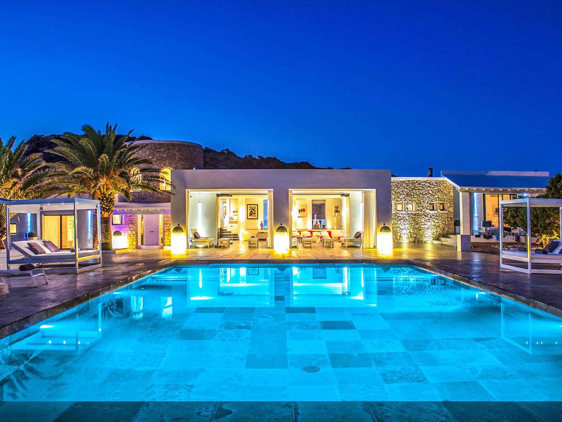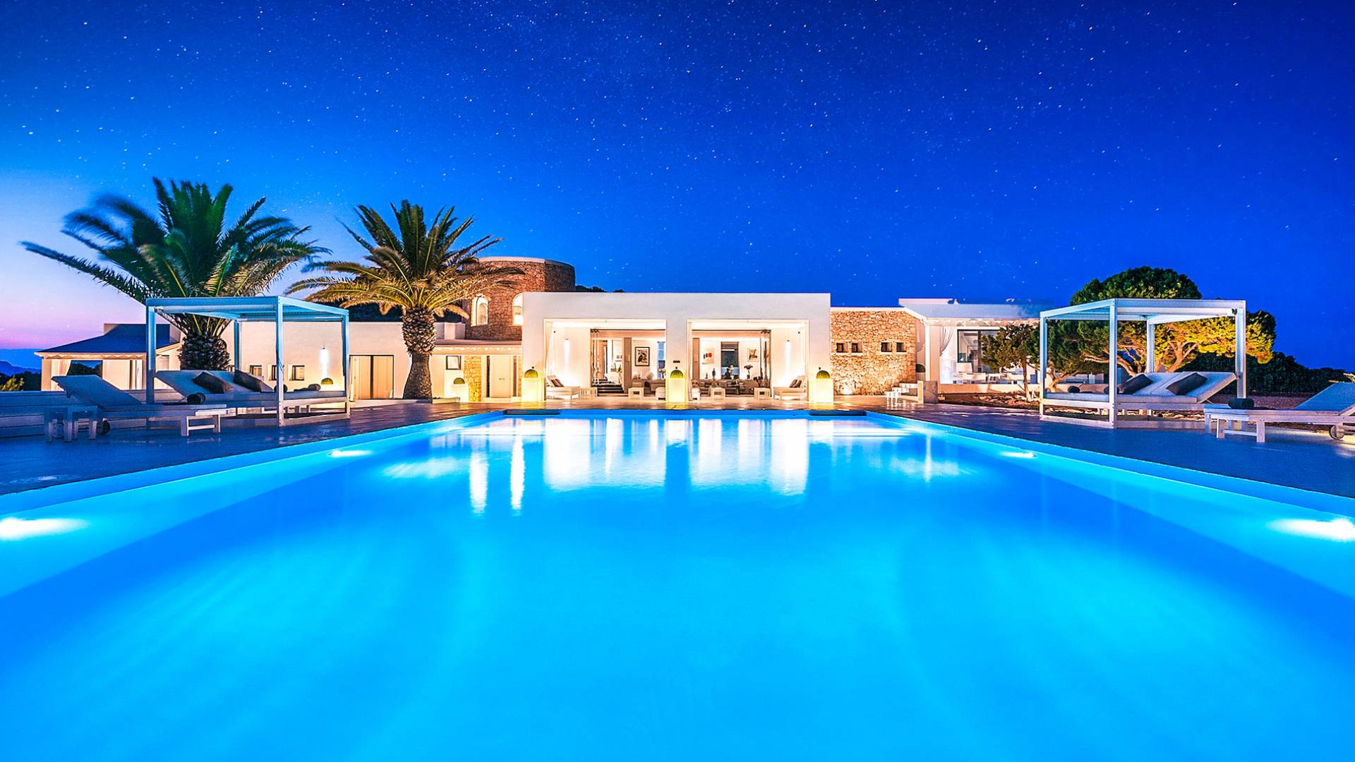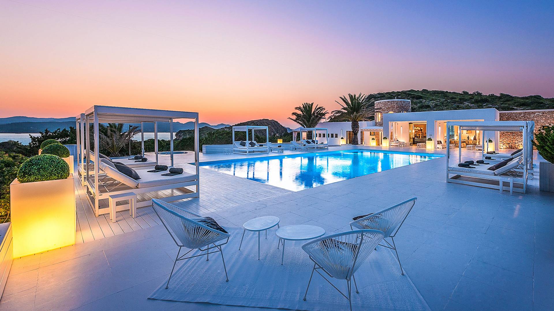 Toda la finca que rodea esta villa de lujo cuenta con impresionantes vistas en todas direcciones, como la isla de Ibiza y el mar Mediterráneo. Hay magníficas y espaciosas terrazas con zonas chill-out al amanecer y al atardecer, así como una piscina de 17 mx 8 m, para una mayor relajación, hay una piscina de hidromasaje al aire libre, un baño de vapor y una sauna. Disfrute del sol desde la mañana hasta la noche en estas amplias terrazas y podrá disfrutar de un comedor al aire libre con vista en el área de comedor al aire libre con barbacoa. Tagomago Private Island tiene seguridad las 24 horas y solo es accesible en la costa oeste, el aterrizaje de helicópteros es una posibilidad y un yate privado está disponible para alquilar (precio en la solicitud).
