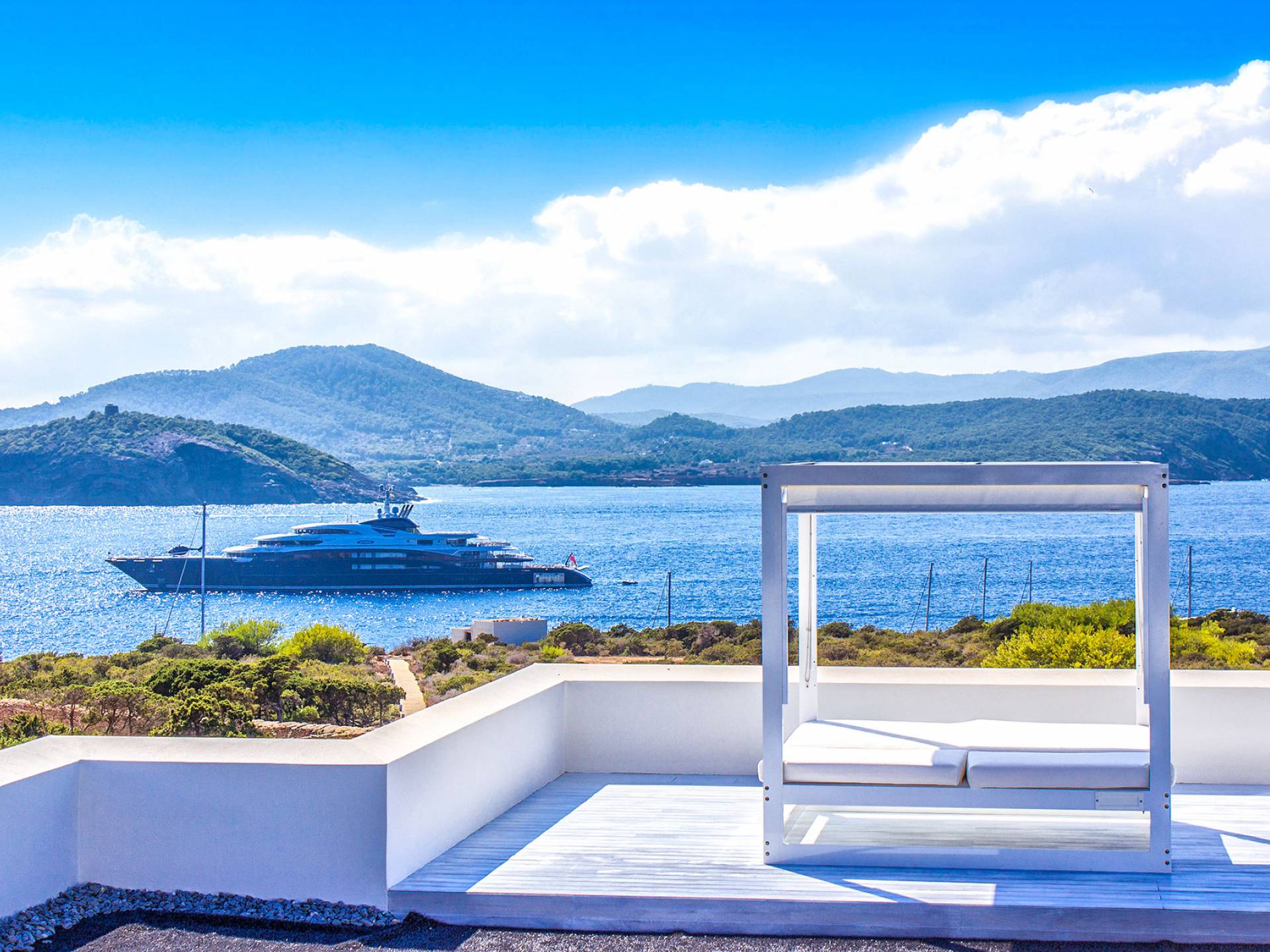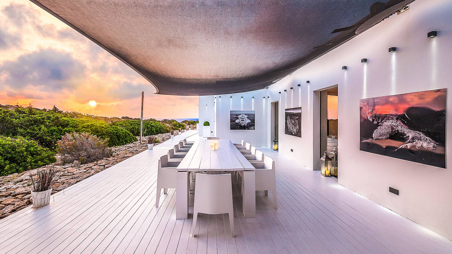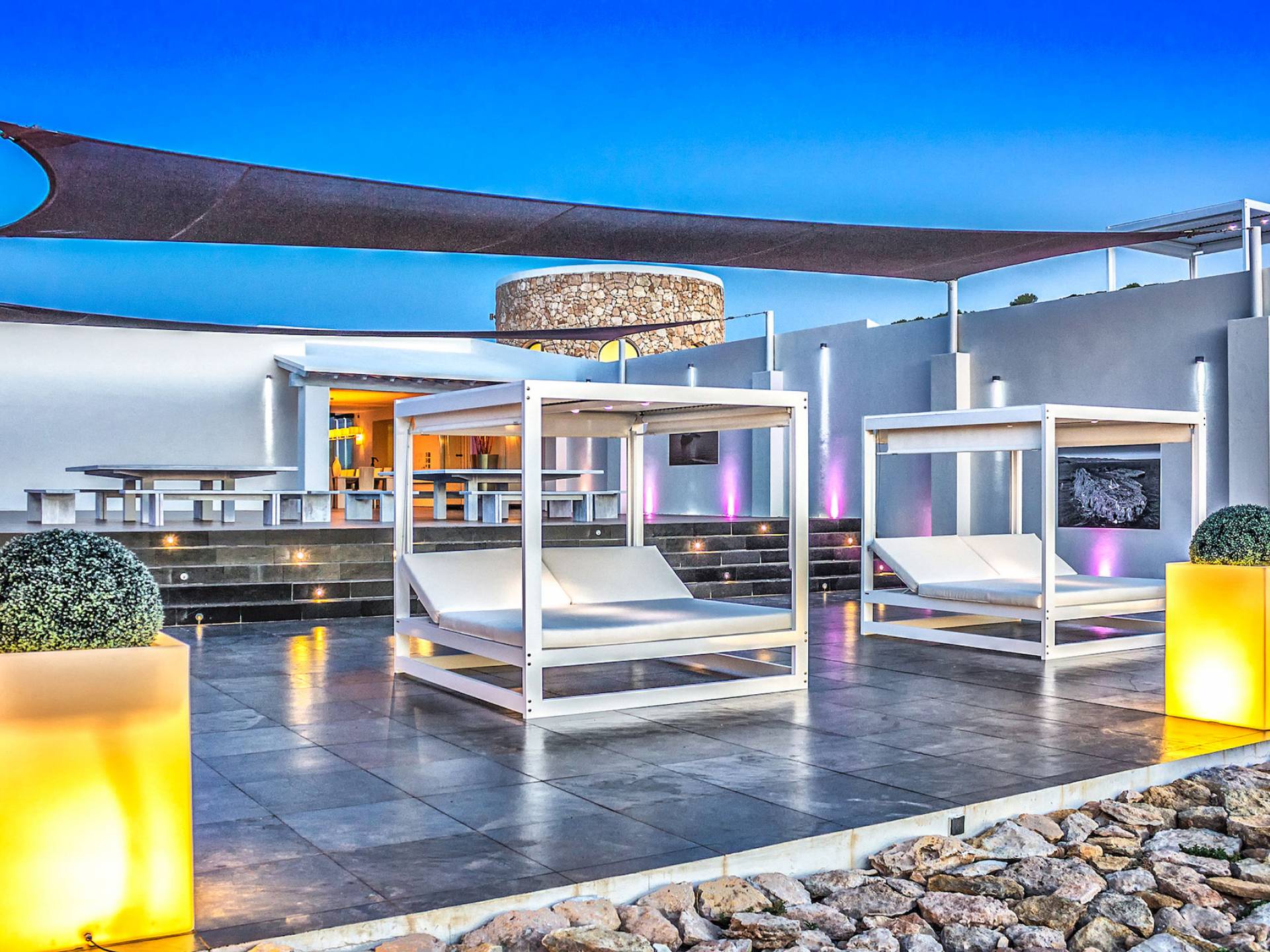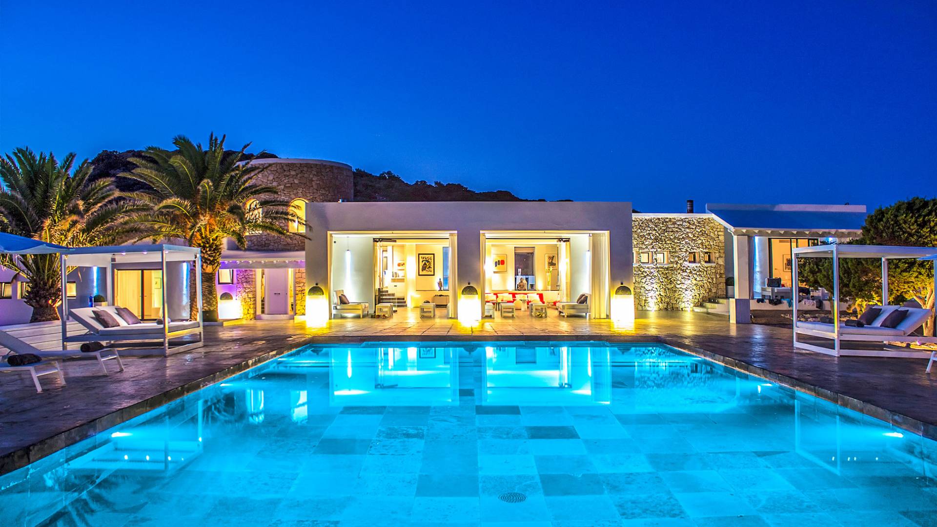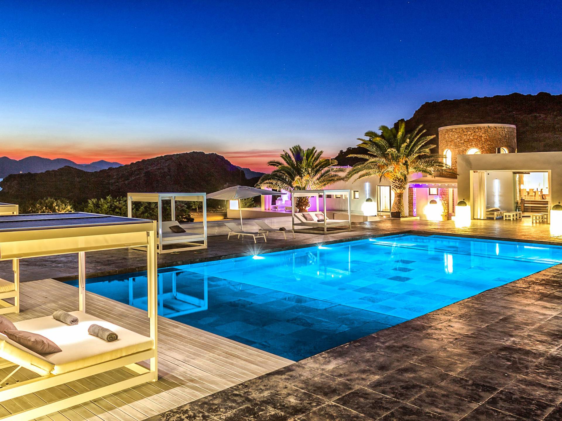 Toda la finca que rodea esta villa de lujo cuenta con impresionantes vistas en todas direcciones, como la isla de Ibiza y el mar Mediterráneo. Hay magníficas y espaciosas terrazas con zonas chill-out al amanecer y al atardecer, así como una piscina de 17 mx 8 m, para una mayor relajación, hay una piscina de hidromasaje al aire libre, un baño de vapor y una sauna. Disfrute del sol desde la mañana hasta la noche en estas amplias terrazas y podrá disfrutar de un comedor al aire libre con vista en el área de comedor al aire libre con barbacoa. Tagomago Private Island tiene seguridad las 24 horas y solo es accesible en la costa oeste, el aterrizaje de helicópteros es una posibilidad y un yate privado está disponible para alquilar (precio en la solicitud).