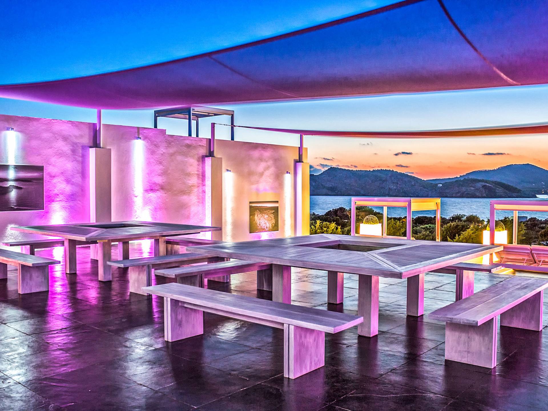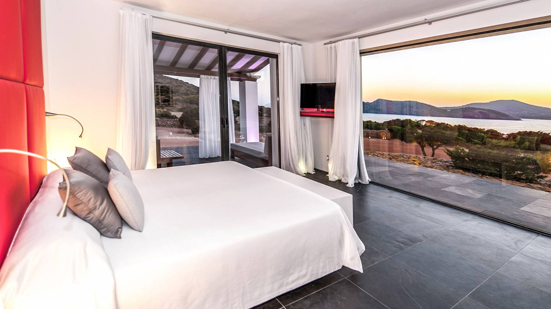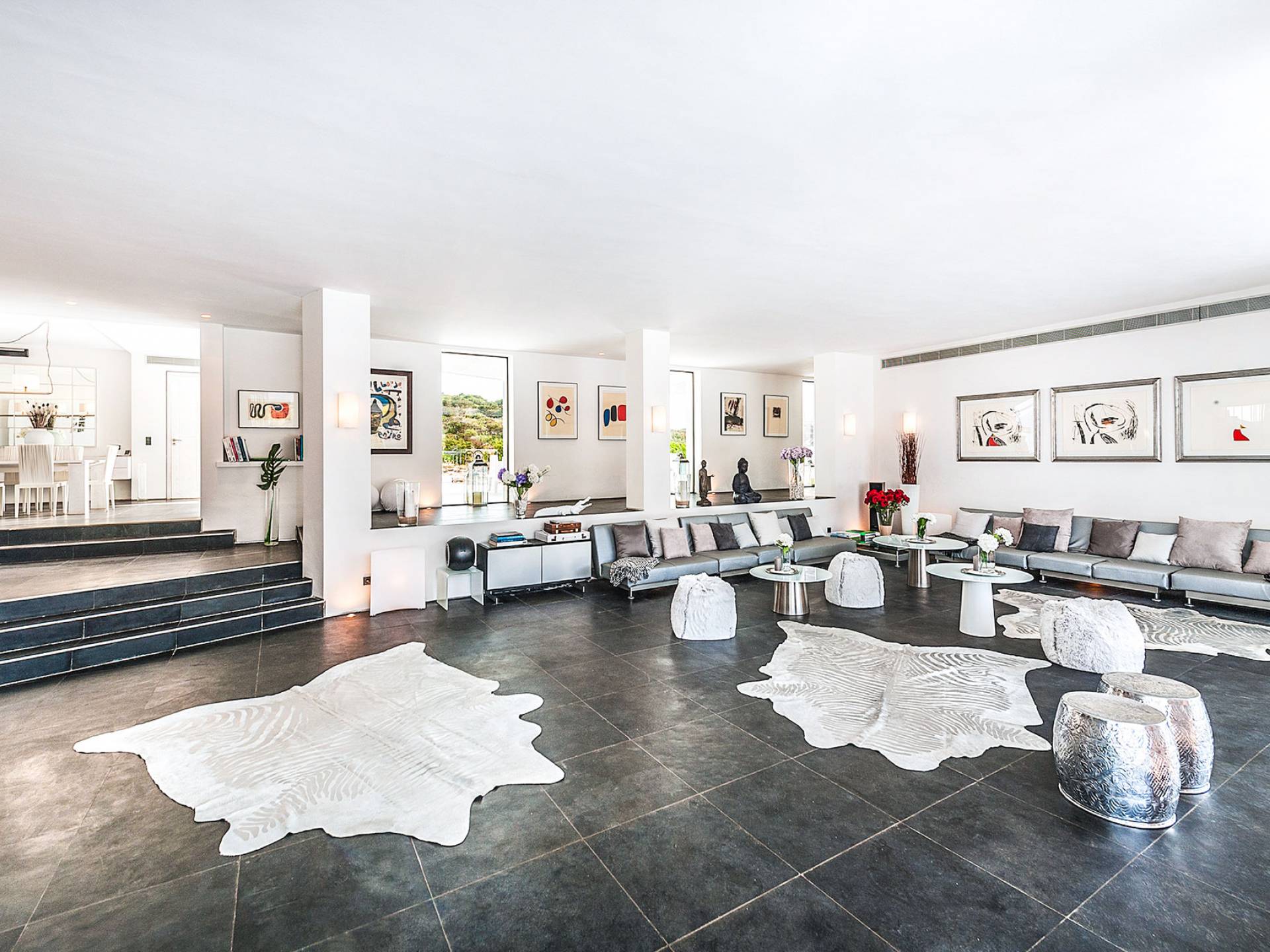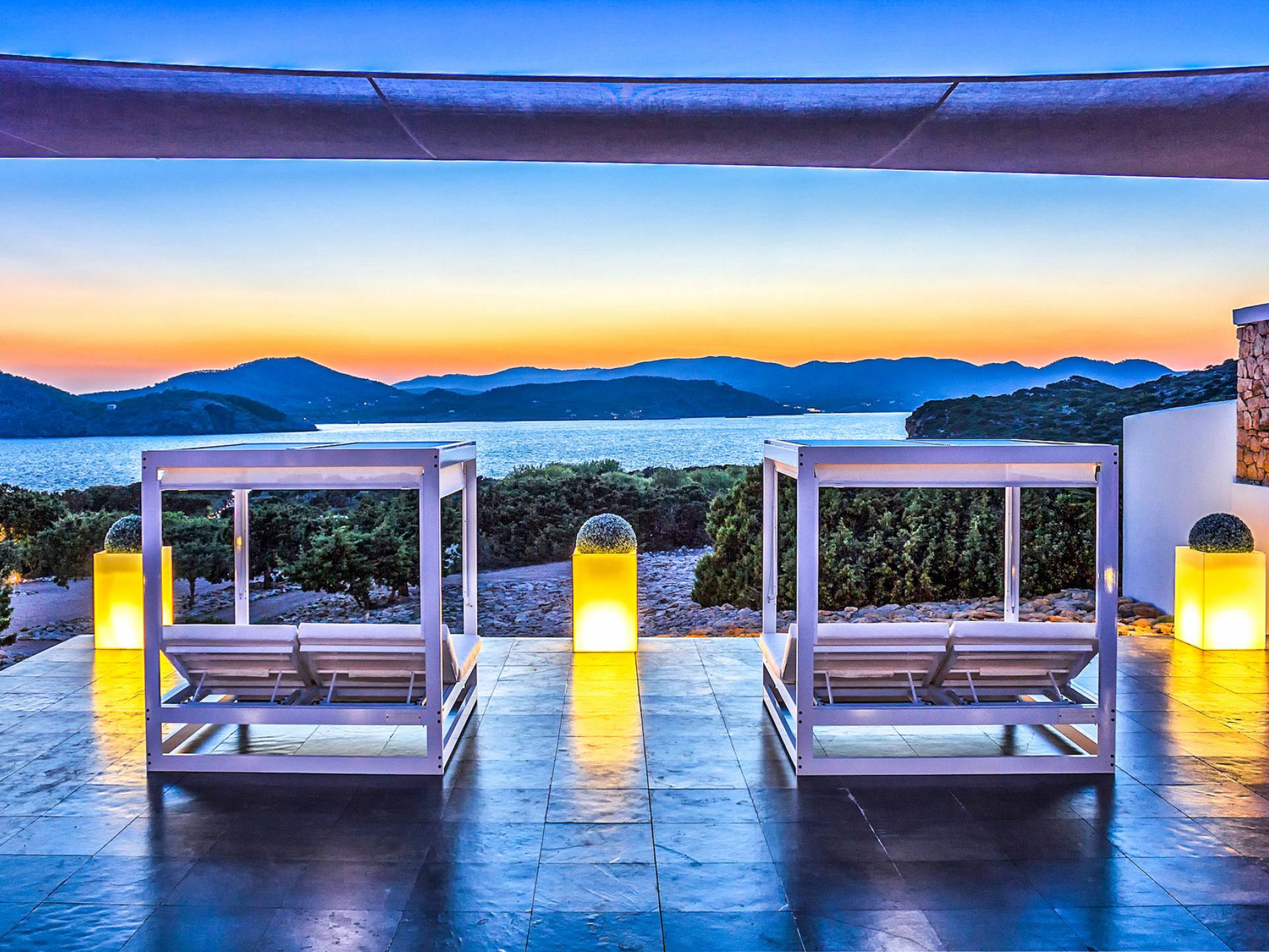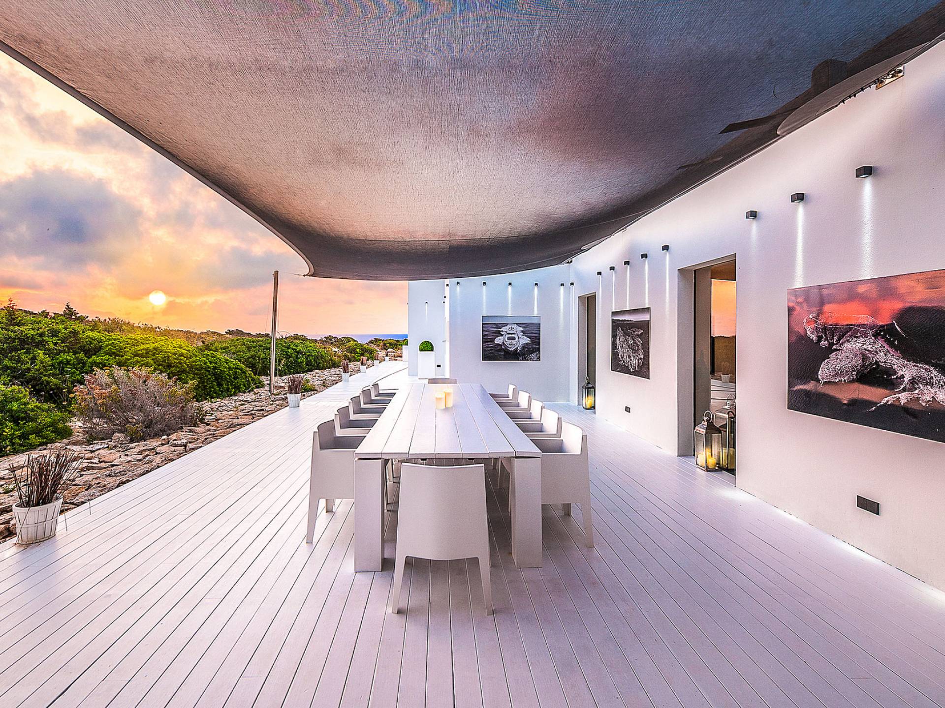 Toda la finca que rodea esta villa de lujo cuenta con impresionantes vistas en todas direcciones, como la isla de Ibiza y el mar Mediterráneo. Hay magníficas y espaciosas terrazas con zonas chill-out al amanecer y al atardecer, así como una piscina de 17 mx 8 m, para una mayor relajación, hay una piscina de hidromasaje al aire libre, un baño de vapor y una sauna. Disfrute del sol desde la mañana hasta la noche en estas amplias terrazas y podrá disfrutar de un comedor al aire libre con vista en el área de comedor al aire libre con barbacoa. Tagomago Private Island tiene seguridad las 24 horas y solo es accesible en la costa oeste, el aterrizaje de helicópteros es una posibilidad y un yate privado está disponible para alquilar (precio en la solicitud).