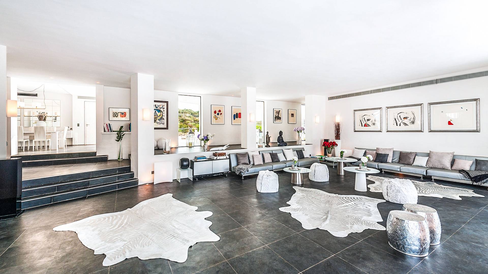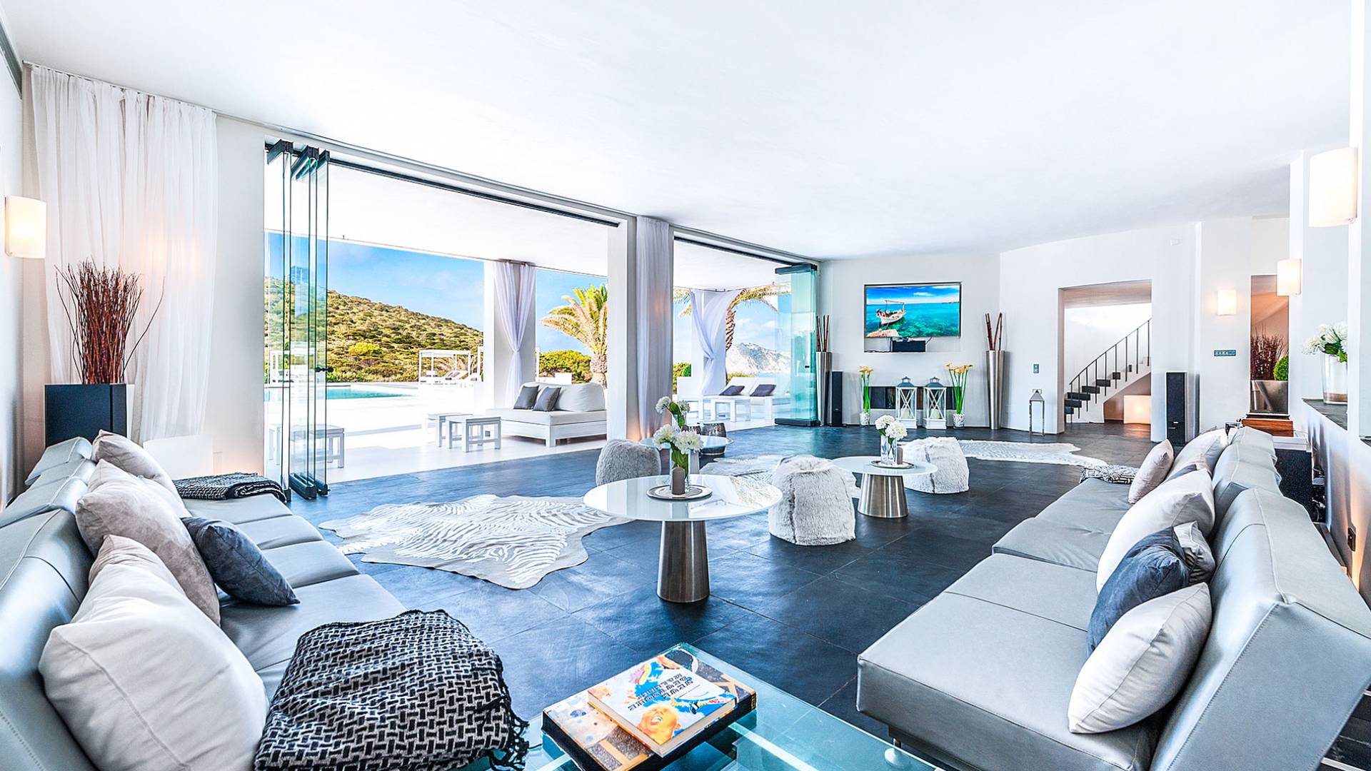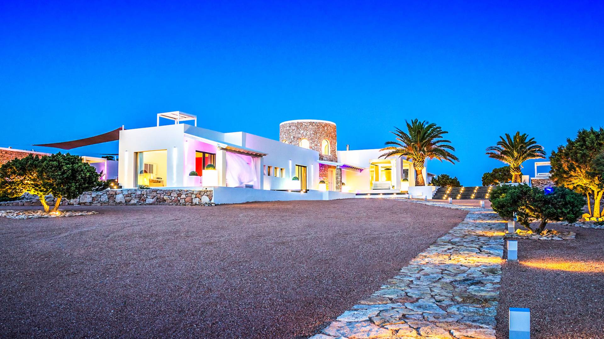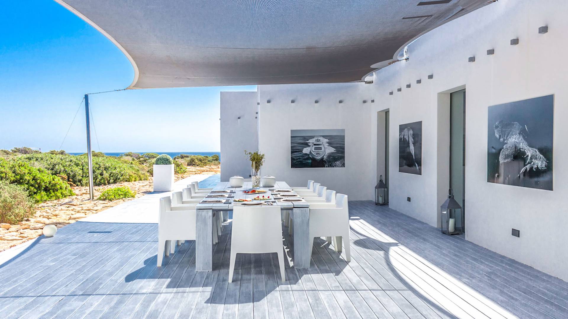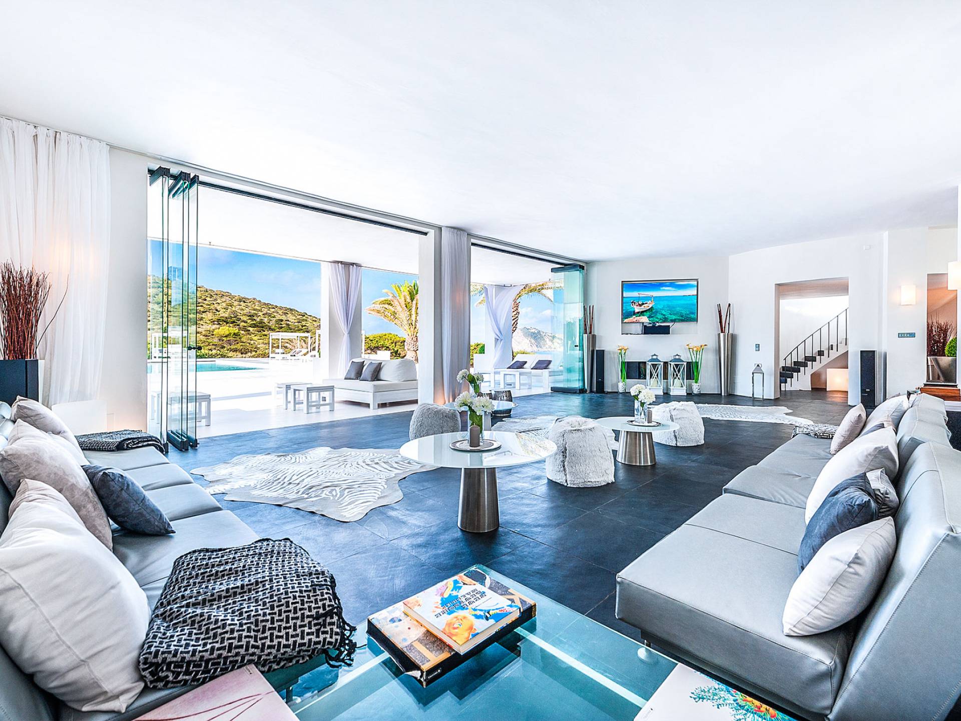 Toda la finca que rodea esta villa de lujo cuenta con impresionantes vistas en todas direcciones, como la isla de Ibiza y el mar Mediterráneo. Hay magníficas y espaciosas terrazas con zonas chill-out al amanecer y al atardecer, así como una piscina de 17 mx 8 m, para una mayor relajación, hay una piscina de hidromasaje al aire libre, un baño de vapor y una sauna. Disfrute del sol desde la mañana hasta la noche en estas amplias terrazas y podrá disfrutar de un comedor al aire libre con vista en el área de comedor al aire libre con barbacoa. Tagomago Private Island tiene seguridad las 24 horas y solo es accesible en la costa oeste, el aterrizaje de helicópteros es una posibilidad y un yate privado está disponible para alquilar (precio en la solicitud).