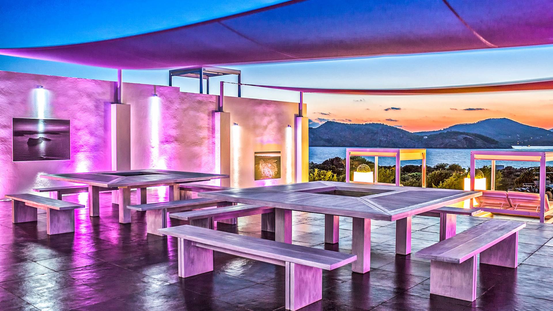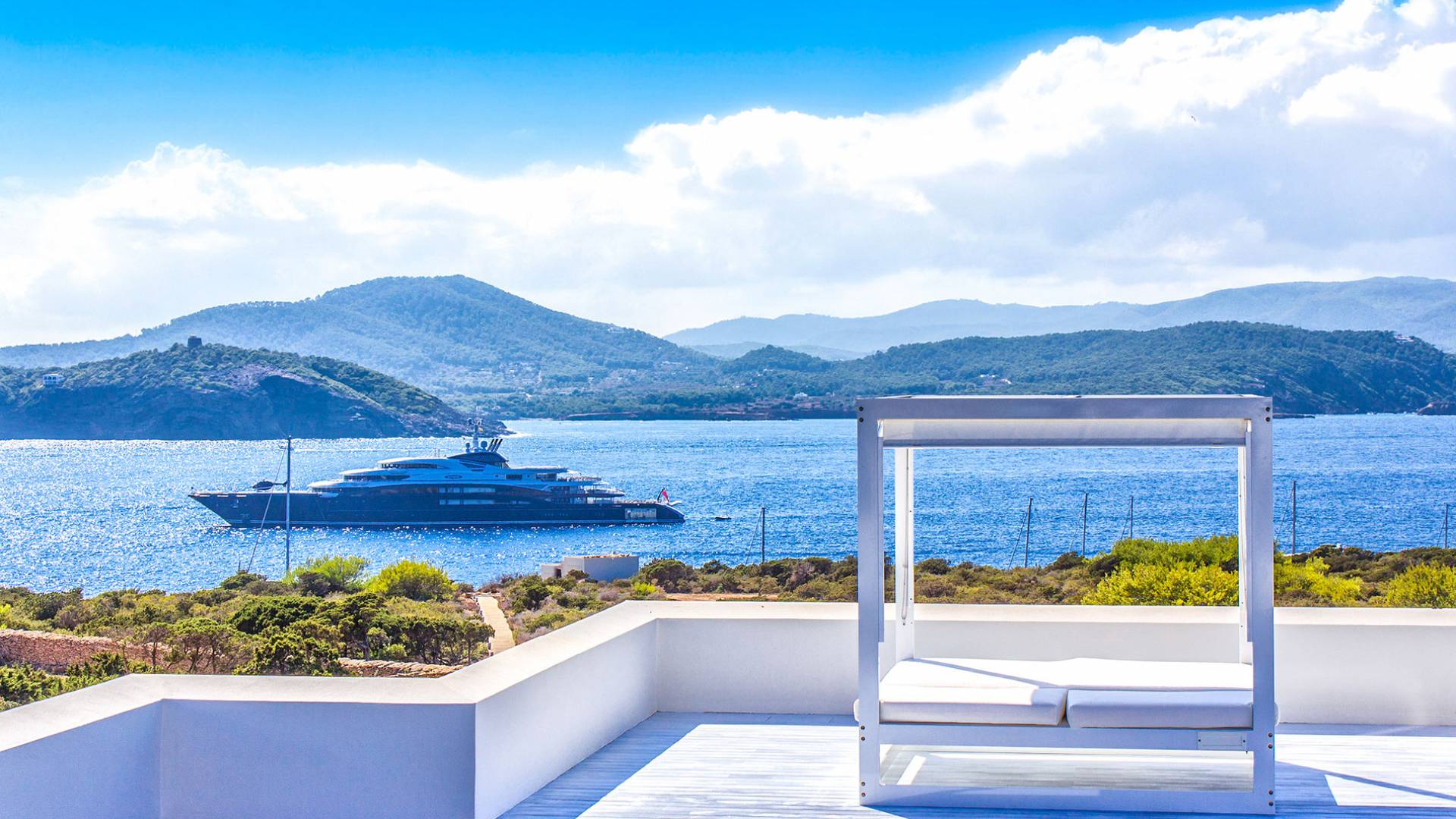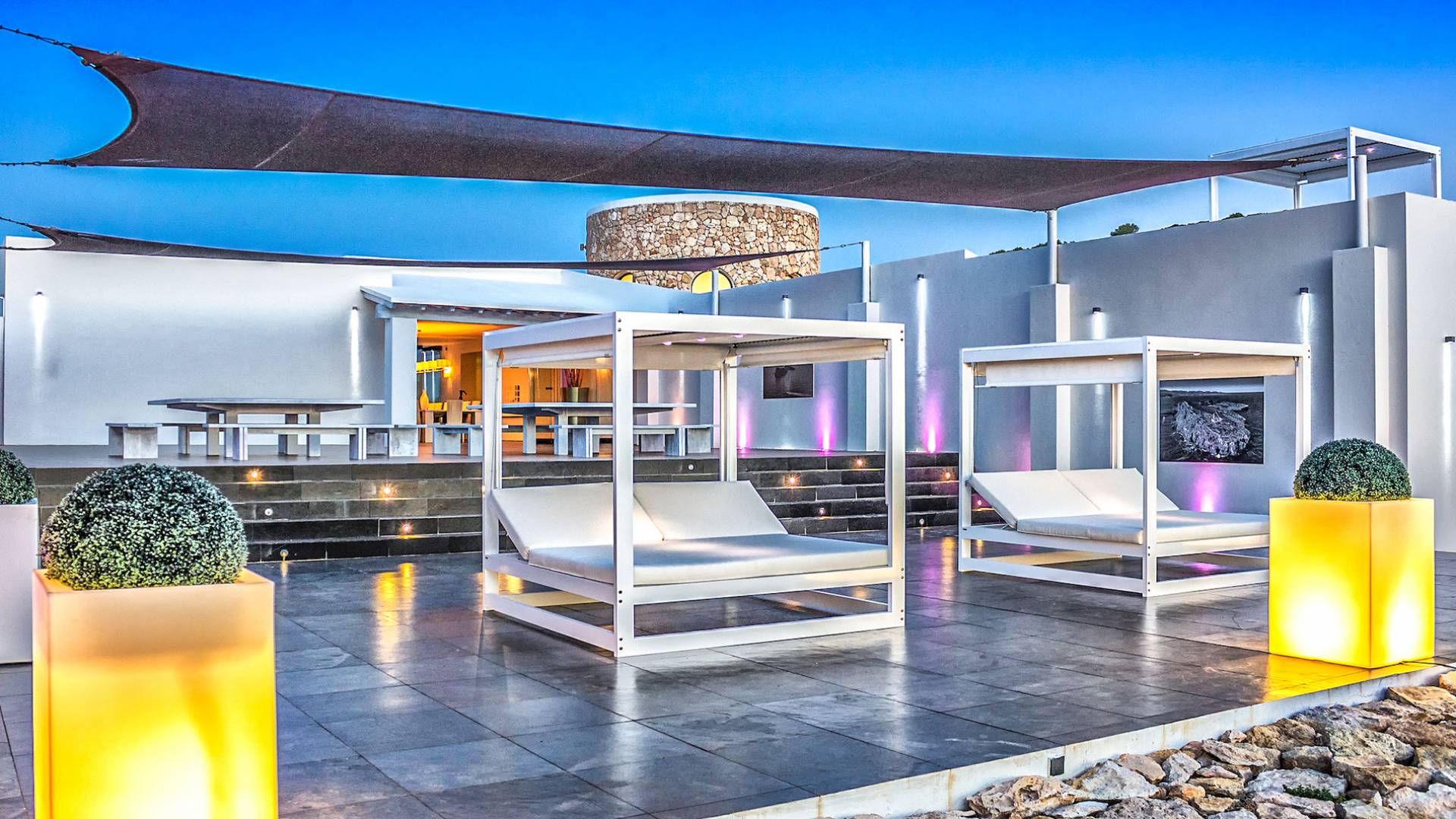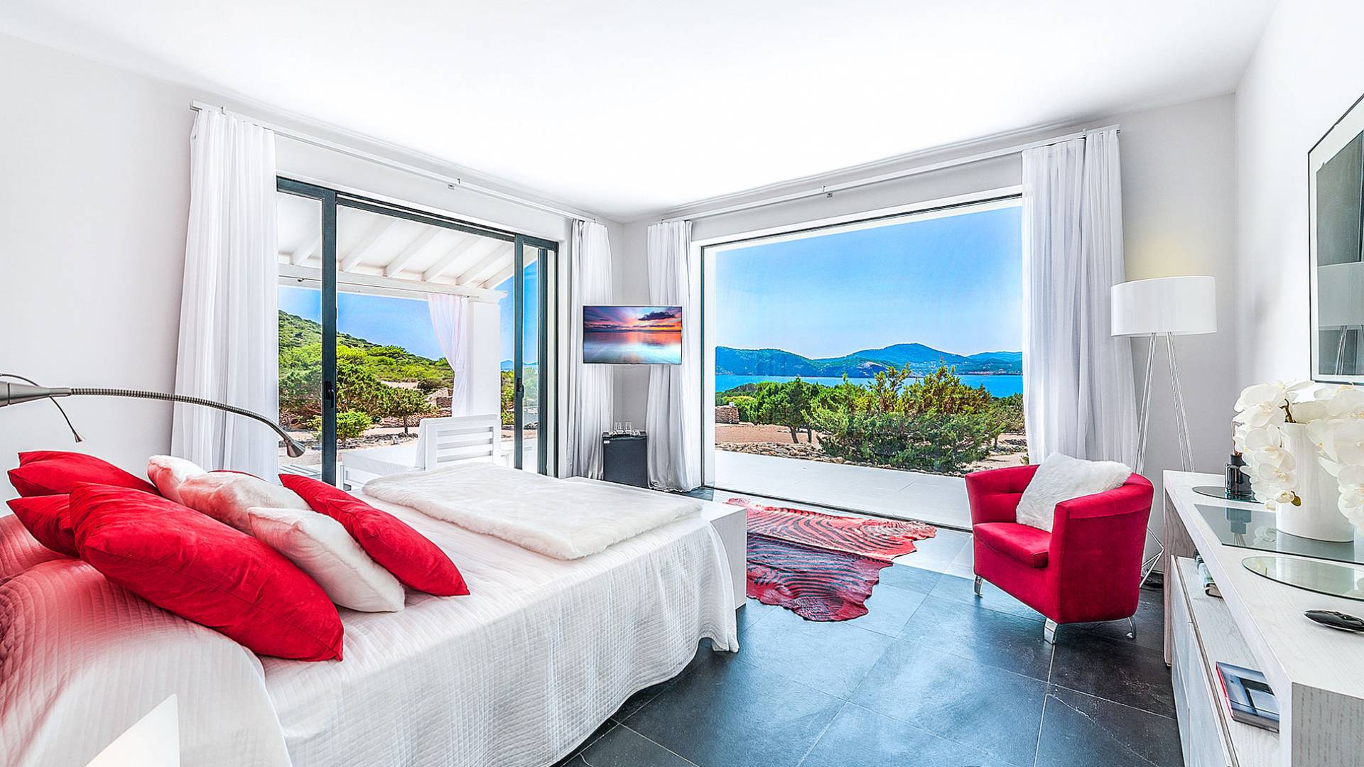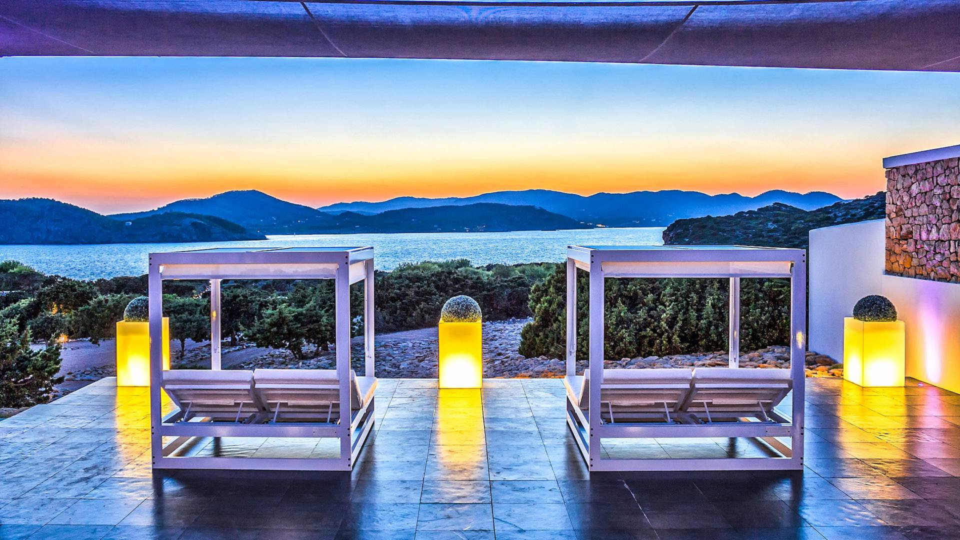 Toda la finca que rodea esta villa de lujo cuenta con impresionantes vistas en todas direcciones, como la isla de Ibiza y el mar Mediterráneo. Hay magníficas y espaciosas terrazas con zonas chill-out al amanecer y al atardecer, así como una piscina de 17 mx 8 m, para una mayor relajación, hay una piscina de hidromasaje al aire libre, un baño de vapor y una sauna. Disfrute del sol desde la mañana hasta la noche en estas amplias terrazas y podrá disfrutar de un comedor al aire libre con vista en el área de comedor al aire libre con barbacoa. Tagomago Private Island tiene seguridad las 24 horas y solo es accesible en la costa oeste, el aterrizaje de helicópteros es una posibilidad y un yate privado está disponible para alquilar (precio en la solicitud).