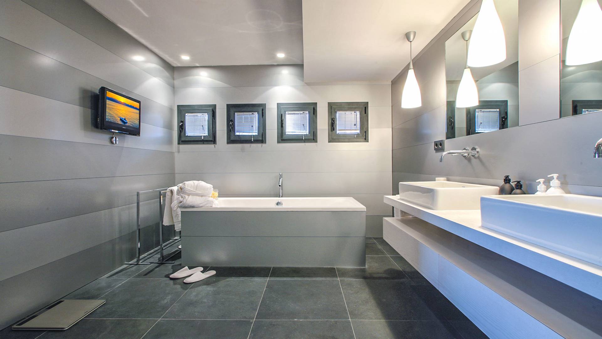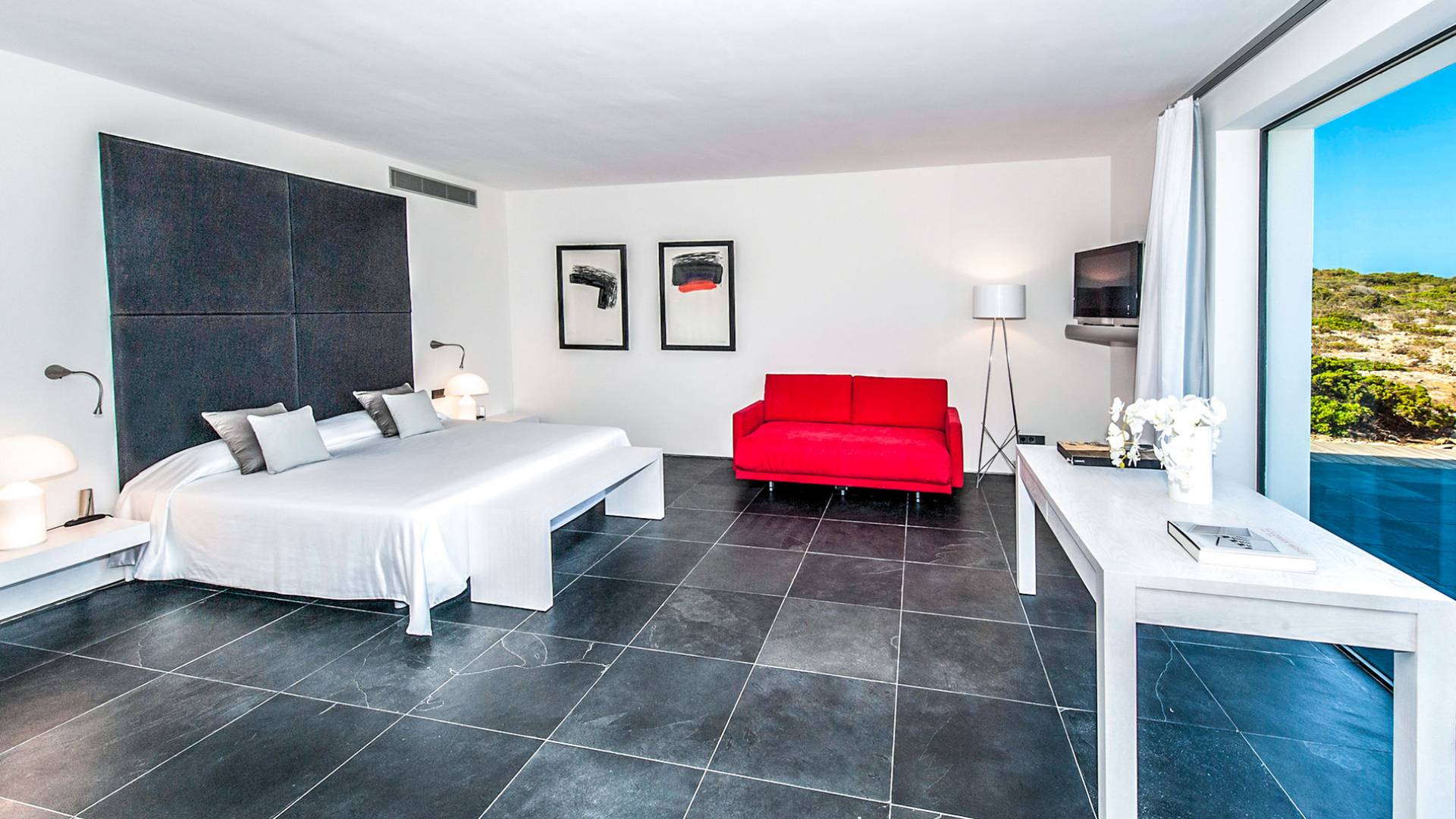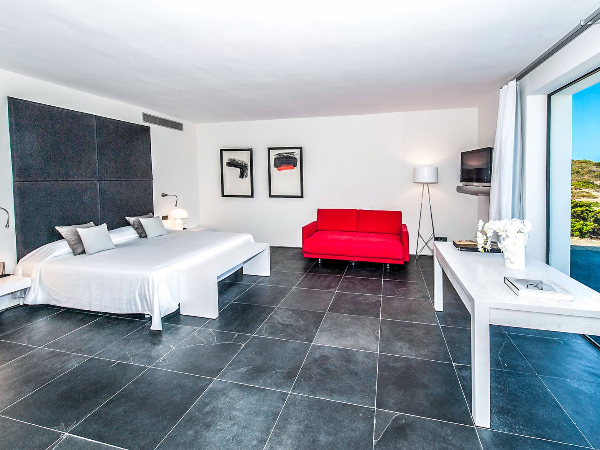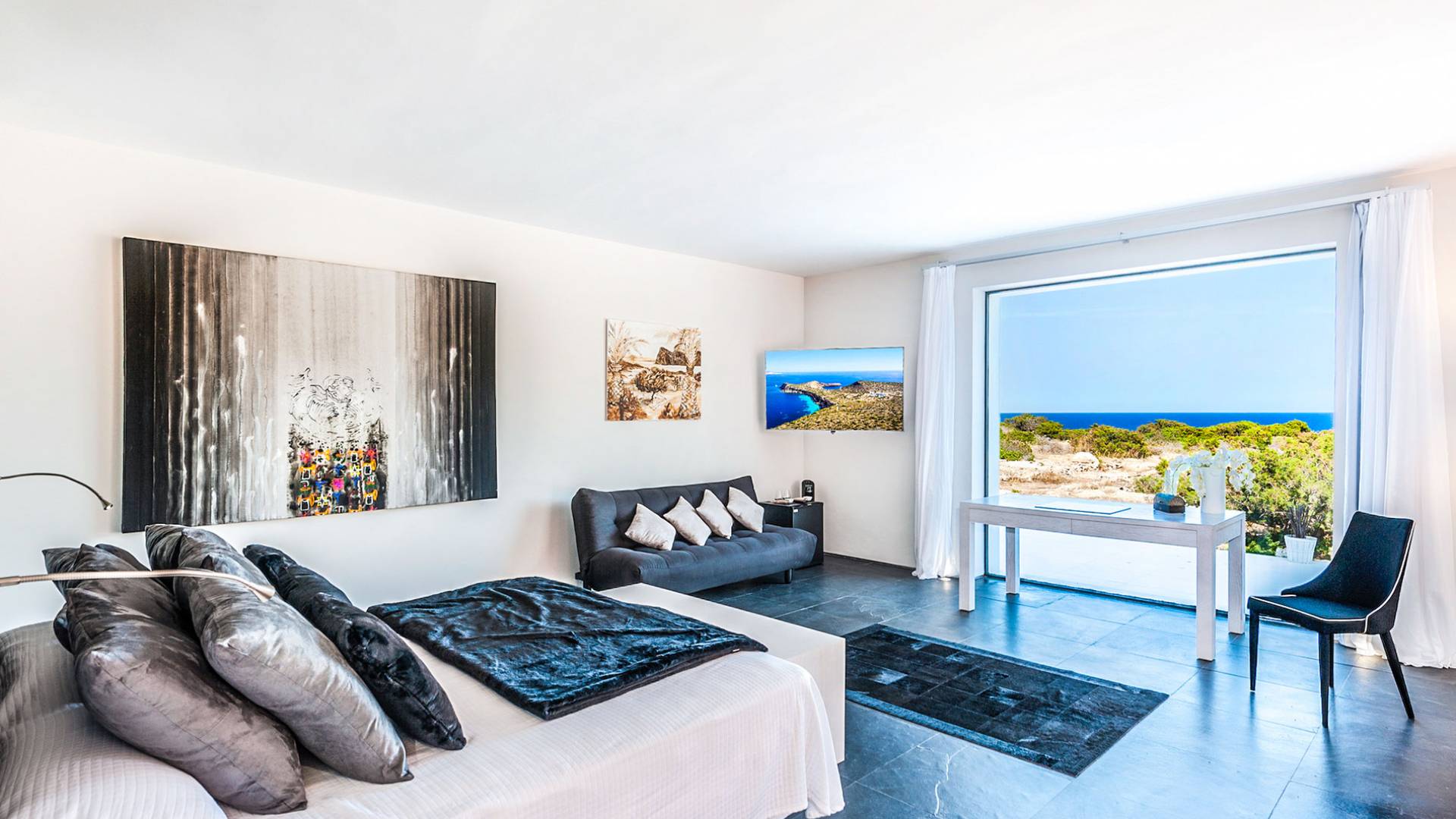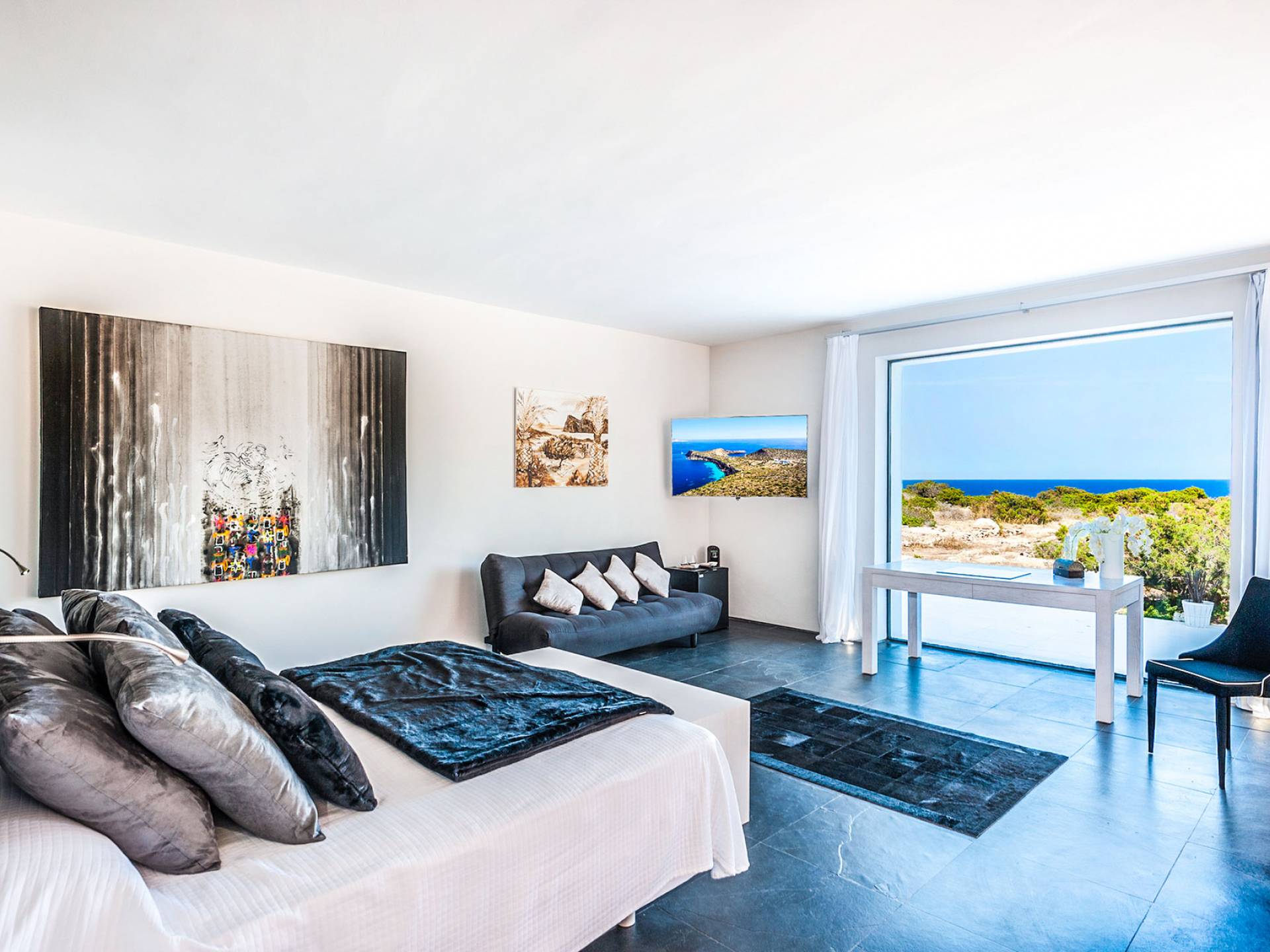 Todas las habitaciones de Tagomago Private Island, son modernas y sofisticadas y han sido diseñadas por un diseñador de interiores de renombre internacional. Las calidades, acabados y equipamiento técnico de la villa son de un nivel excepcionalmente alto, incluida la cocina de diseño personalizada con equipamiento profesional. Todas las áreas tienen calefacción por suelo radiante, aire acondicionado, un sistema de sonido de alta tecnología de Sonos Media-system, modernos televisores de cine Samsung HD en todas las habitaciones y baños, Internet con WiFi y un sistema de iluminación LED.