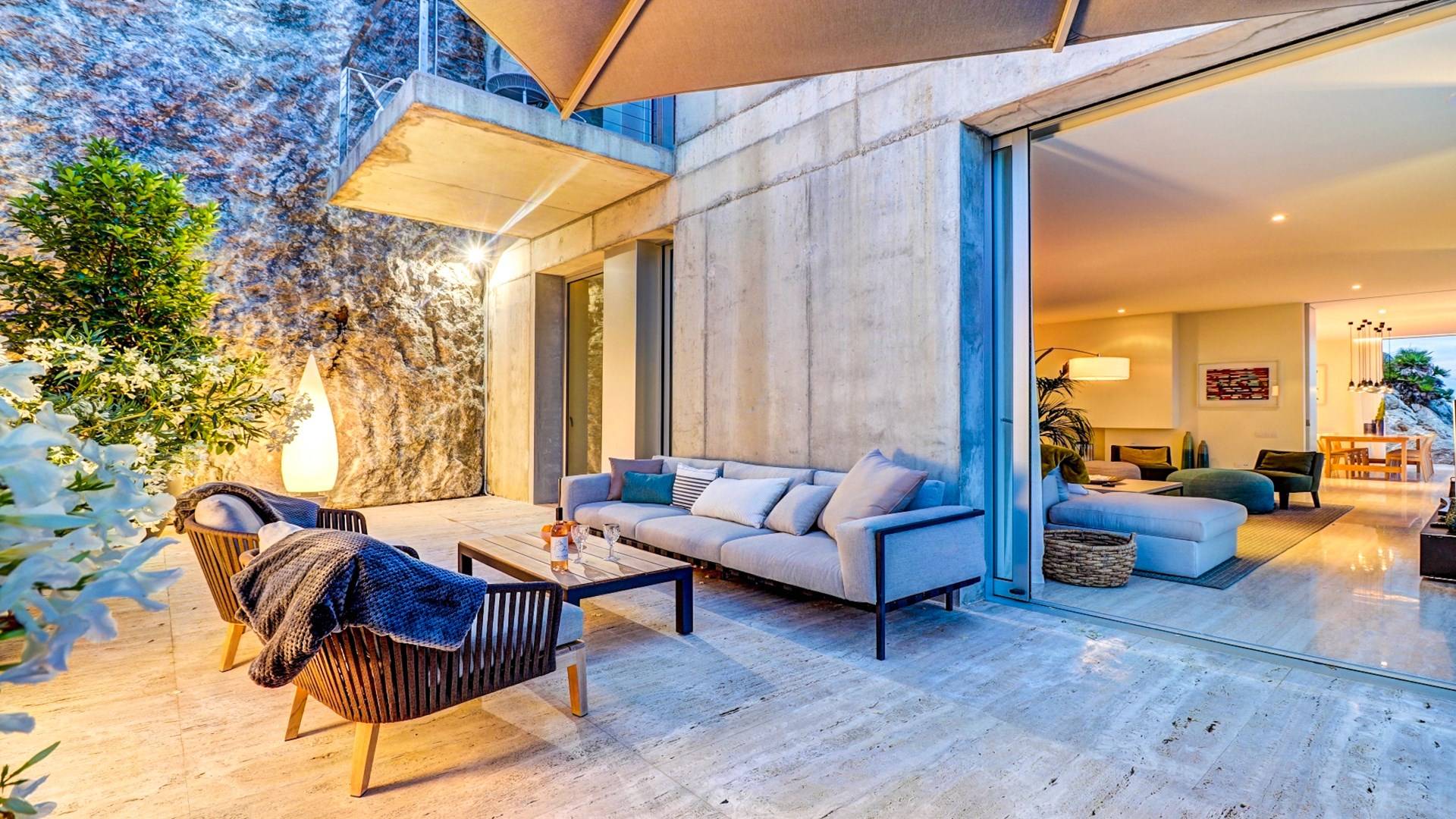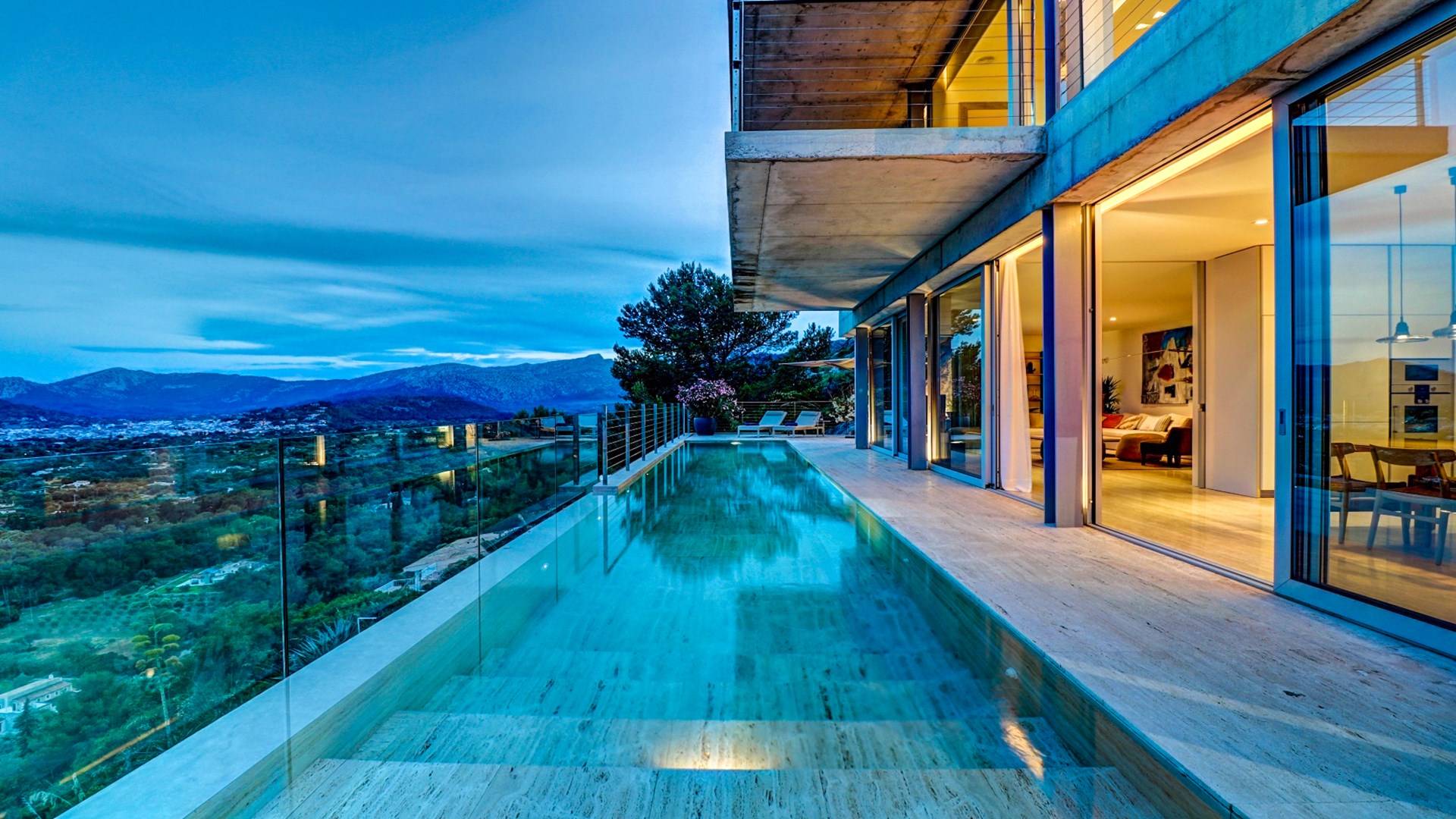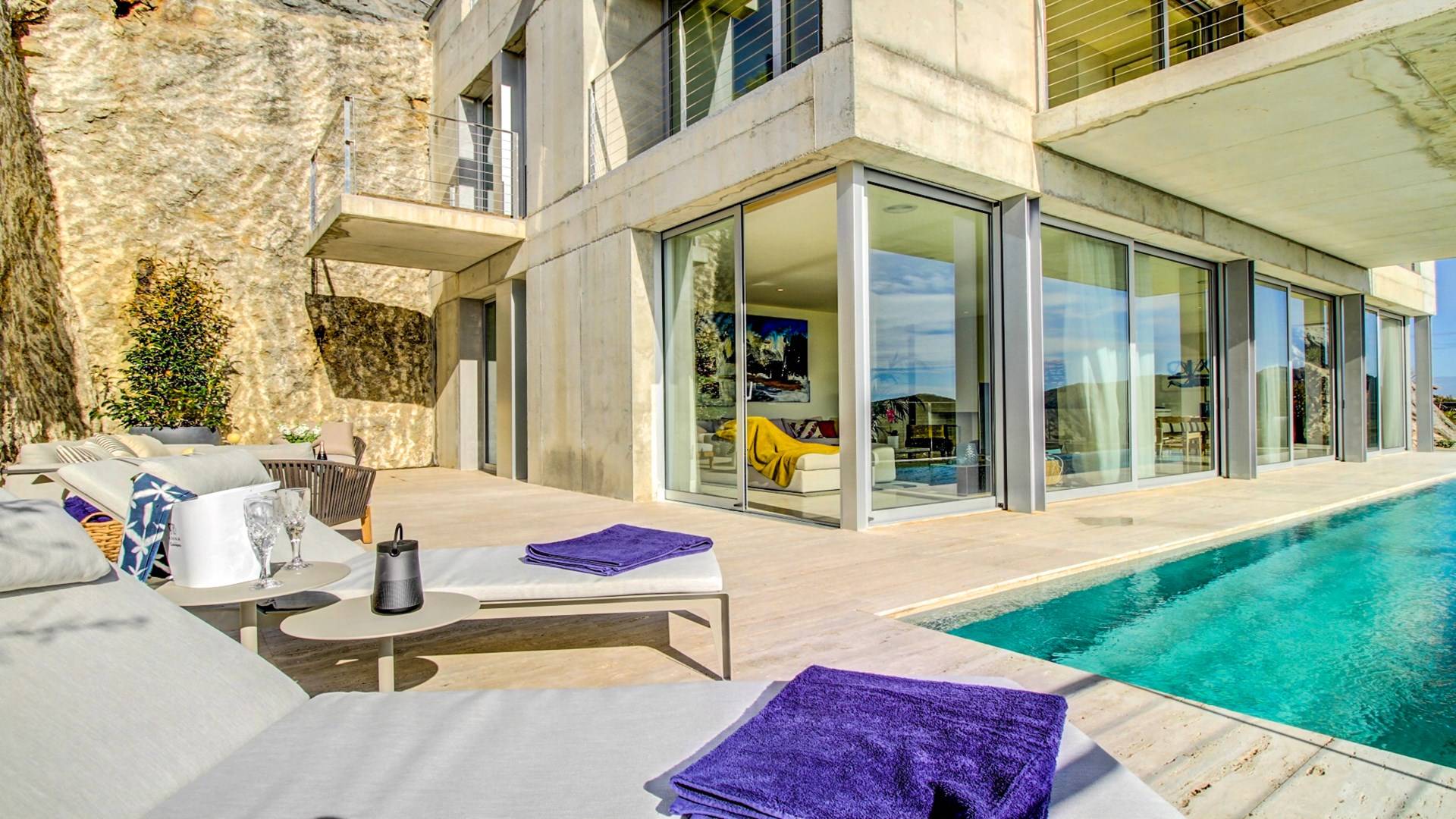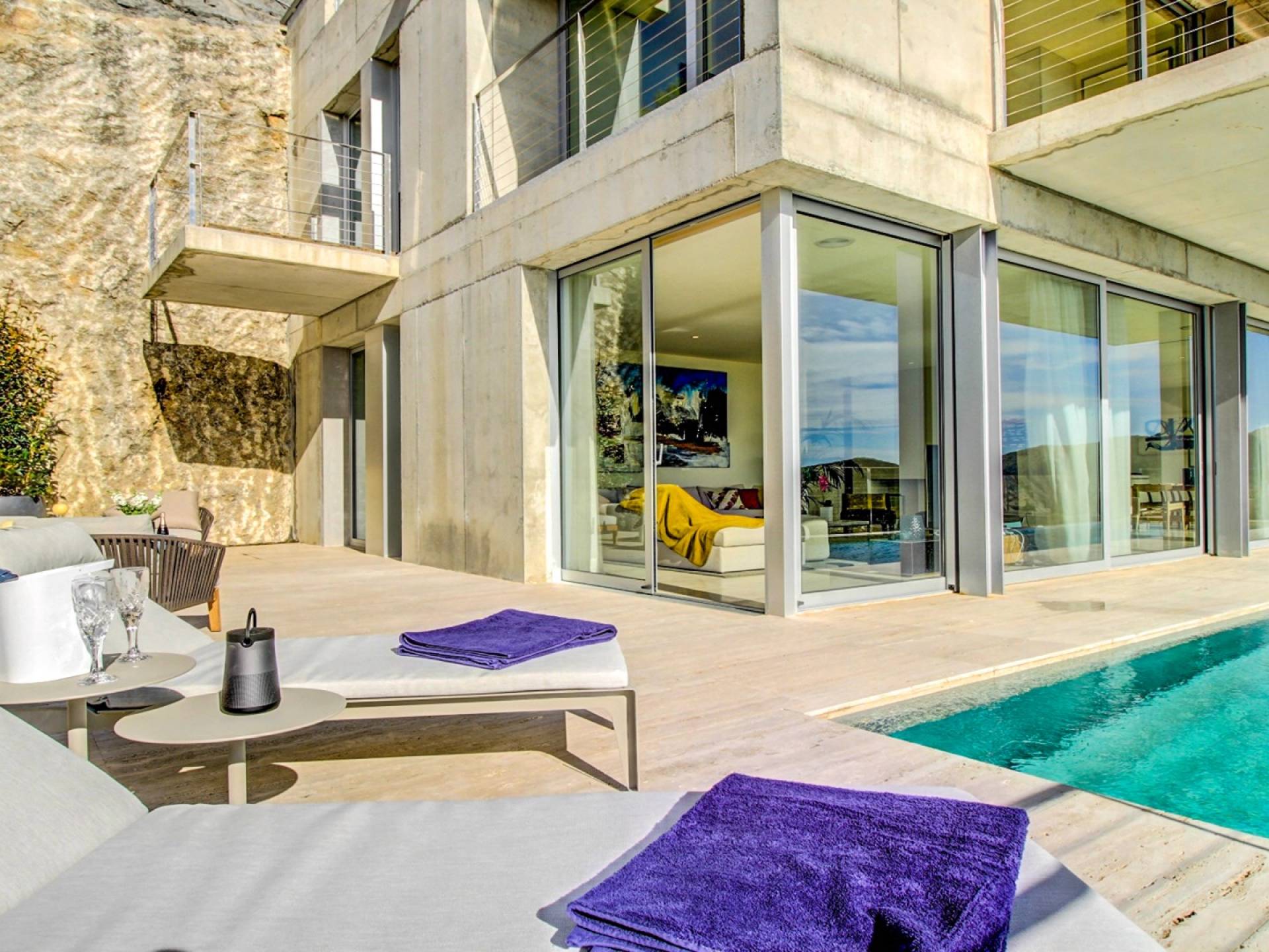 Desde aquí, un ascensor te lleva a la casa, lo que es ideal para los huéspedes con menos movilidad (el ascensor da acceso a todas las plantas de la villa). En el primer piso, la propiedad tiene una hermosa y soleada sala de estar con magníficos muebles de diseño cómodos e impresionantes obras de arte. El salón se abre a una terraza bañada por el sol y a una impresionante piscina infinita de 15,5 x 2,5 metros.